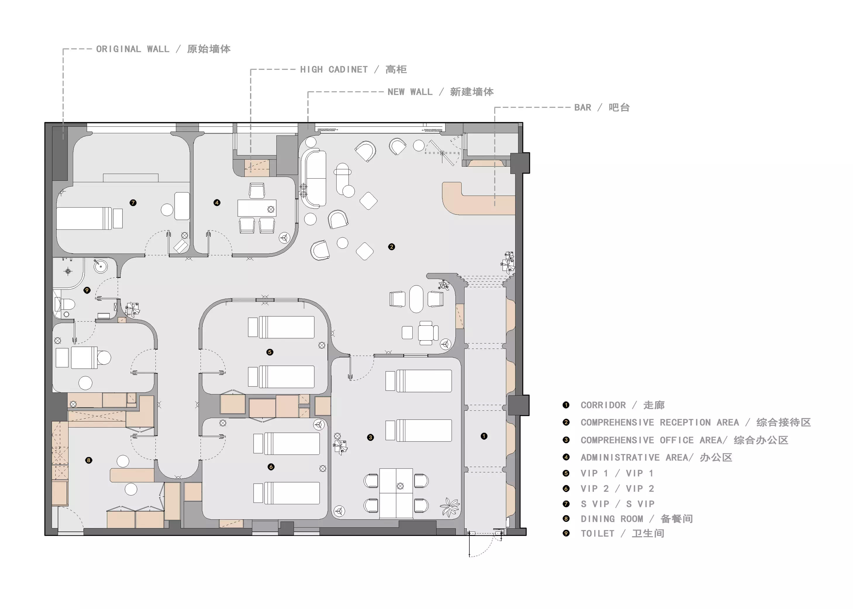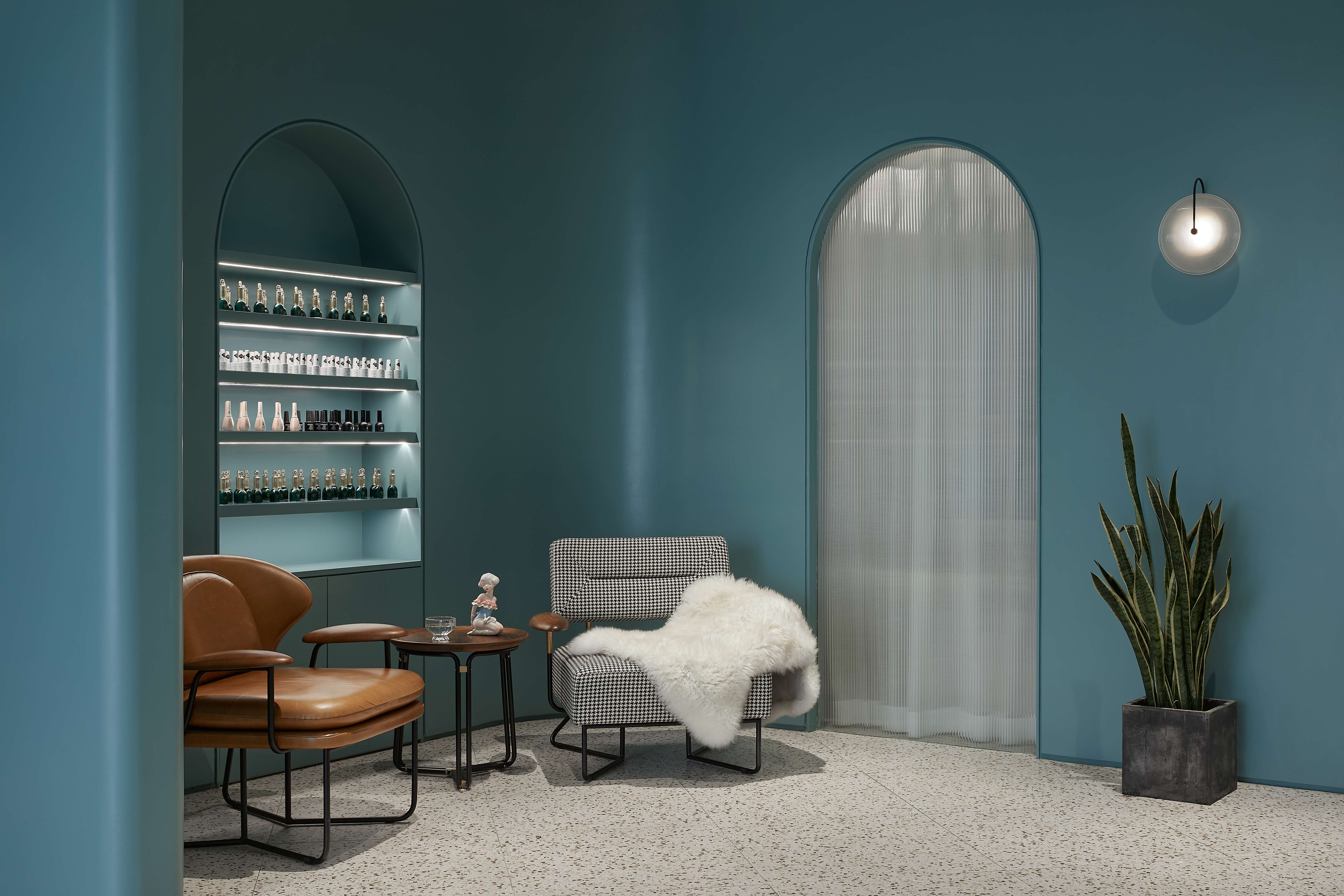 空间布局:基于项目的特殊性,我们对软装产品进行全方面原创设计,从功能到美感,贴合空间构造,统一空间表达的意图,使每一件家具都具有独特性。经过美学手法与文化输出后软装,它们有着强大的气场氛围,影响着空间与人的连接。无主灯设计,再加弧形灯带的点缀,使空间氛围柔美恬静,更会给正在做美容、美甲、皮肤SPA的顾客更为舒心的环境和享受。VIP房间有单独的卫生间和浴缸,给顾客更为私密和贴心的空间体验。美,来于自信,无需艳丽妆容华美外衣,自内心而发。对于美容结构,细节的体现尤为重要,为此我们收集的大量的资料及参考,使每一处细节不仅只从装饰的角度出发,同样也赋予更多的心理与引导心情的作用,通过空间去改变人们的心理状态。整个空间的统一和简洁性,流入温度的色感来影响人们的心理,营造出舒适与柔和的氛围。