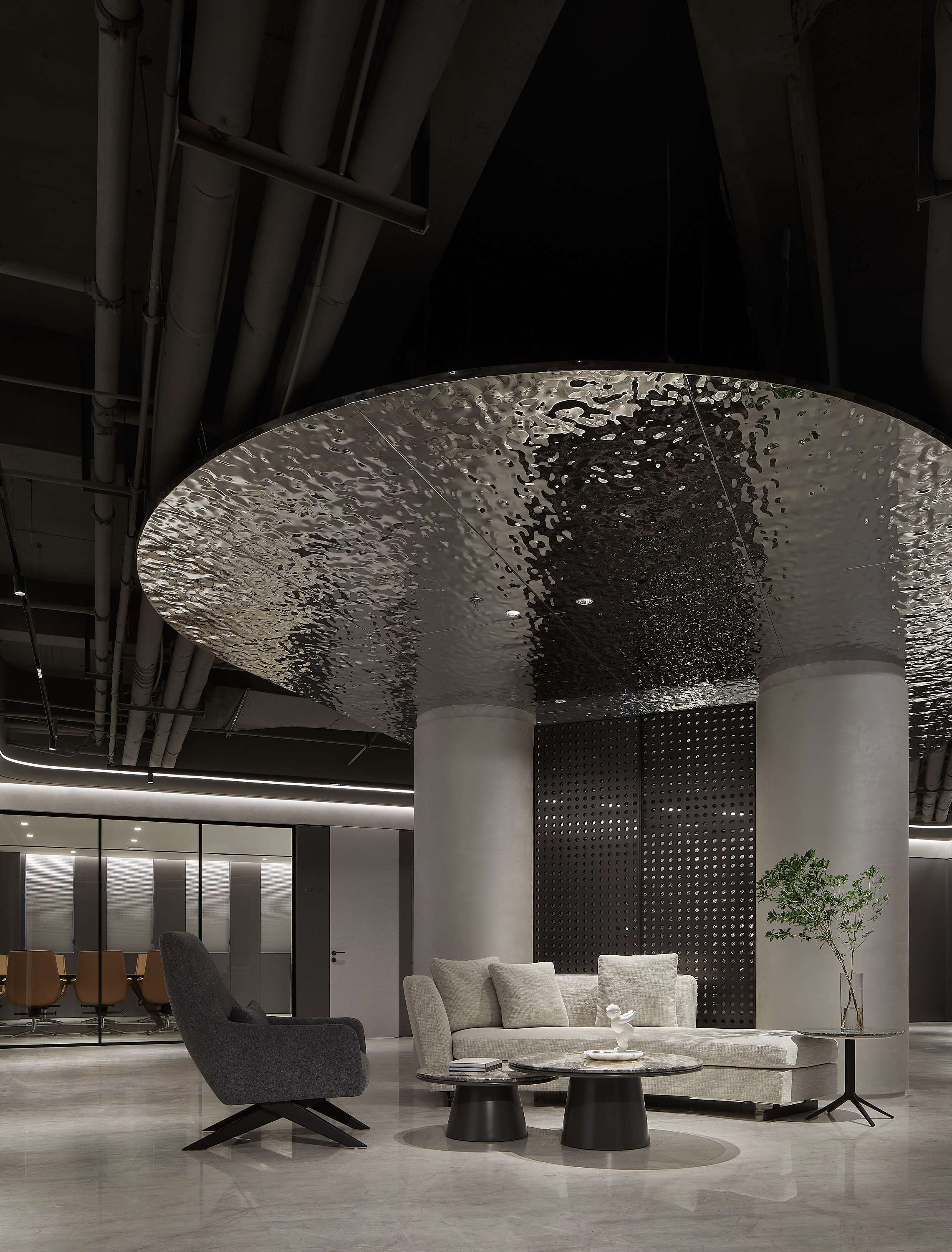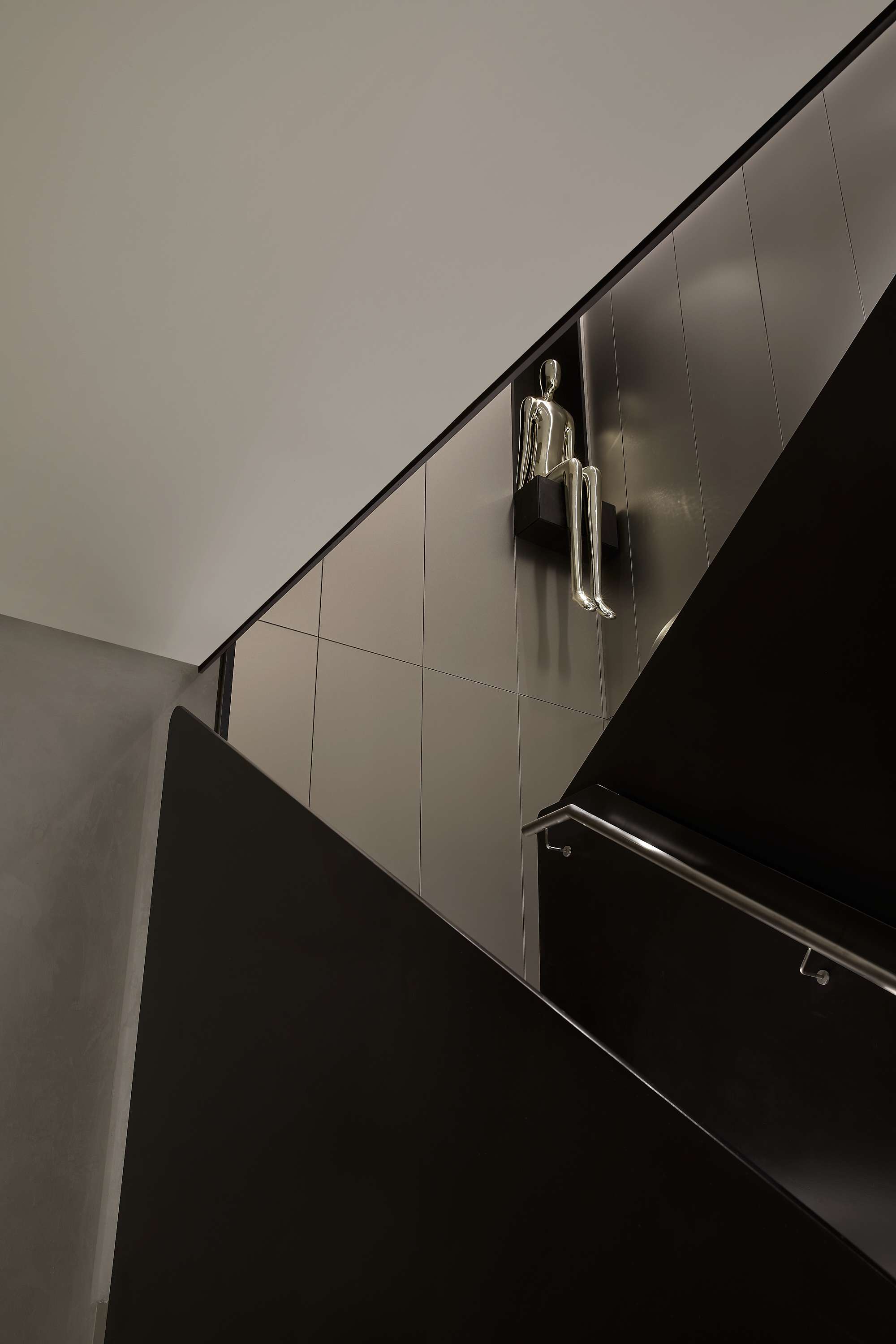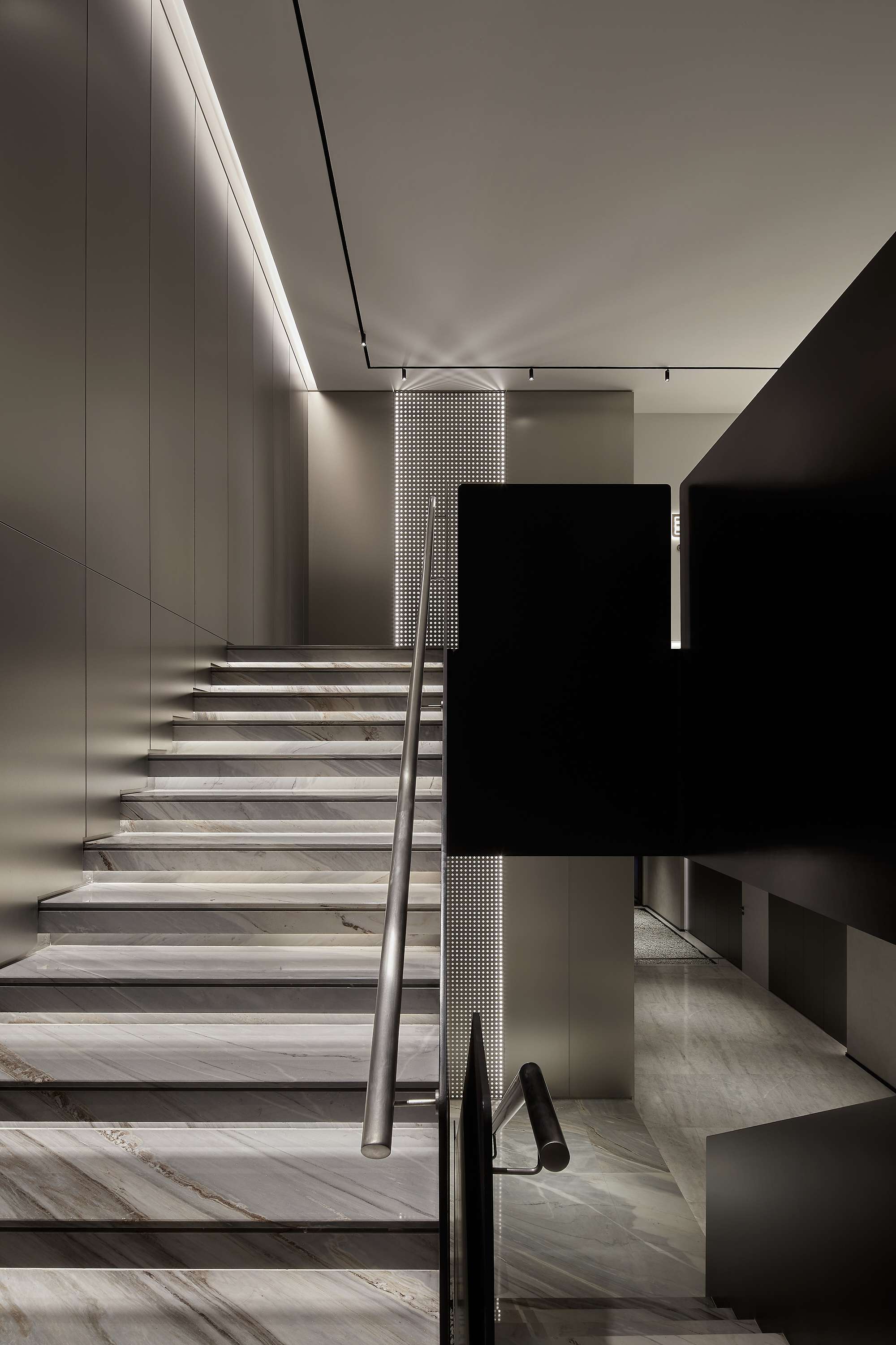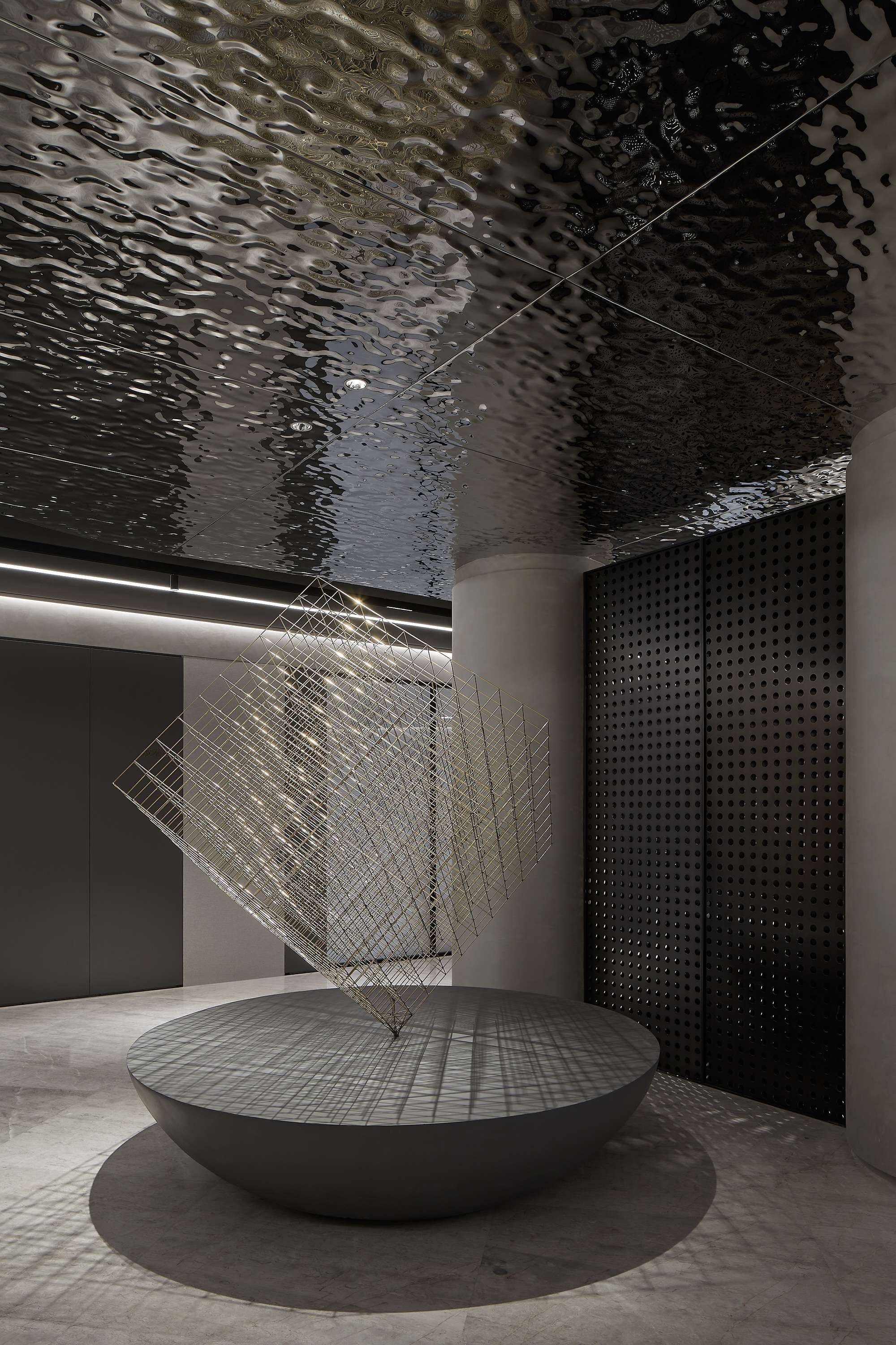 光影在楼梯间被运用到了极致。台阶下的灯带和蓝金沙大理石的波纹饰面仿佛和谐起一曲高山流水,不锈钢侧板隐隐映照出的台阶影像无意间从视觉上延伸了踏步,又增加了侧板的细节。二楼入口处的灯光透过不锈钢板模拟出了奢侈品店的光泽,人形雕像被置于高处的窗口,光滑的金属表面在其光泽下也似乎被镀上了珠宝特有的光华。简洁的顶面光带勾勒出二层大厅的轮廓,配合着局部的水波纹不锈钢板,粼粼波光便在眼前。几何体的框架和半球的结合诠释着动与静,光与影。装置的阴影投在其半球之上,线与线的相遇和方格棋盘有了异曲同工。休闲区域的波点不锈钢板将另一侧的风景星点的透露进来,疏与密,亮与暗在这里共舞,顶面波光也对休闲区有明确空间功能的作用。会议室用色沉稳,线条简洁有序,富有质感,跳脱的活力橙色椅子带给严肃空间一丝跳动感。就餐区顶面和立面交界处用转角处理的柔和自然,一旁的吧台区在顶面上延续了弧线形式做了区域划分——弧线元素的融入打破了方正,为空间带来了新鲜。办公室作为使用频次最高的空间,在用色上我们延续了外部公用空间的沉稳色系,活泼感沿用了橙色来表现。 -