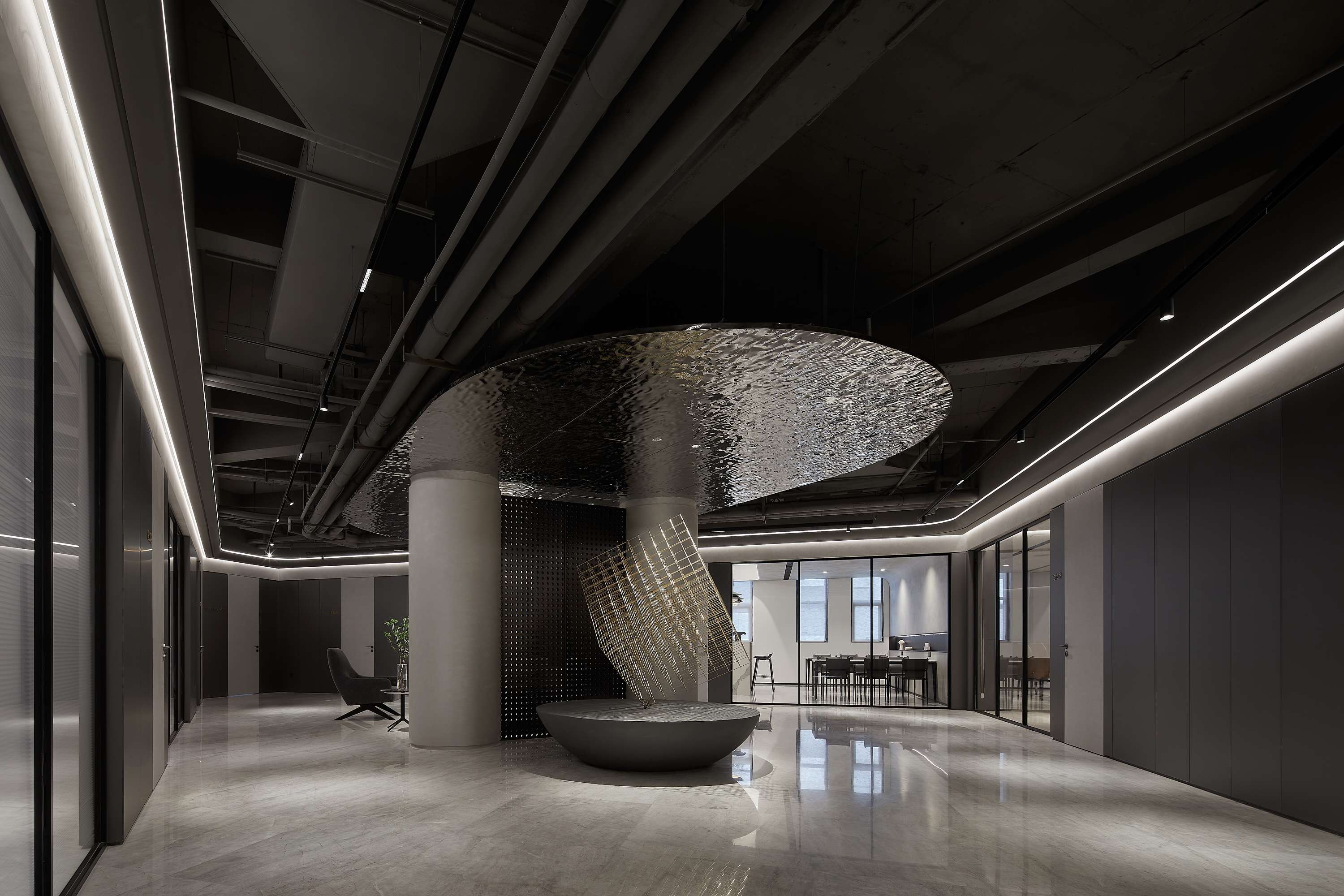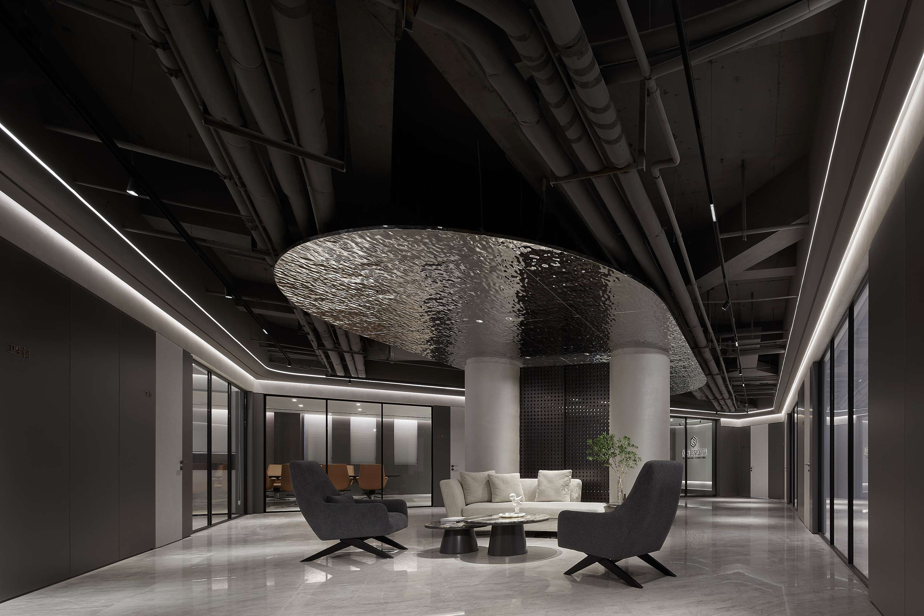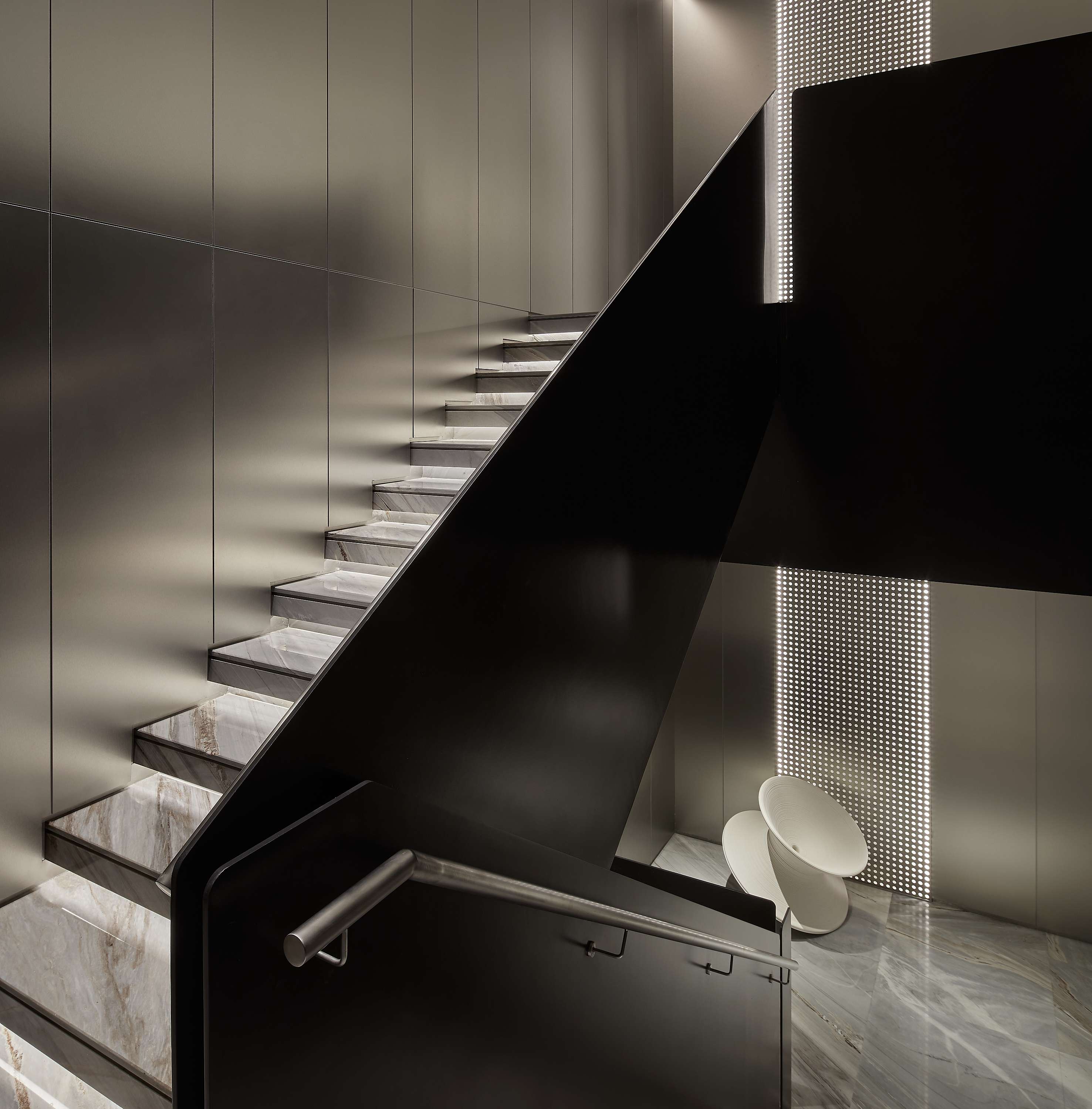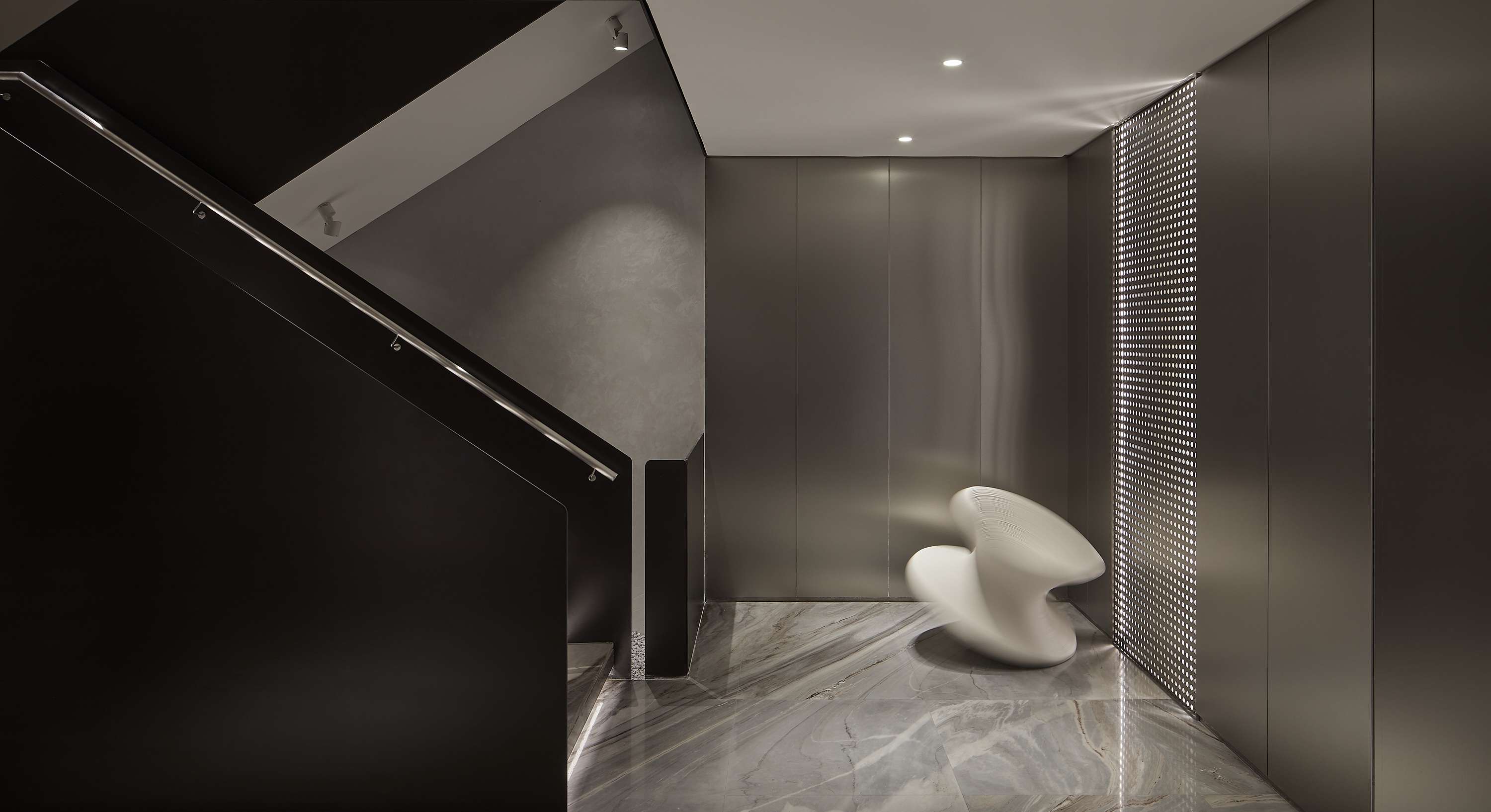 光影在楼梯间被运用到了极致。台阶下的灯带和蓝金沙大理石的波纹饰面仿佛和谐起一曲高山流水,不锈钢侧板隐隐映照出的台阶影像无意间从视觉上延伸了踏步,又增加了侧板的细节。二楼入口处的灯光透过不锈钢板模拟出了奢侈品店的光泽,人形雕像被置于高处的窗口,光滑的金属表面在其光泽下也似乎被镀上了珠宝特有的光华。简洁的顶面光带勾勒出二层大厅的轮廓,配合着局部的水波纹不锈钢板,粼粼波光便在眼前。几何体的框架和半球的结合诠释着动与静,光与影。装置的阴影投在其半球之上,线与线的相遇和方格棋盘有了异曲同工。休闲区域的波点不锈钢板将另一侧的风景星点的透露进来,疏与密,亮与暗在这里共舞,顶面波光也对休闲区有明确空间功能的作用。会议室用色沉稳,线条简洁有序,富有质感,跳脱的活力橙色椅子带给严肃空间一丝跳动感。就餐区顶面和立面交界处用转角处理的柔和自然,一旁的吧台区在顶面上延续了弧线形式做了区域划分——弧线元素的融入打破了方正,为空间带来了新鲜。办公室作为使用频次最高的空间,在用色上我们延续了外部公用空间的沉稳色系,活泼感沿用了橙色来表现。 -