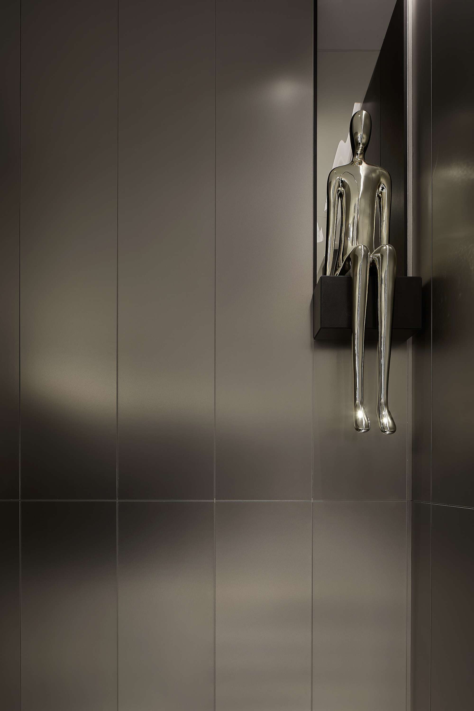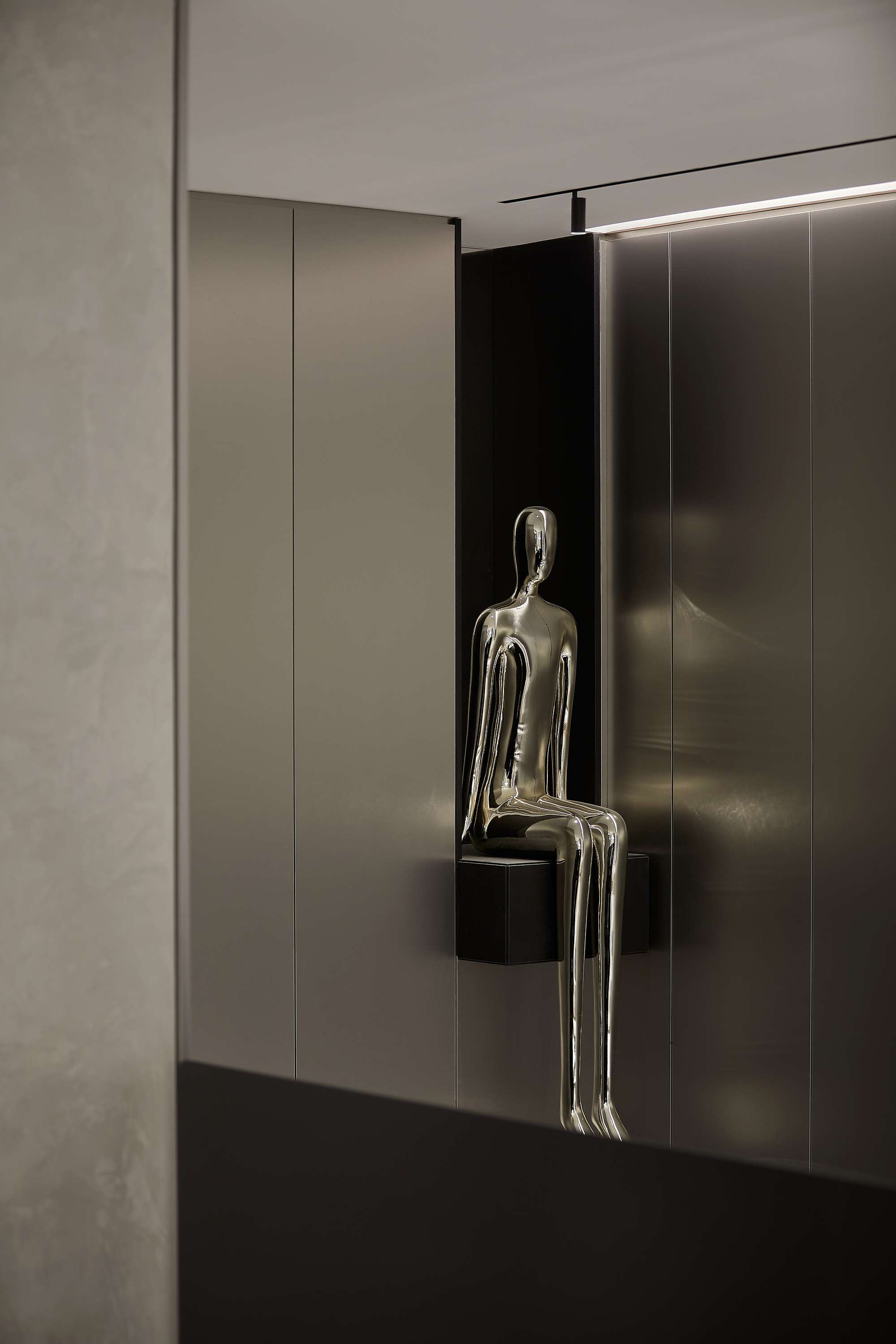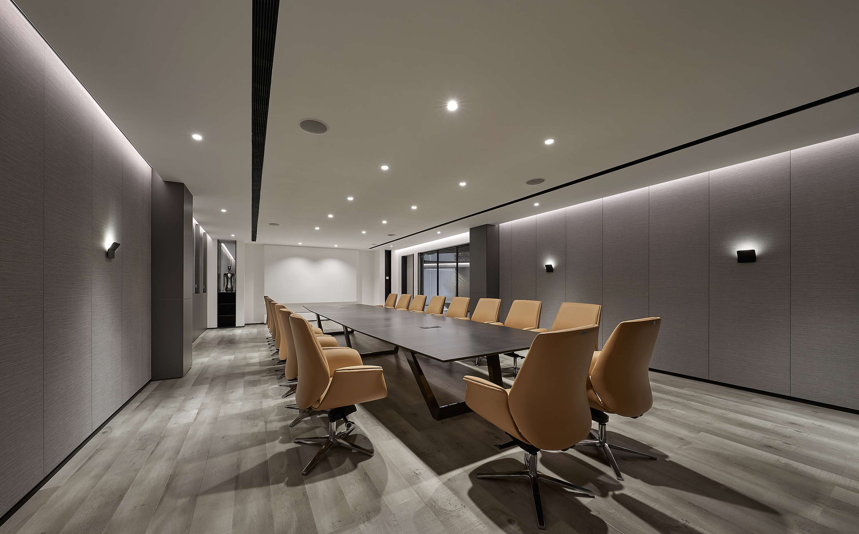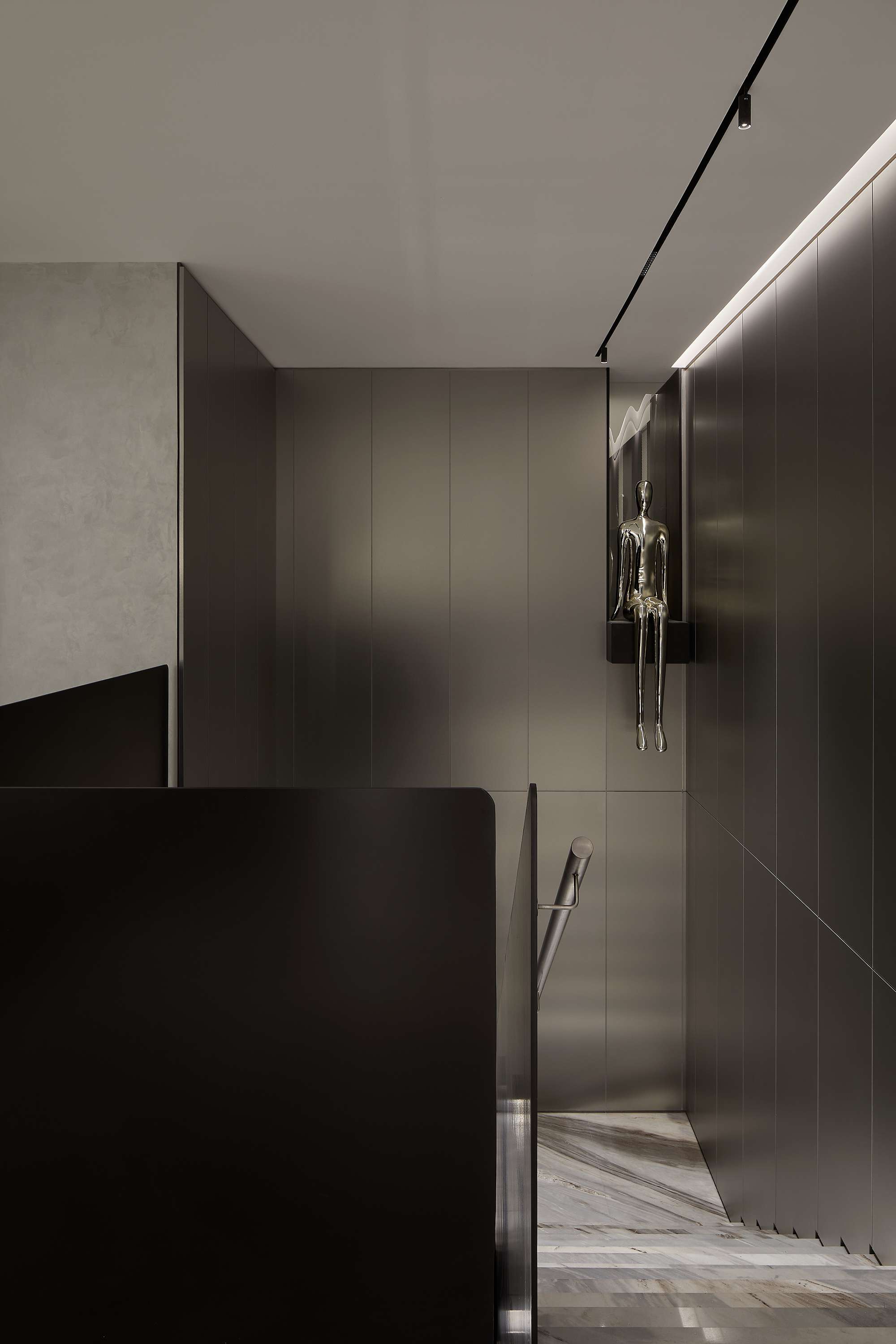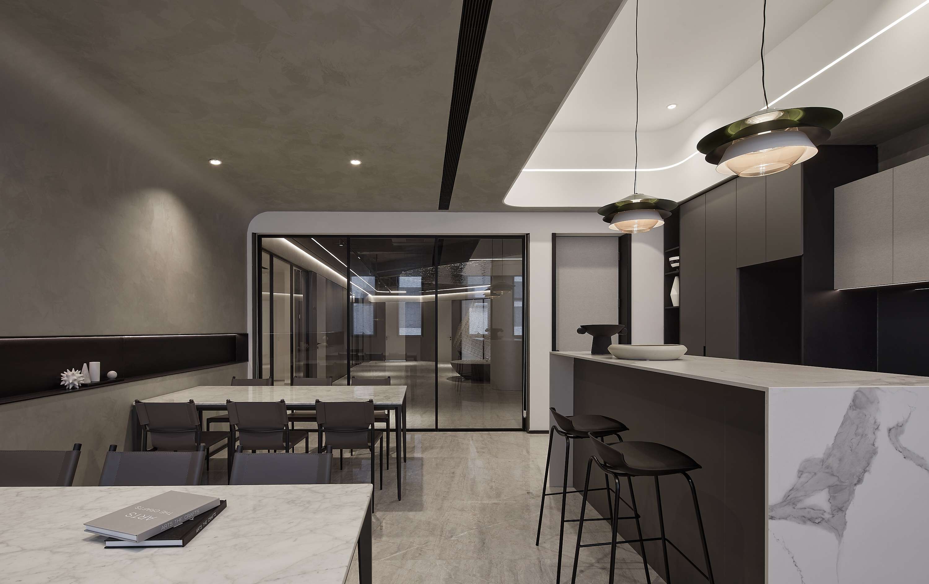 光影在楼梯间被运用到了极致。台阶下的灯带和蓝金沙大理石的波纹饰面仿佛和谐起一曲高山流水,不锈钢侧板隐隐映照出的台阶影像无意间从视觉上延伸了踏步,又增加了侧板的细节。二楼入口处的灯光透过不锈钢板模拟出了奢侈品店的光泽,人形雕像被置于高处的窗口,光滑的金属表面在其光泽下也似乎被镀上了珠宝特有的光华。简洁的顶面光带勾勒出二层大厅的轮廓,配合着局部的水波纹不锈钢板,粼粼波光便在眼前。几何体的框架和半球的结合诠释着动与静,光与影。装置的阴影投在其半球之上,线与线的相遇和方格棋盘有了异曲同工。休闲区域的波点不锈钢板将另一侧的风景星点的透露进来,疏与密,亮与暗在这里共舞,顶面波光也对休闲区有明确空间功能的作用。会议室用色沉稳,线条简洁有序,富有质感,跳脱的活力橙色椅子带给严肃空间一丝跳动感。就餐区顶面和立面交界处用转角处理的柔和自然,一旁的吧台区在顶面上延续了弧线形式做了区域划分——弧线元素的融入打破了方正,为空间带来了新鲜。办公室作为使用频次最高的空间,在用色上我们延续了外部公用空间的沉稳色系,活泼感沿用了橙色来表现。 -
