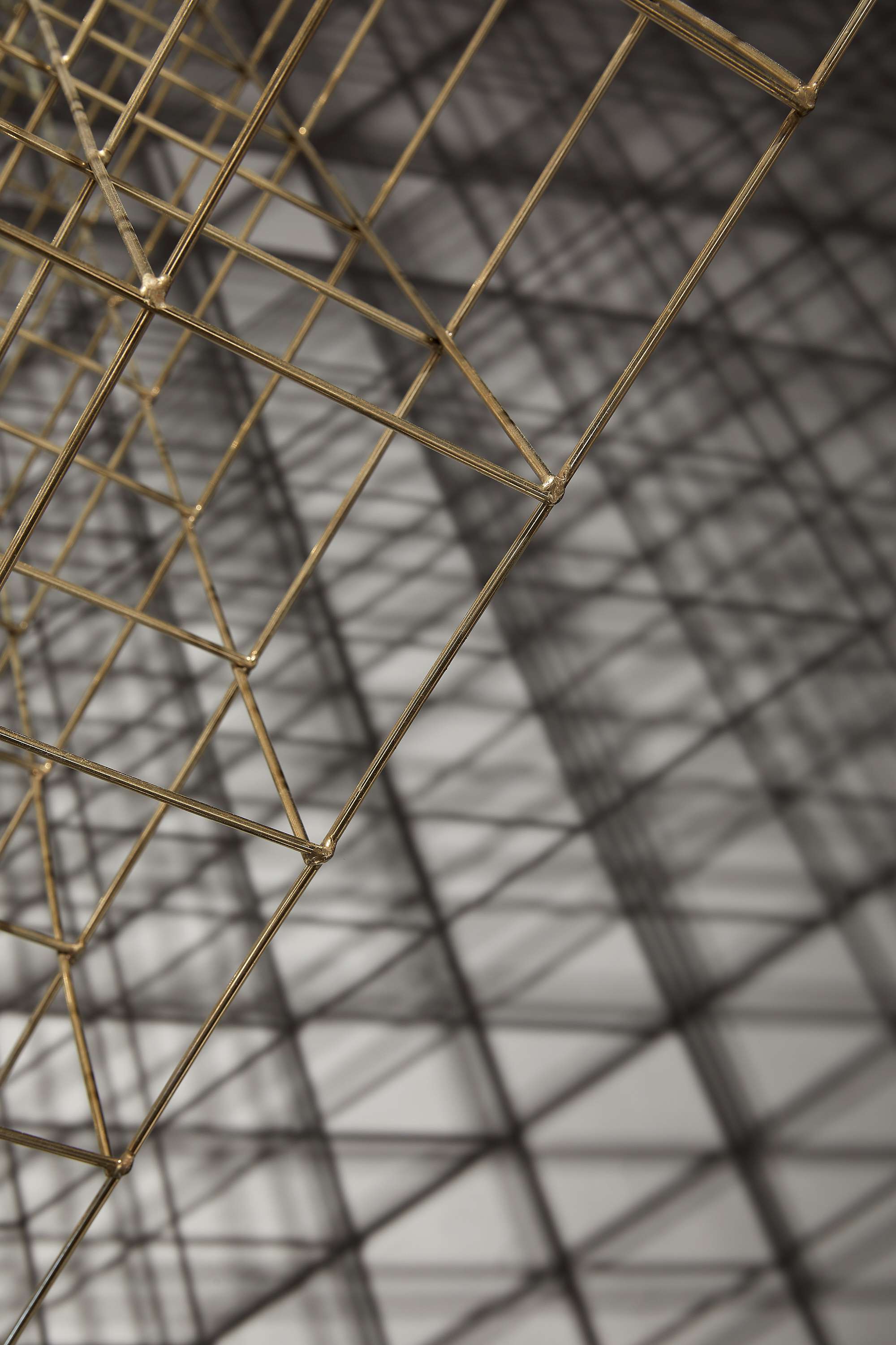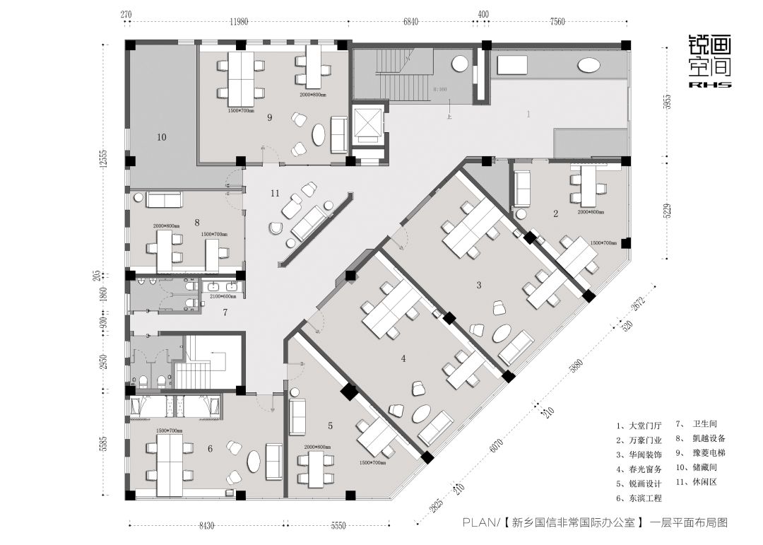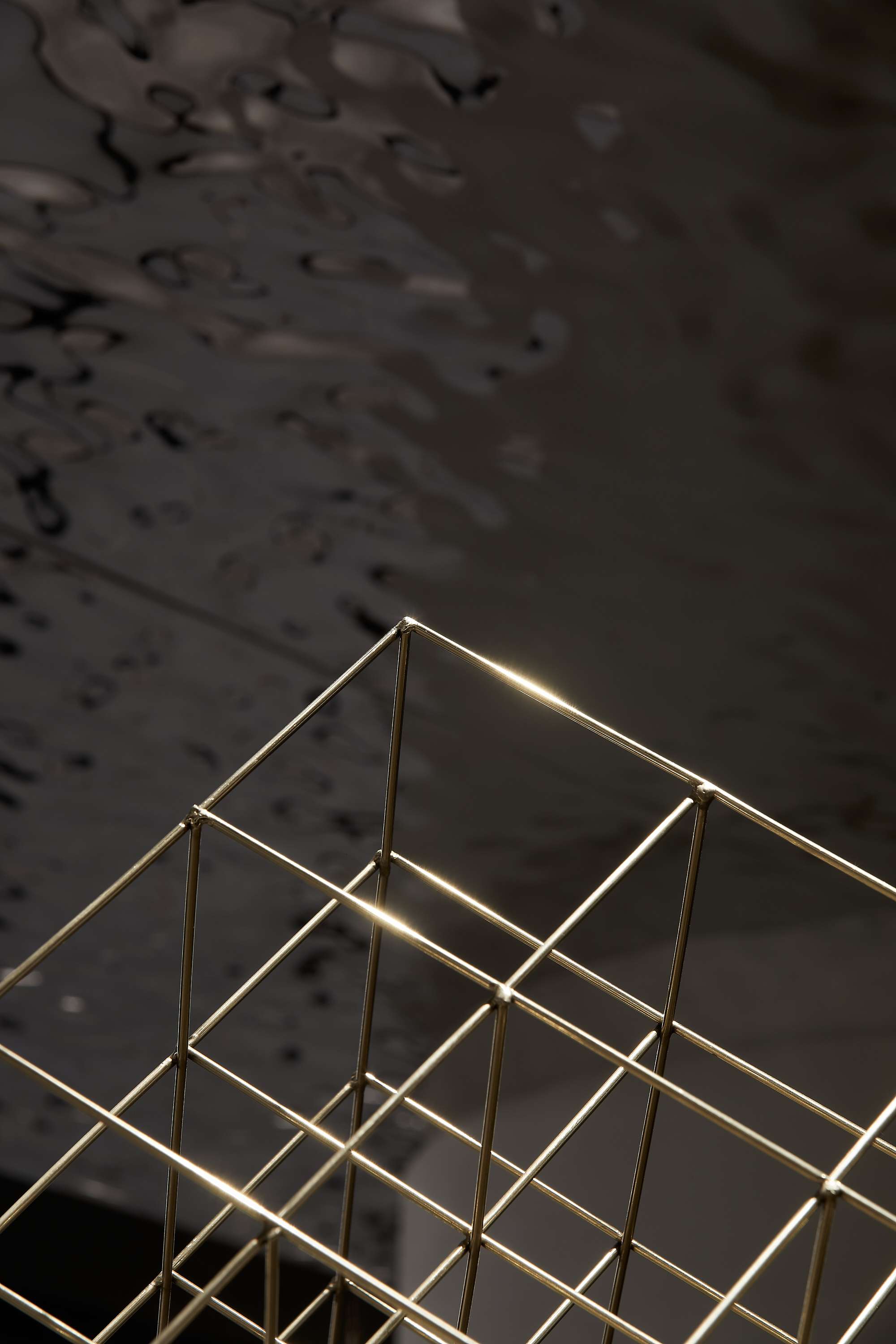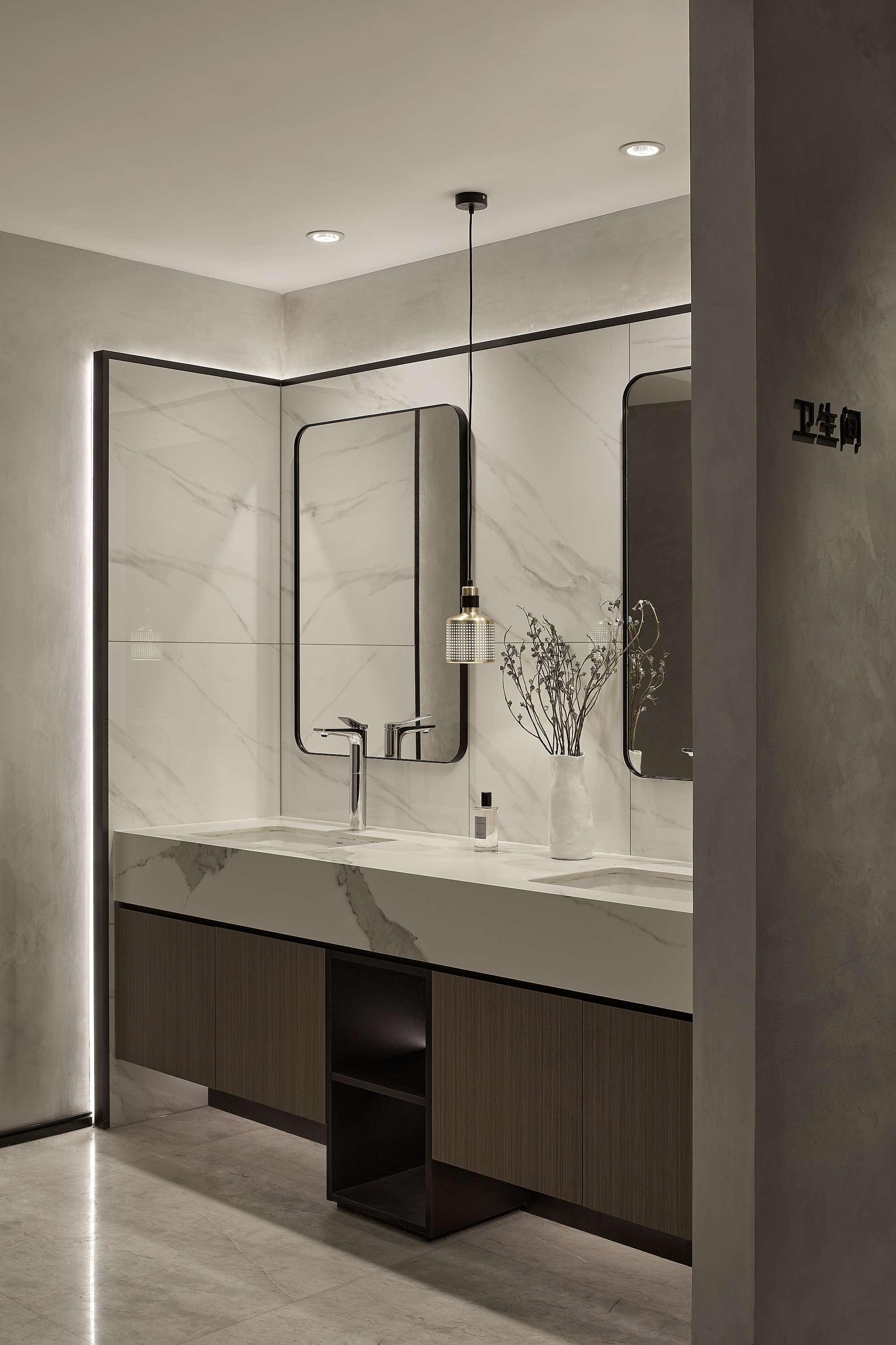 光影在楼梯间被运用到了极致。台阶下的灯带和蓝金沙大理石的波纹饰面仿佛和谐起一曲高山流水,不锈钢侧板隐隐映照出的台阶影像无意间从视觉上延伸了踏步,又增加了侧板的细节。二楼入口处的灯光透过不锈钢板模拟出了奢侈品店的光泽,人形雕像被置于高处的窗口,光滑的金属表面在其光泽下也似乎被镀上了珠宝特有的光华。简洁的顶面光带勾勒出二层大厅的轮廓,配合着局部的水波纹不锈钢板,粼粼波光便在眼前。几何体的框架和半球的结合诠释着动与静,光与影。装置的阴影投在其半球之上,线与线的相遇和方格棋盘有了异曲同工。休闲区域的波点不锈钢板将另一侧的风景星点的透露进来,疏与密,亮与暗在这里共舞,顶面波光也对休闲区有明确空间功能的作用。会议室用色沉稳,线条简洁有序,富有质感,跳脱的活力橙色椅子带给严肃空间一丝跳动感。就餐区顶面和立面交界处用转角处理的柔和自然,一旁的吧台区在顶面上延续了弧线形式做了区域划分——弧线元素的融入打破了方正,为空间带来了新鲜。办公室作为使用频次最高的空间,在用色上我们延续了外部公用空间的沉稳色系,活泼感沿用了橙色来表现。 -