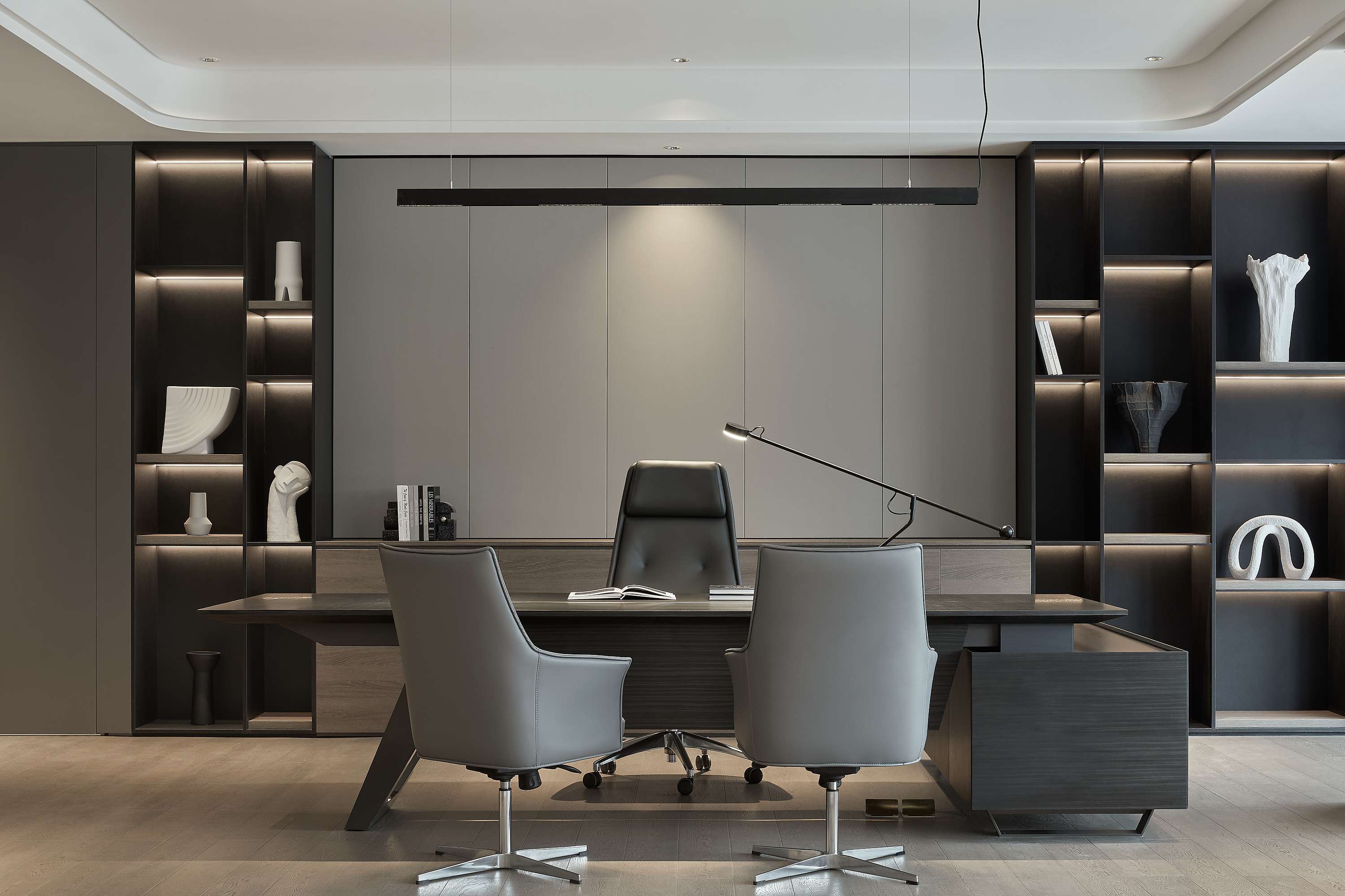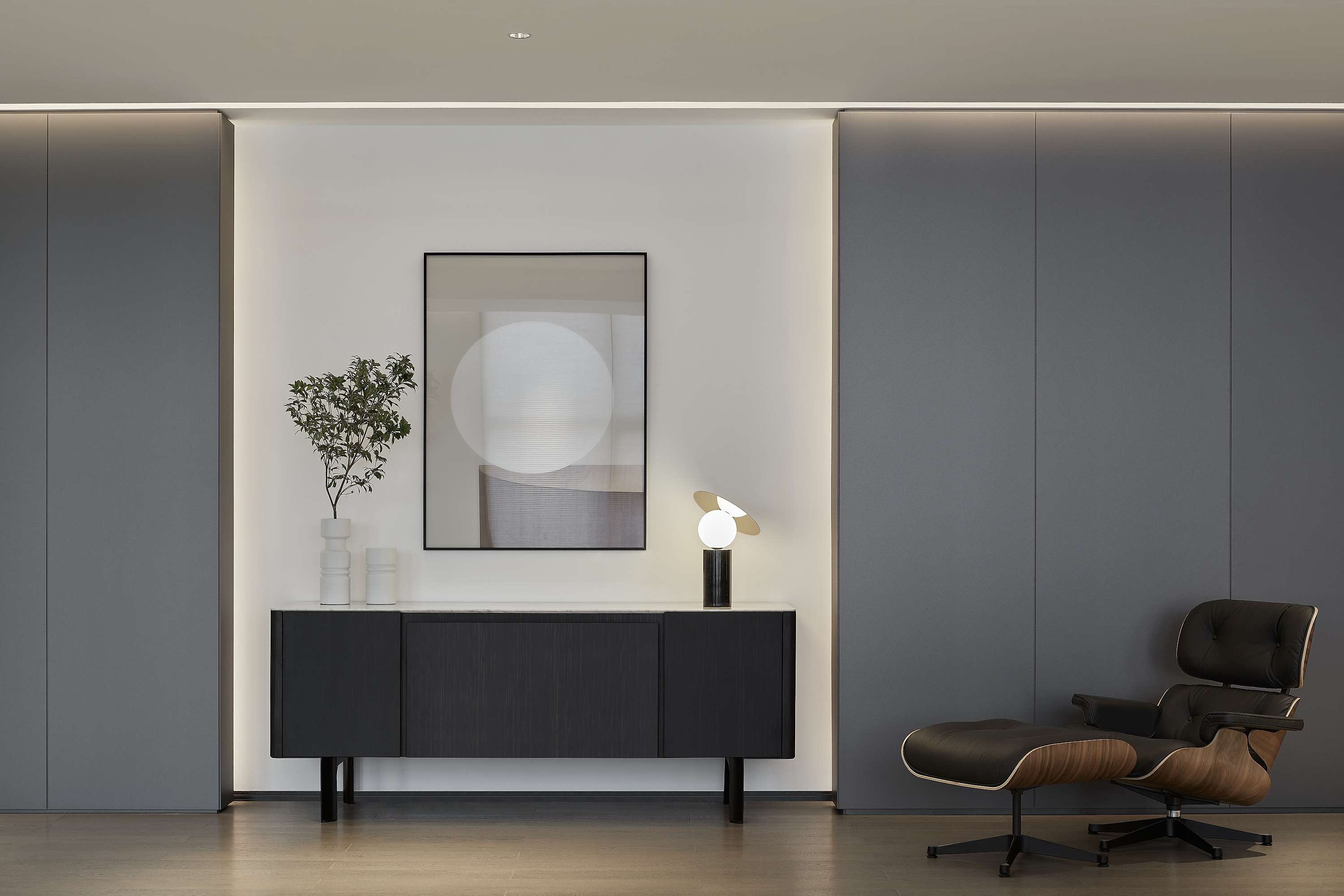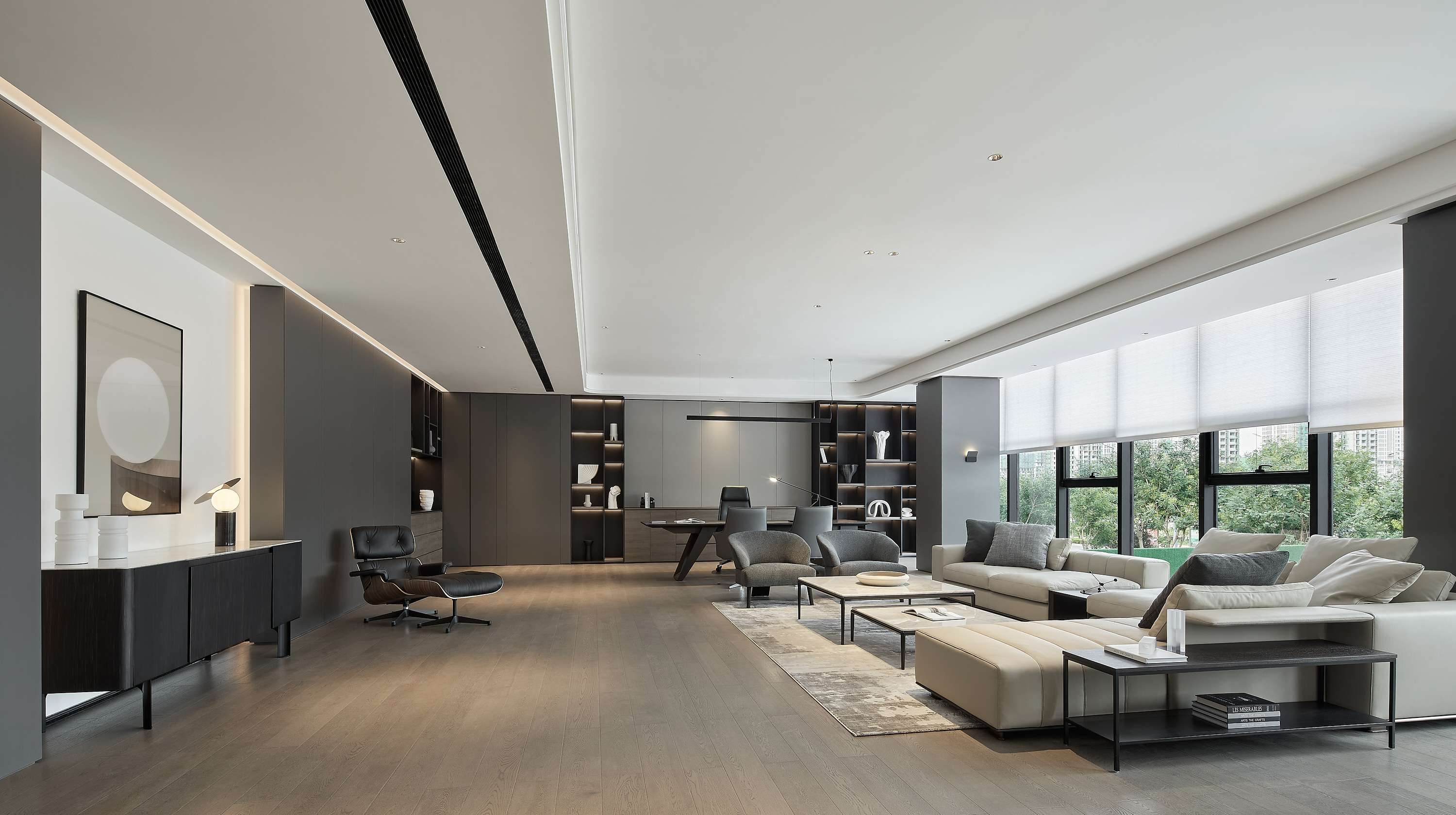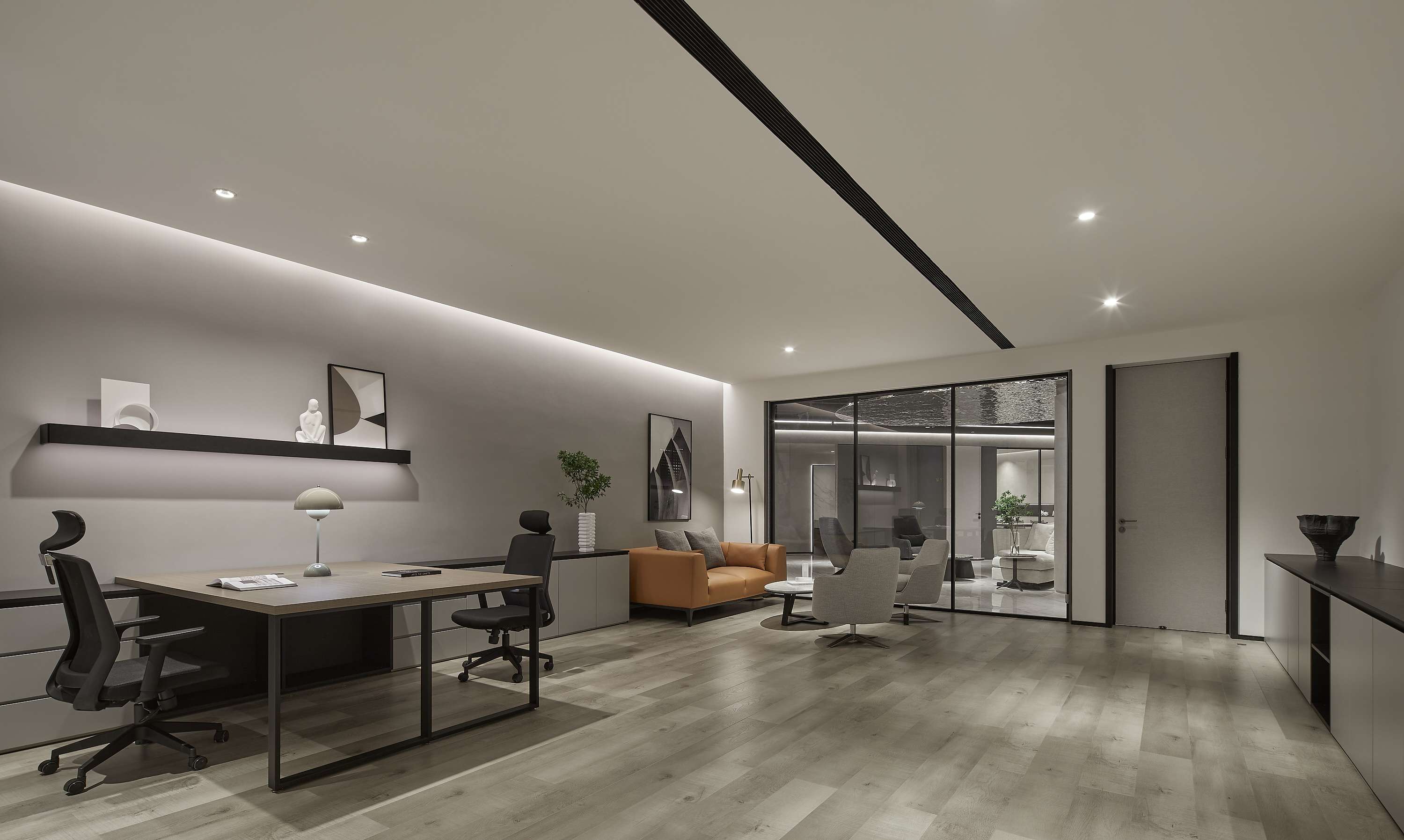 空间布局:摆件的力量不容小觑,在立面光带的衬托下悄然有了展览的意味。我们将最好的视野留给了总经理办公室的空间。整面的窗最大程度给了接待区最好的阳光,使得本就开阔的空间在视觉上更为大气,隐藏灯带的使用为办公环境营造了安静的工作氛围。在卧室同样运用了氛围光来打造休息空间的闲适和安全感——安全,优雅,品质,是永恒的追求。在此间,窗明几净,绿树作伴,时间也慢了起来。