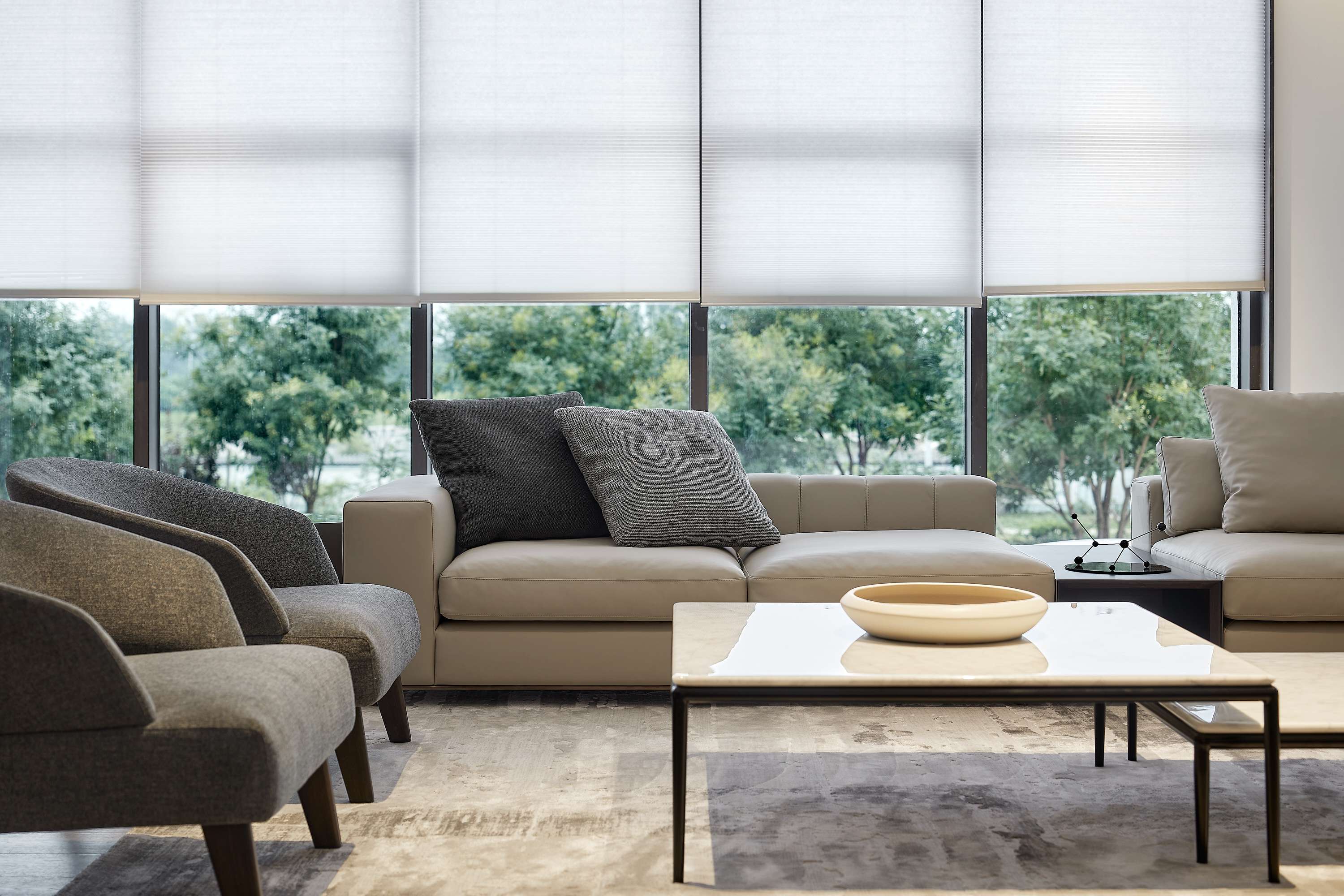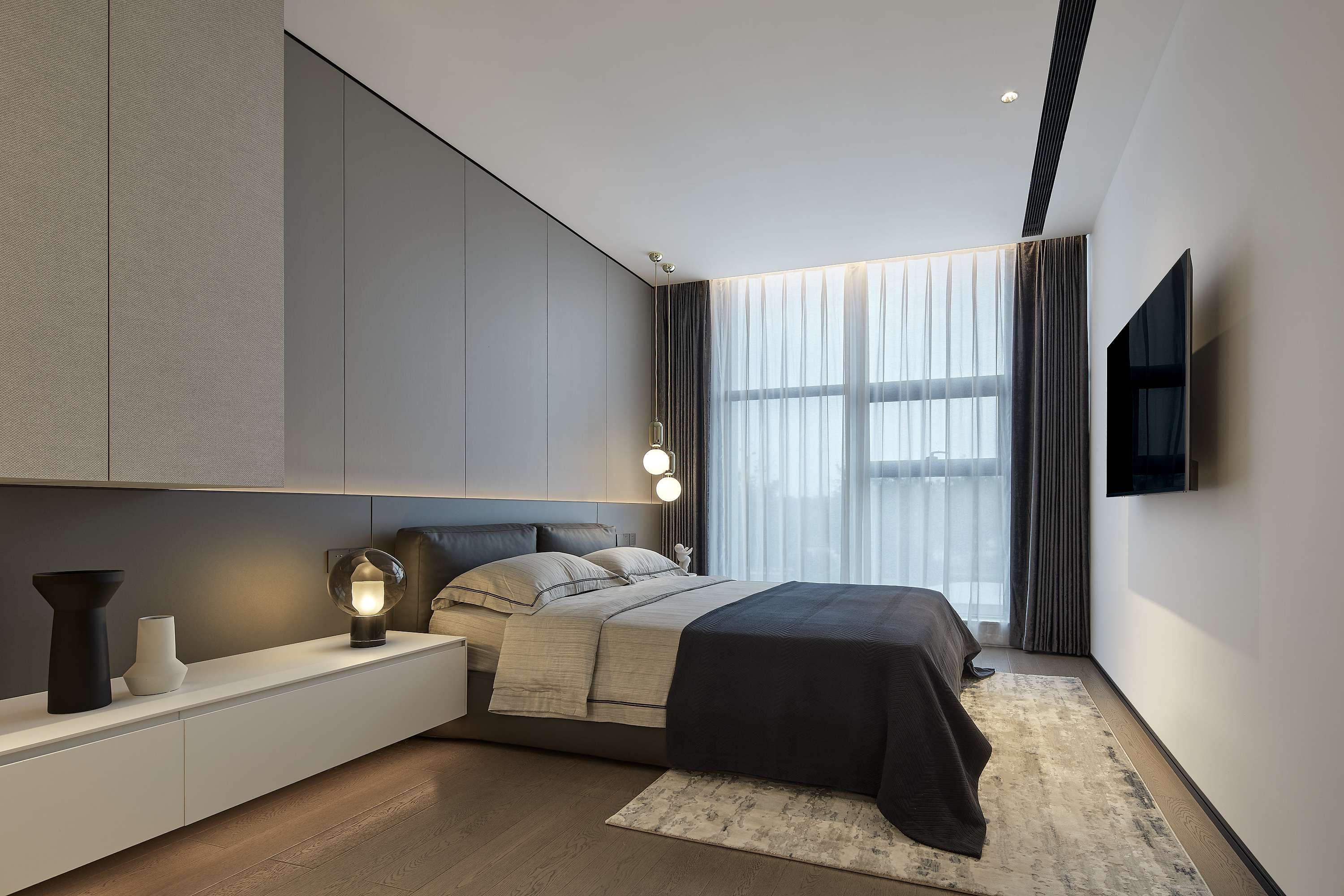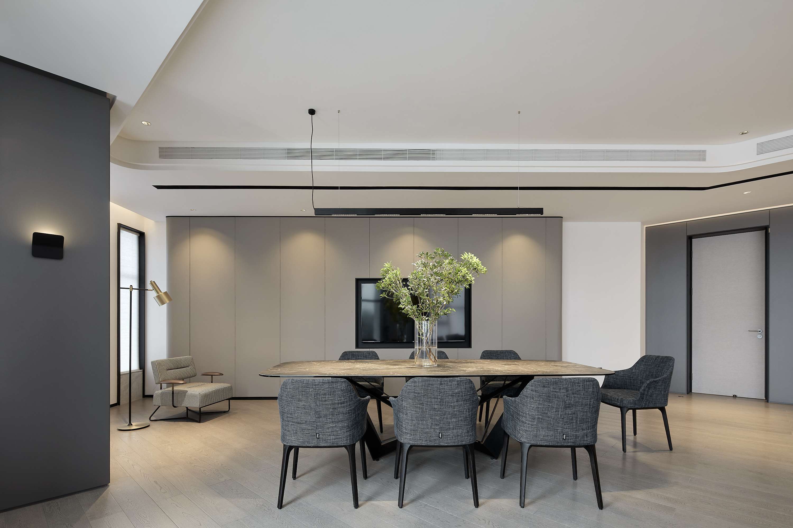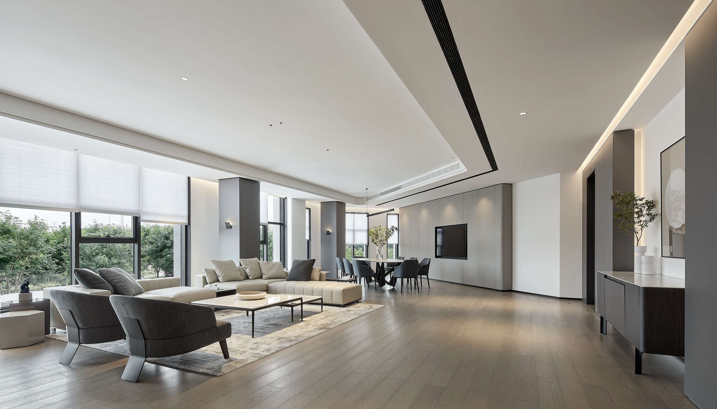 空间布局:摆件的力量不容小觑,在立面光带的衬托下悄然有了展览的意味。我们将最好的视野留给了总经理办公室的空间。整面的窗最大程度给了接待区最好的阳光,使得本就开阔的空间在视觉上更为大气,隐藏灯带的使用为办公环境营造了安静的工作氛围。在卧室同样运用了氛围光来打造休息空间的闲适和安全感——安全,优雅,品质,是永恒的追求。在此间,窗明几净,绿树作伴,时间也慢了起来。