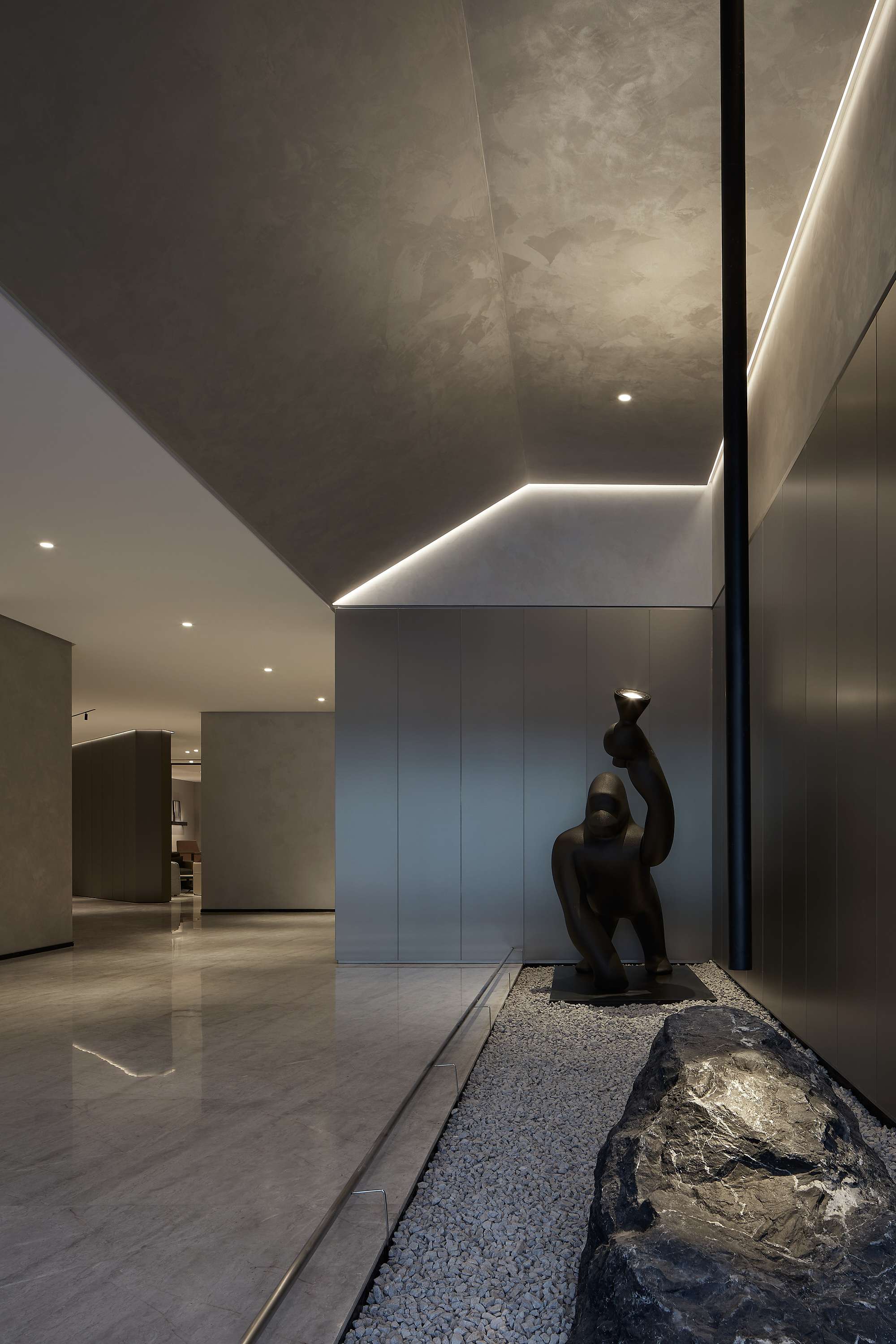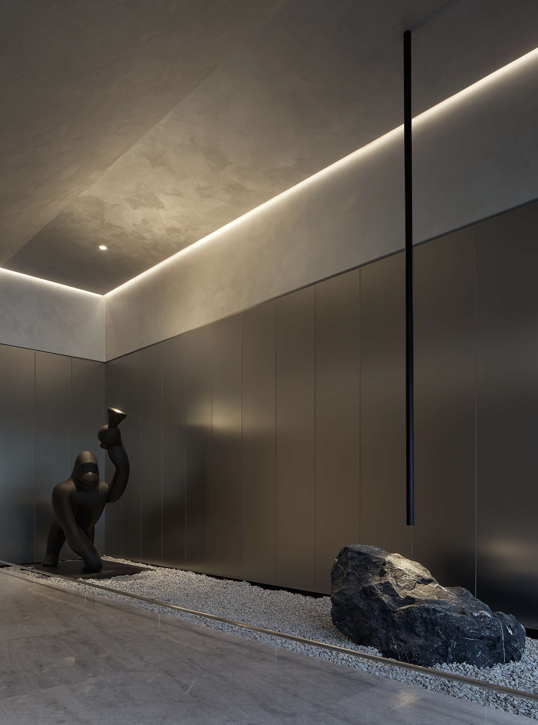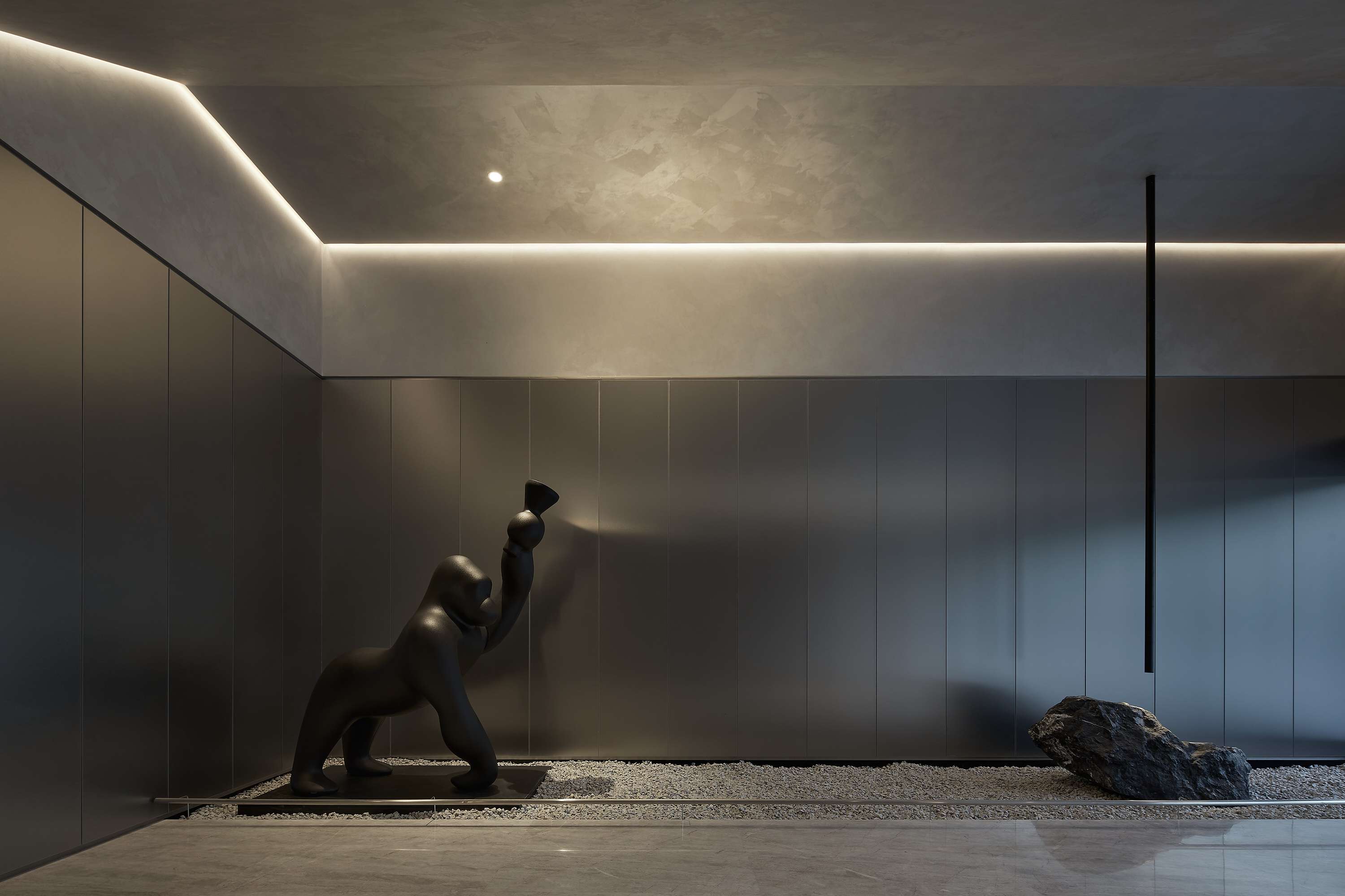 空间意境:空间是由进入大厅开始的。地面的粼粼灯影引导着来客进一步的探寻,临旁的散石小道无息缓解了冷硬质感的厅,添了漫步的悠然,其间矗立的形态奇异的石头与猩猩形态的装置相对而立——浑然天成与人工精巧在此时达到了高度契合。而立面的金属板回应顶面的一线白色光亮,映照出了光影作的画。顶面使用的低调纹理给了空间恰到好处的细节。跟随着地面上利落的折线走廊,脚下的石材纹理在线状灯带之下便有了暗光飞舞。