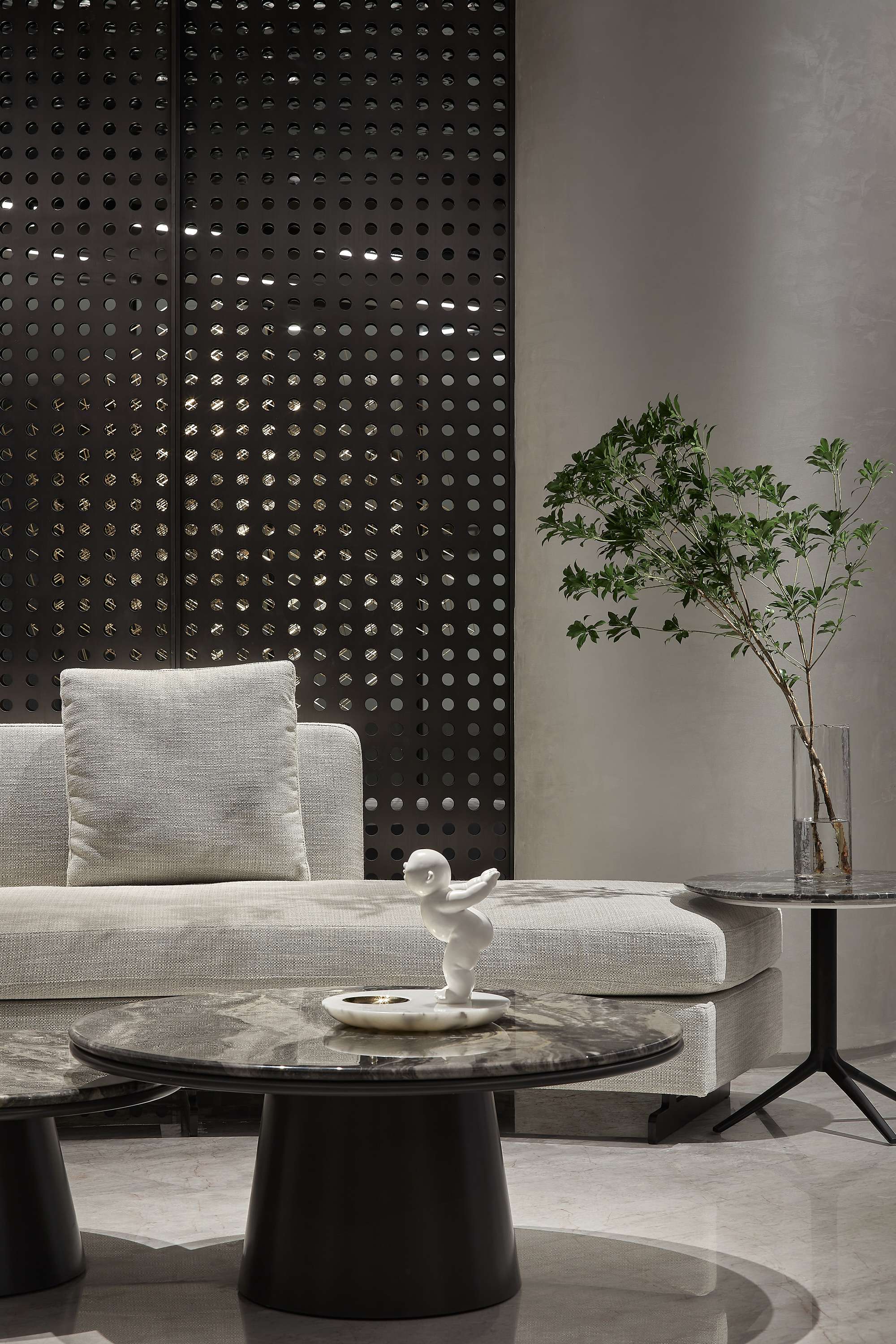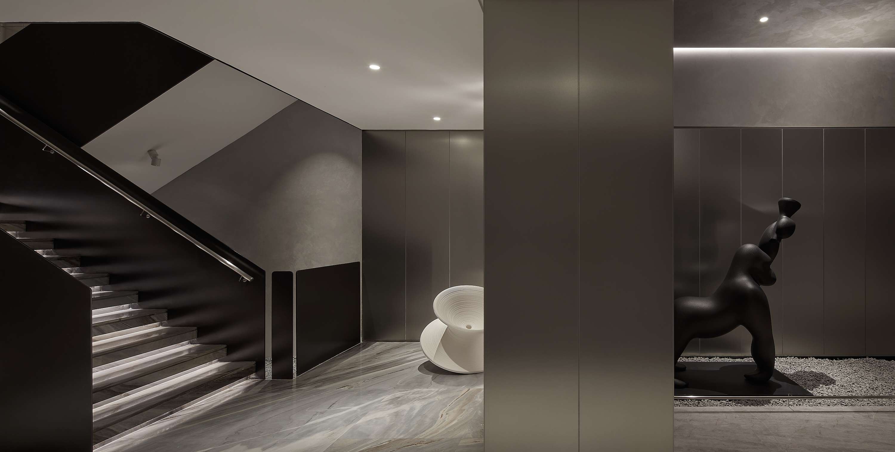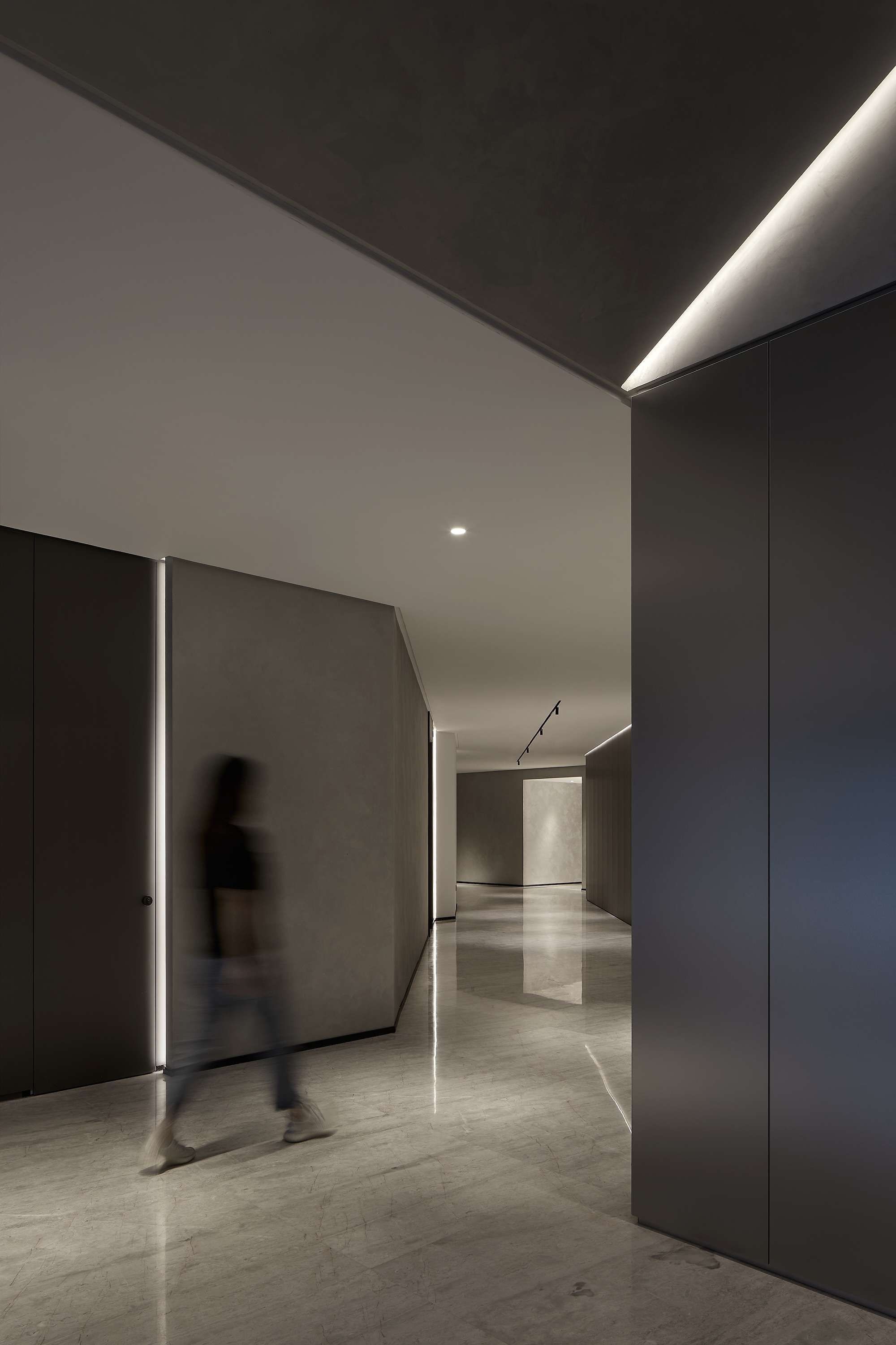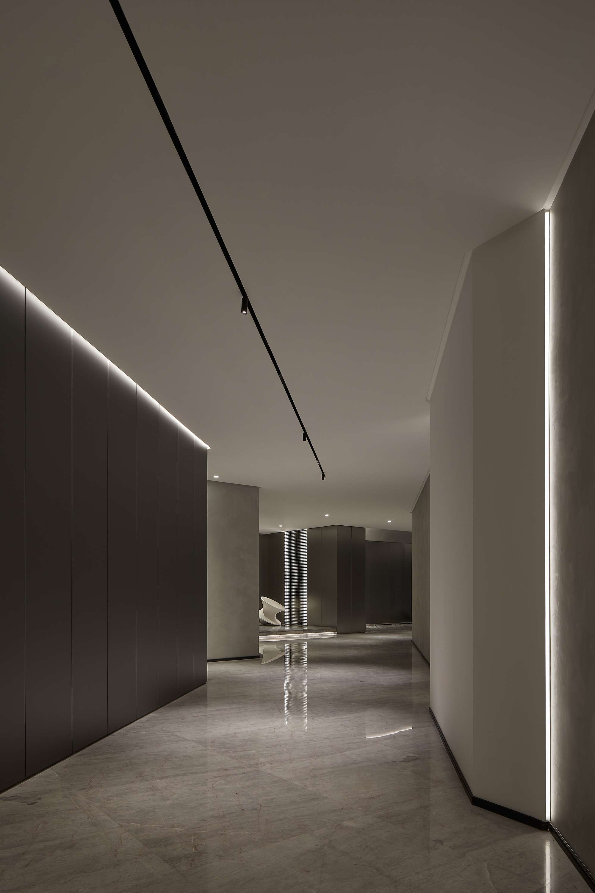 空间意境:空间是由进入大厅开始的。地面的粼粼灯影引导着来客进一步的探寻,临旁的散石小道无息缓解了冷硬质感的厅,添了漫步的悠然,其间矗立的形态奇异的石头与猩猩形态的装置相对而立——浑然天成与人工精巧在此时达到了高度契合。而立面的金属板回应顶面的一线白色光亮,映照出了光影作的画。顶面使用的低调纹理给了空间恰到好处的细节。跟随着地面上利落的折线走廊,脚下的石材纹理在线状灯带之下便有了暗光飞舞。