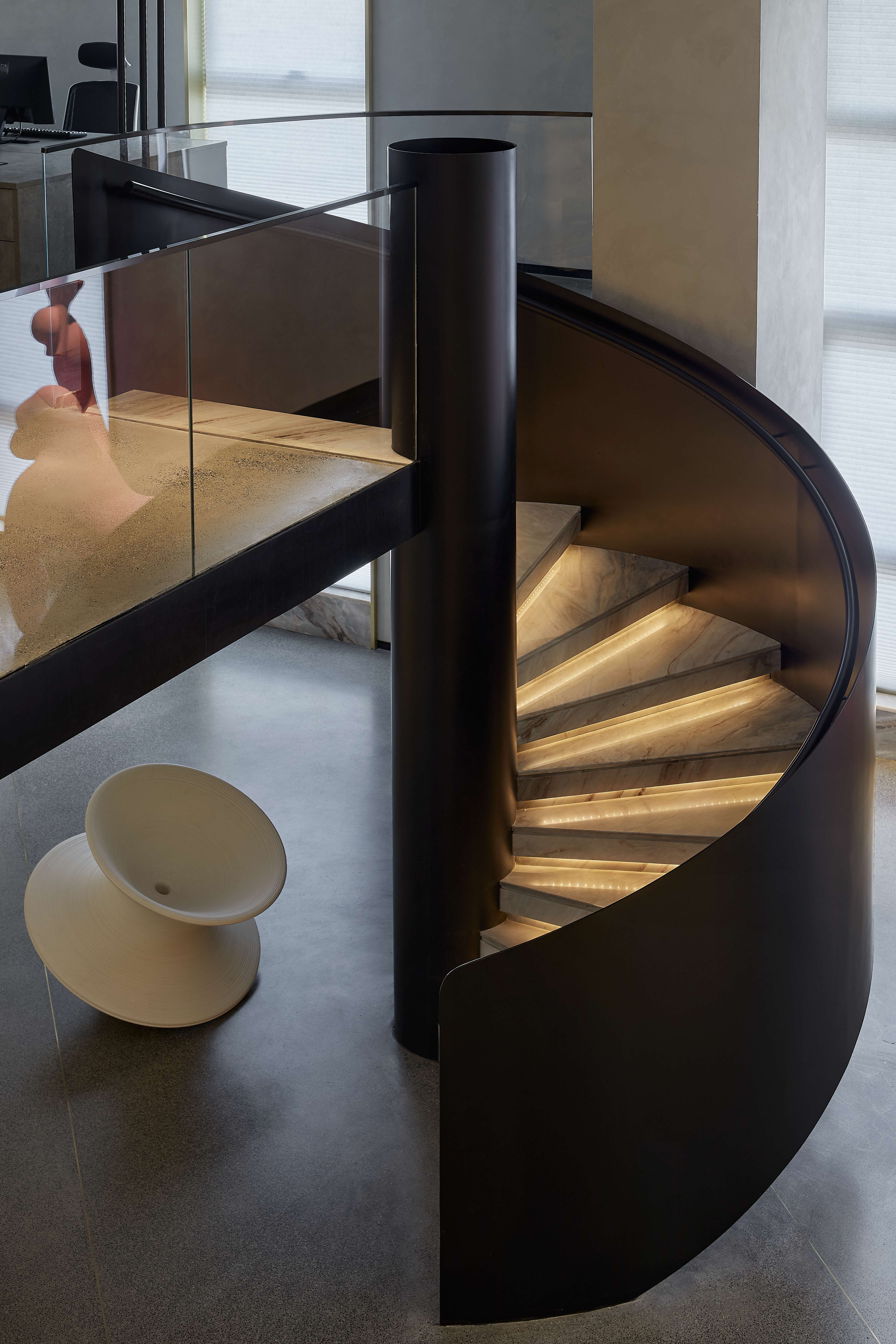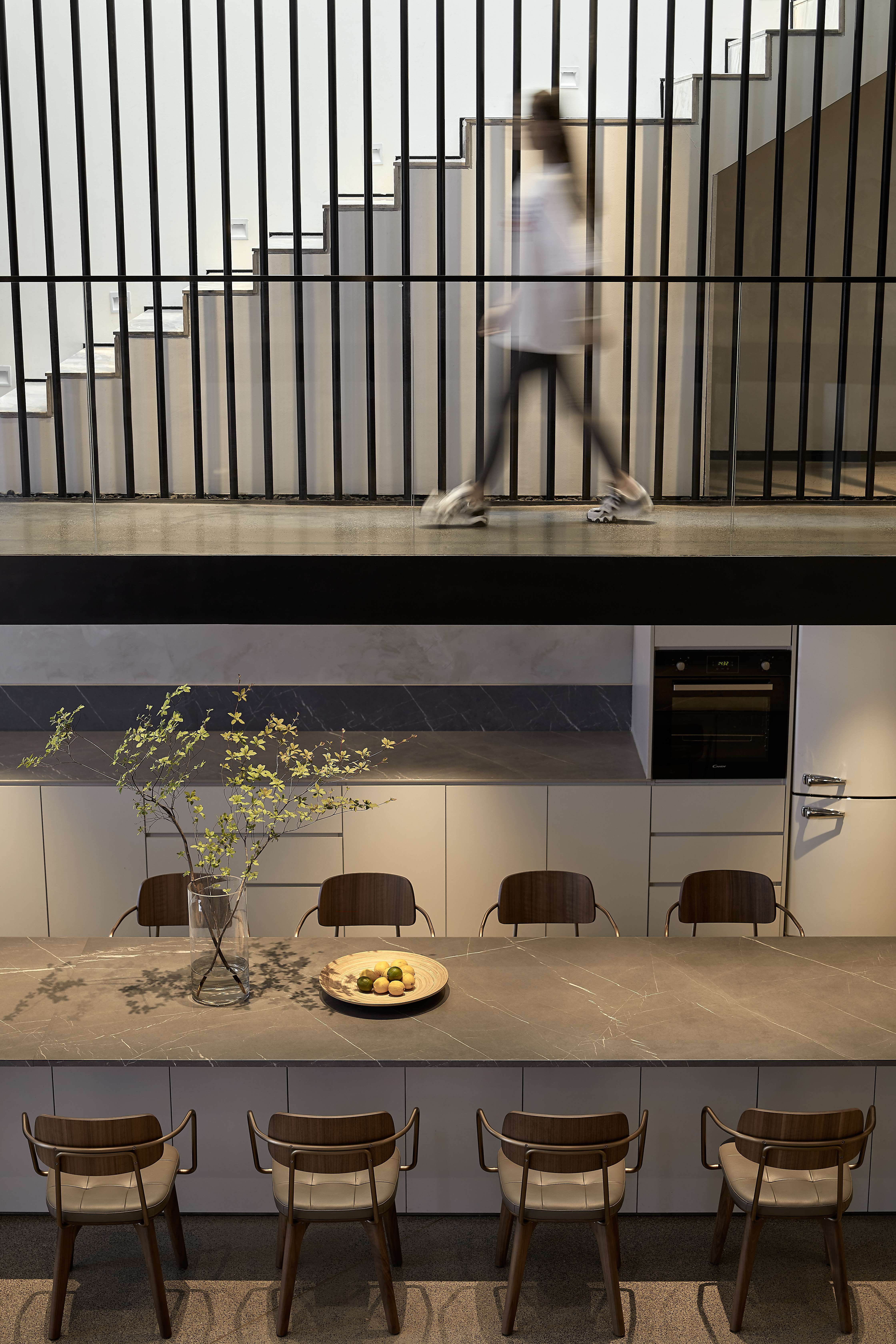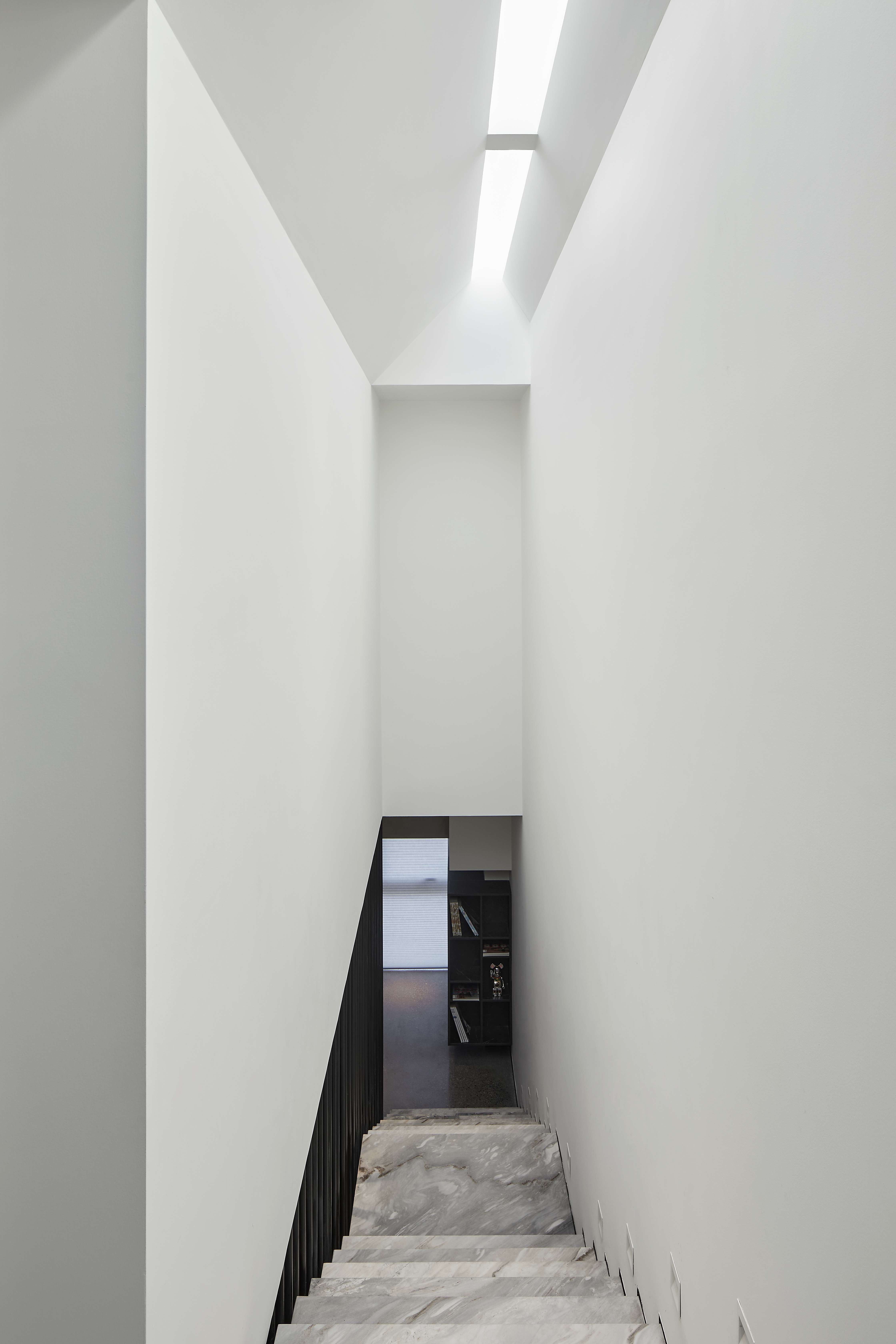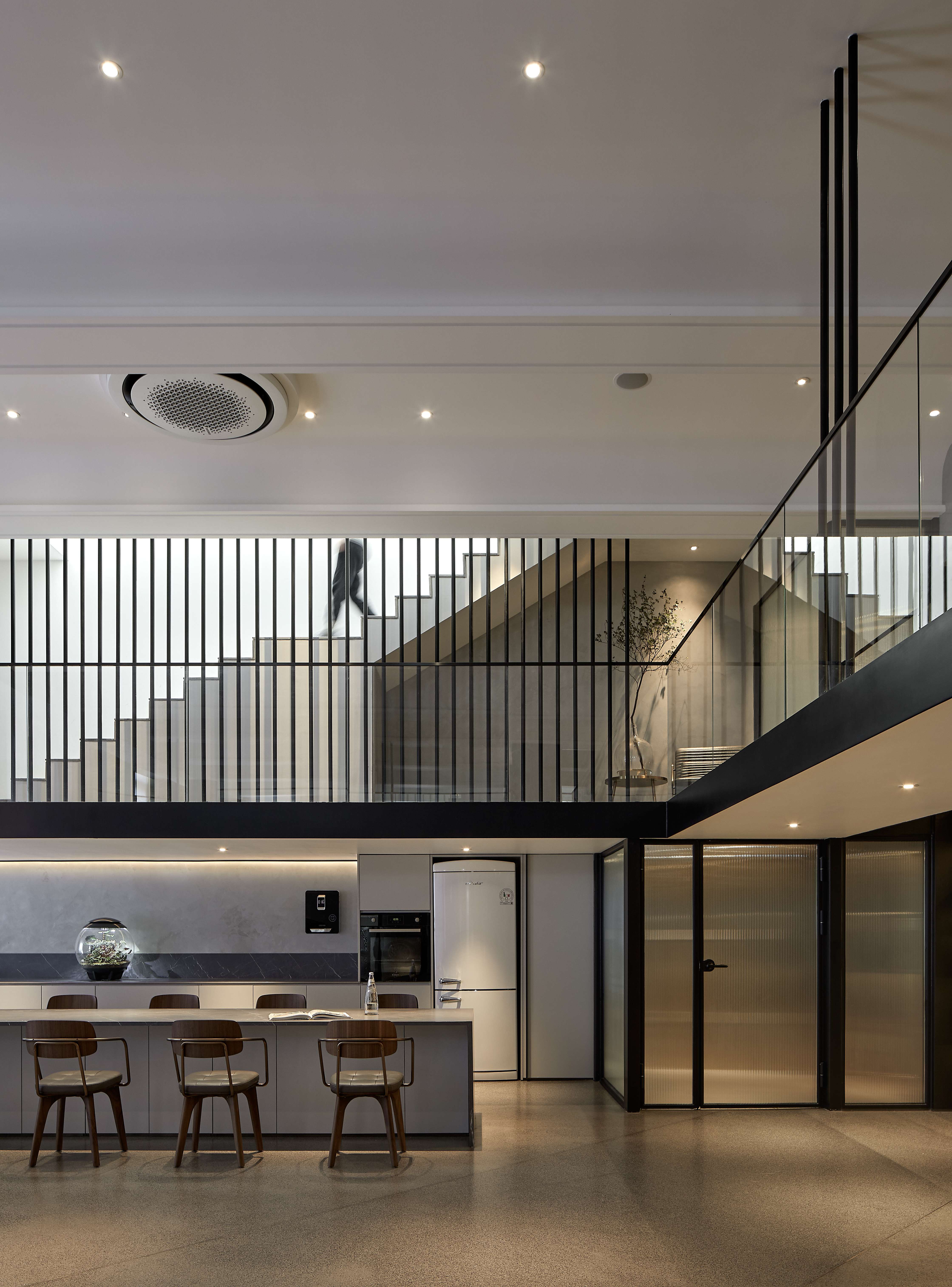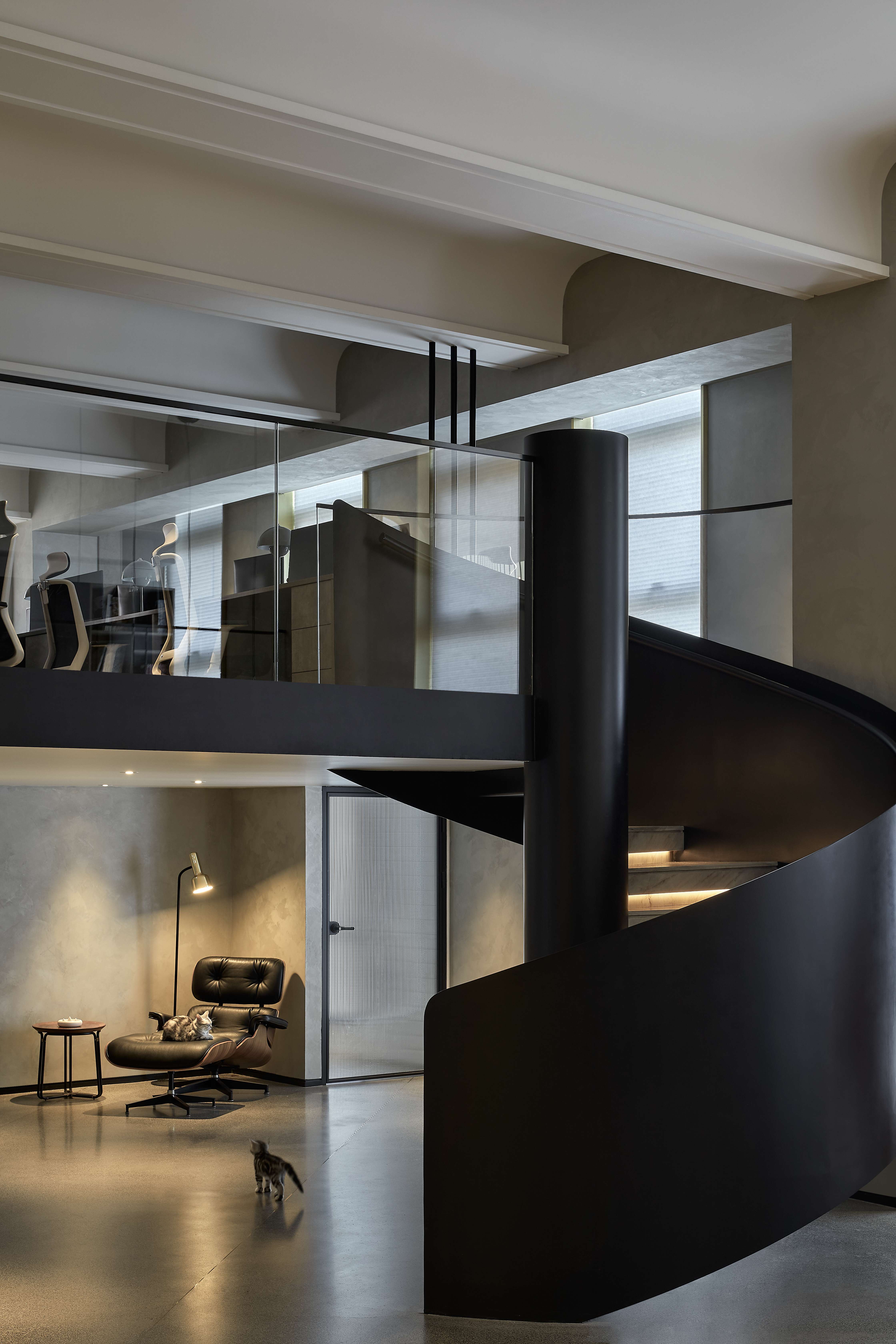 从三层楼梯间的天窗投射下的天光满足了白日里的照明需求,侧边的低位照明则用于夜间的光补充。白色楼梯间窄高而通透,营造出高级简单的氛围;大理石纹的阶面柔和融入进纯白色空间,给此处艺术性的空间增加了趣味。三层空间延续了整体空间的中性简约感:整面的落地窗的设置极大的延伸了空间感,直线简洁,弧线富于柔和变化;木质温暖,石纹材料带来精致冷感——而所有元素的克制运用得以被浅灰的色调和谐。灯光进一步营造出温暖、精致的通透氛围,最终成为访客与设计师无障碍沟通的交流场所。在这里,深色和浅色互衬,纯净的视觉感受是永恒的主旋律。