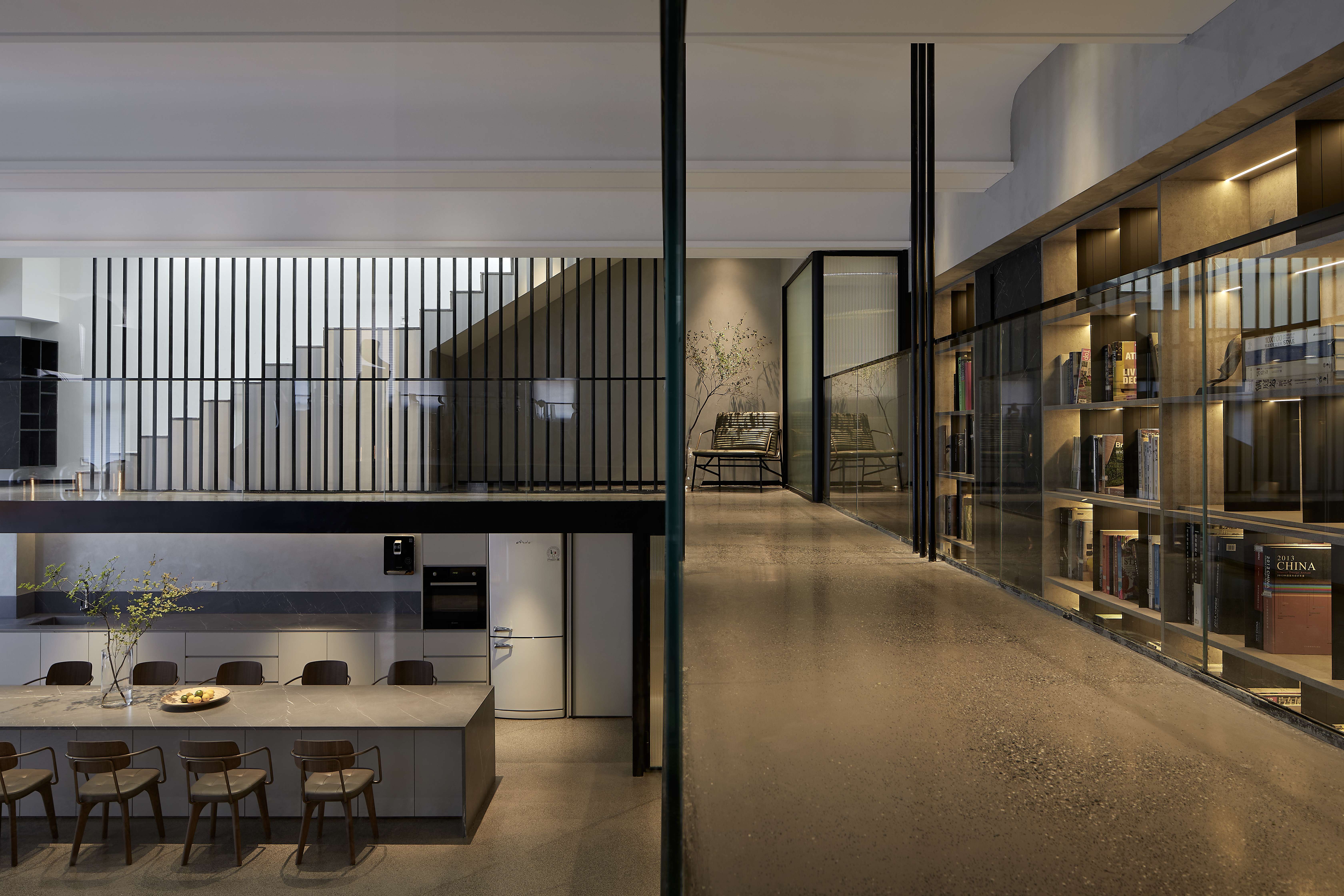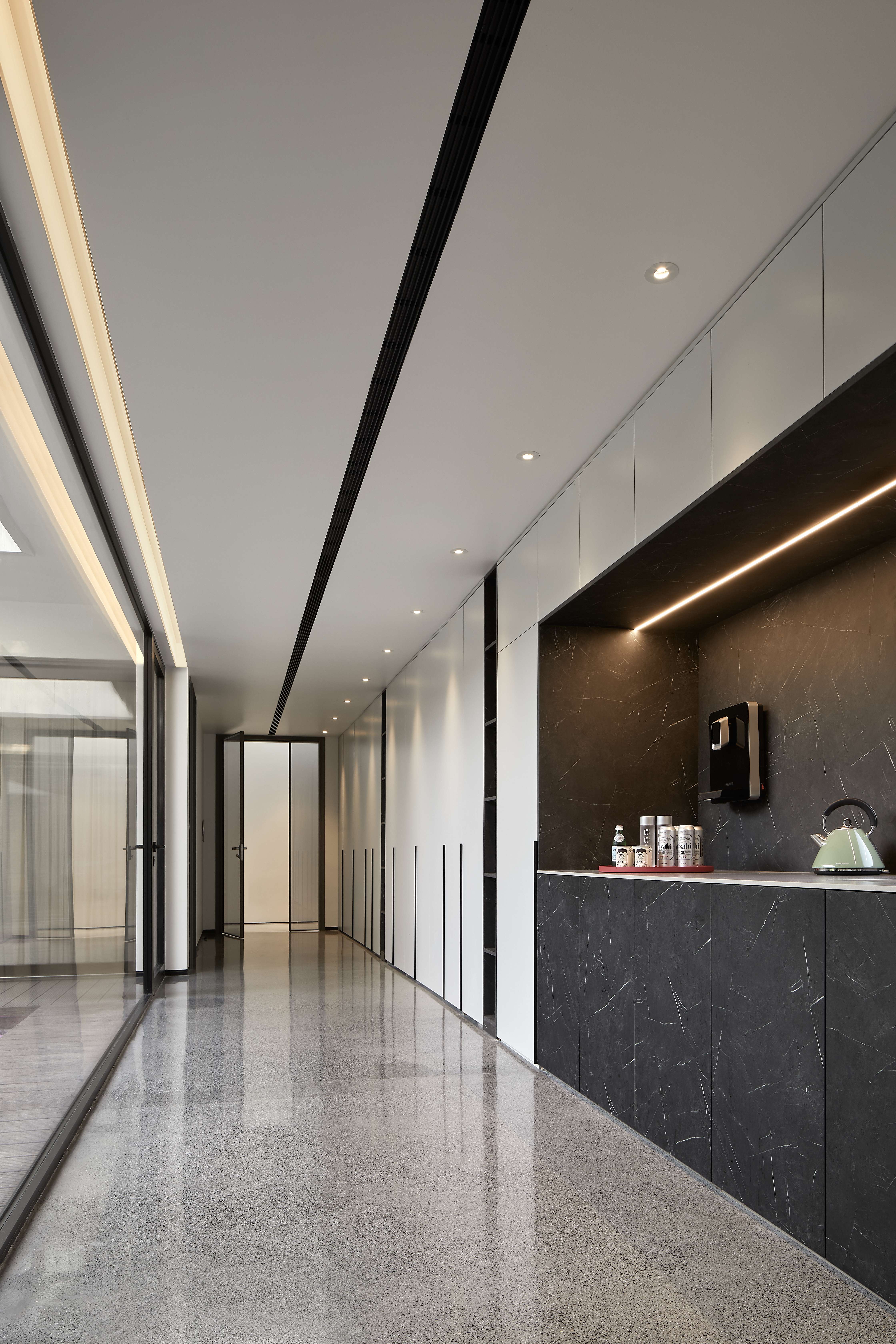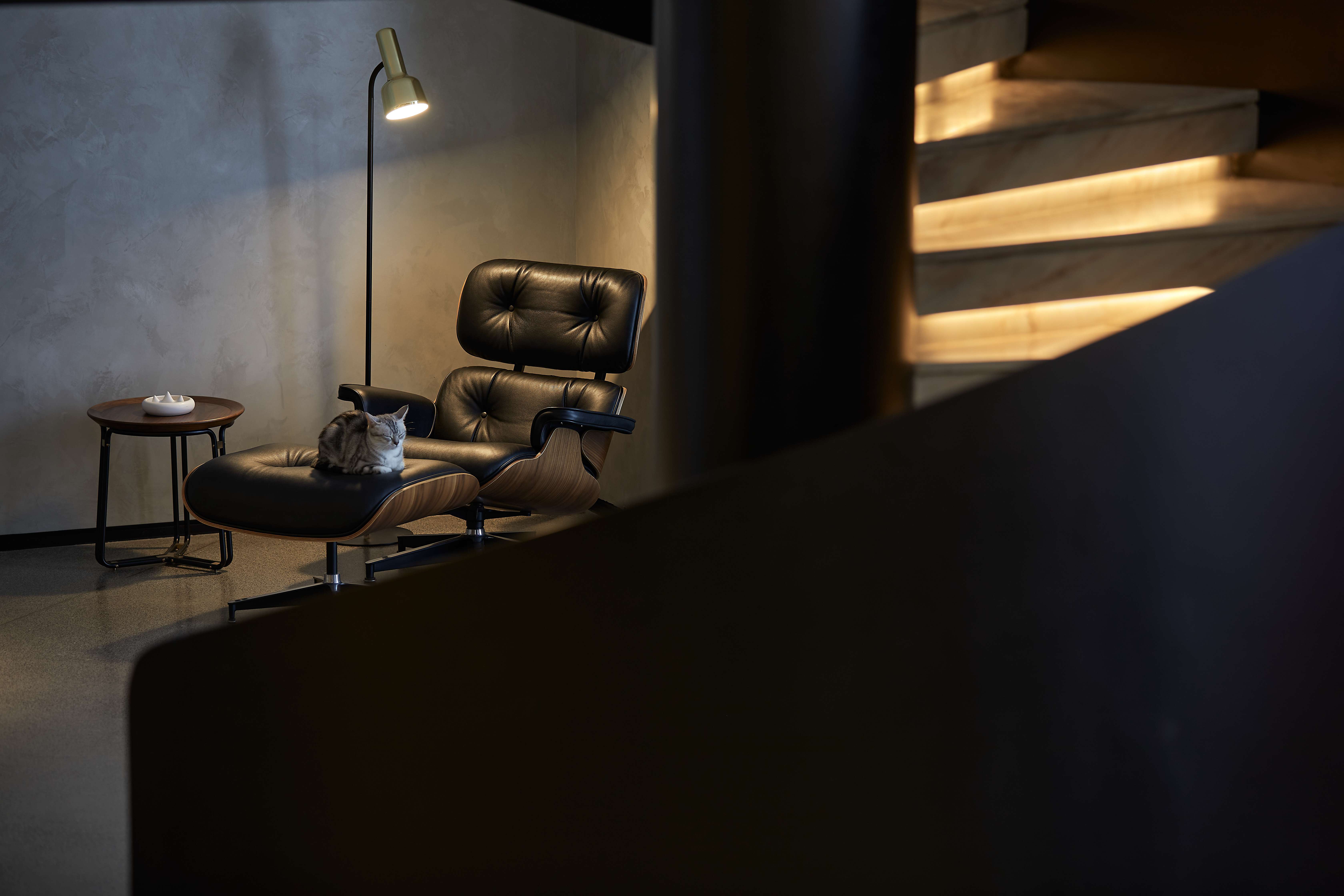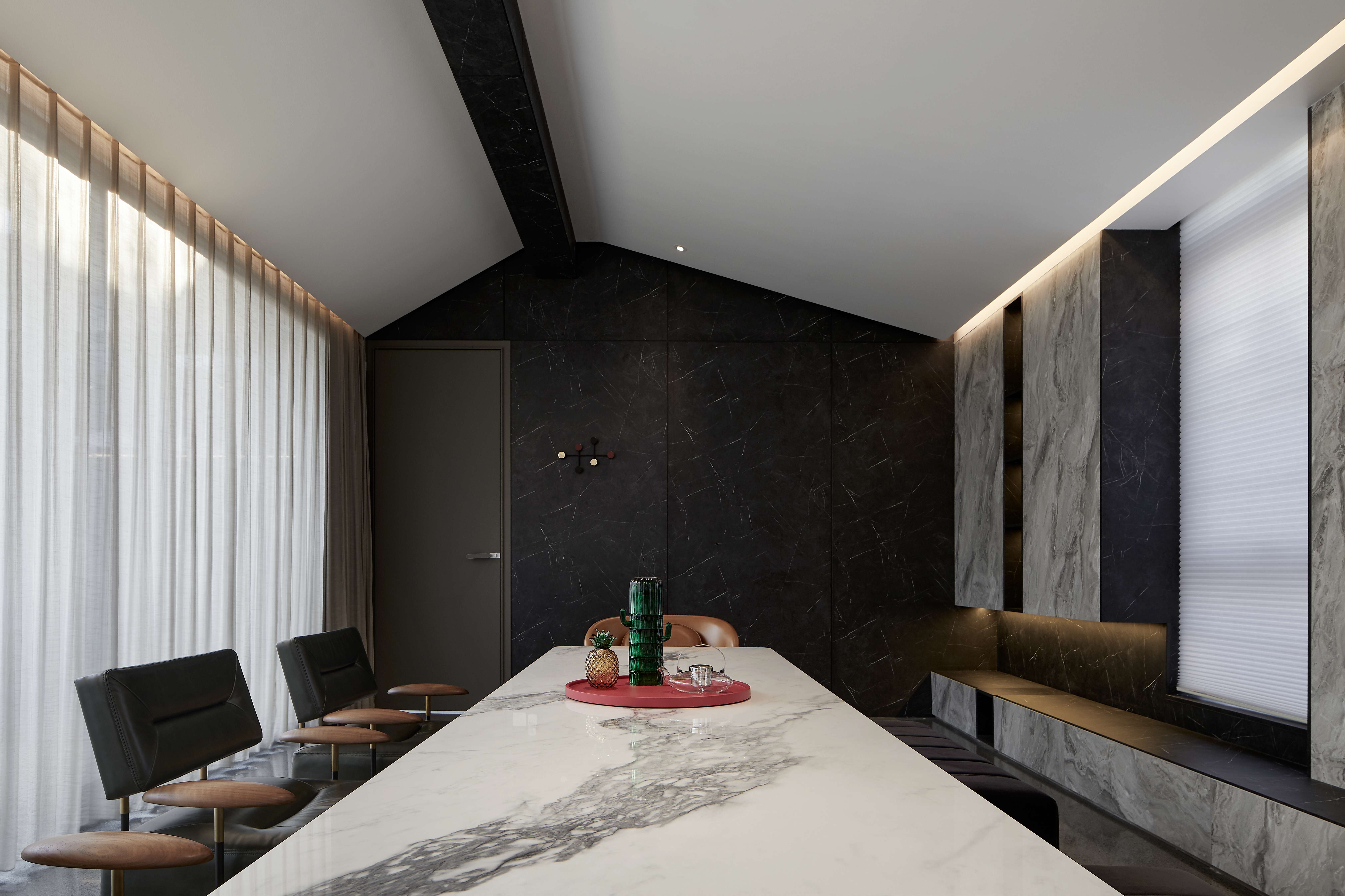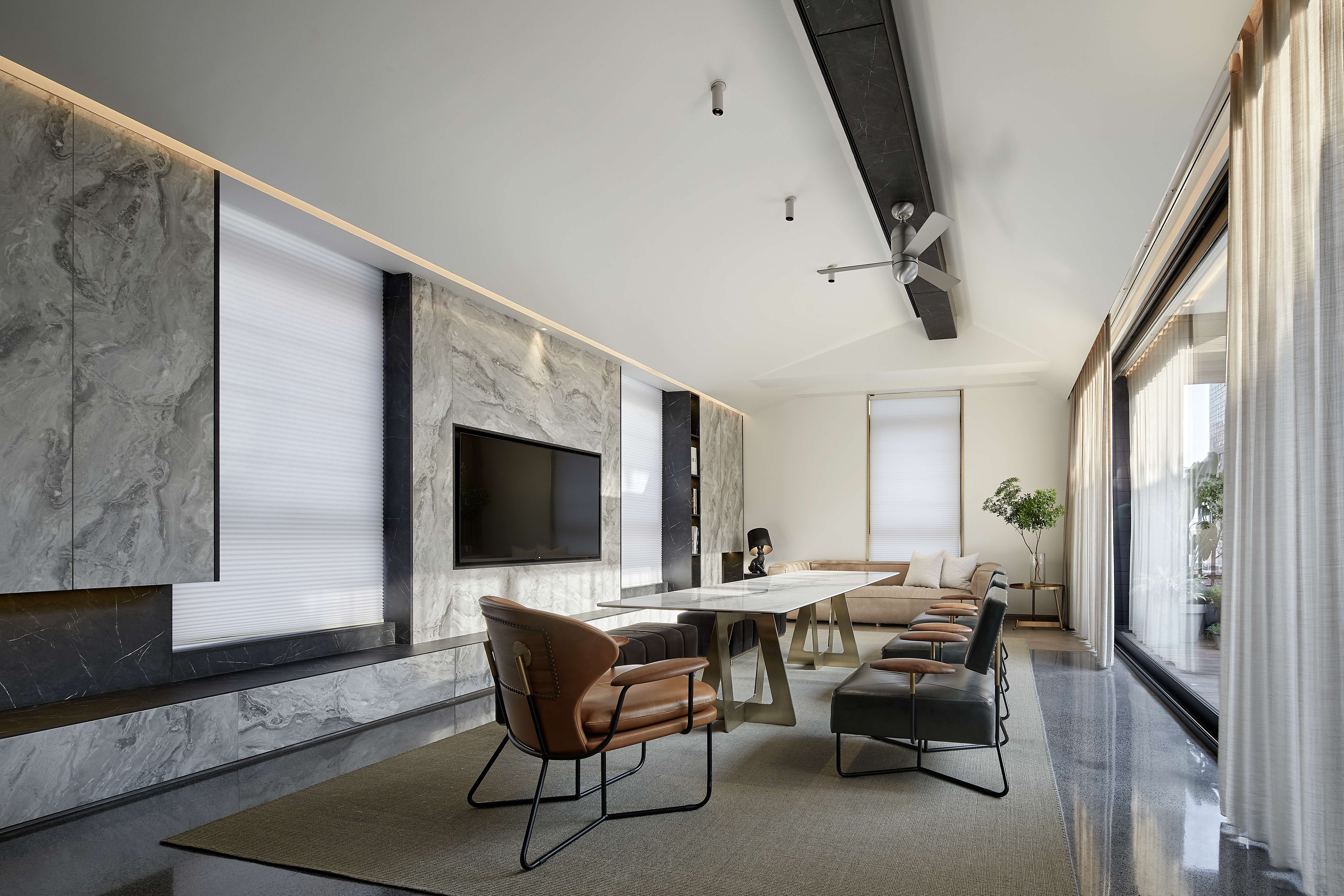 从三层楼梯间的天窗投射下的天光满足了白日里的照明需求,侧边的低位照明则用于夜间的光补充。白色楼梯间窄高而通透,营造出高级简单的氛围;大理石纹的阶面柔和融入进纯白色空间,给此处艺术性的空间增加了趣味。三层空间延续了整体空间的中性简约感:整面的落地窗的设置极大的延伸了空间感,直线简洁,弧线富于柔和变化;木质温暖,石纹材料带来精致冷感——而所有元素的克制运用得以被浅灰的色调和谐。灯光进一步营造出温暖、精致的通透氛围,最终成为访客与设计师无障碍沟通的交流场所。在这里,深色和浅色互衬,纯净的视觉感受是永恒的主旋律。