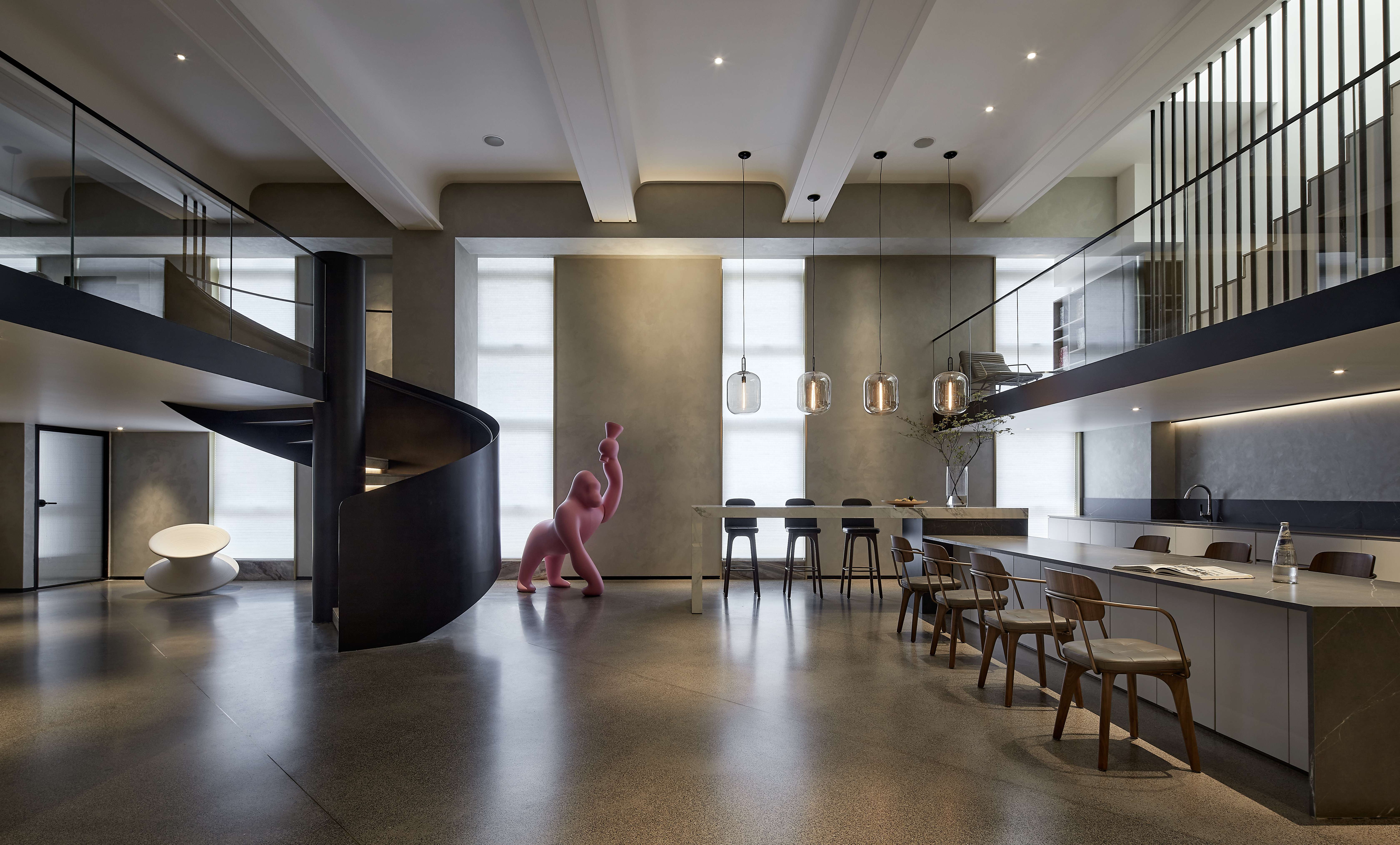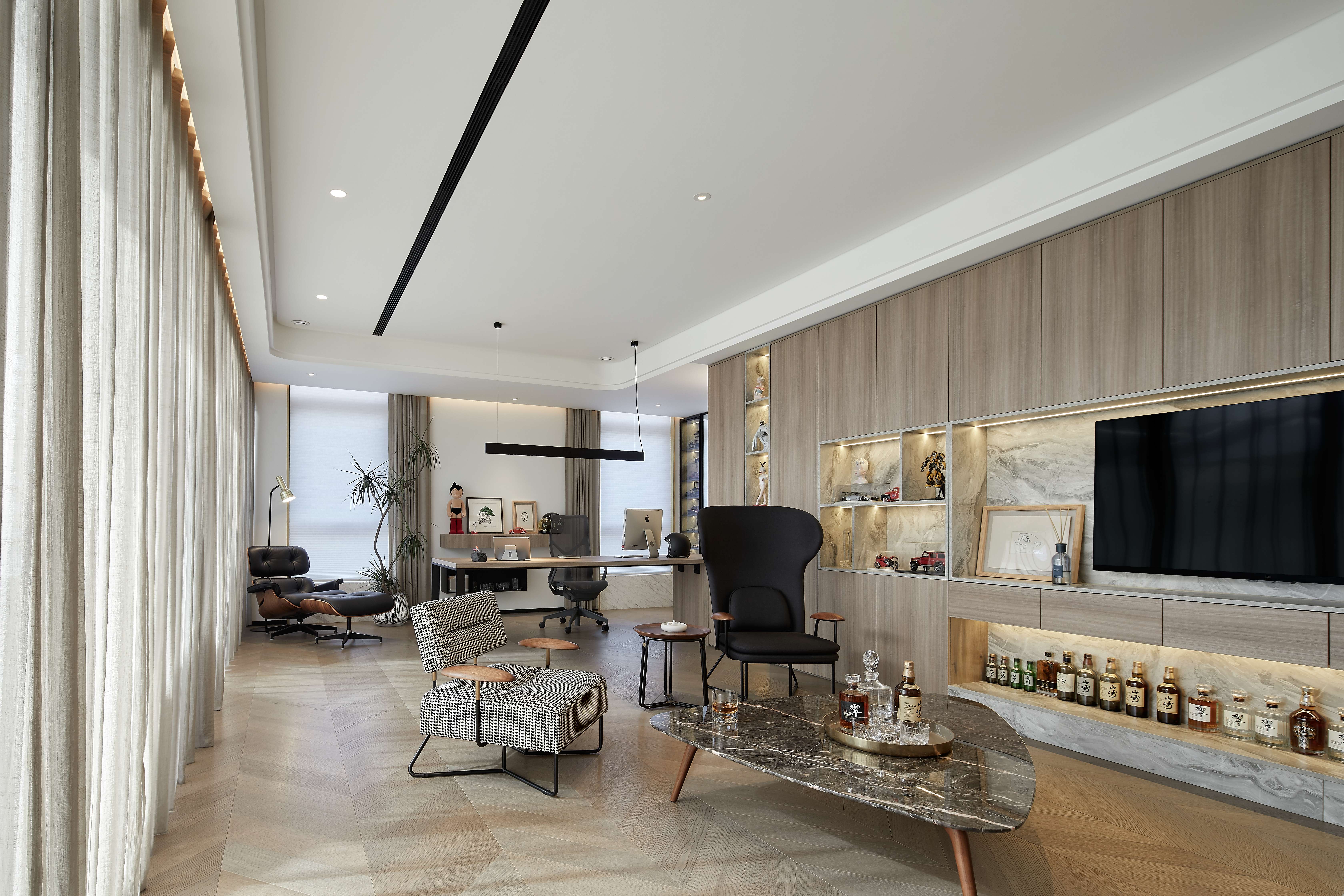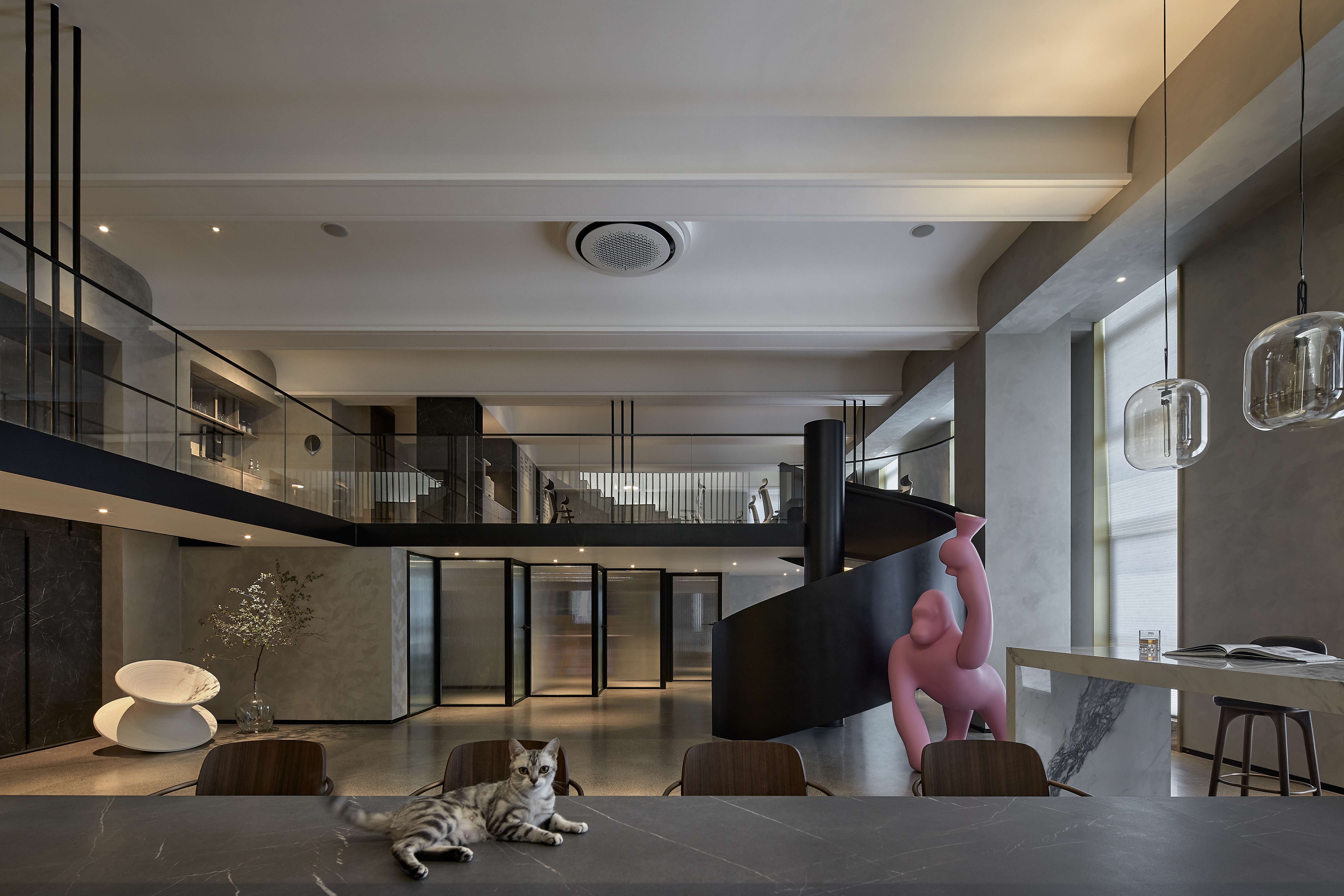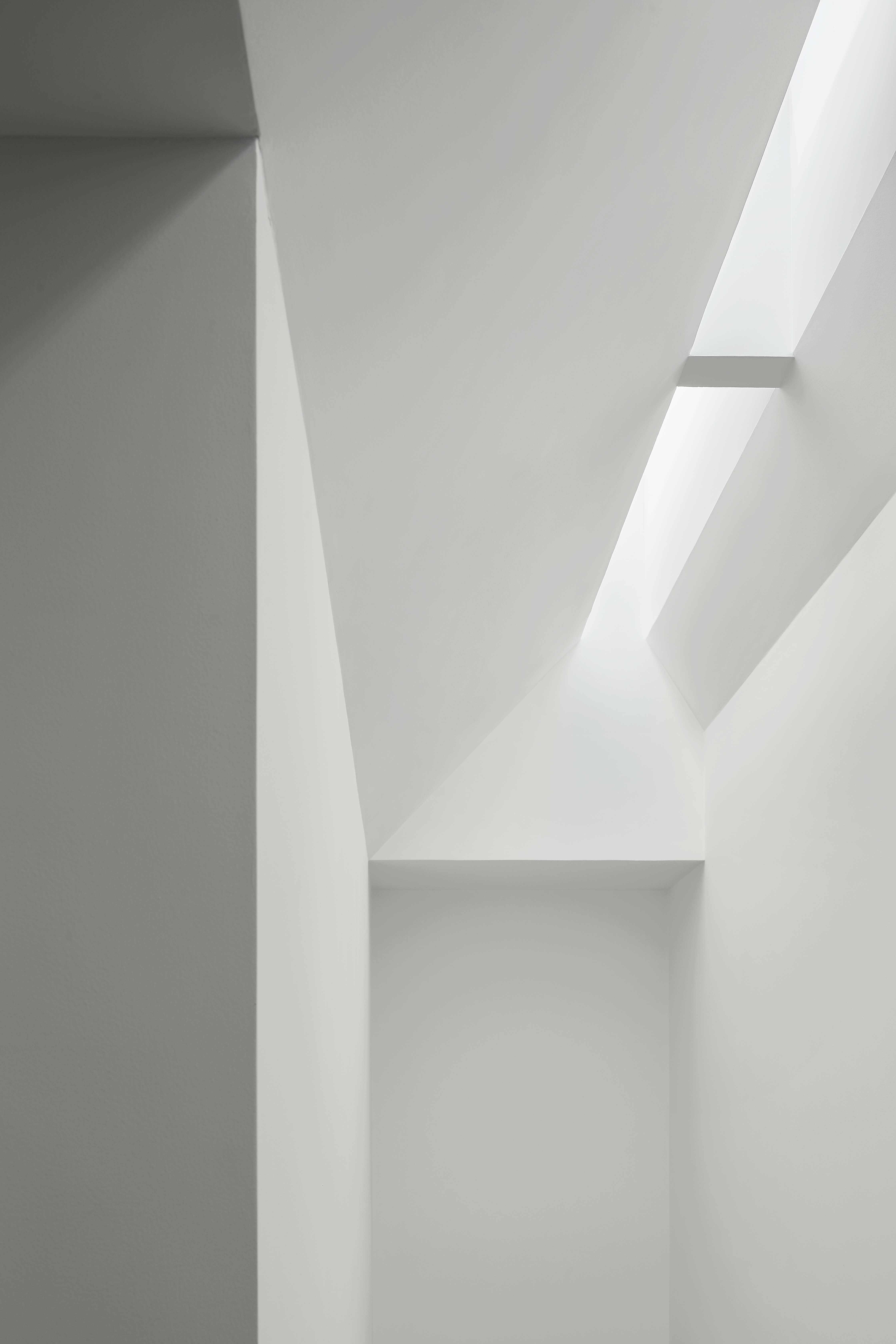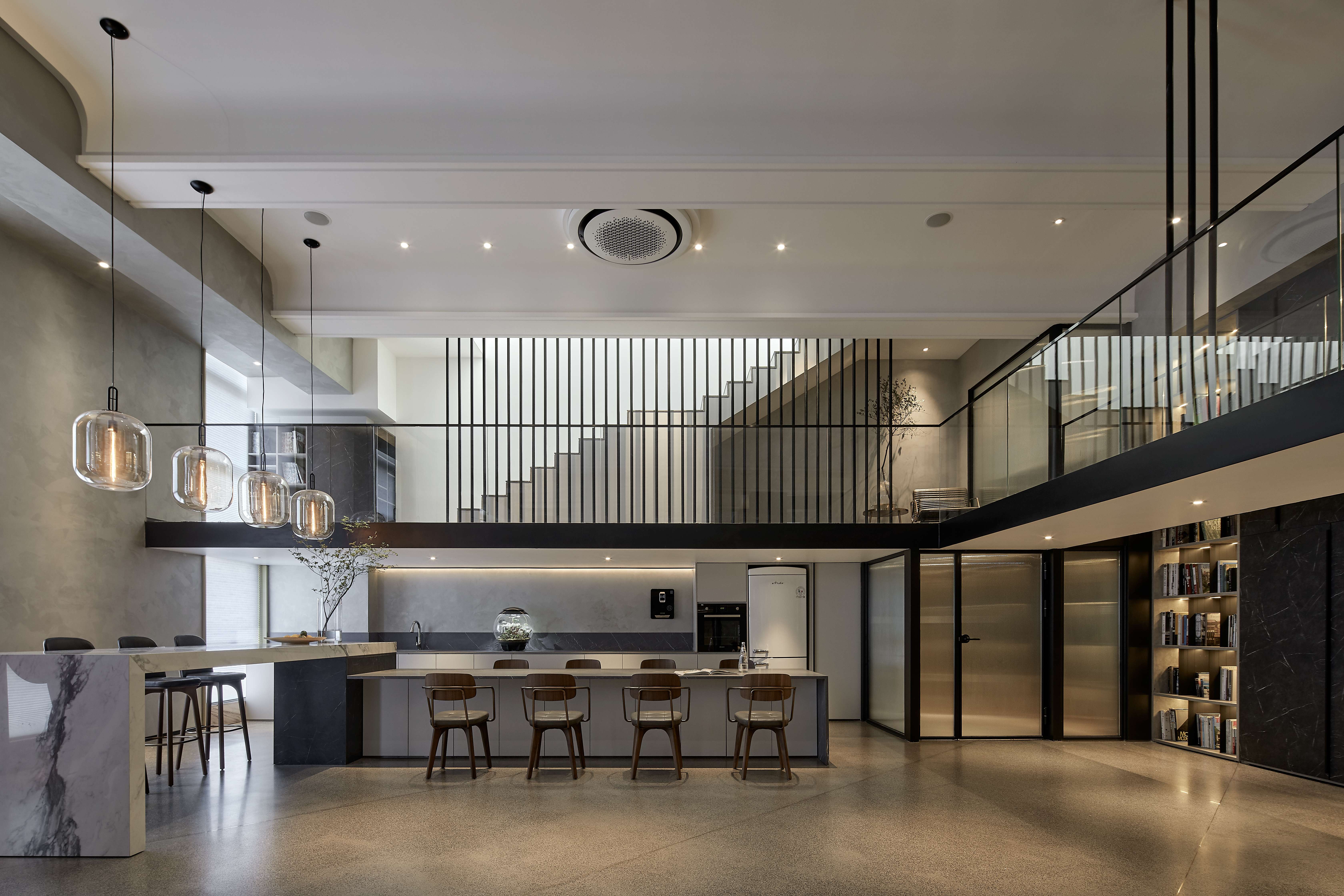 从三层楼梯间的天窗投射下的天光满足了白日里的照明需求,侧边的低位照明则用于夜间的光补充。白色楼梯间窄高而通透,营造出高级简单的氛围;大理石纹的阶面柔和融入进纯白色空间,给此处艺术性的空间增加了趣味。三层空间延续了整体空间的中性简约感:整面的落地窗的设置极大的延伸了空间感,直线简洁,弧线富于柔和变化;木质温暖,石纹材料带来精致冷感——而所有元素的克制运用得以被浅灰的色调和谐。灯光进一步营造出温暖、精致的通透氛围,最终成为访客与设计师无障碍沟通的交流场所。在这里,深色和浅色互衬,纯净的视觉感受是永恒的主旋律。
