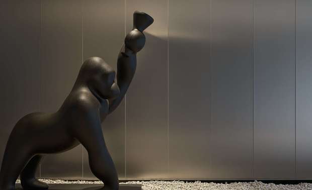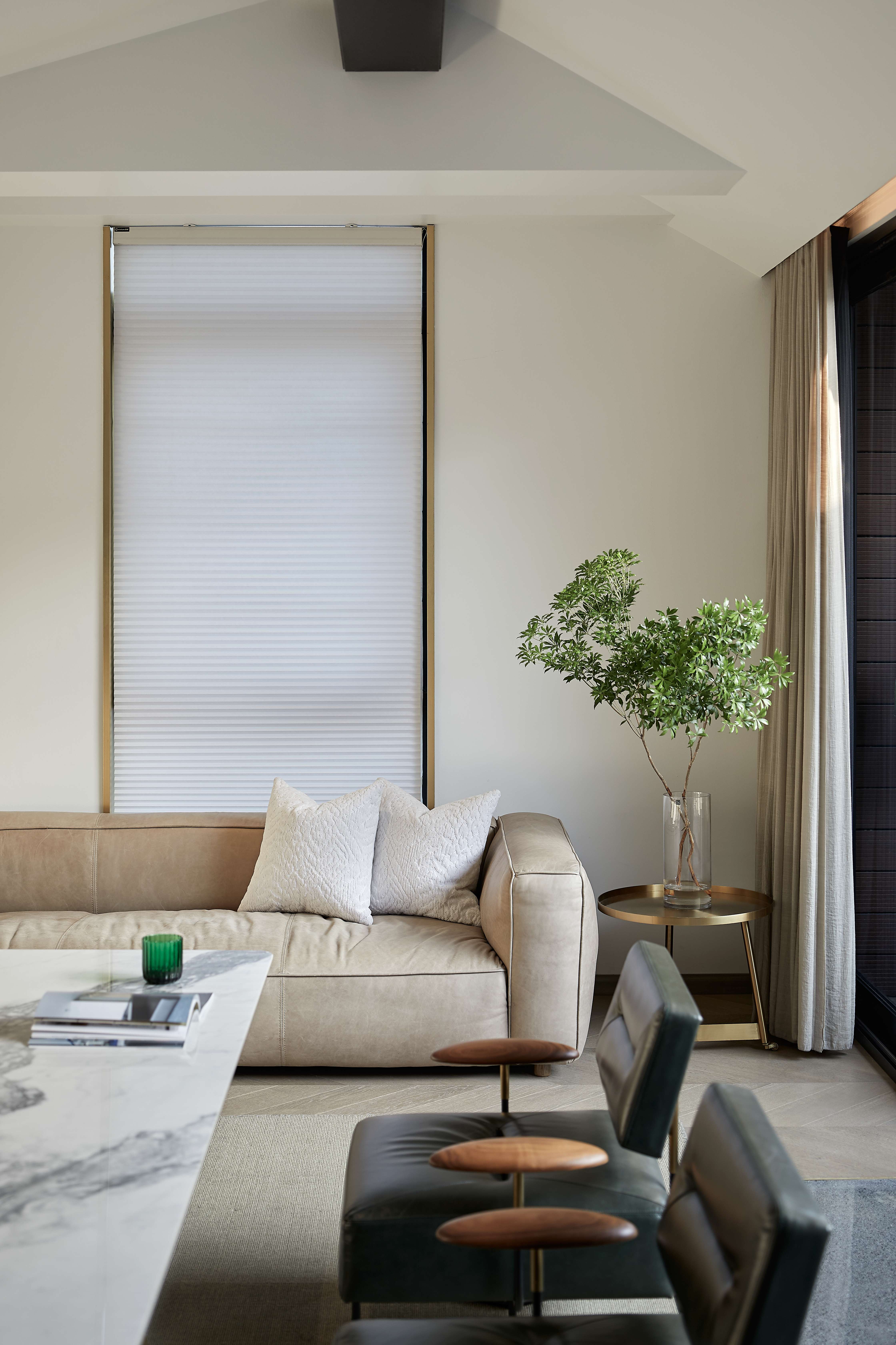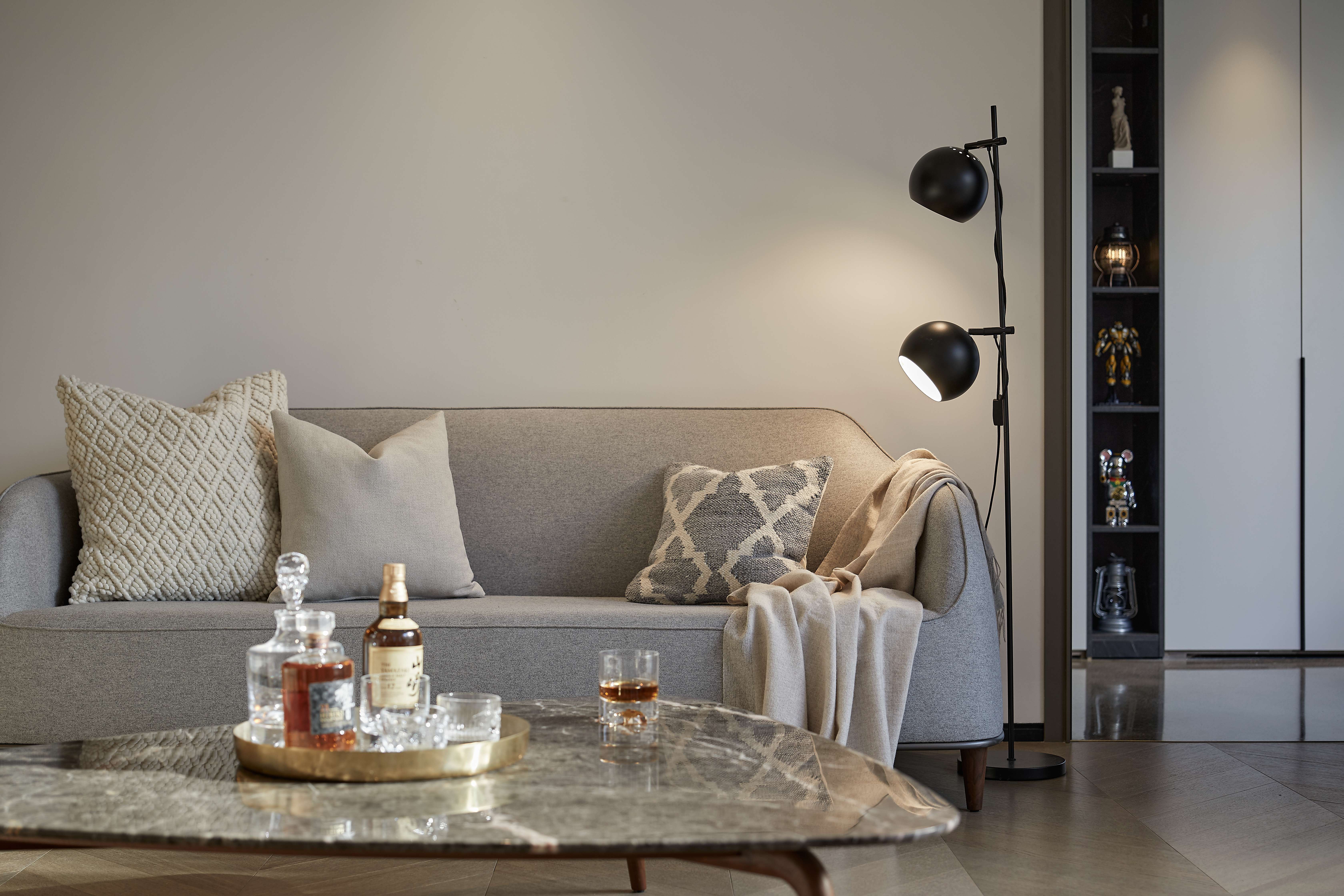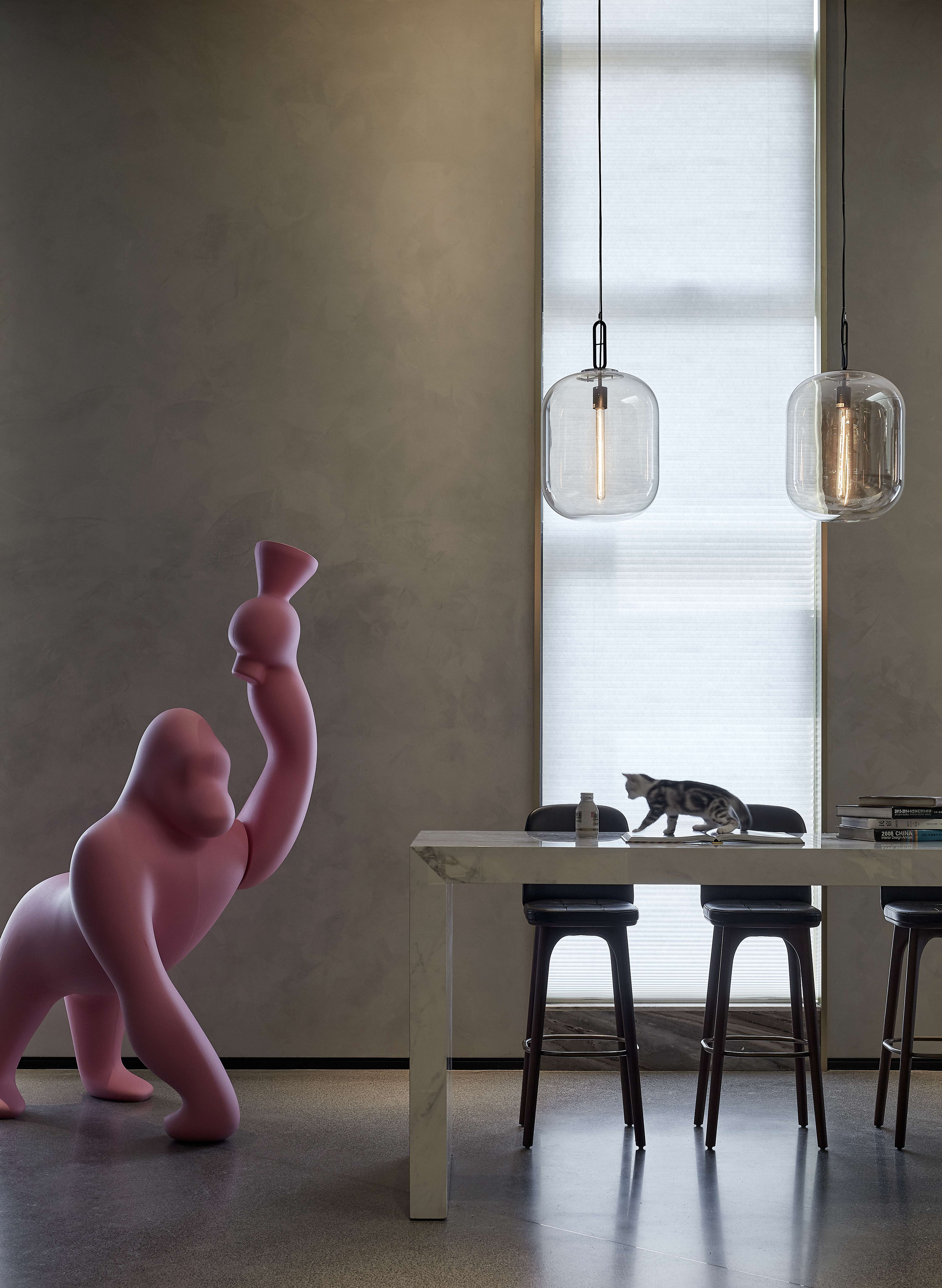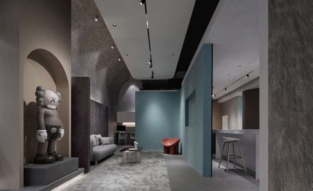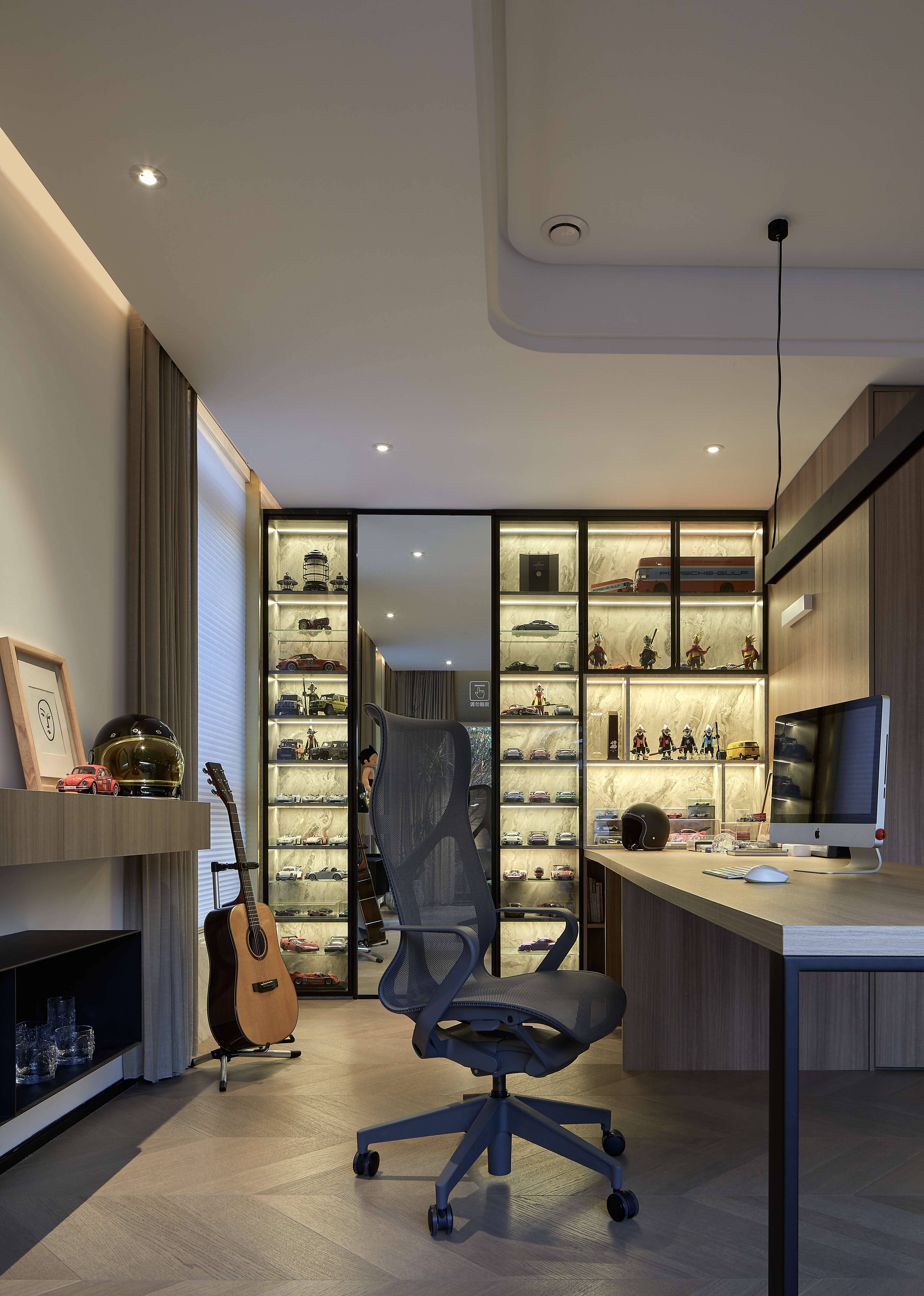 从三层楼梯间的天窗投射下的天光满足了白日里的照明需求,侧边的低位照明则用于夜间的光补充。白色楼梯间窄高而通透,营造出高级简单的氛围;大理石纹的阶面柔和融入进纯白色空间,给此处艺术性的空间增加了趣味。三层空间延续了整体空间的中性简约感:整面的落地窗的设置极大的延伸了空间感,直线简洁,弧线富于柔和变化;木质温暖,石纹材料带来精致冷感——而所有元素的克制运用得以被浅灰的色调和谐。灯光进一步营造出温暖、精致的通透氛围,最终成为访客与设计师无障碍沟通的交流场所。在这里,深色和浅色互衬,纯净的视觉感受是永恒的主旋律。