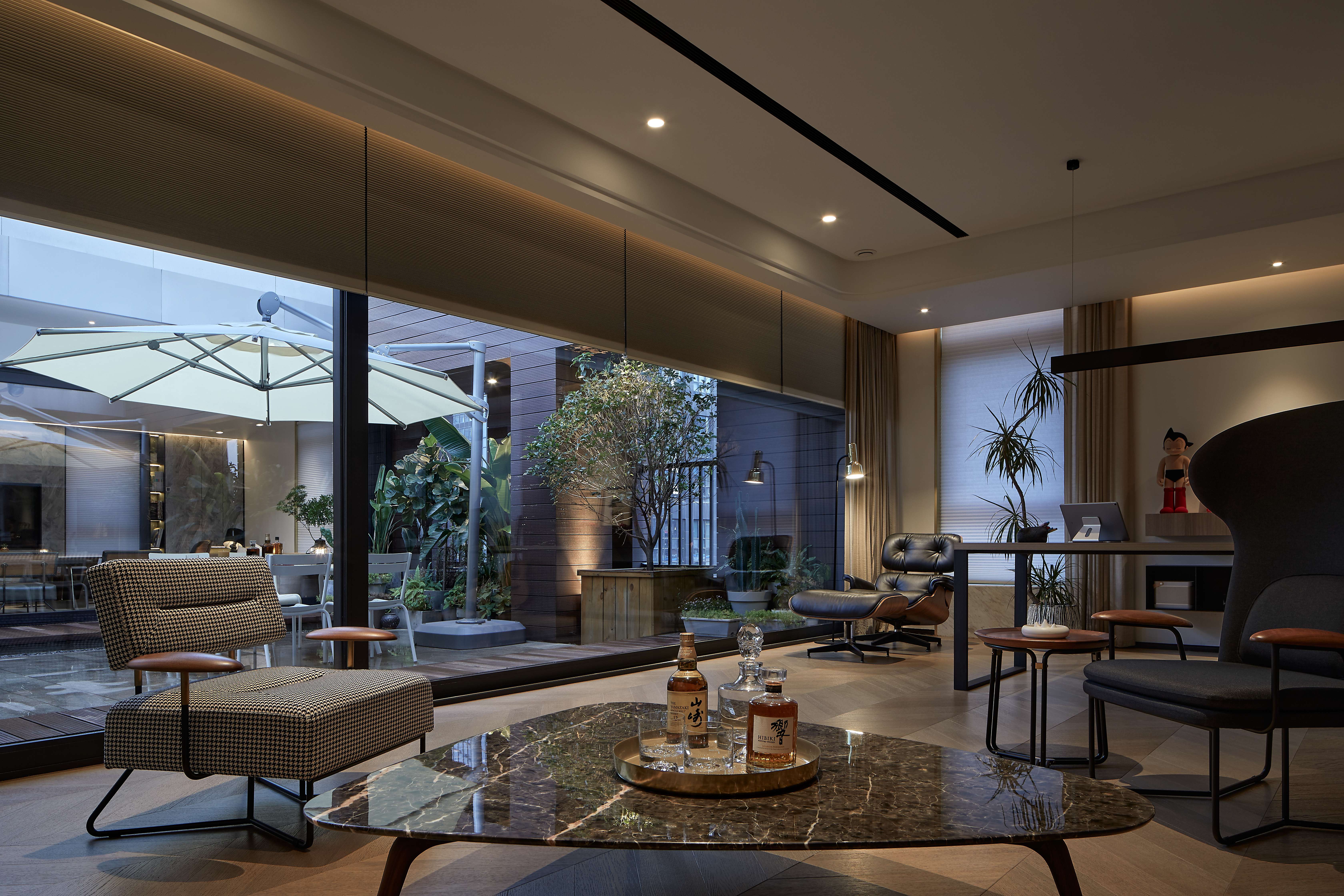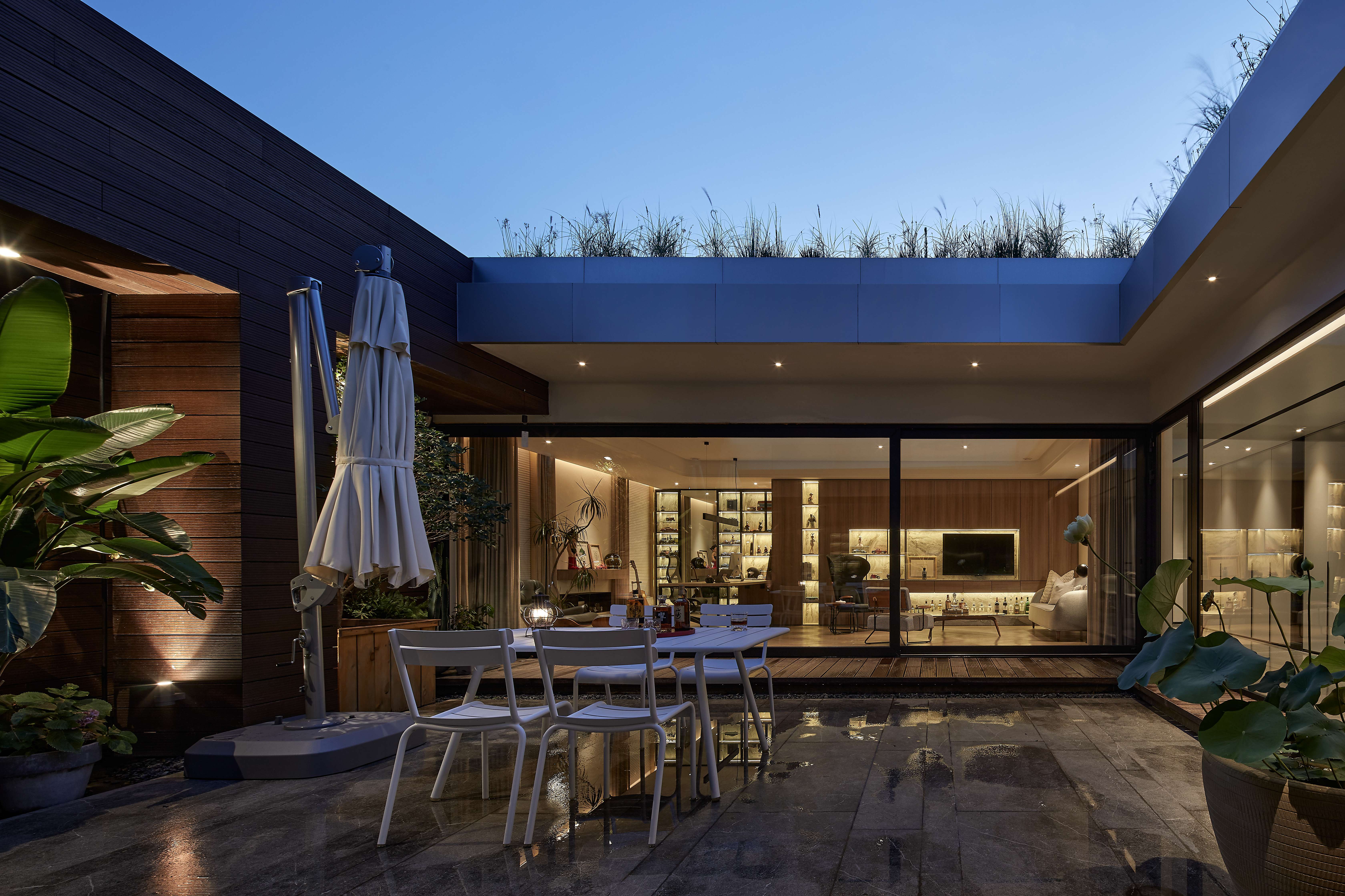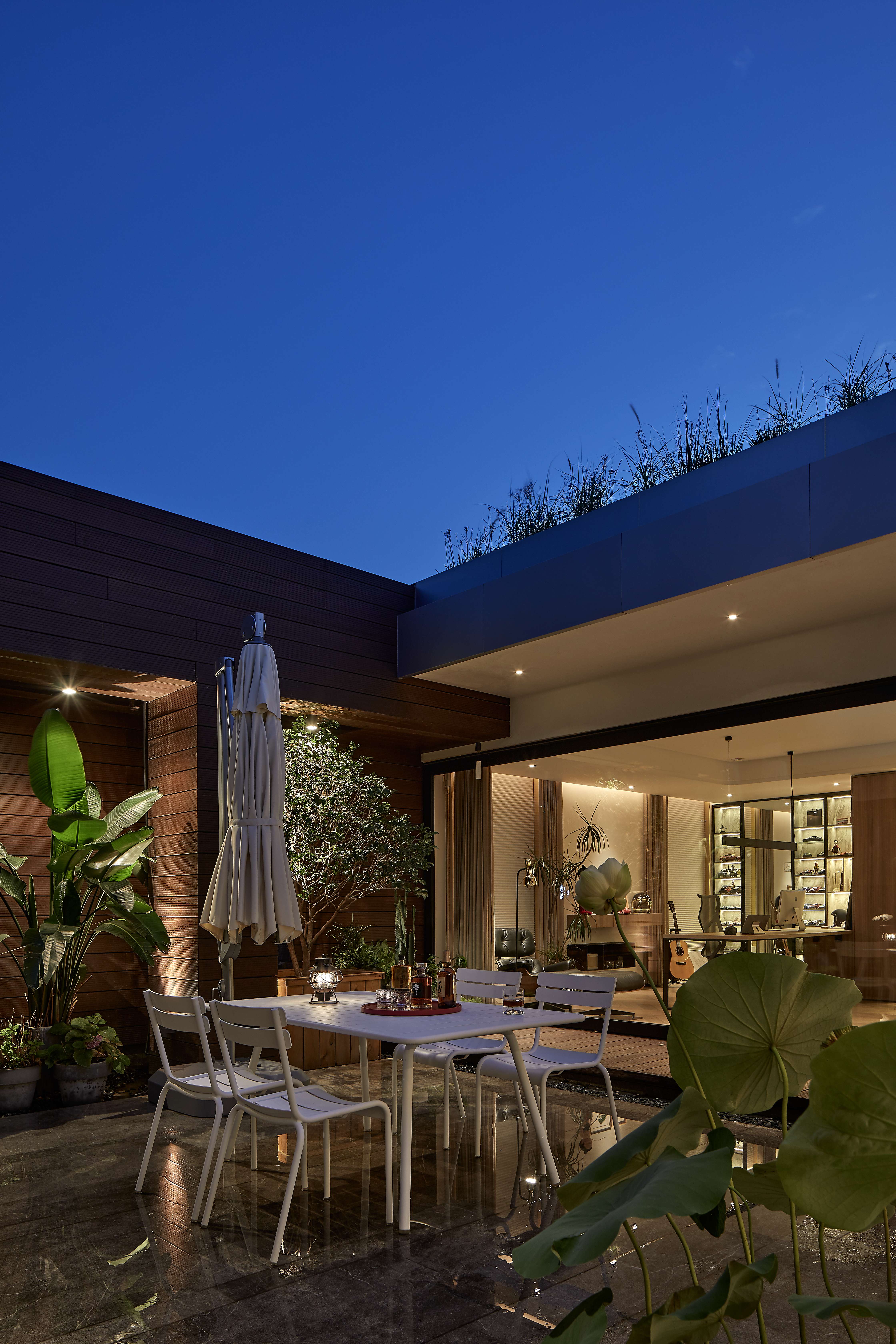夜阑更深,星点光晕给了空间刚好的安静气氛。从室内看窗外院,在城市中也能感受到山静日长的美好。暖光孱弱,绿植盎然,生机与宁静并存。刚下过暴雨的地面留存着镜子般的反射,脚下就也成了浪漫。
