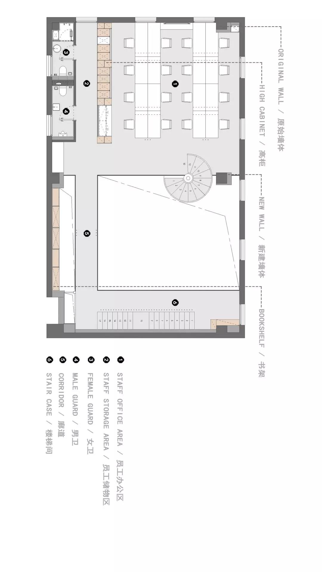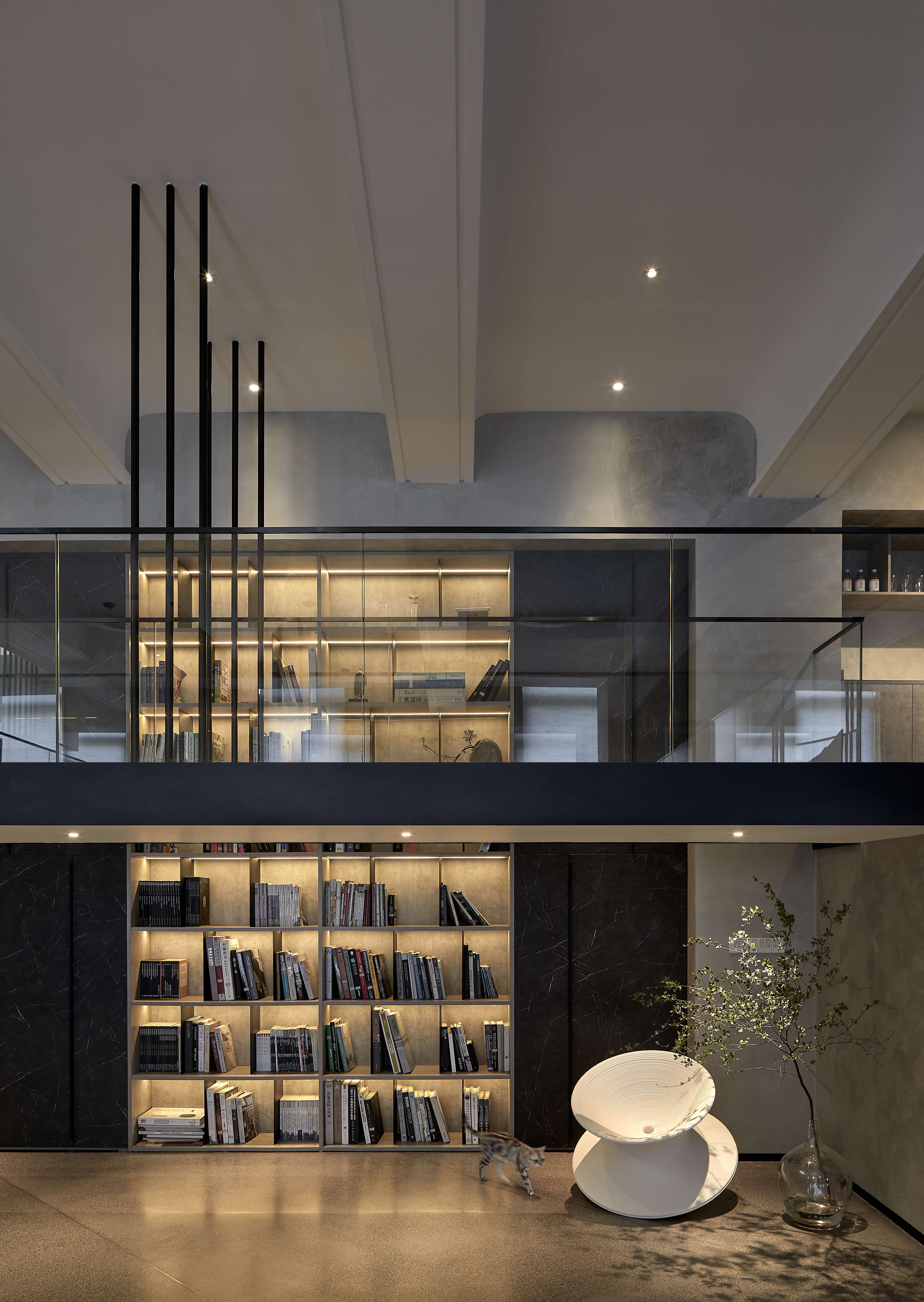 经过员工办公区后,再通过一条半包围的长走廊就可到达通向三楼的楼梯入口。走廊右侧近乎通顶的书架(展示柜)在灯带的配合下给了访客无与伦比的观感体验,而出现在行走途中的黑色竖杆赋予了走廊线条的序列感,使此处富于变化的同时也给人留下一种空间在继续向上生长的无限想象——长走廊的设置给了访客足够长的回味时间,它的存在也达成了我们希望空间能诉说自我的最初期望。