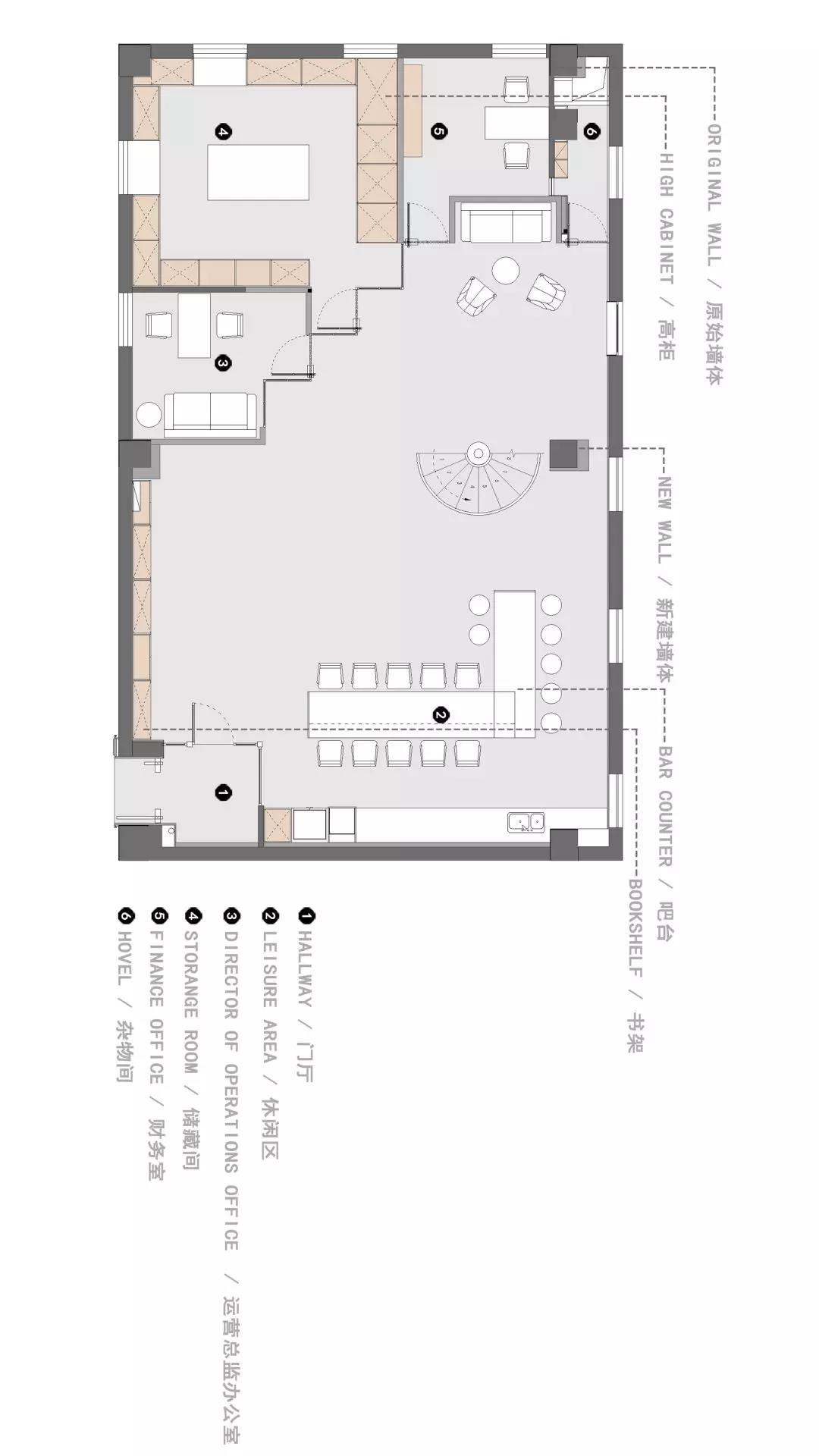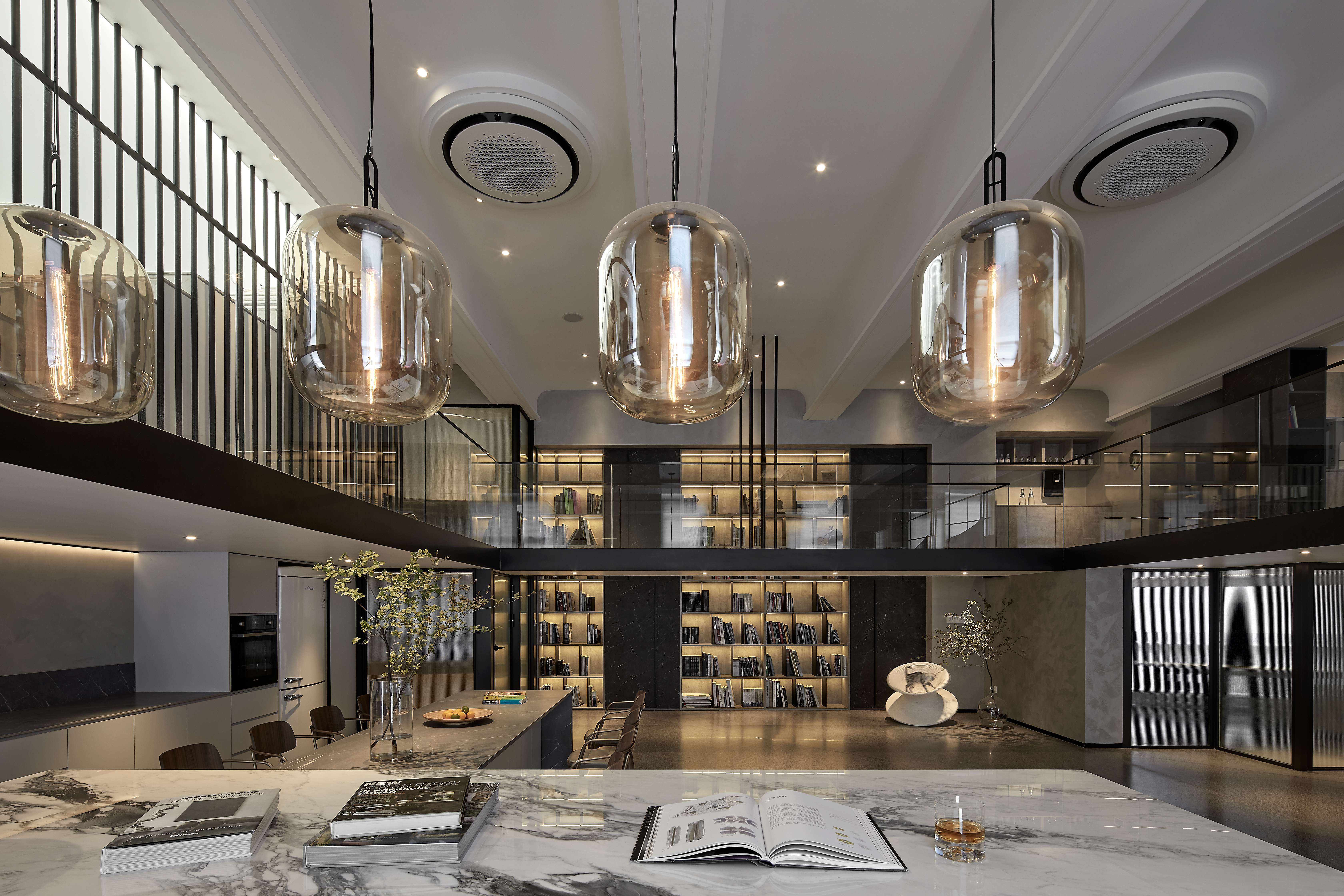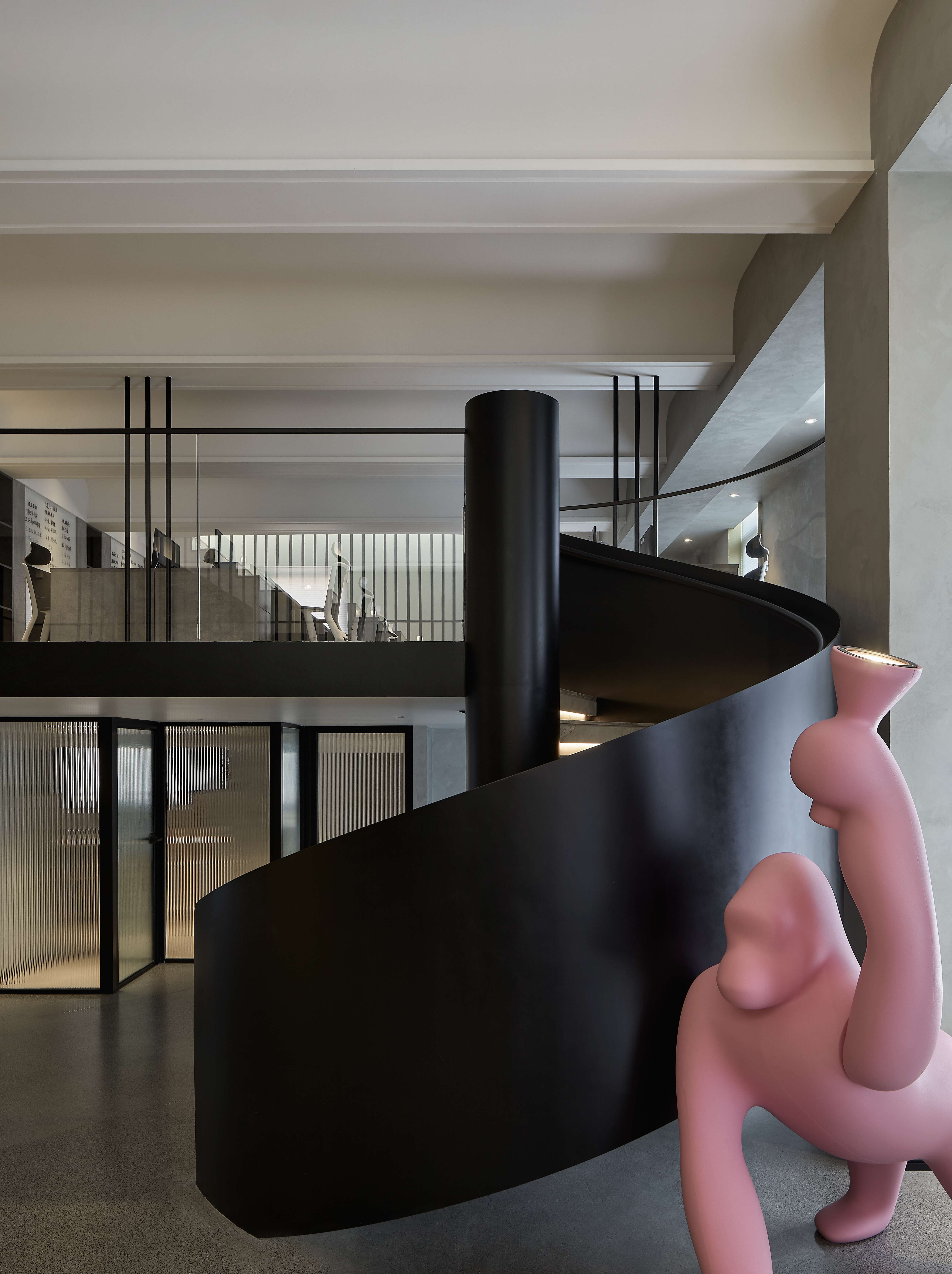 办公空间里的休闲区域是令人自在,却又给人些界限、仪式感的。而利落的挑空给了休闲区足够的仪式感:与顶面齐高的三列超长窗户将一天里最好的阳光全部掬入其间——正午时骄横的日光透过纸幕后温顺的匀在空间,头顶通透的玻璃吊灯散发出些许暖意,把马醉木照的影绰;与其相对的整面书架在暖色灯带的映衬下显露出温润大气;通往二楼的黑色旋转楼梯外面板含蓄的发着金属特有的冷光,大理石纹的台阶在灯带的托捧下拥有了悬浮的精致感,给人以绝佳的使用体验。