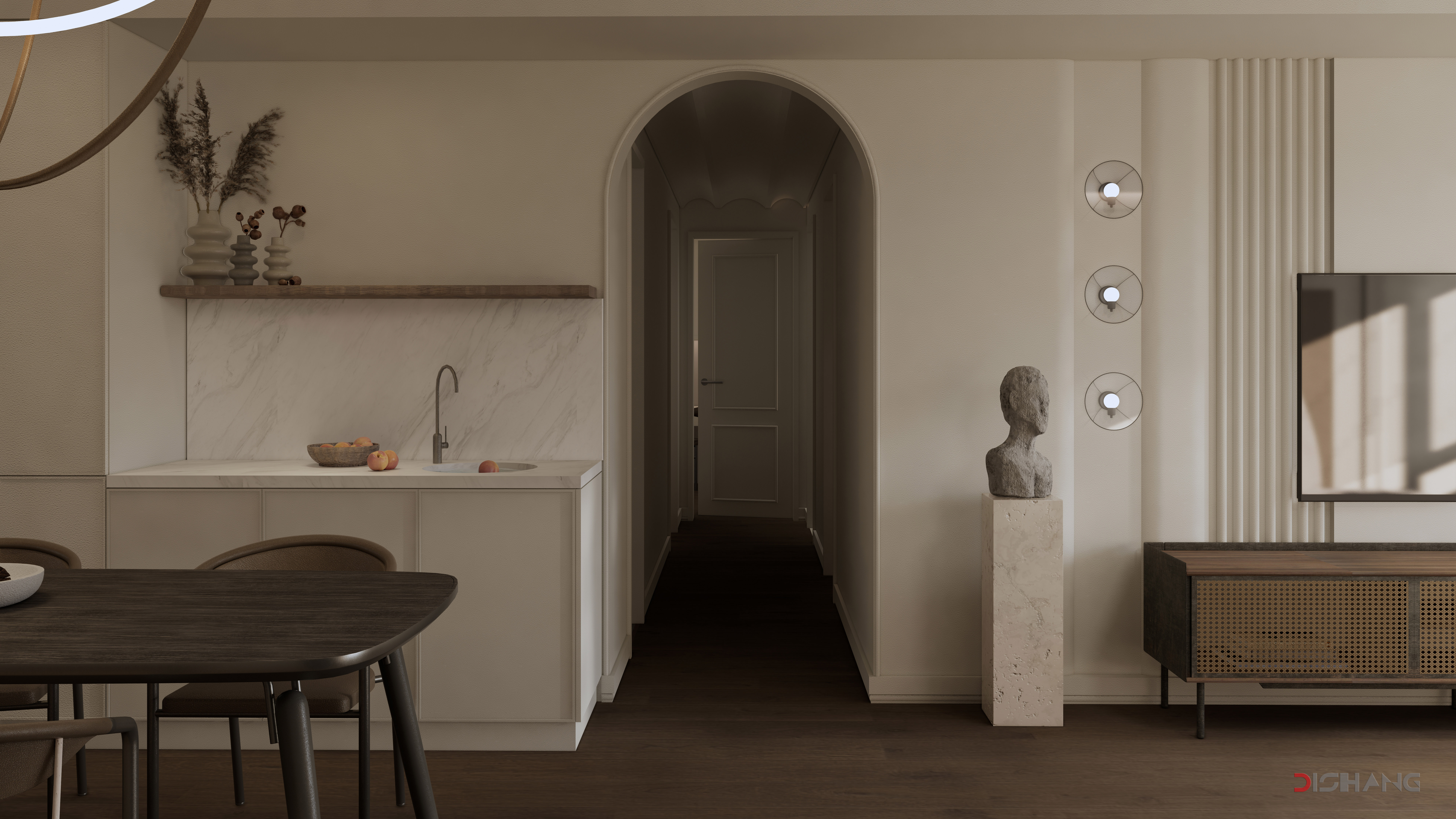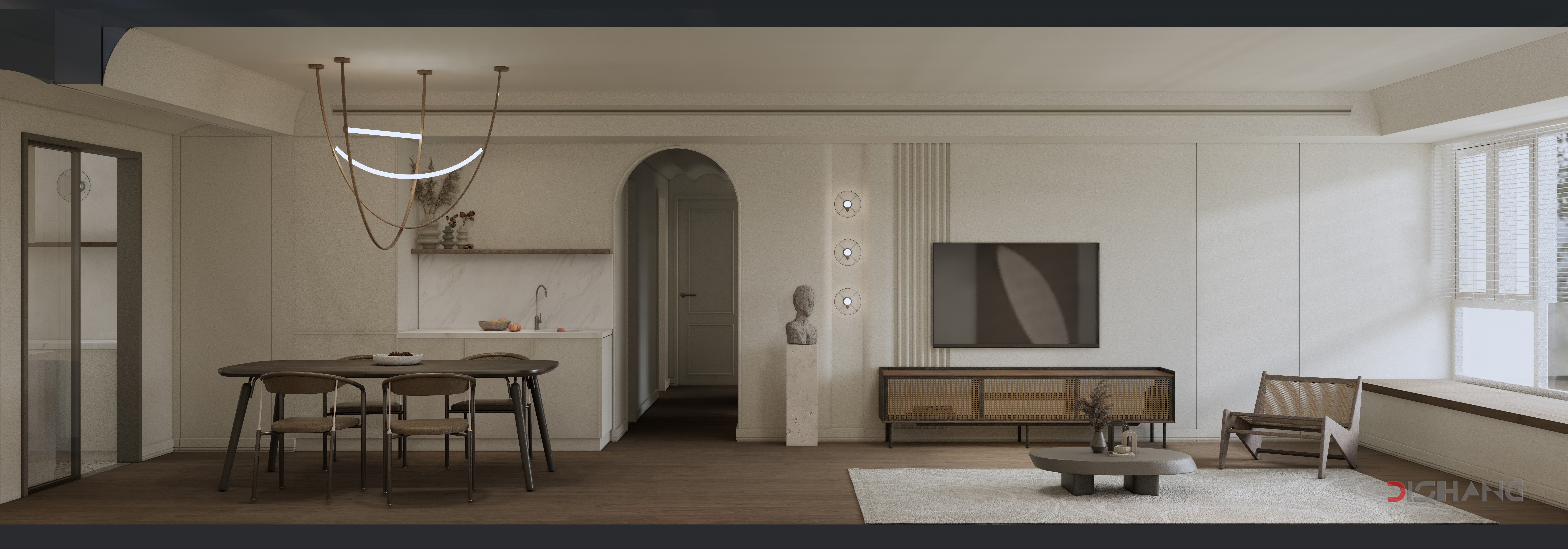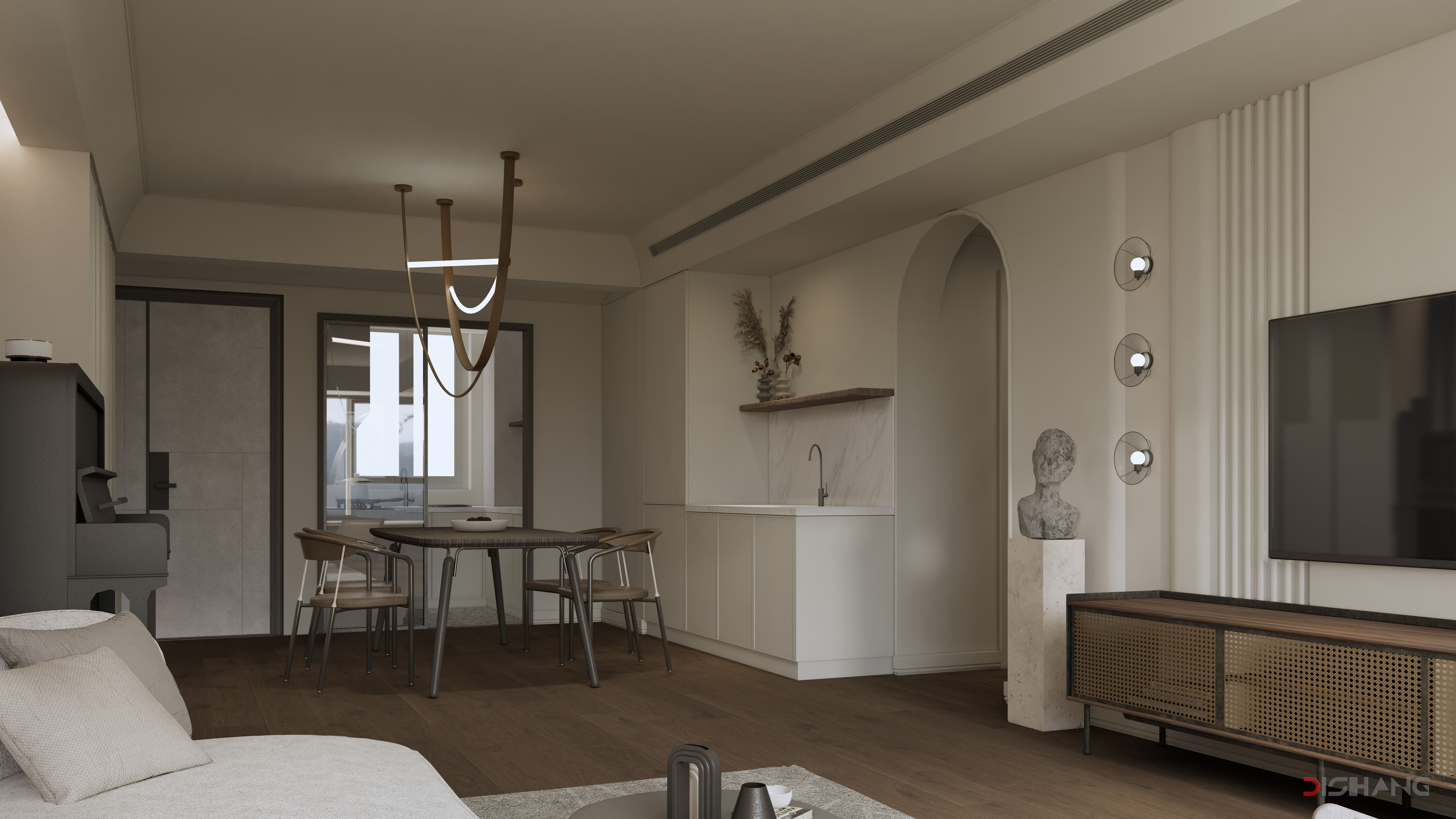 客餐厅配饰简洁质朴、素雅柔和,物与物之间的过渡自然流畅,细腻的感官体验营造了一种时光循环往复的平静感。