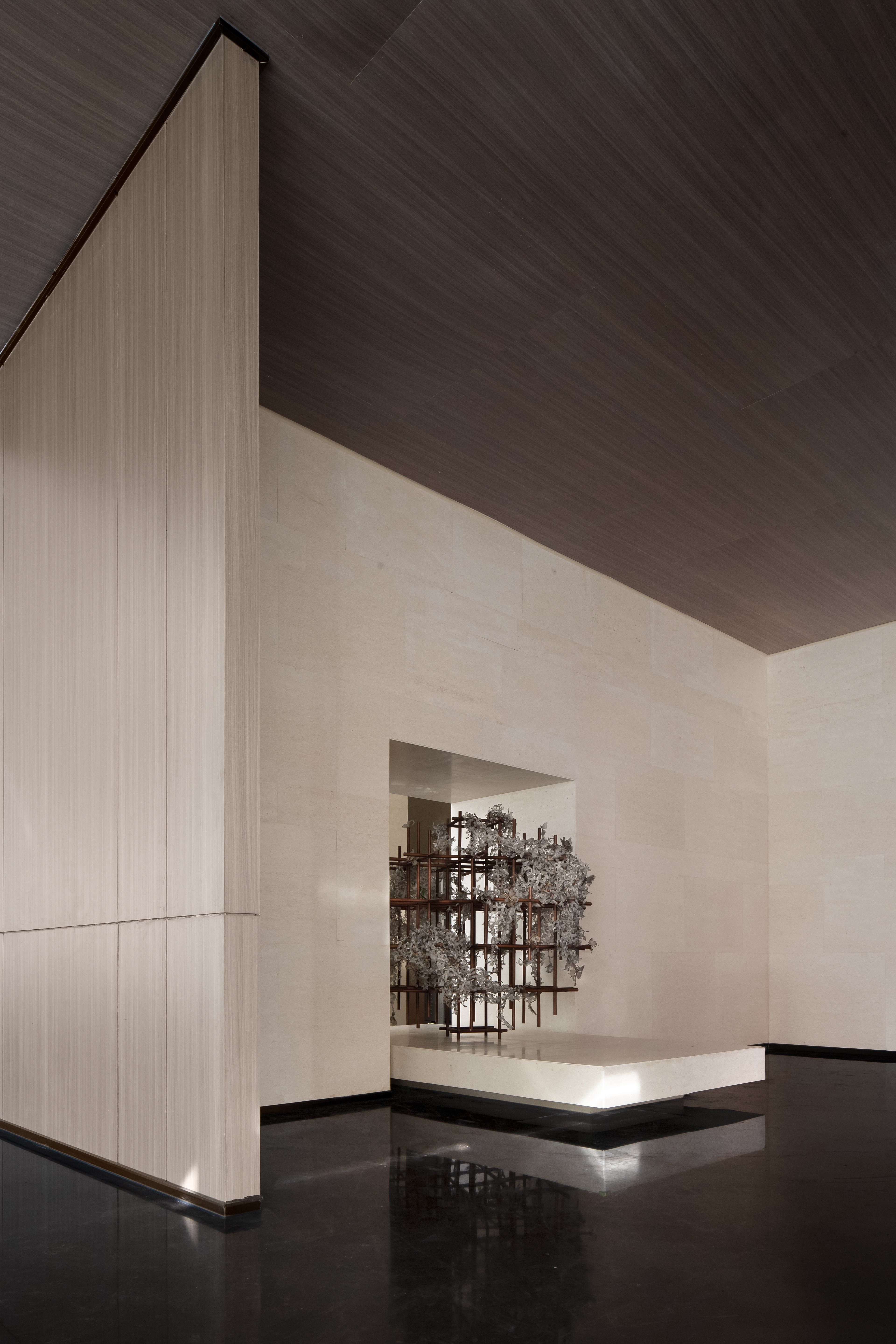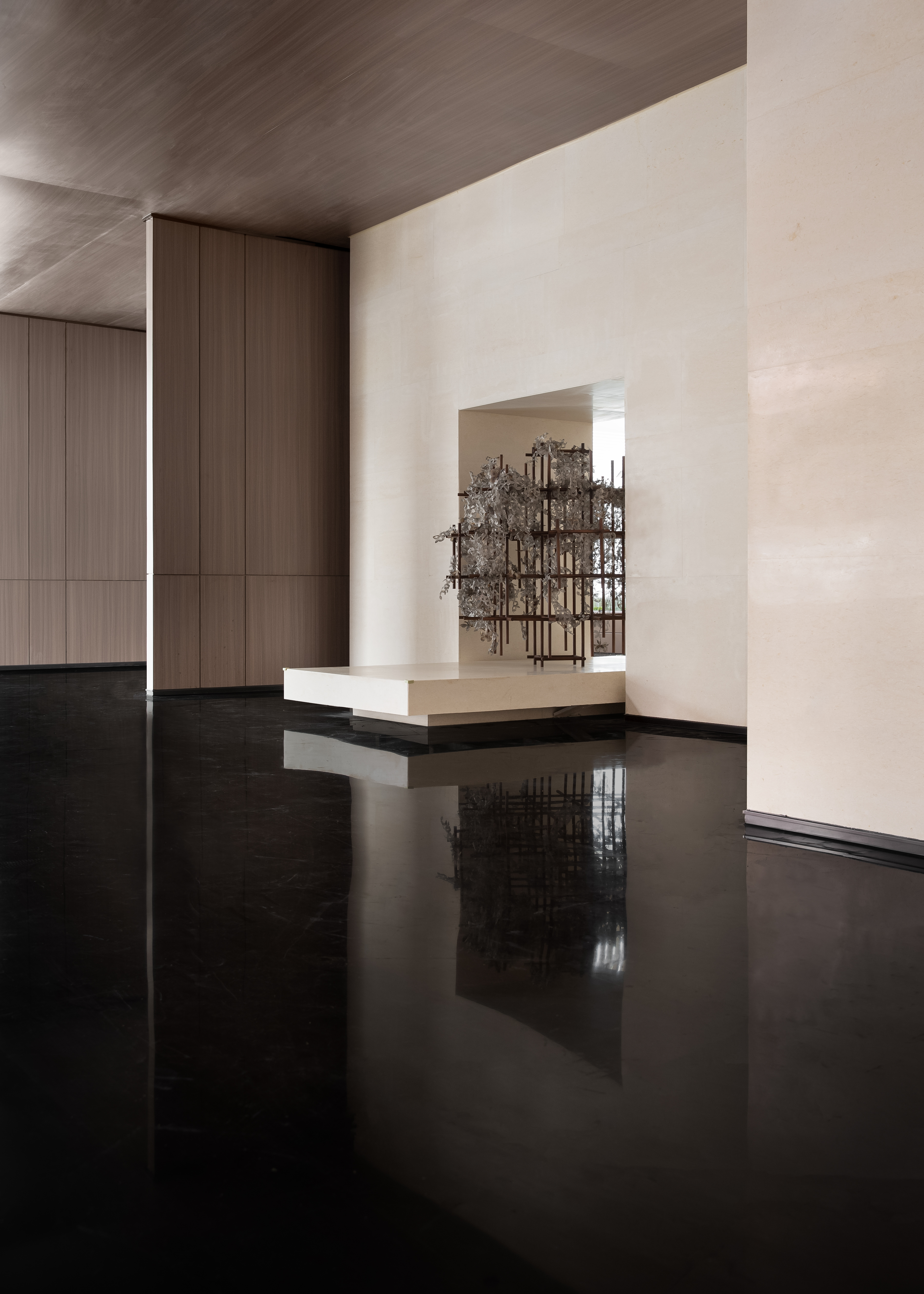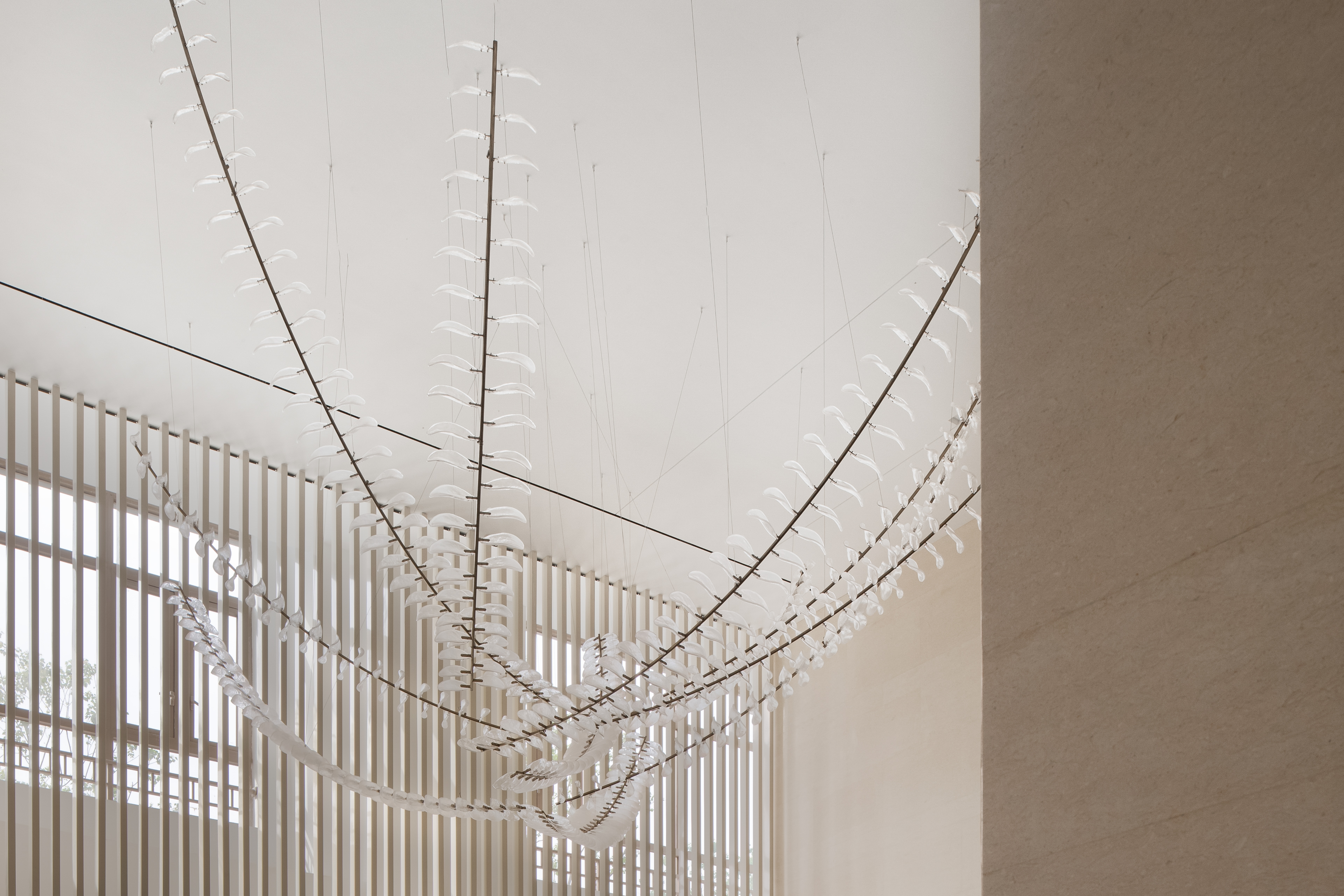 进入前厅,在挑空的空间中衍生出楚风遗韵,带有汉绣元素的艺术品以现代的材料和手法将其转化,如一颗璀璨的明珠镶嵌于中国斗拱结构的框架内,只需要安静仰望,便能感受到空间本身的精神——这个城市及在此生活的人的历史变迁与分合。