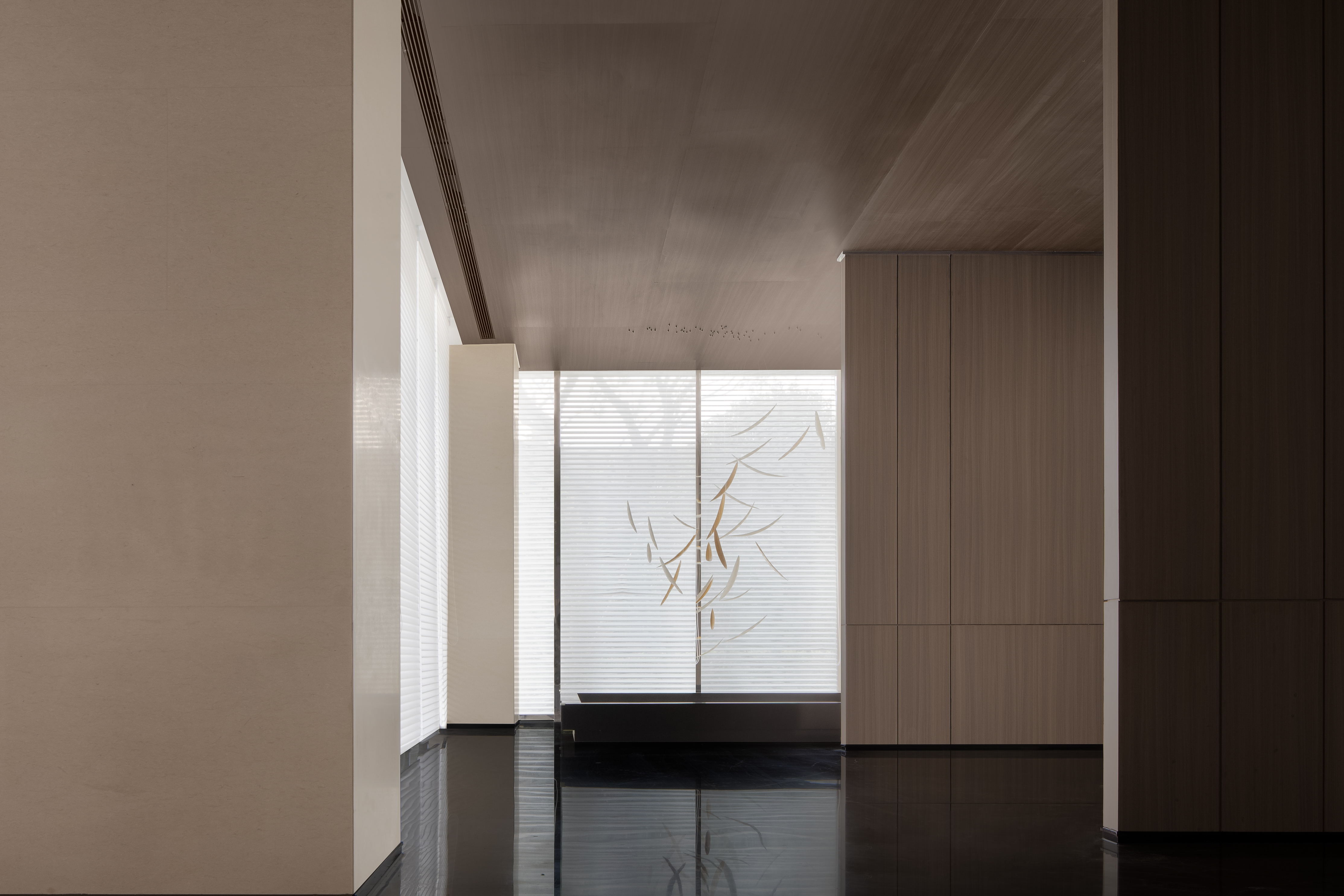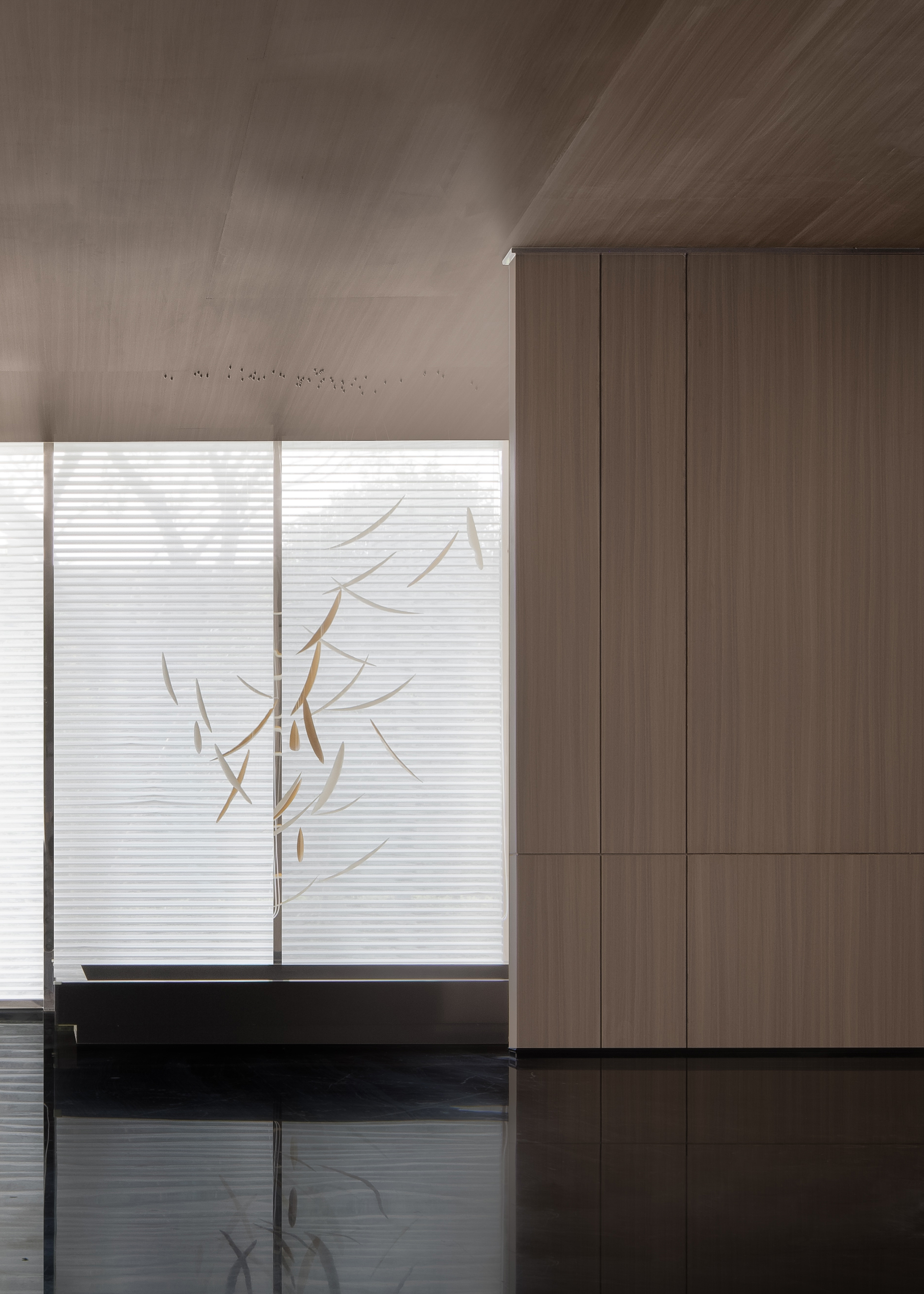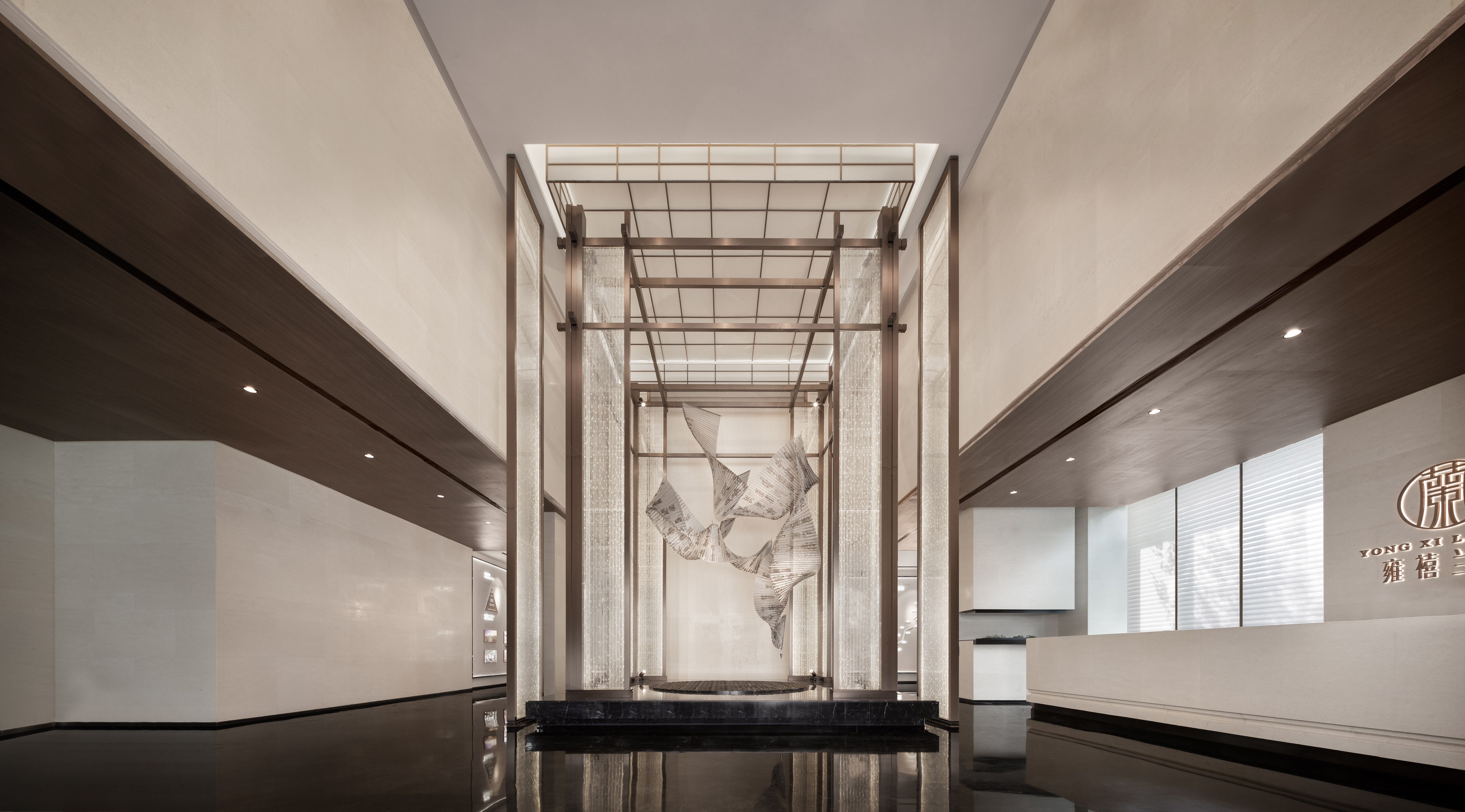 进入前厅,在挑空的空间中衍生出楚风遗韵,带有汉绣元素的艺术品以现代的材料和手法将其转化,如一颗璀璨的明珠镶嵌于中国斗拱结构的框架内,只需要安静仰望,便能感受到空间本身的精神——这个城市及在此生活的人的历史变迁与分合。
