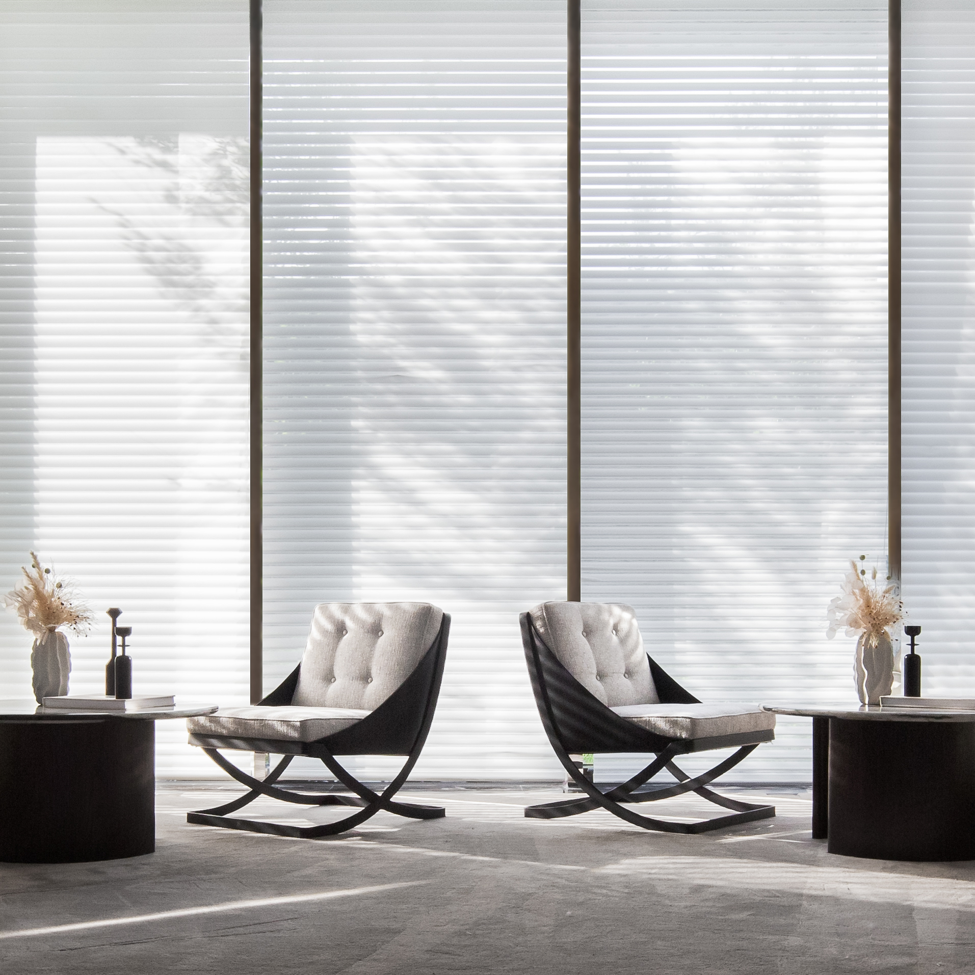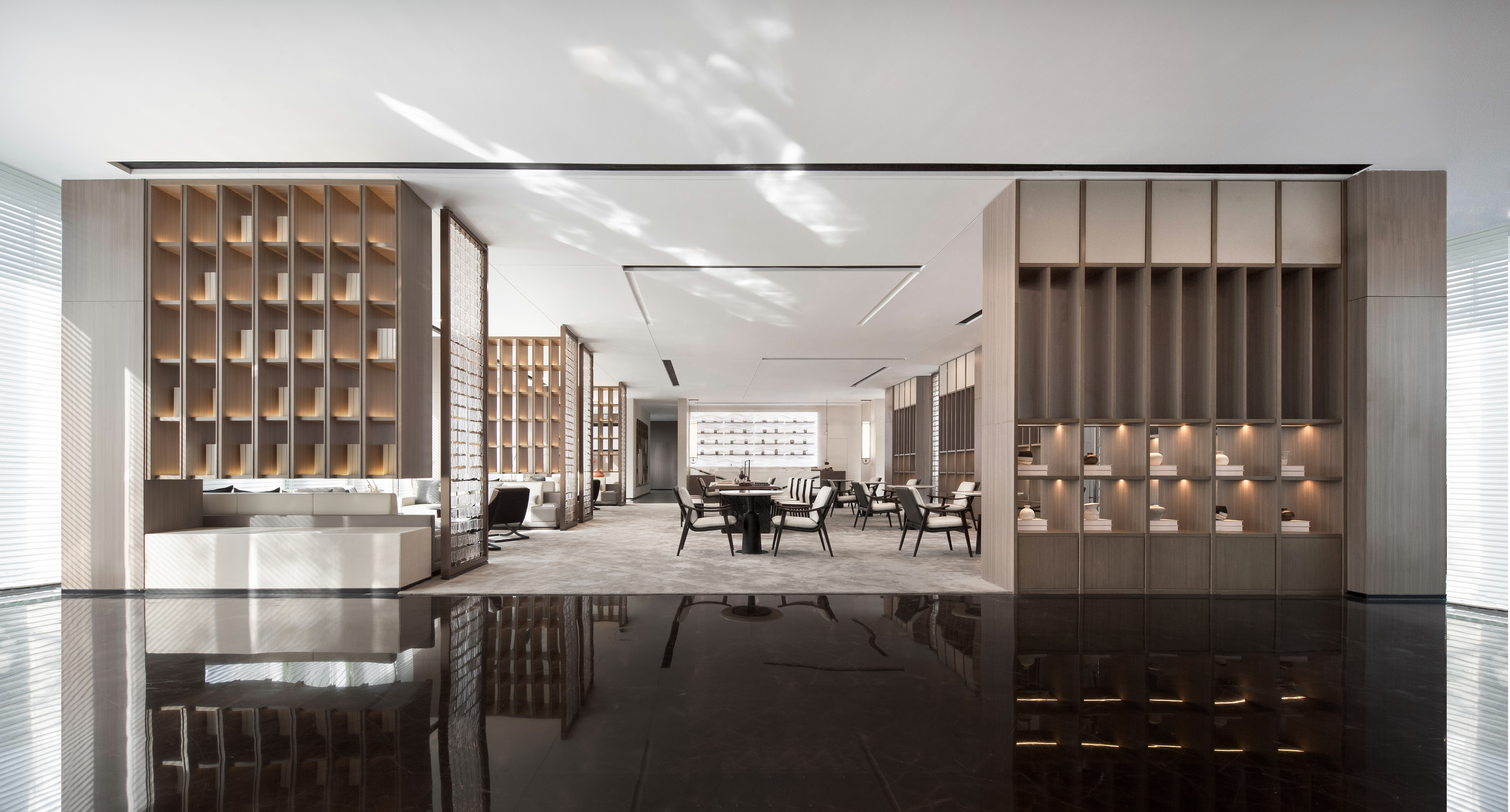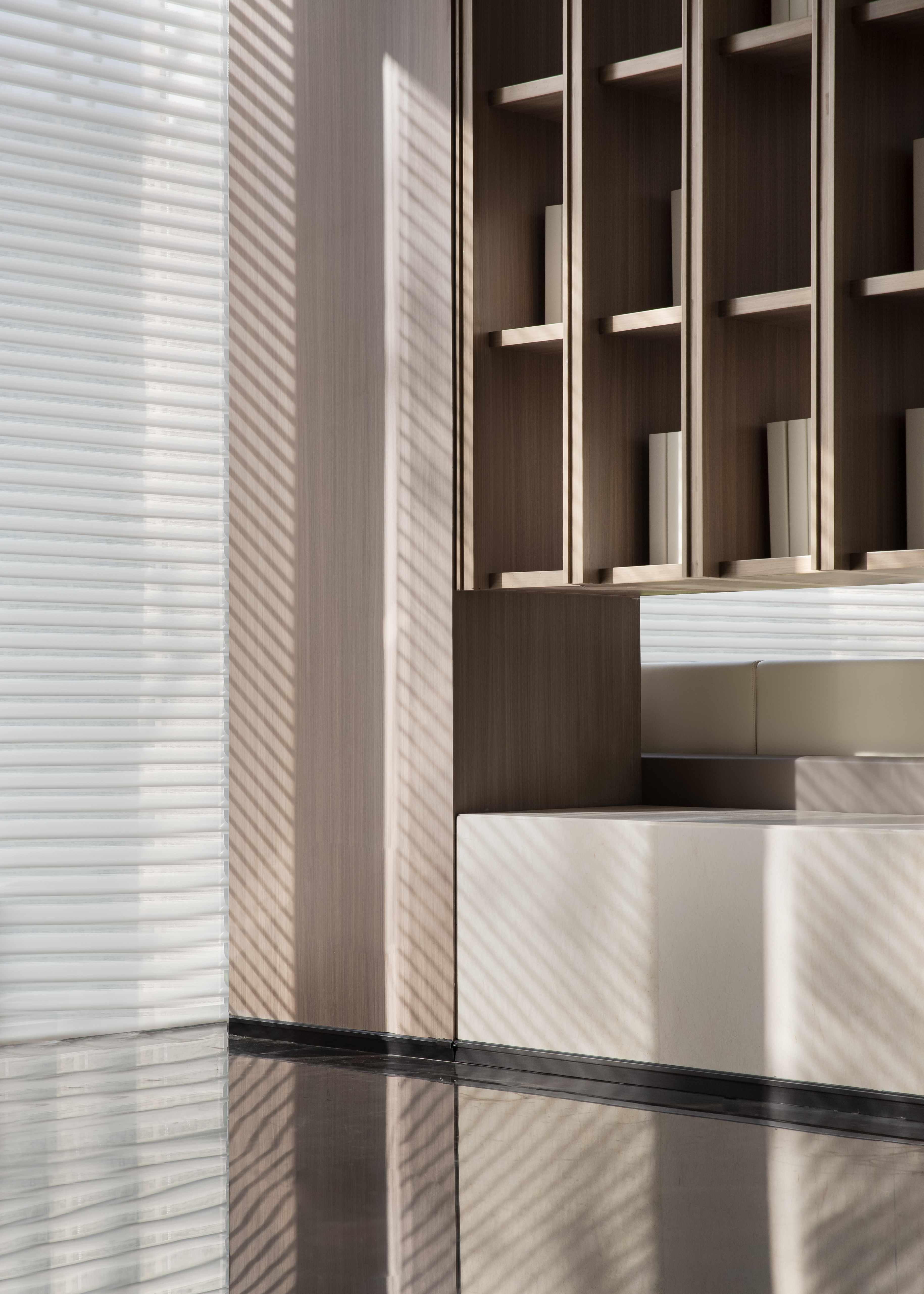 洽谈区在开放的空间中进行了疏落有秩的布局,线性成面的简易书架,将空间巧妙分割,如同置身于千年前的兰台书院之中,在若隐若现间,构建时光的趣味与诗意。