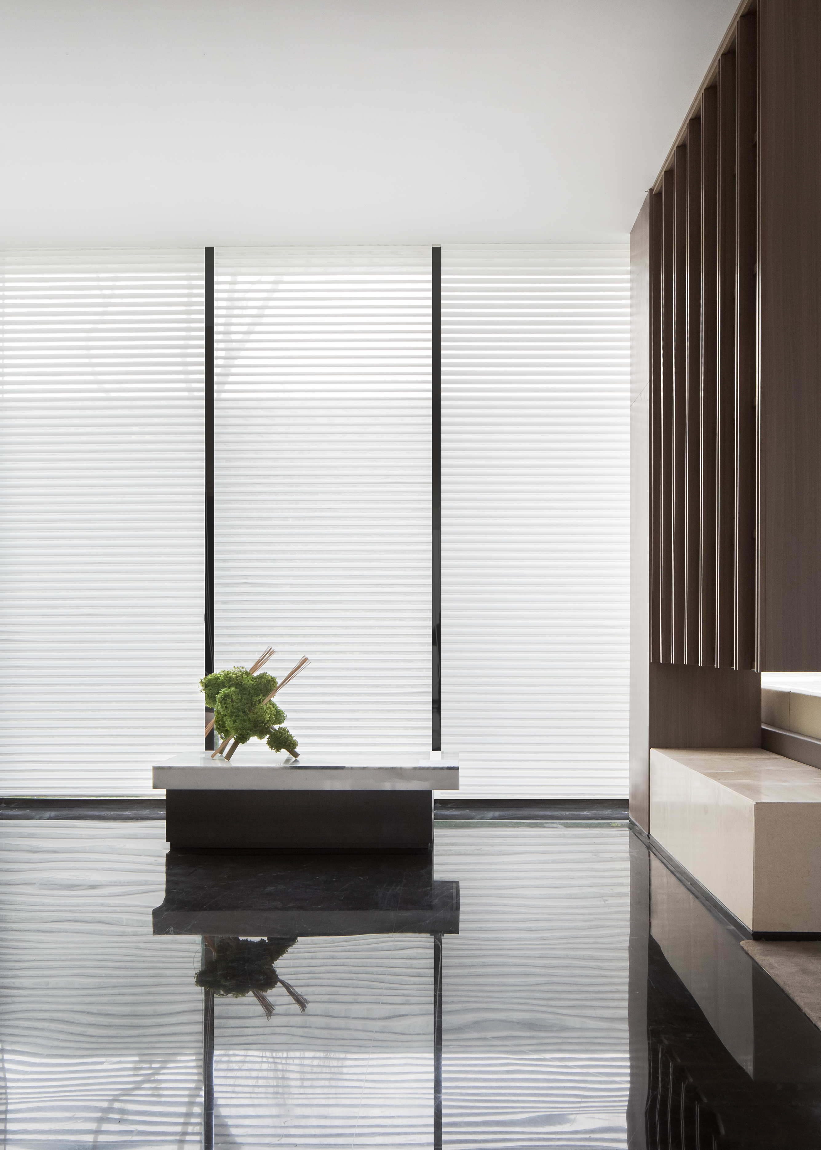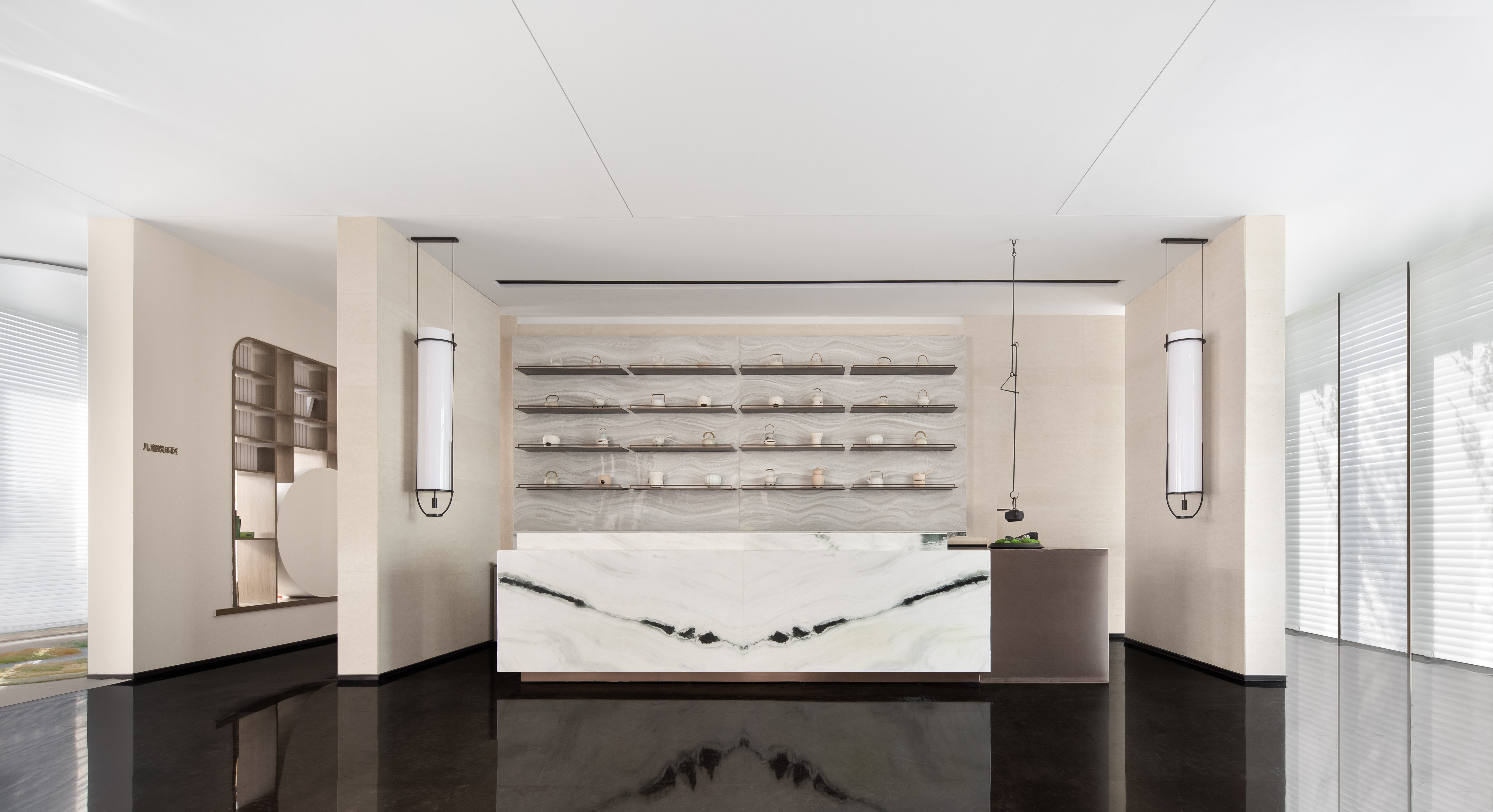 整个设计以“致敬传承,邂逅荆楚诗意生活”为主题,发现和探索武汉地区的独特属性,尝试从城市历史脉络出发,提炼茶文化、书院文化、古乐文化及汉绣文化等人文特殊符号,通过不断的深化演变,将建筑与室内、现代与东方拆解再重组,淬炼城市山水印象,融合荆楚人文美学,在登堂入室与移步异景的手法之下,打造当代生活与传统文化相结合的未来新居住方式。