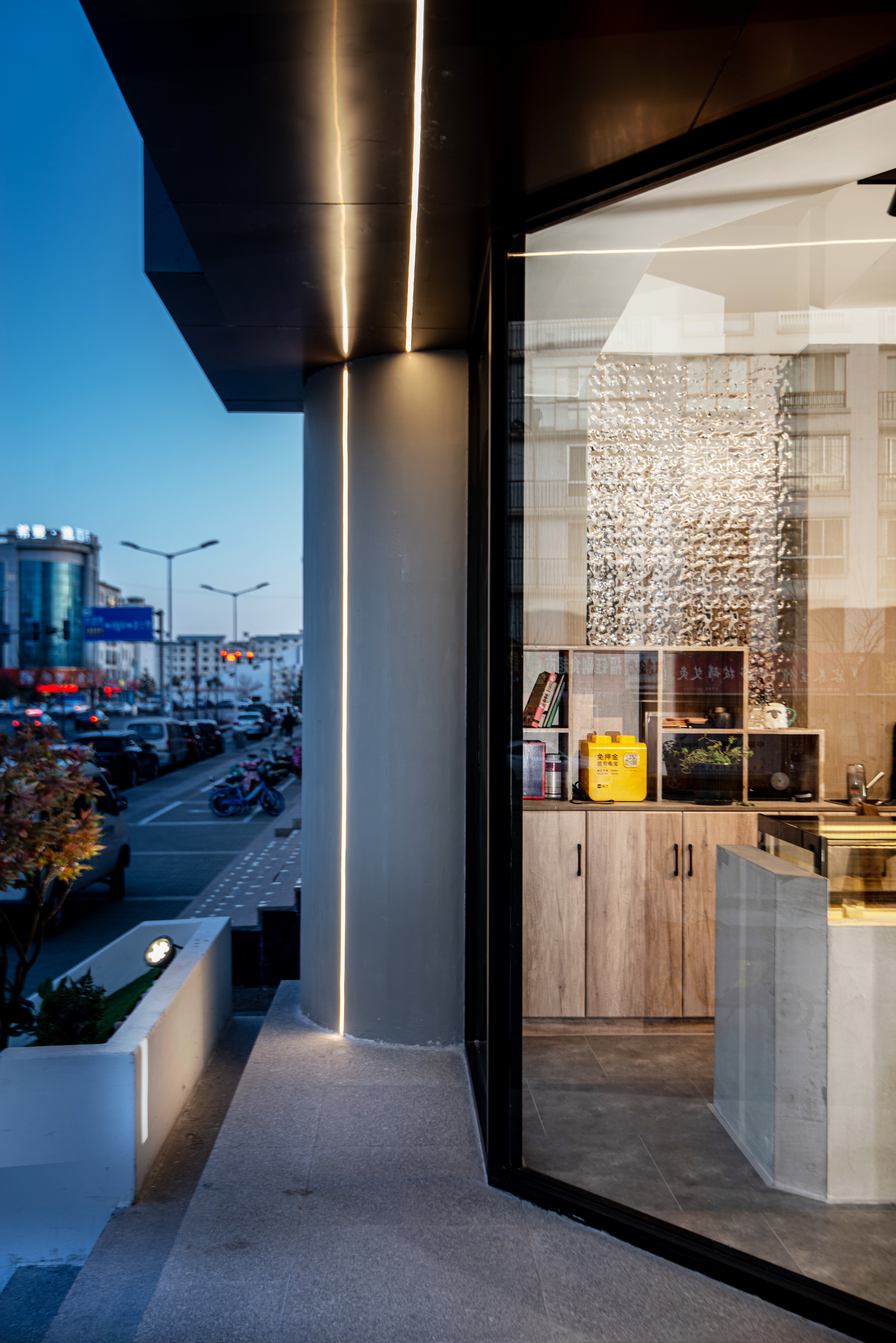 门头的做法整体后移,将入门的区域变成了梯形,给予了客人动线的引导也与周围的建筑形成了对比,门口没有保留墙体,设计师认为光是自然对于空间设计的馈赠。”打破”墙体,让光透进来,增加了光在空间中的保存。