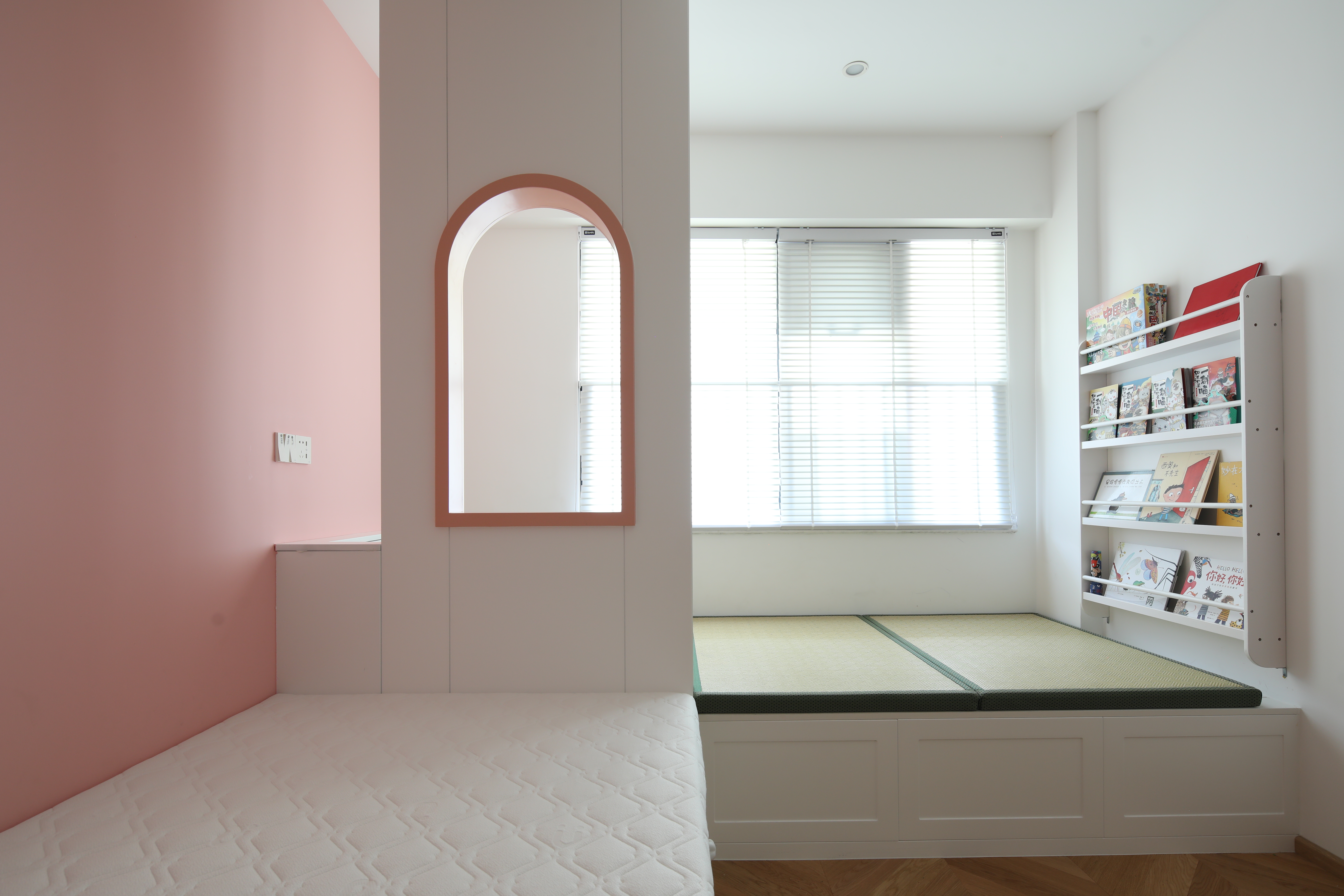 这是两个女宝的房间,原来想说做上下铺的设计,后来一起讨论担心上面的小朋友会比较压抑。于是我们就用了一个小窗做了个小隔断,同时又能置放东西。现在她们最爱的就是钻这个小窗户,有点惊喜。