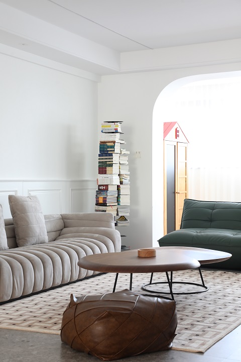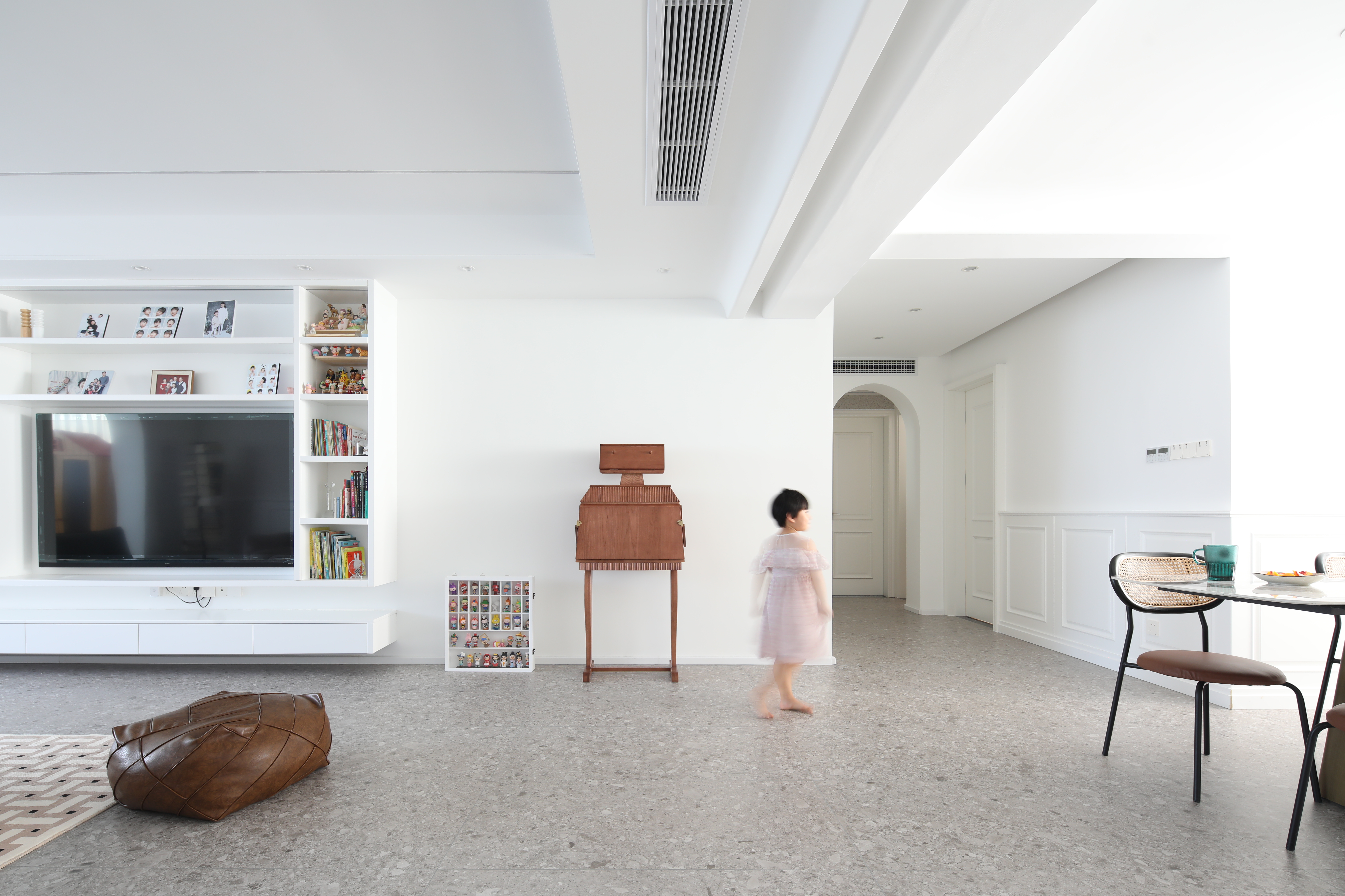 空间意境:我们在色彩上没有运用太夸张的色彩,而是大面积采用水泥色、白色及弧形元素来进行底色的处理,再用软装的设计来补充业主需要的童趣和色彩。由于梁位都比较低,所以我们在房屋的结构和细节上也做出了一些独特的改变,多彩和童趣的设计贯穿了整个空间。