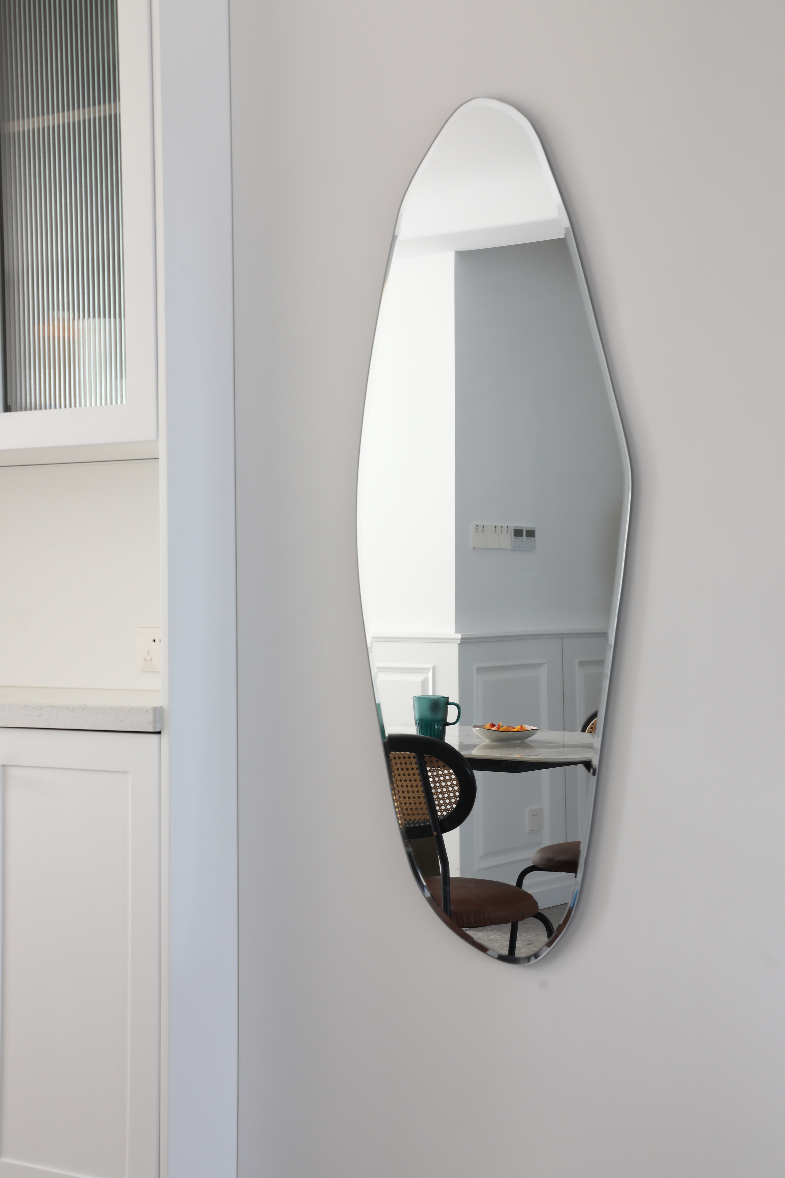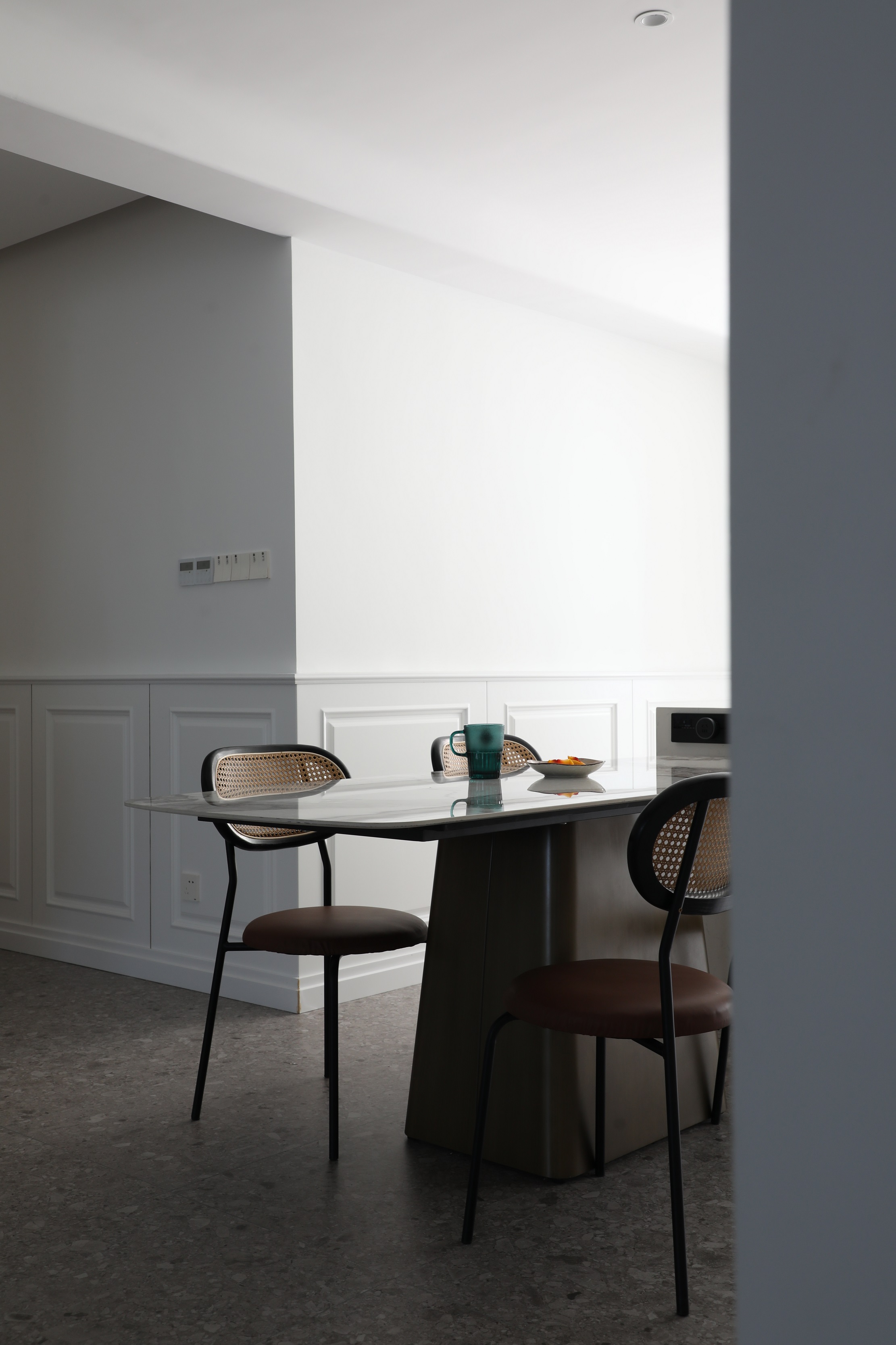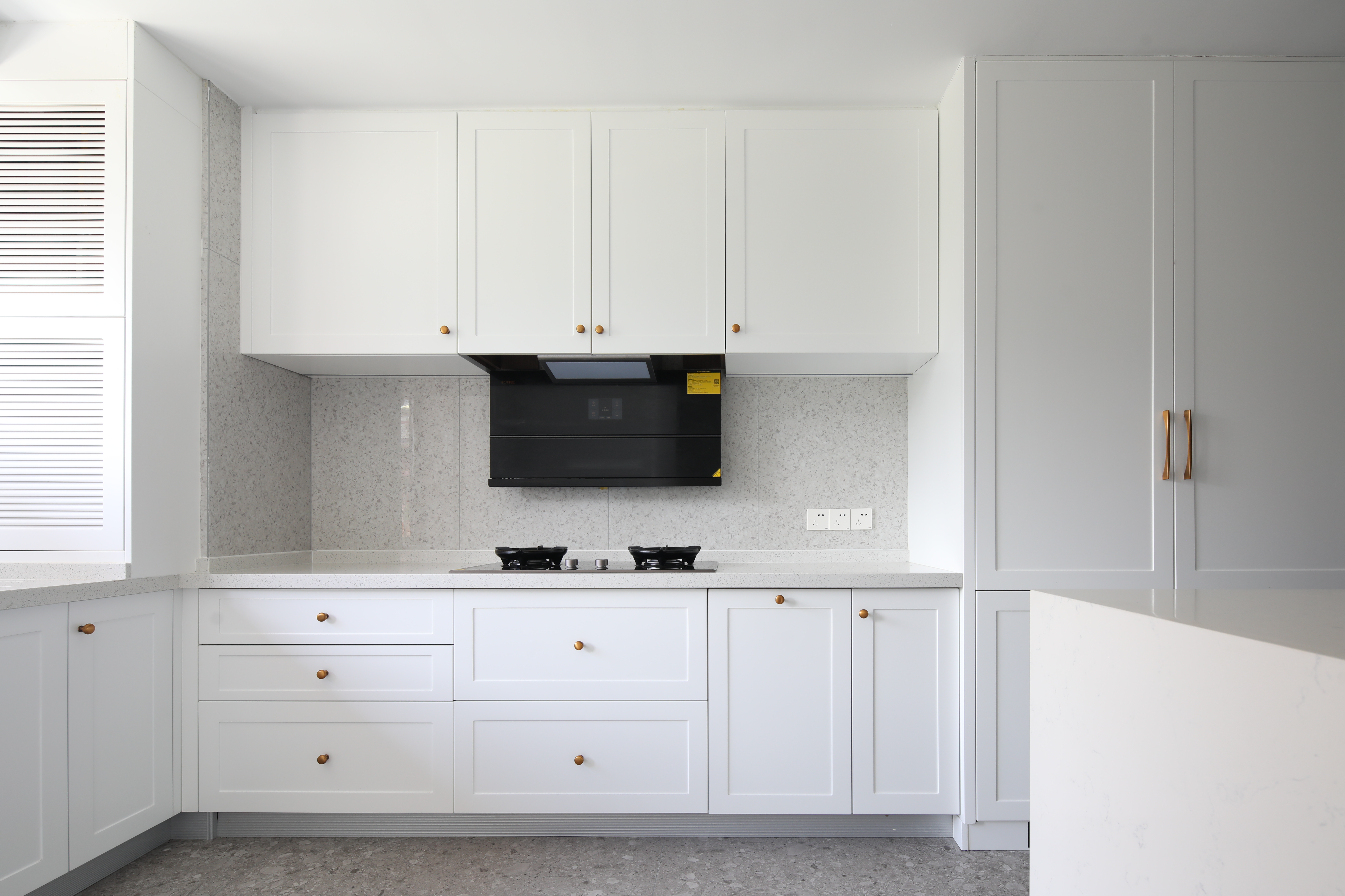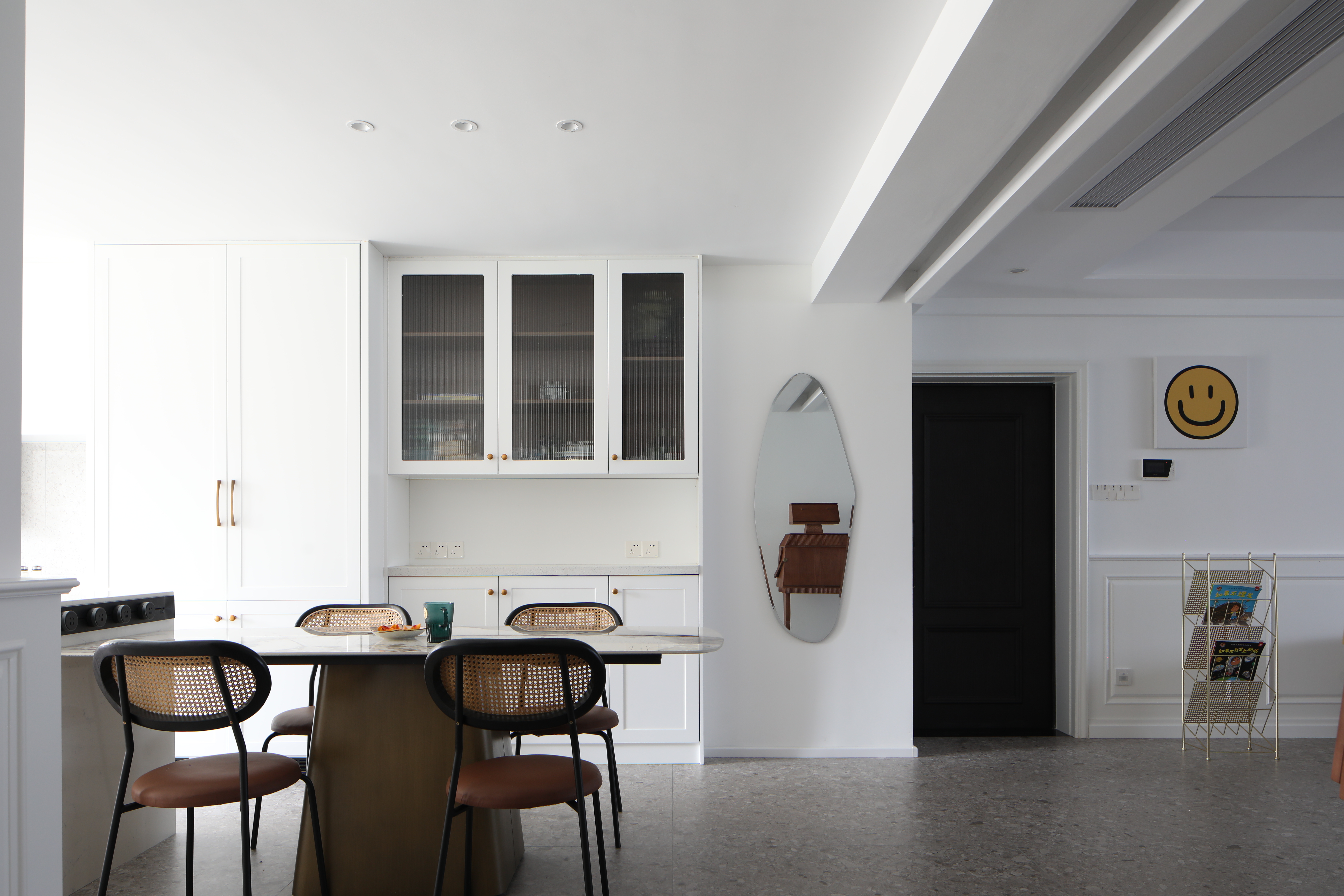 改造前的厨房显得非常杂乱,推拉门直接把餐厅的光线挡住了一半。我们柜体上用白色烤漆复古压纹搭配浅色系水磨石砖,嵌入式的双门冰箱让改造后的厨房显得更加的干净和整洁。