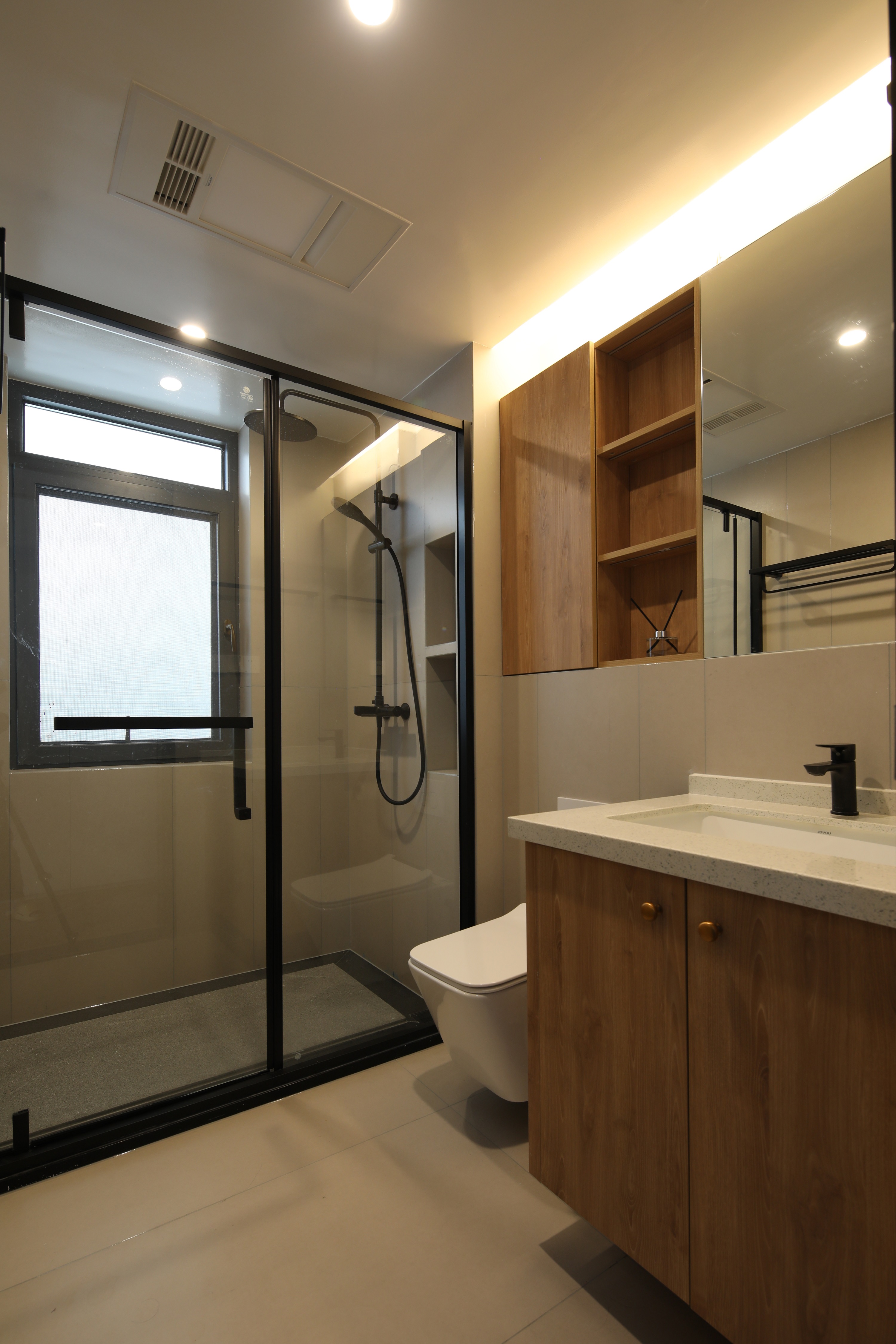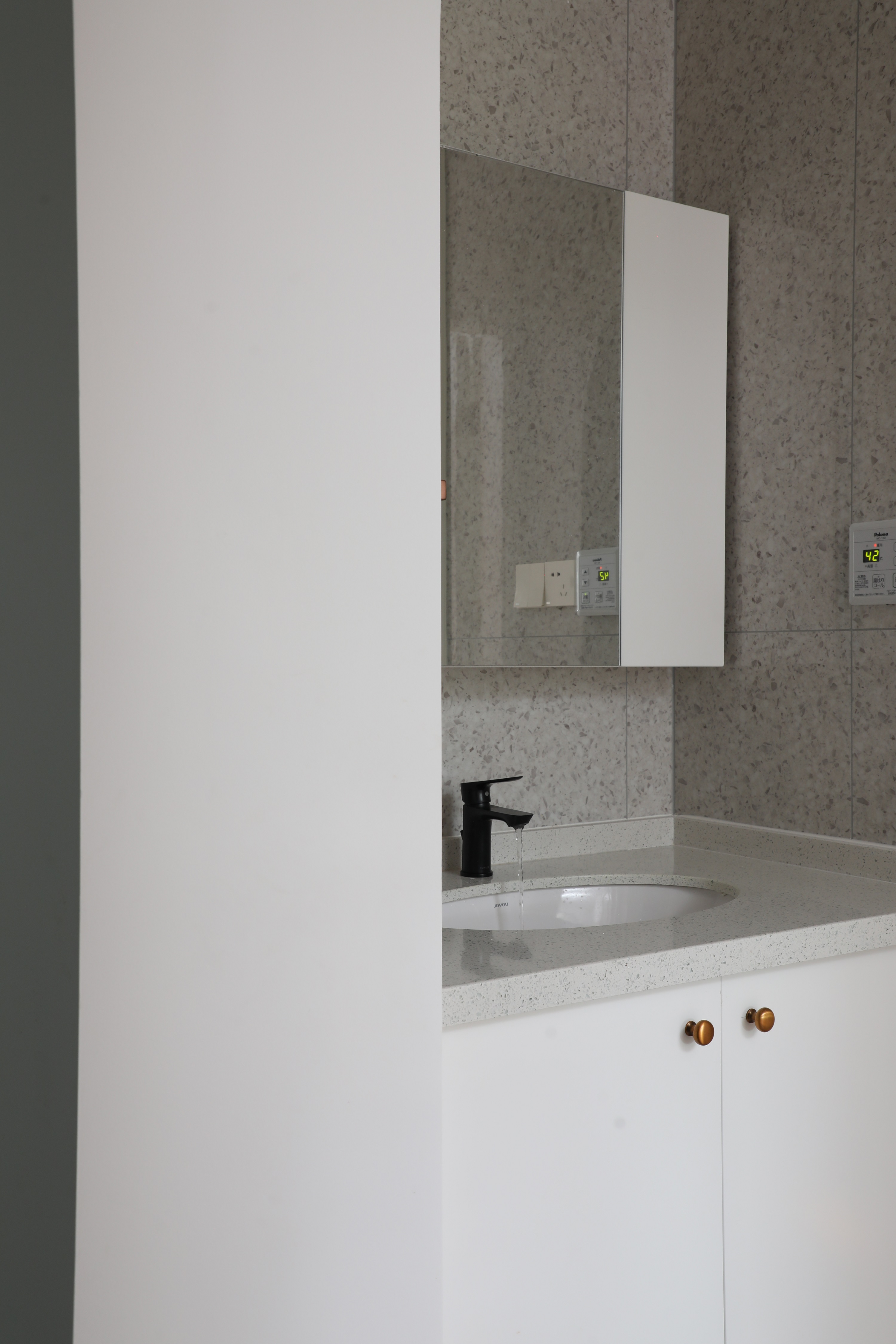设计选材:主材:水磨石瓷砖、线性灯、百色熊进口环保涂料、嵌入式洁具