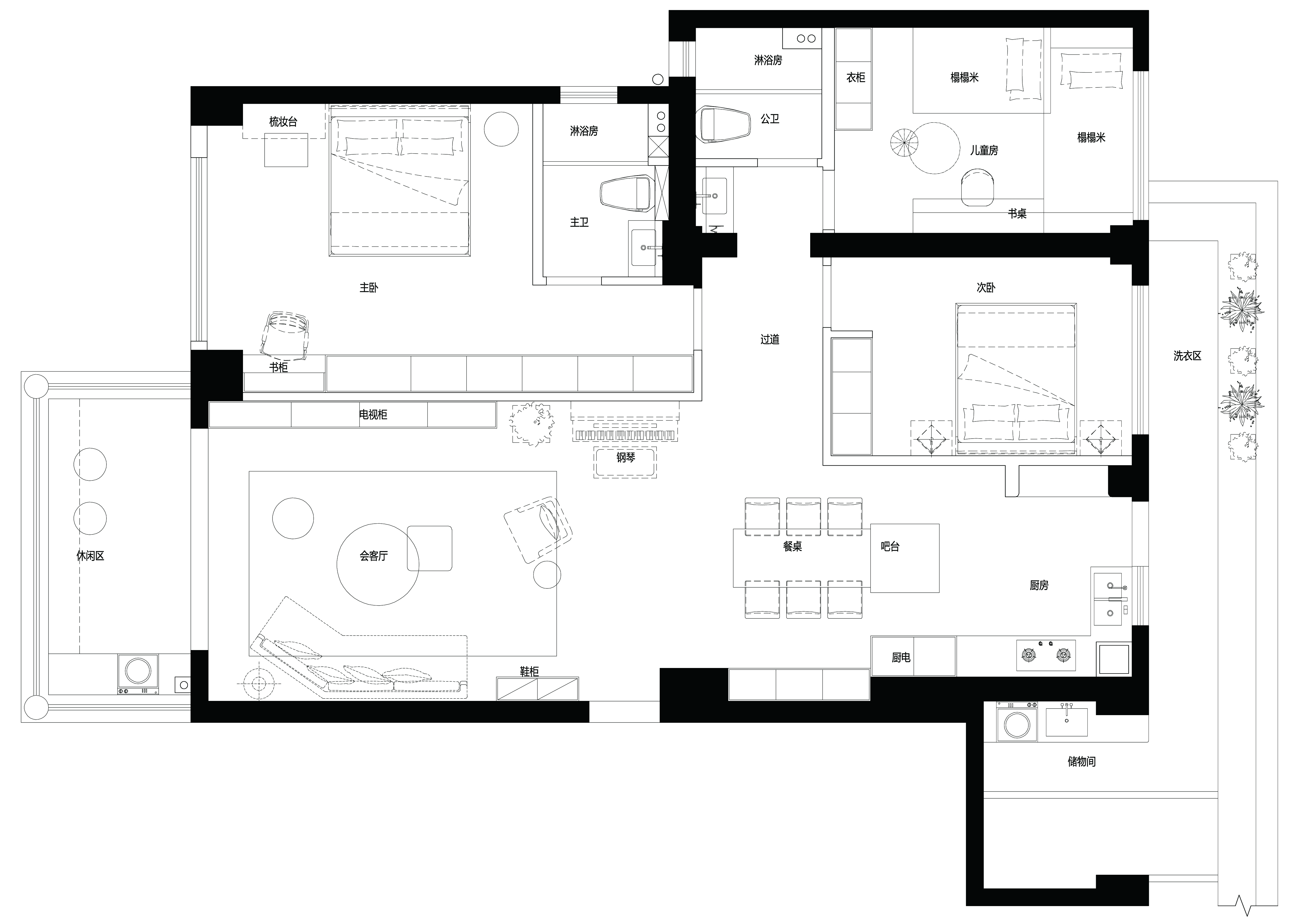 空间布局:利用现在热泵烘干机的特点,弱化了阳台披晒衣服的功能,把传统的阳台利用起来做了全家人的运动区。