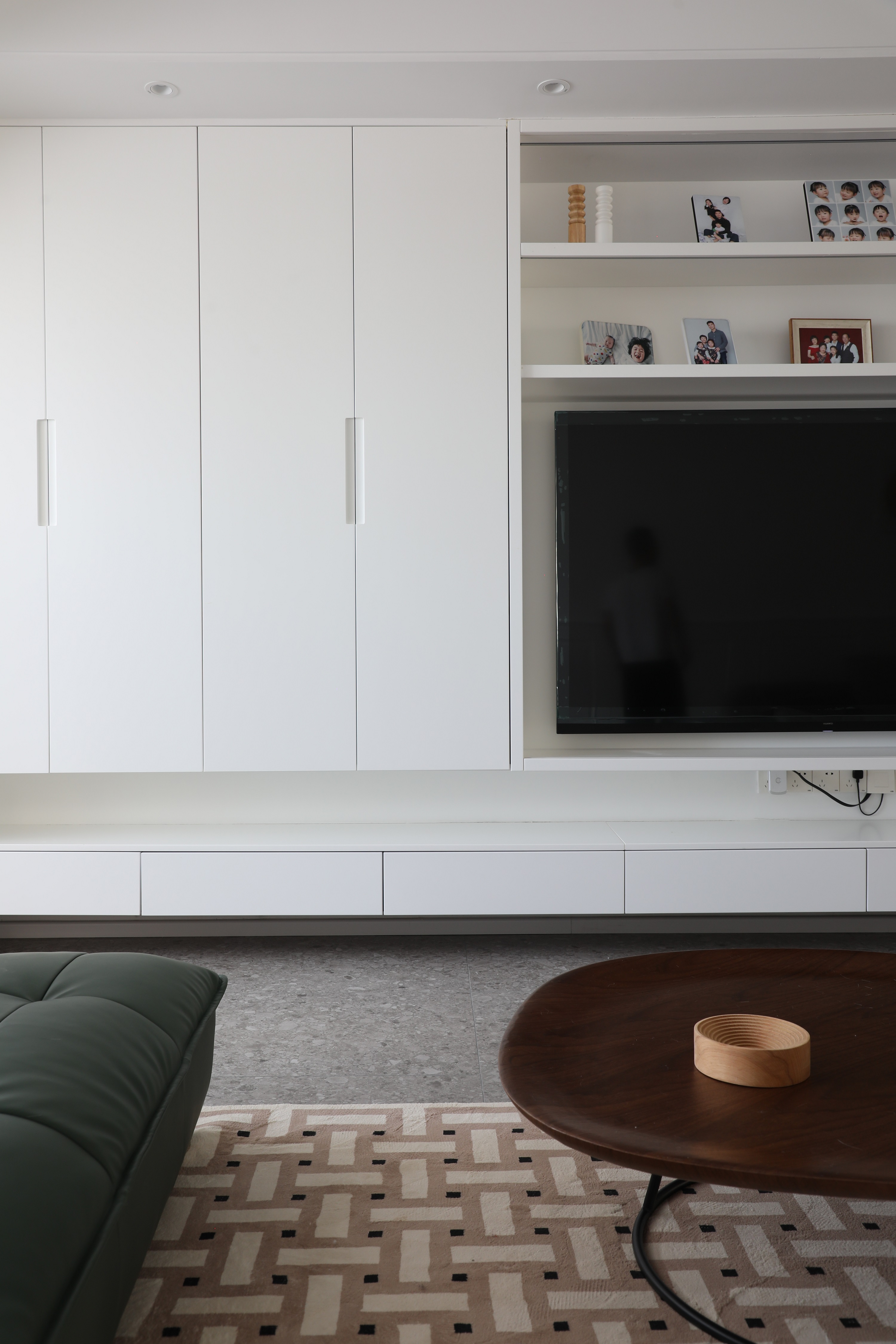 改造前的客厅,光线被遮住了一半,梁位也特别的压抑。首先我们通过双弧形的吊顶设计,解决了原来的梁位压抑的缺陷。电视墙方面,用了一整面的收纳柜进行组合,把两个宝贝的所有玩具都进行了整理。把原来客厅的推拉门进行了拆除,生活阳台扩大并变成了客厅的一个组成部分,把光线引了进来
