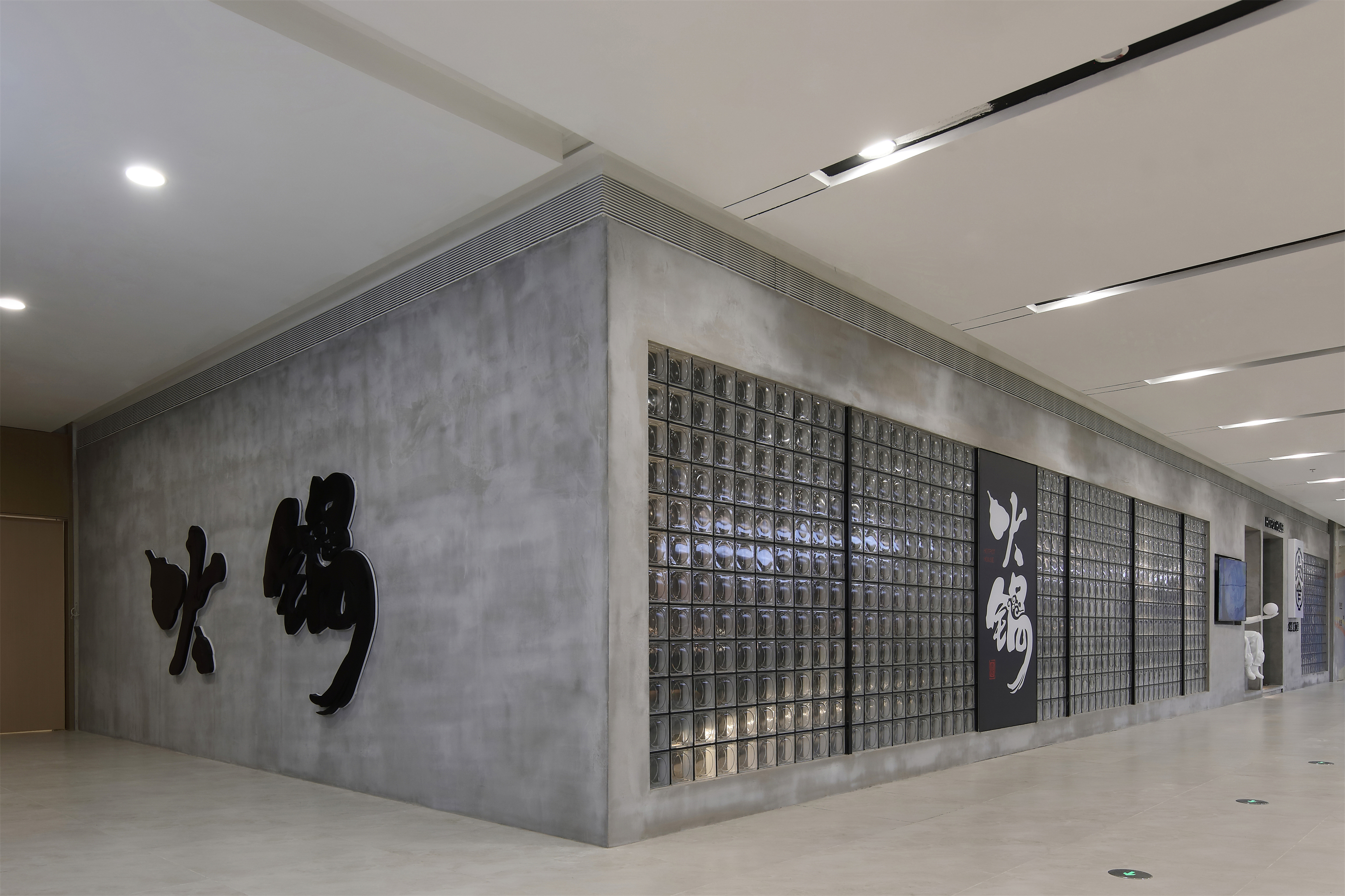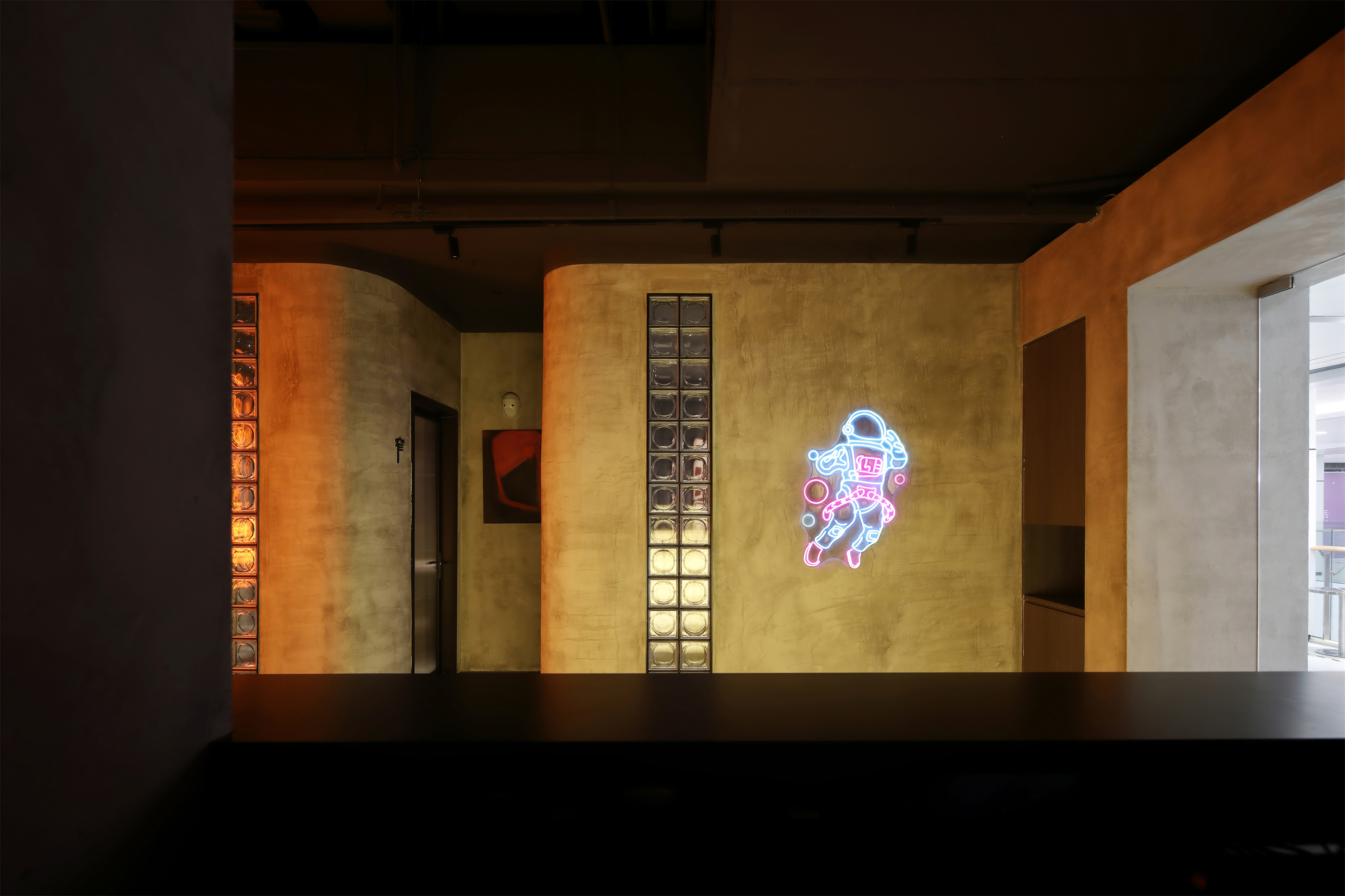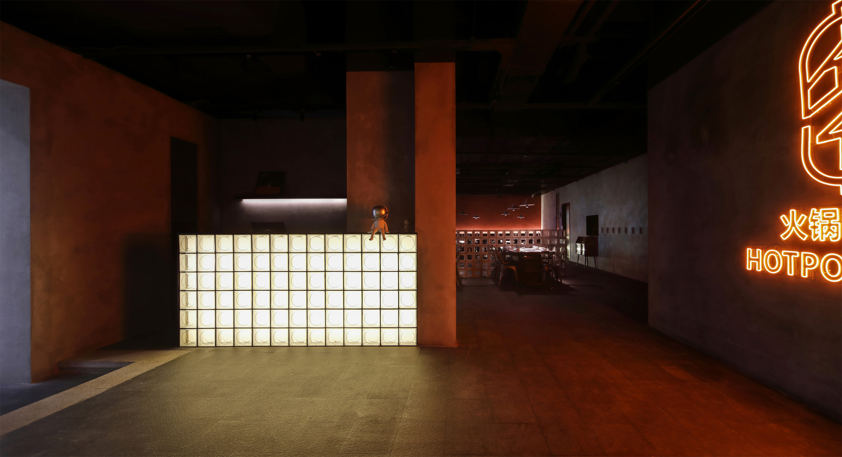空间意境:空间打造的是以“太空”主题为元素的火锅店,门口有作为IP形象的宇航员,每家店也都有特地调色定制的夯土并有特定的霓虹灯元素、