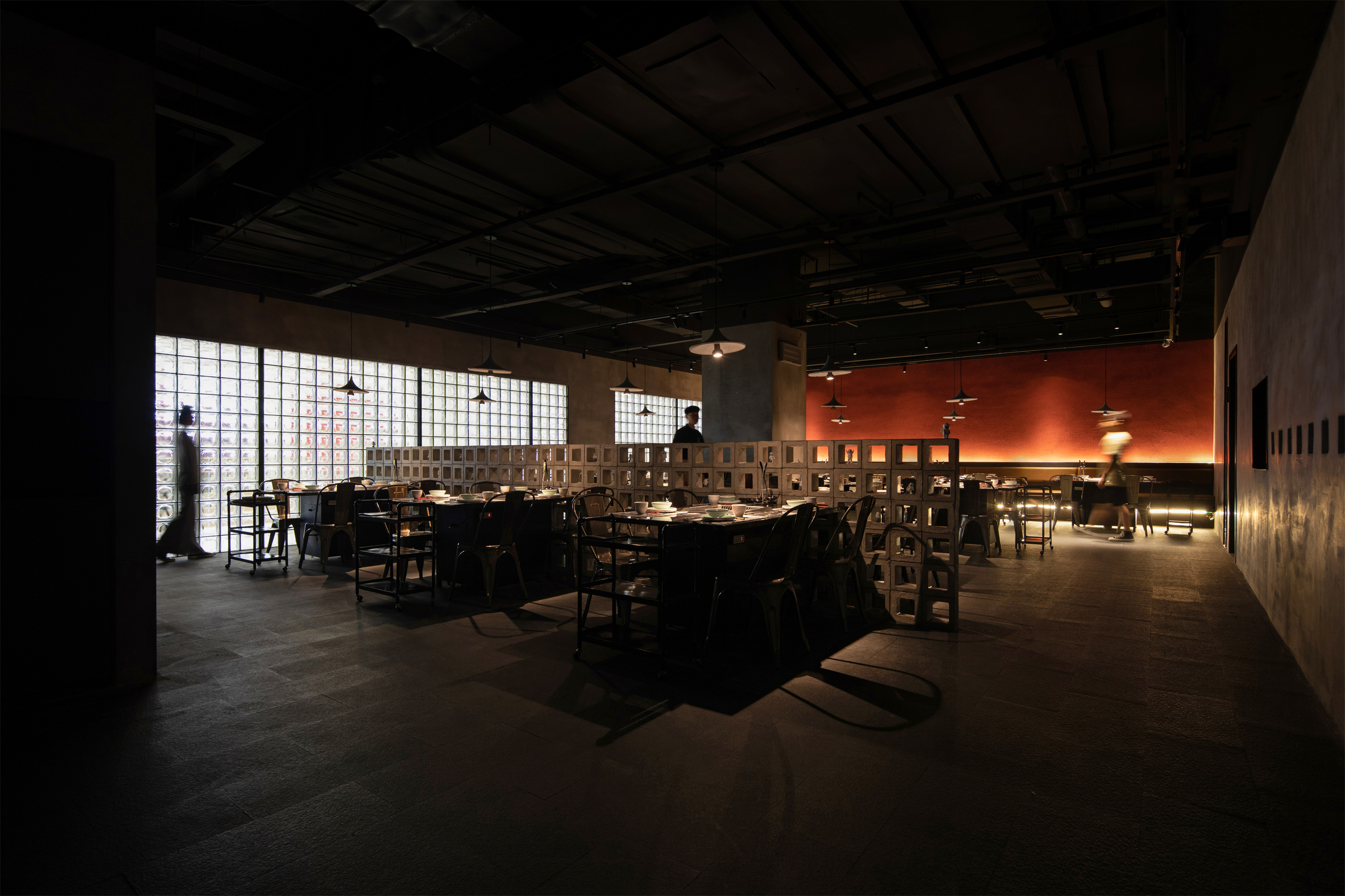 空间布局:舍弃了原来火锅店拥挤而杂乱的缺陷,把桌子延长,公共空间也放大,设计了多个打卡拍照店用于线上推广