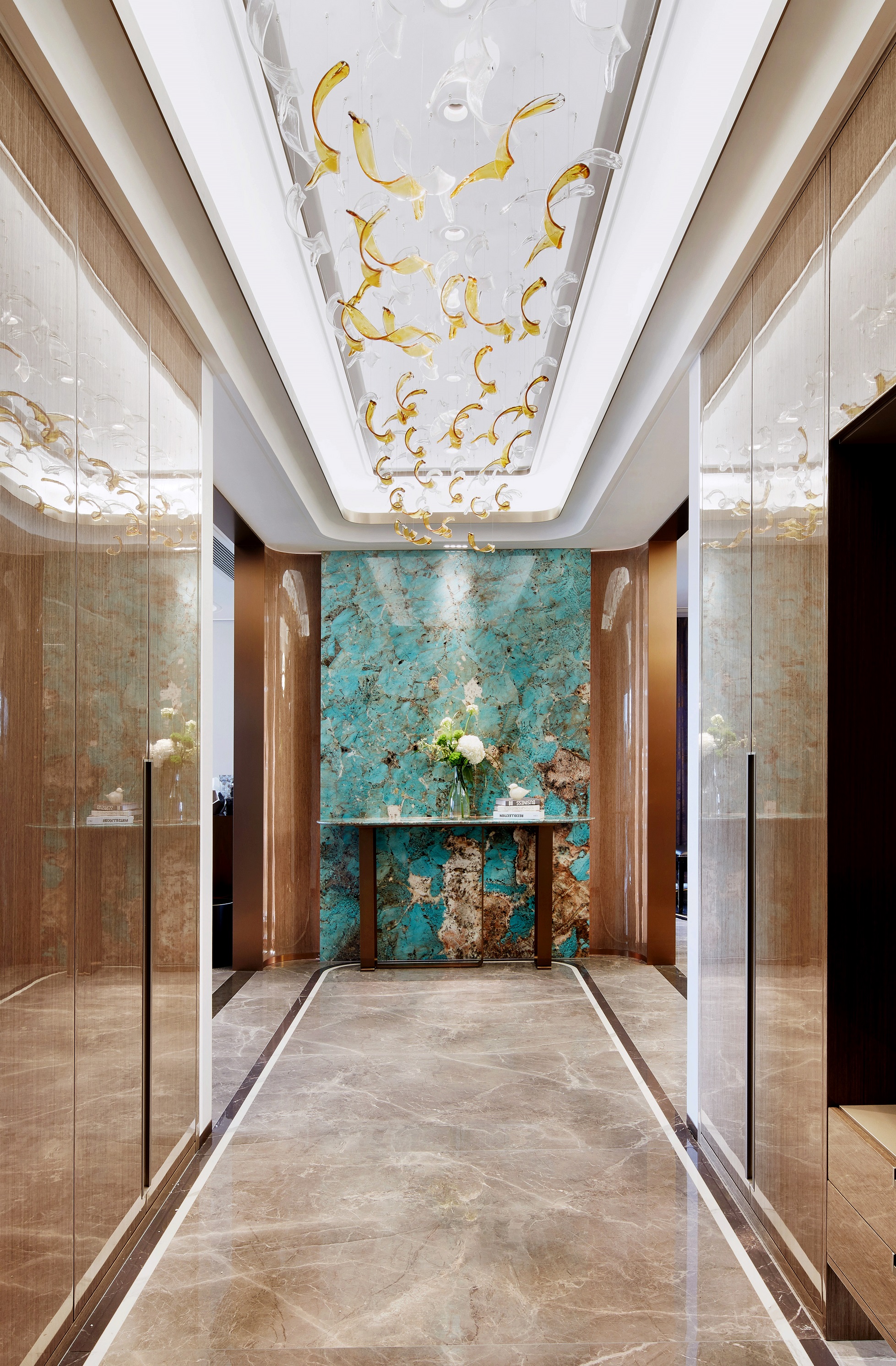 玄关吊装了整块大理石,独特的亚马逊绿为空间增添一抹生态。同时作为左右空间的分隔枢纽,丰富视觉效果。 如叶状的黄白色吊灯。寓意着秋冬俩季。天然的石材运用,人与自然的空间结合之类的。