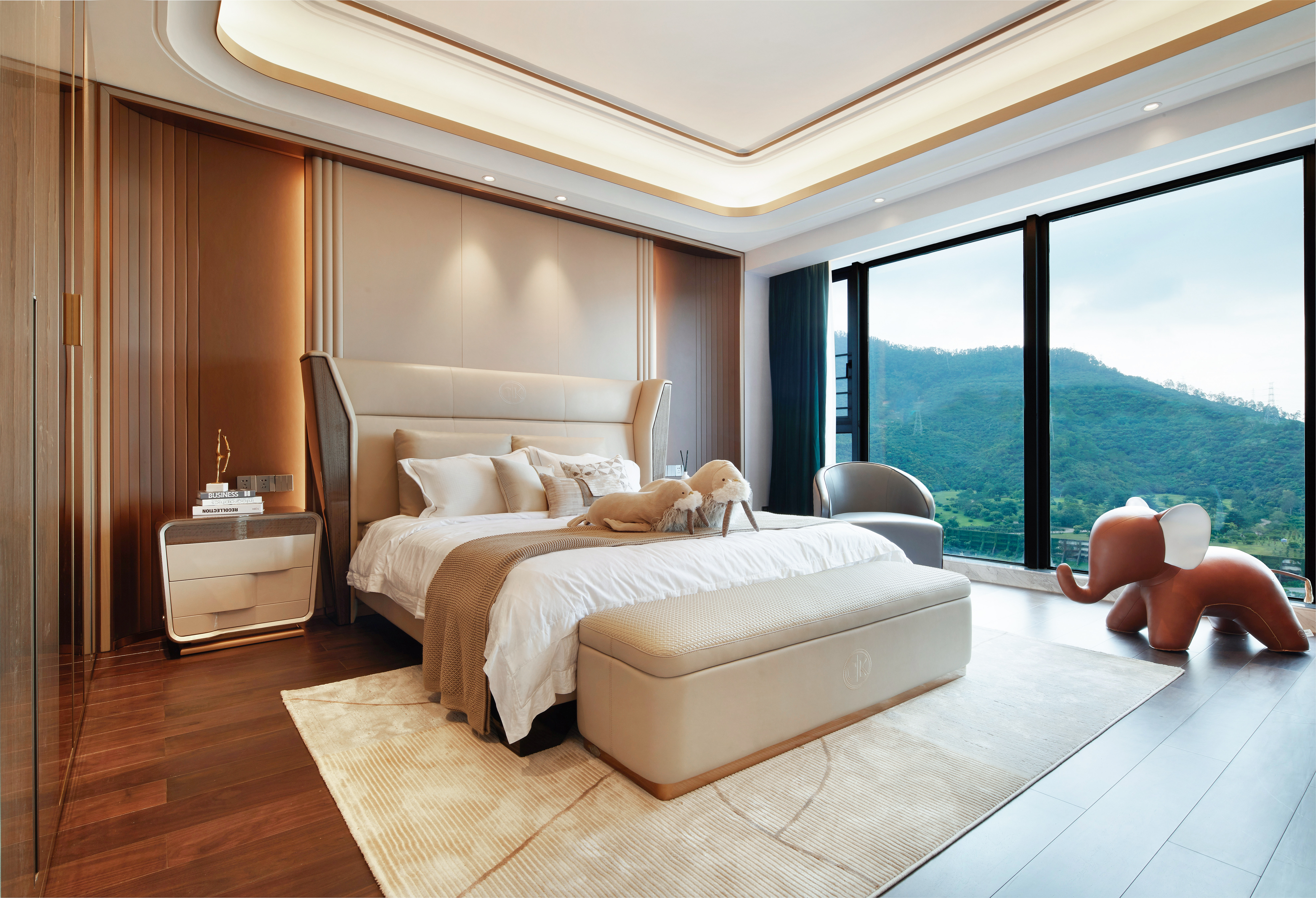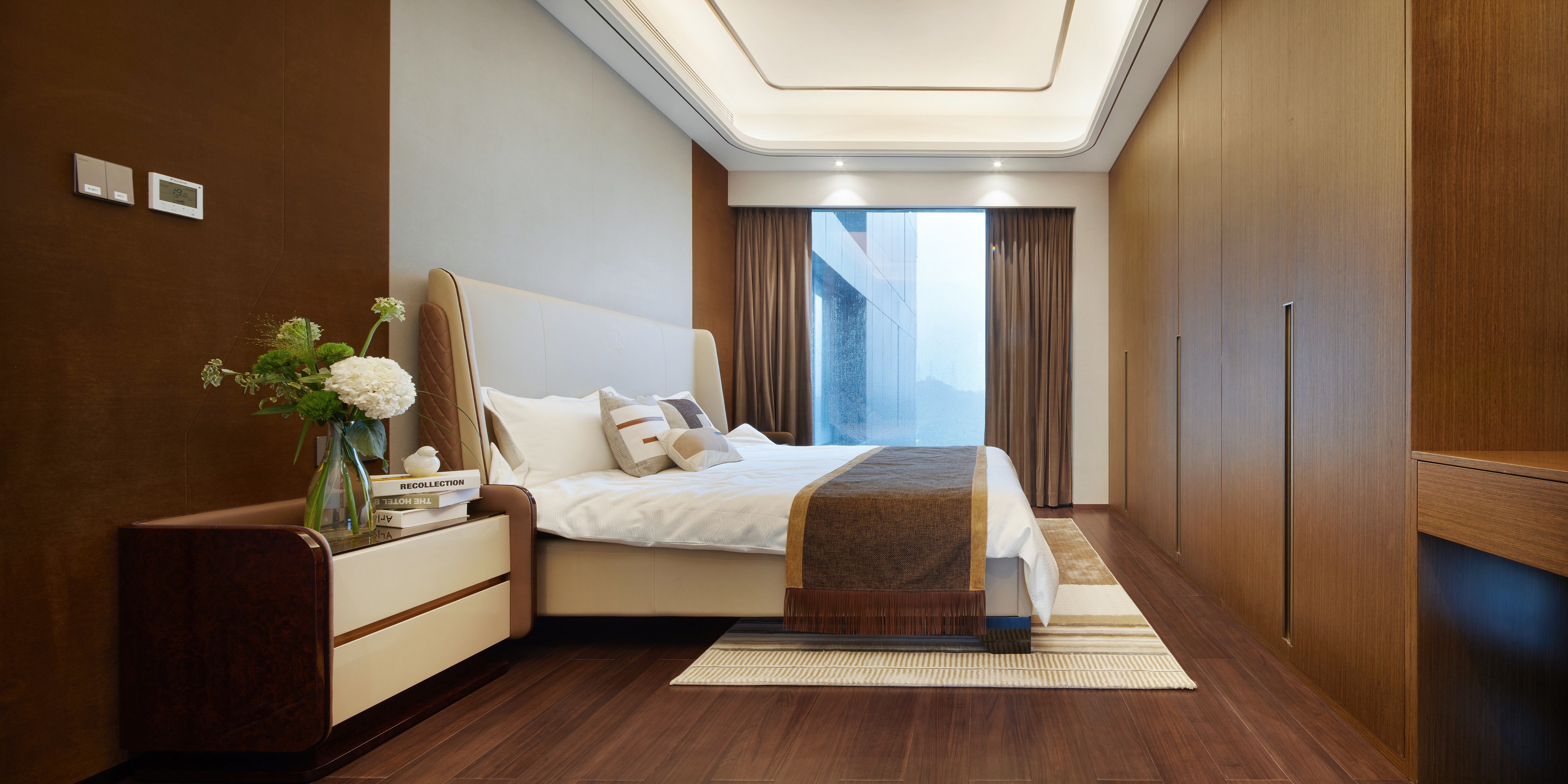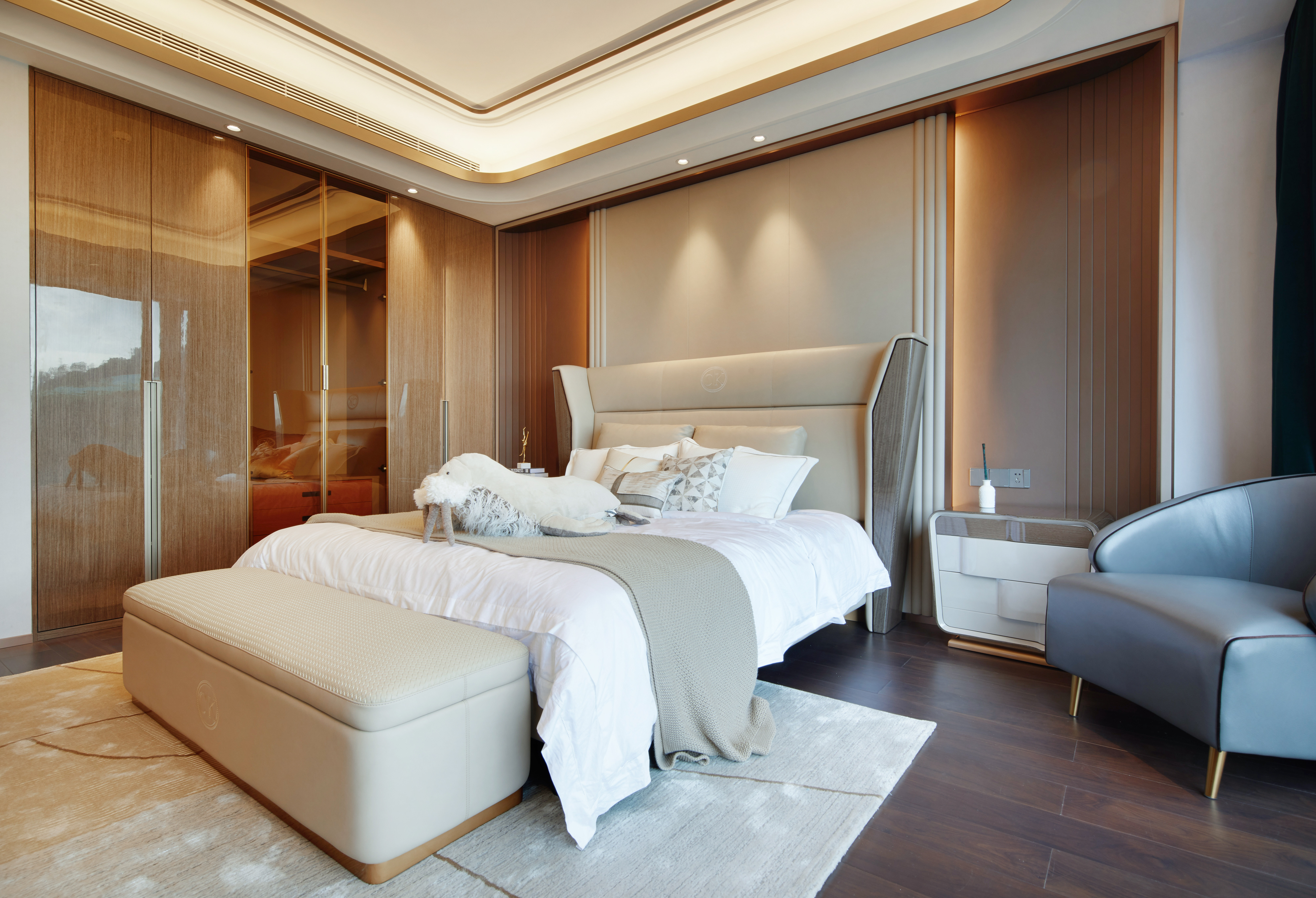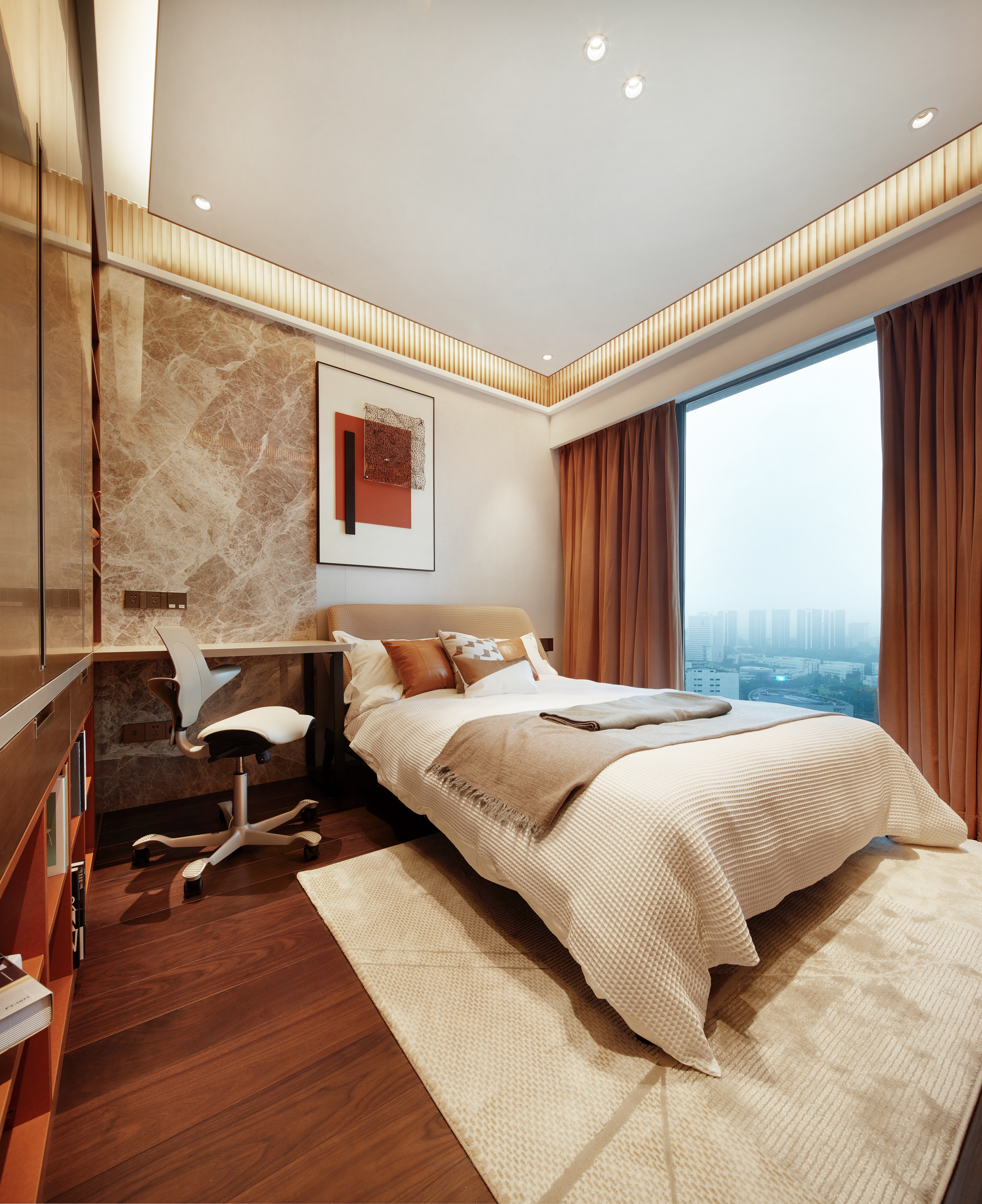主卧:遵循简奢原则,以木色作为基调,混合皮革与香槟色作为点缀,以此丰富的层次变化,立体的诠释了生活与现代都市之间的关系,从极简到奢华,从视觉及质感上呈现出多种变化,赋予居室极致的入住体验。