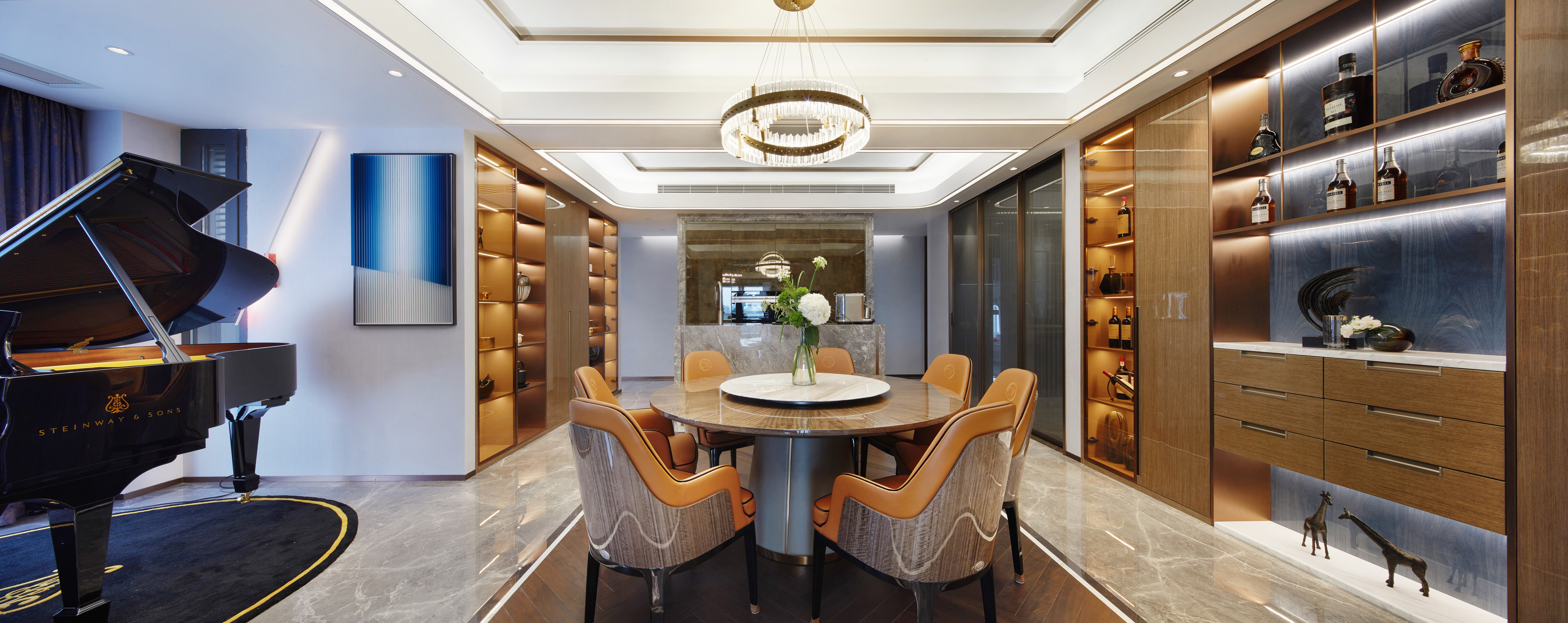 餐厅 大面积开阔的空间,将餐厅与吧台一以贯之,增加空间的互动性,搭配简洁而不失品质的餐椅与精致大理石餐桌,恰到好处的材质对比,让整体空间保持统一调性。