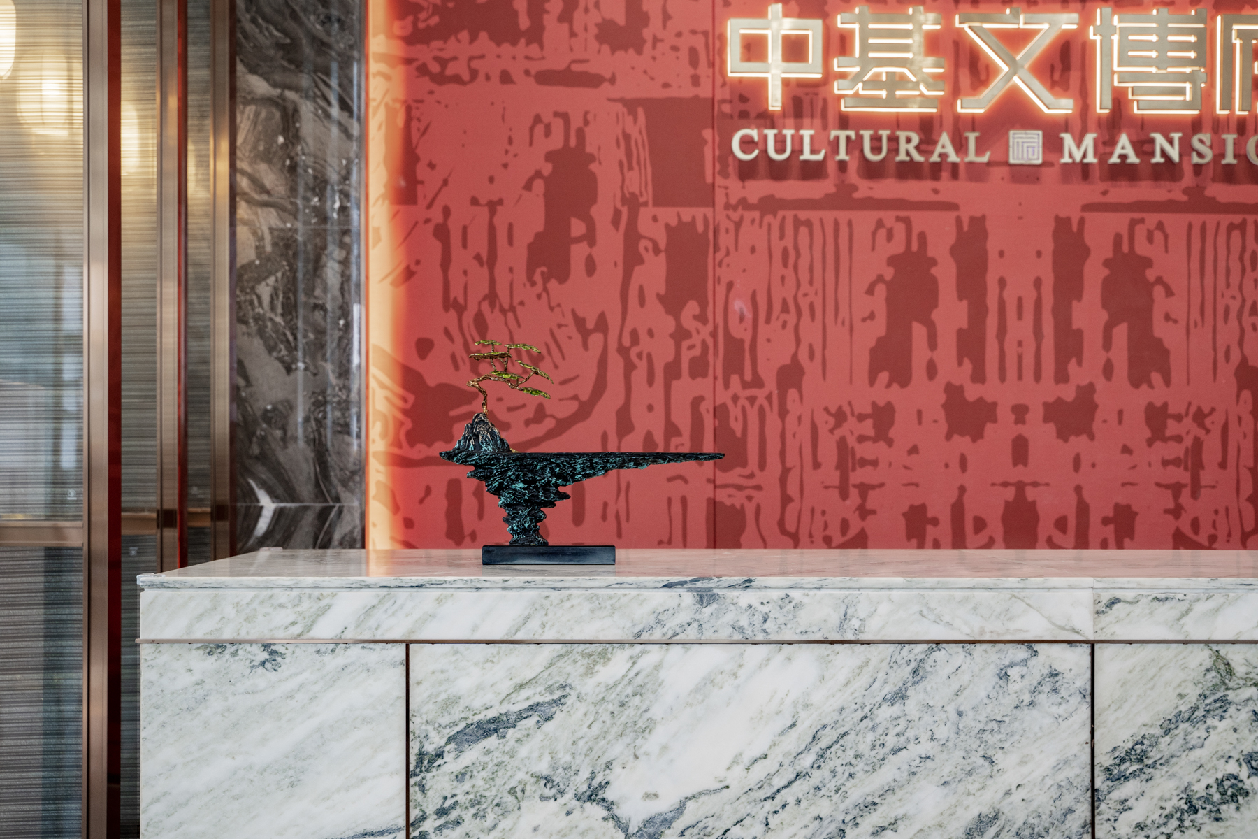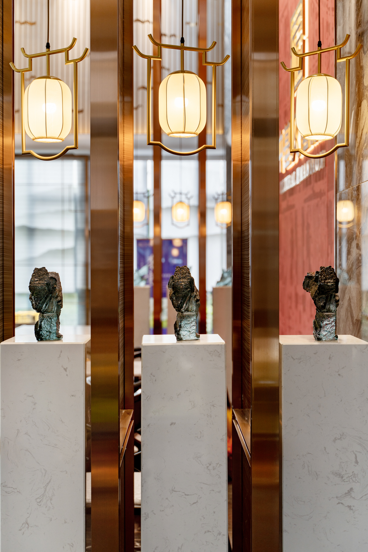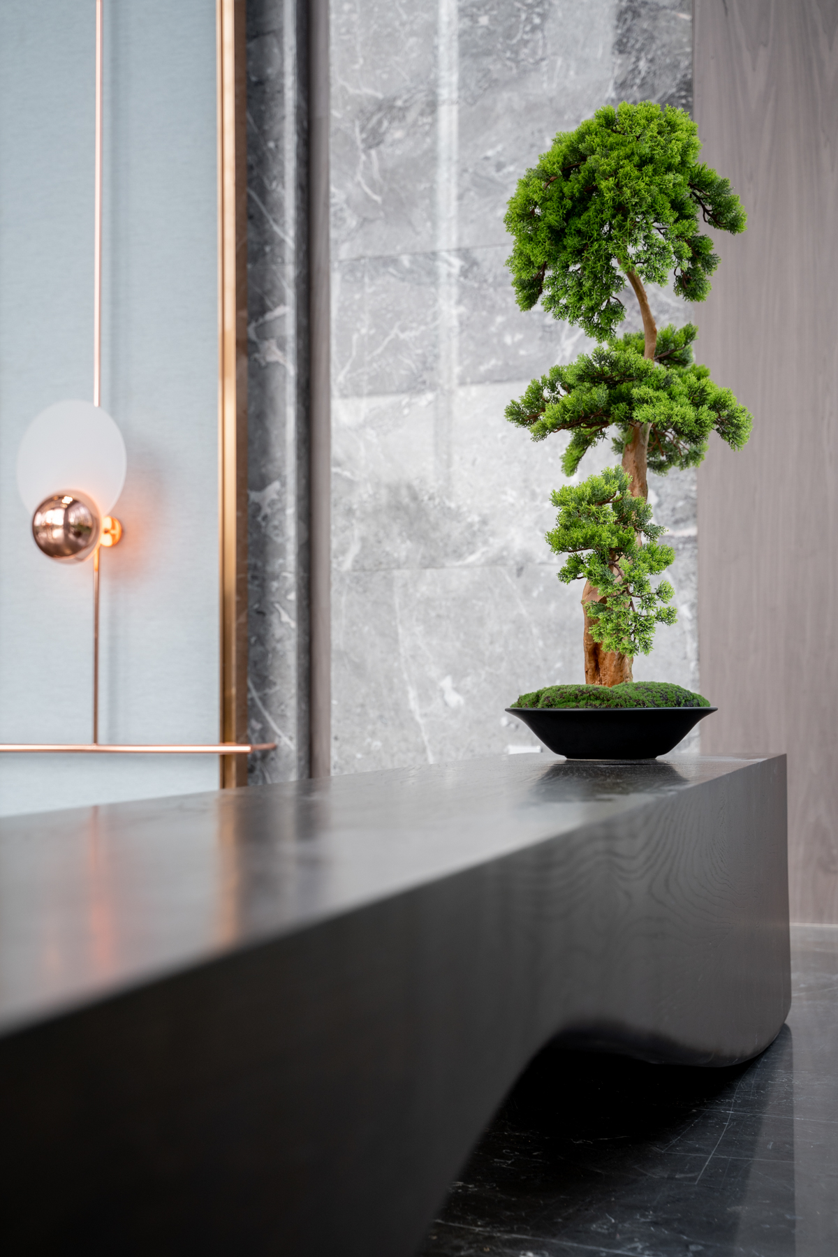 设计选材:洽谈区整体空间以低纯度呈现,白色主体天花与浅灰色木纹、深色大理石地面搭配,把空间维度切割得更加分明。水墨纹大理石吧台后,暗红色背景映下的是未燃尽的古老烛火,幢幢如影,留存在此无声诉说这里过去的辉煌……