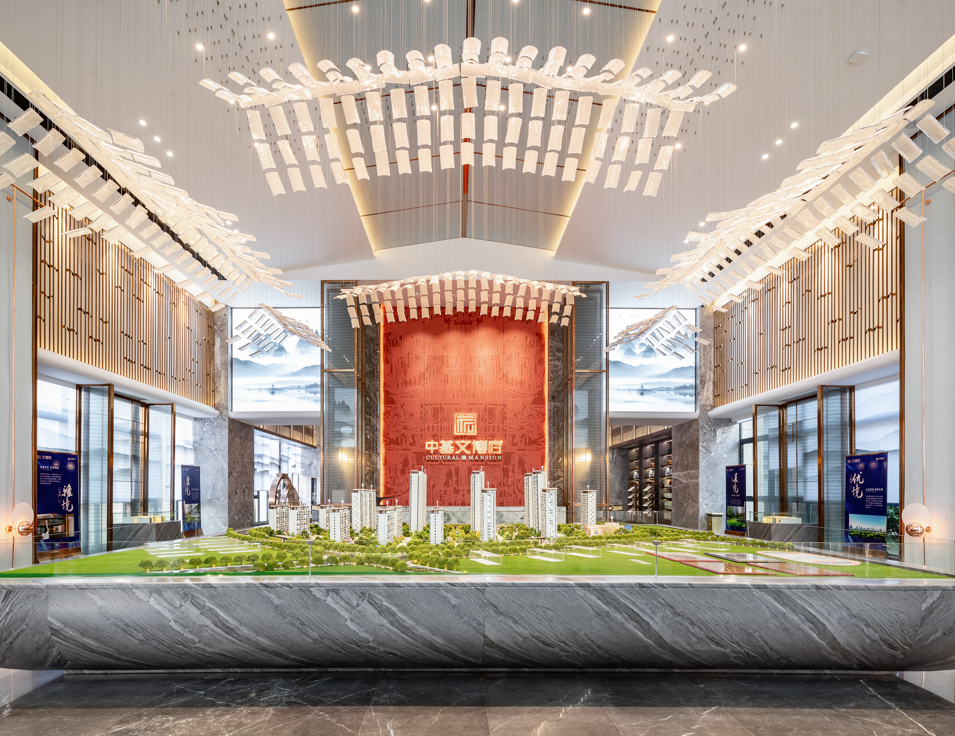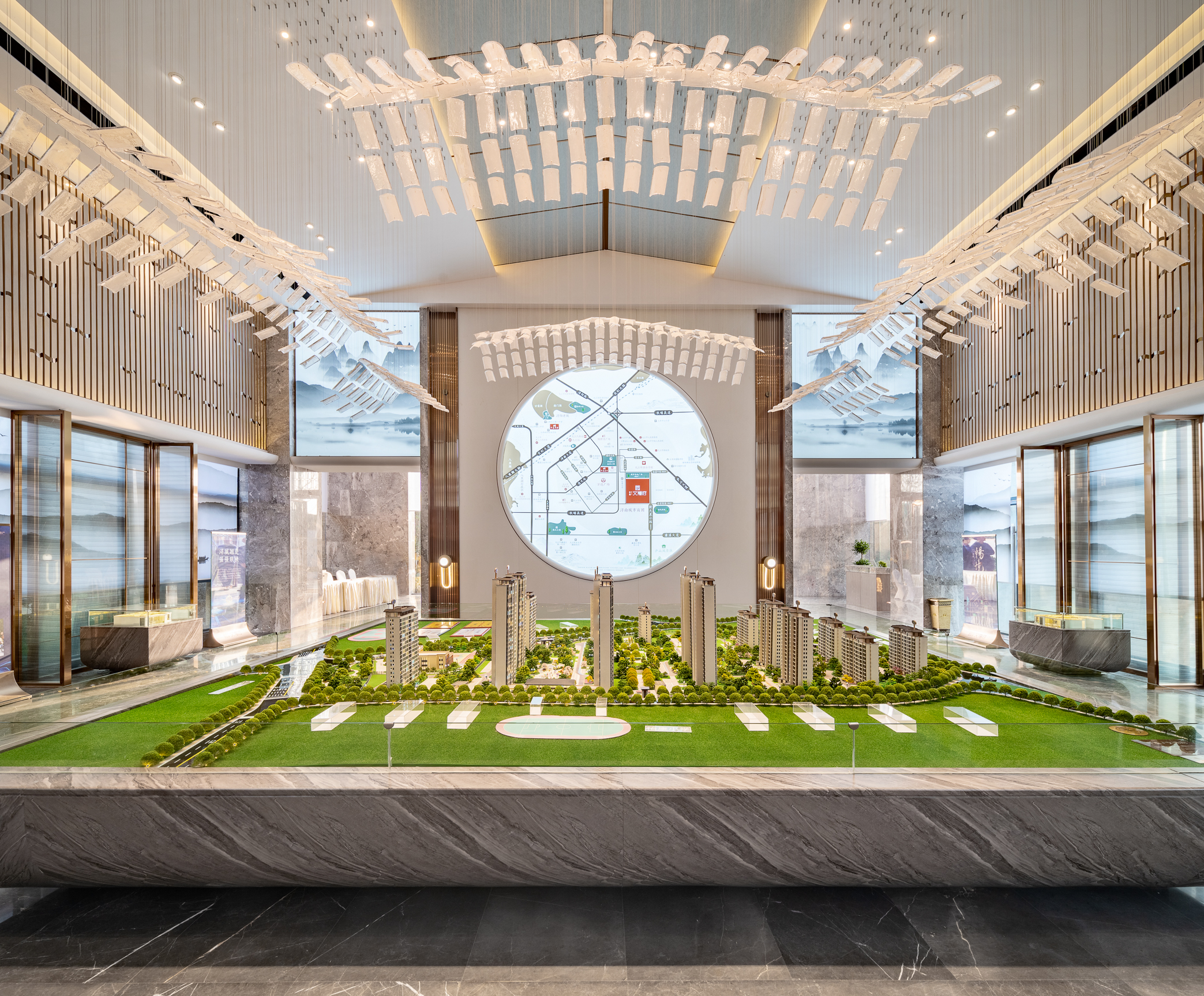 空间布局:沙盘上空以现代手法表现传统斜屋顶,抽象的云在中空的墙体上造出一个微妙的语境,同时也营造起了一种飘离的空间感受,在此刻仿佛通联起了过去,时光流转,令人遐想。
