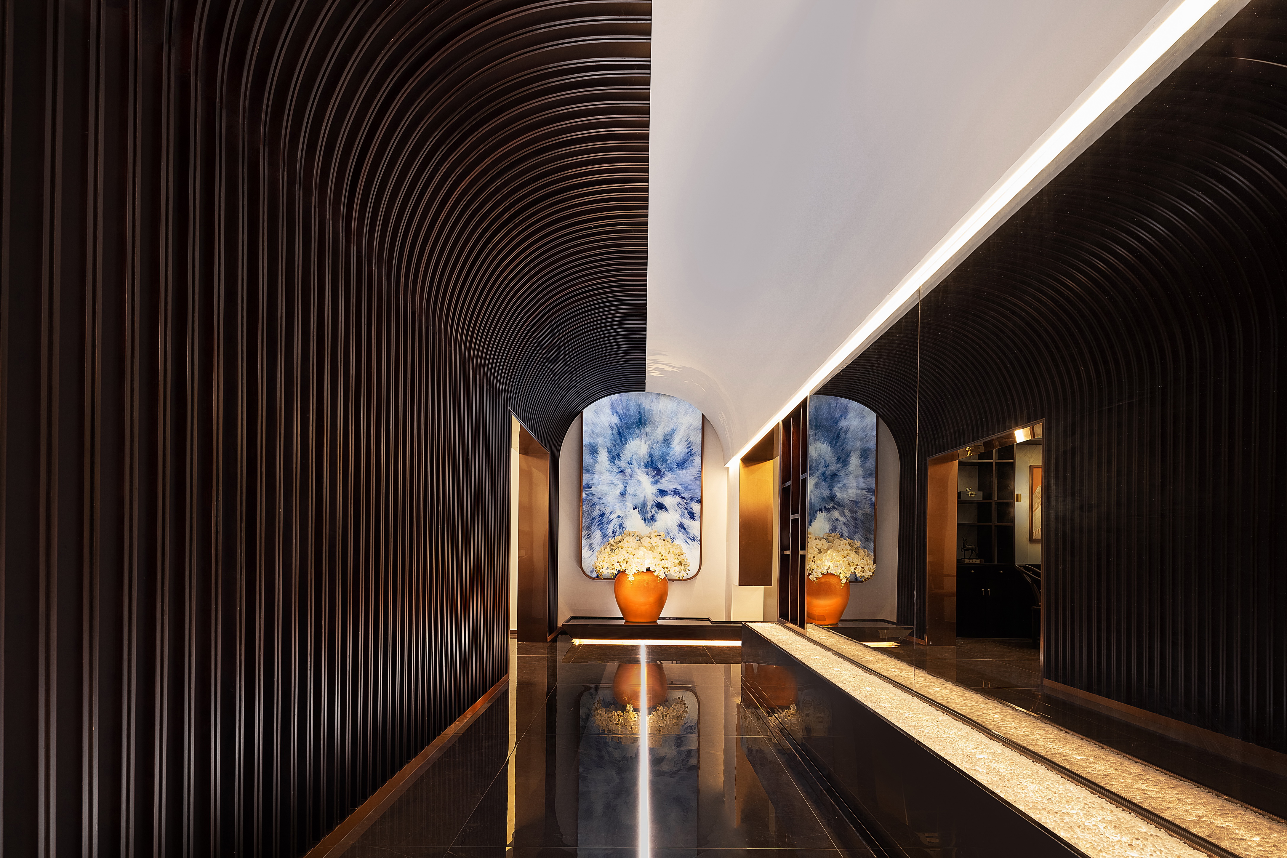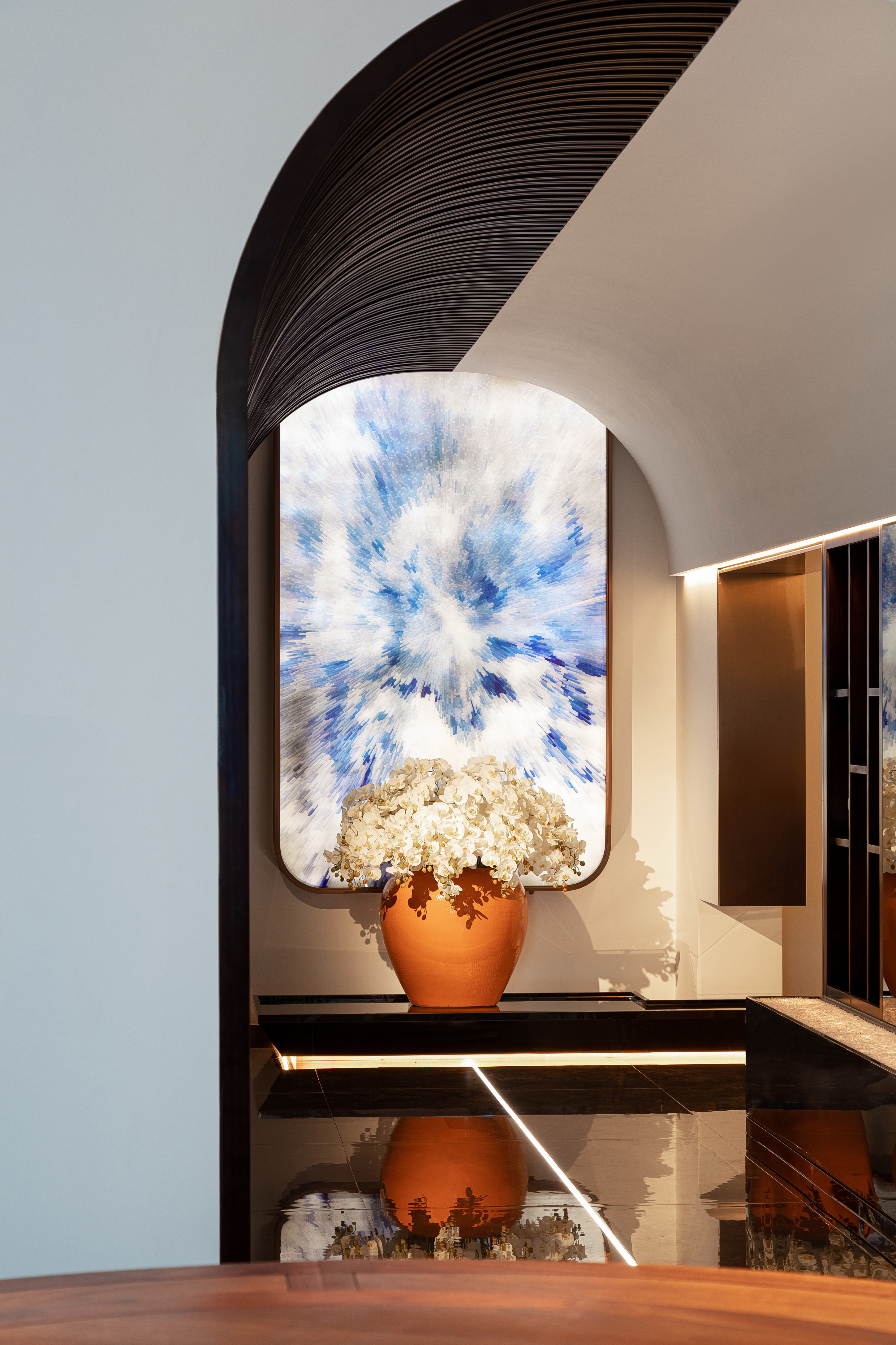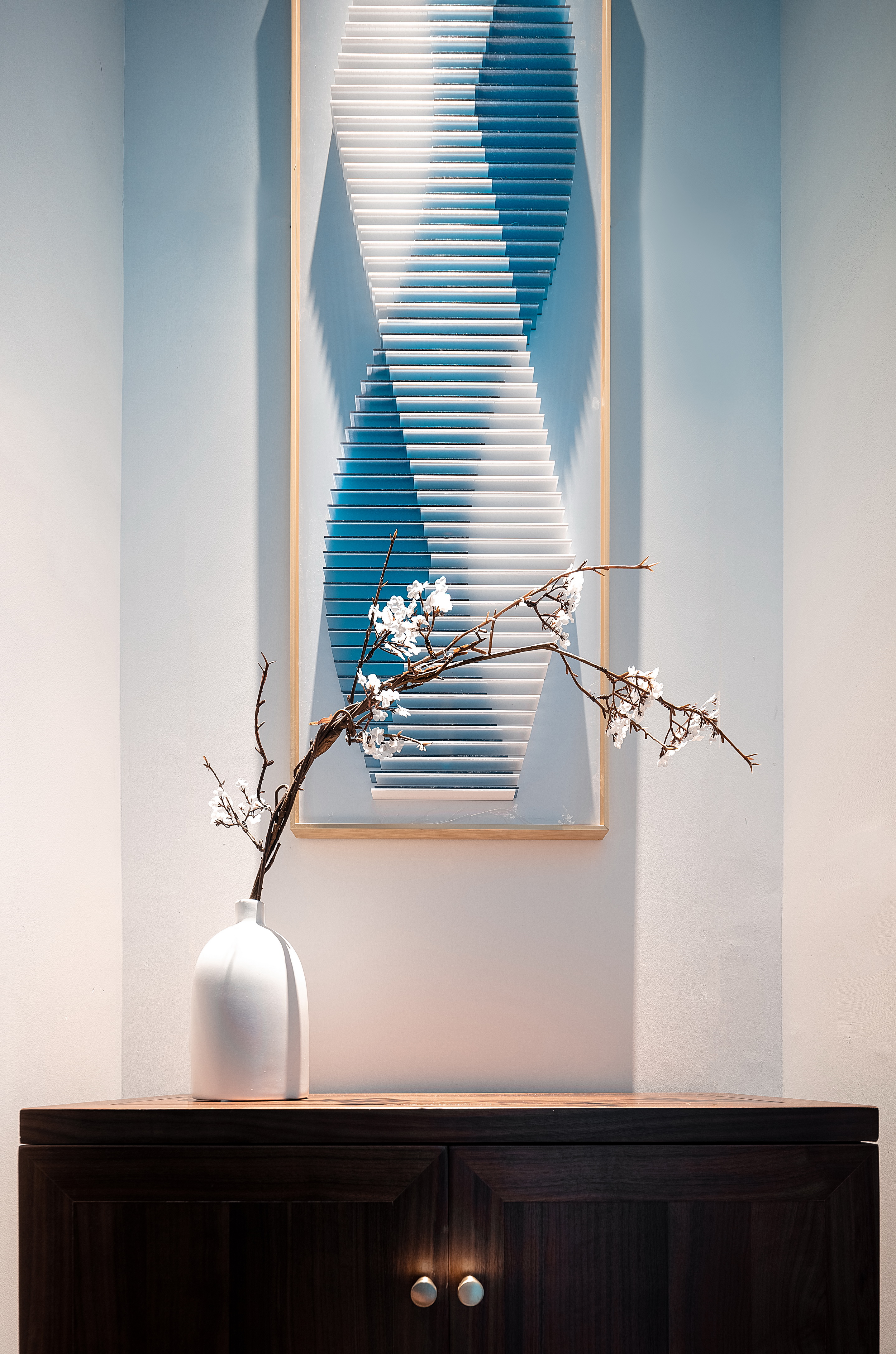 廊道尽头一幅抽象画面,富有动感的线条,有节奏的排序,如同跃动的音符。以规律的变化和无序的延展,静静的谱写着空间的韵律。木质造型从墙面延伸至天花,通过有序的排列,赋予空间独特的节奏。轻缓宁静中带着一丝丝动感舒张,多层次力度表达将空间雕刻成曲,在浮光疏影中,叠加层次,引人入胜,动势的感官体验,沉浸在空间的艺术魅力中。 -