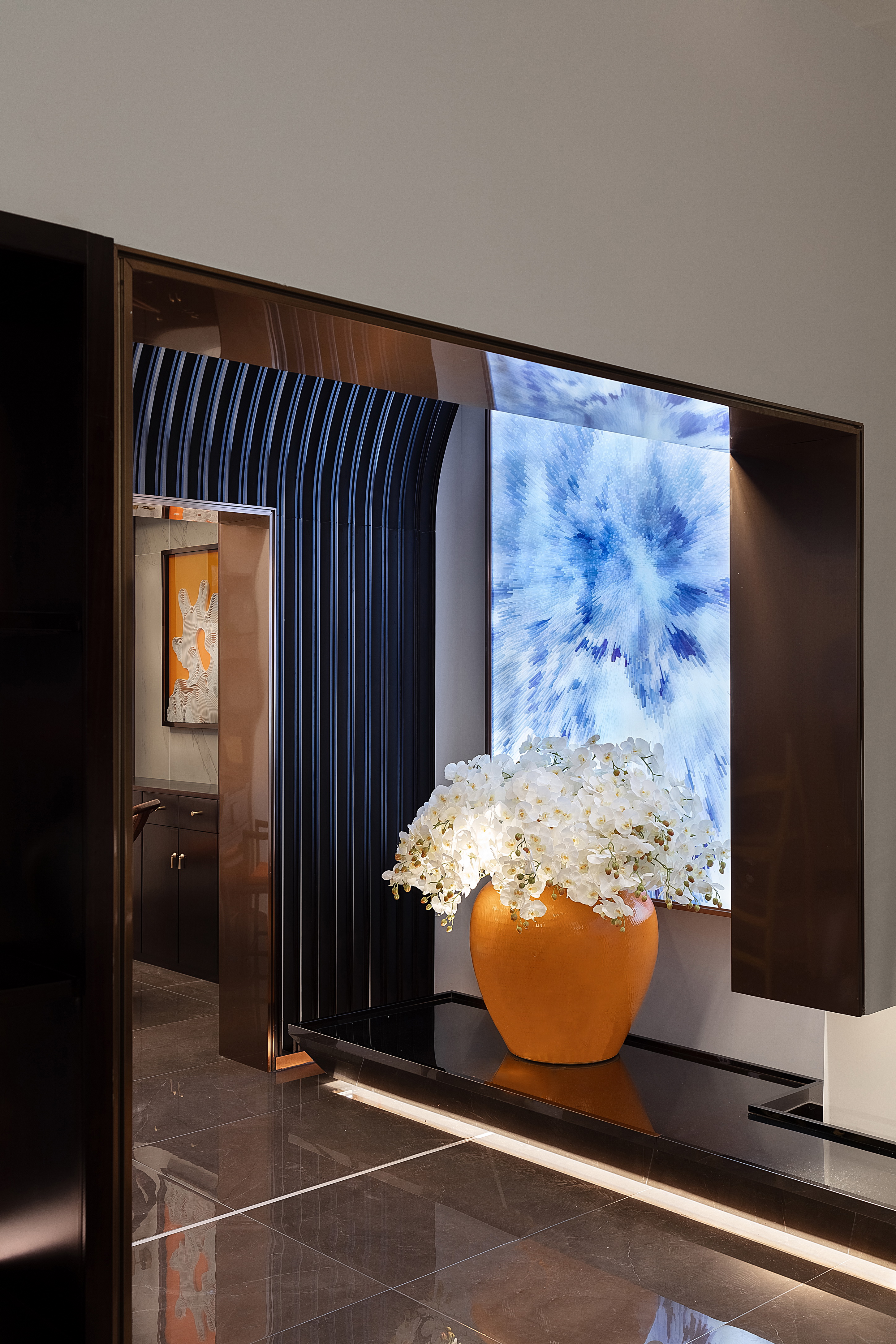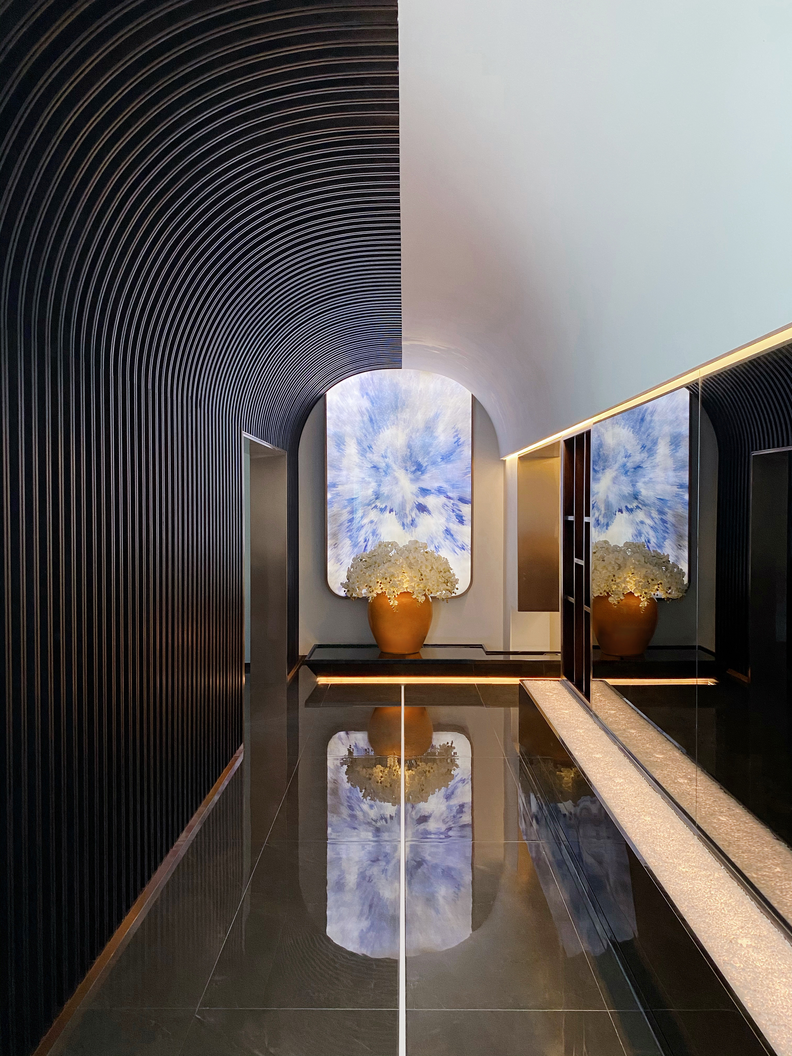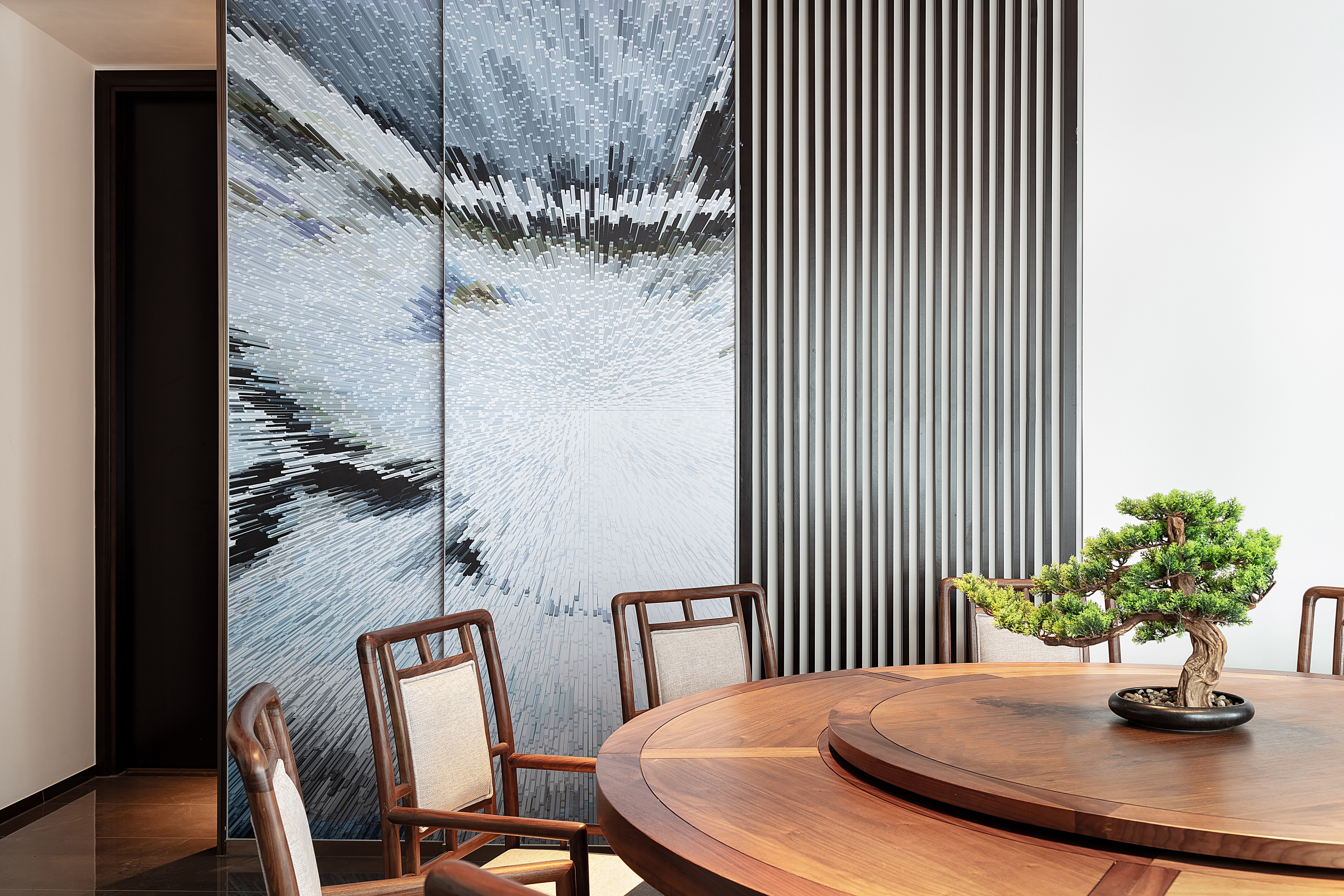 廊道尽头一幅抽象画面,富有动感的线条,有节奏的排序,如同跃动的音符。以规律的变化和无序的延展,静静的谱写着空间的韵律。木质造型从墙面延伸至天花,通过有序的排列,赋予空间独特的节奏。轻缓宁静中带着一丝丝动感舒张,多层次力度表达将空间雕刻成曲,在浮光疏影中,叠加层次,引人入胜,动势的感官体验,沉浸在空间的艺术魅力中。 -