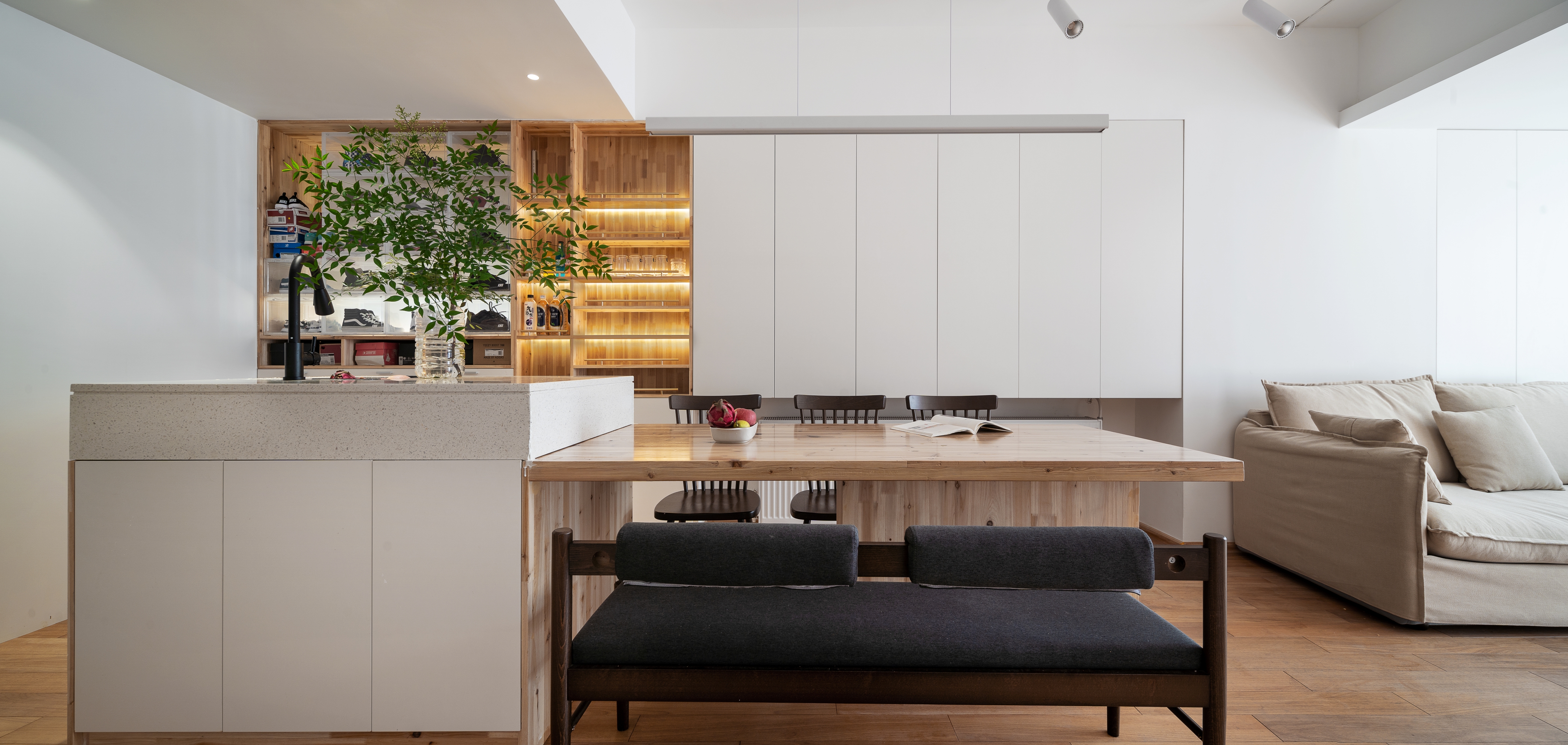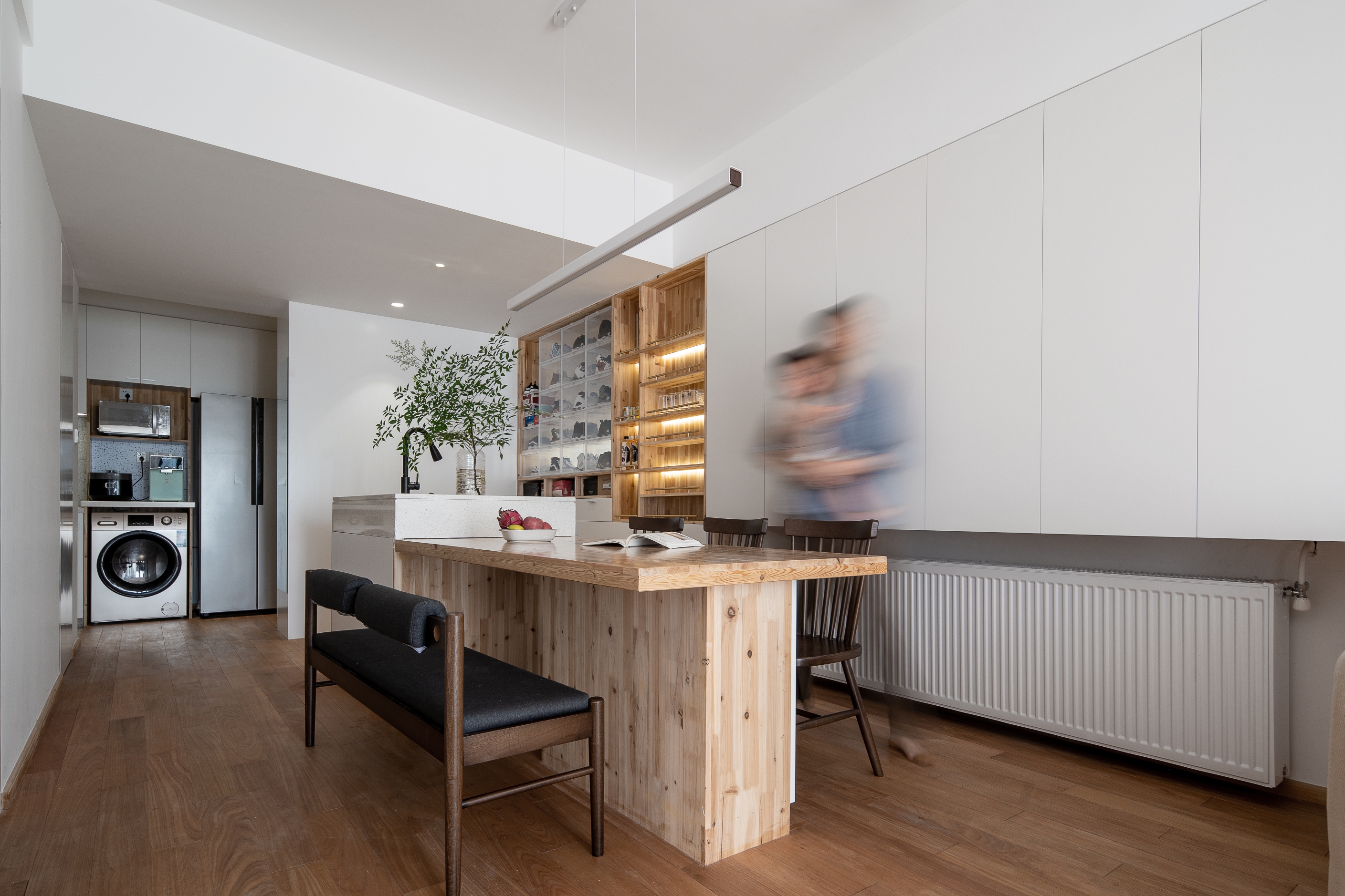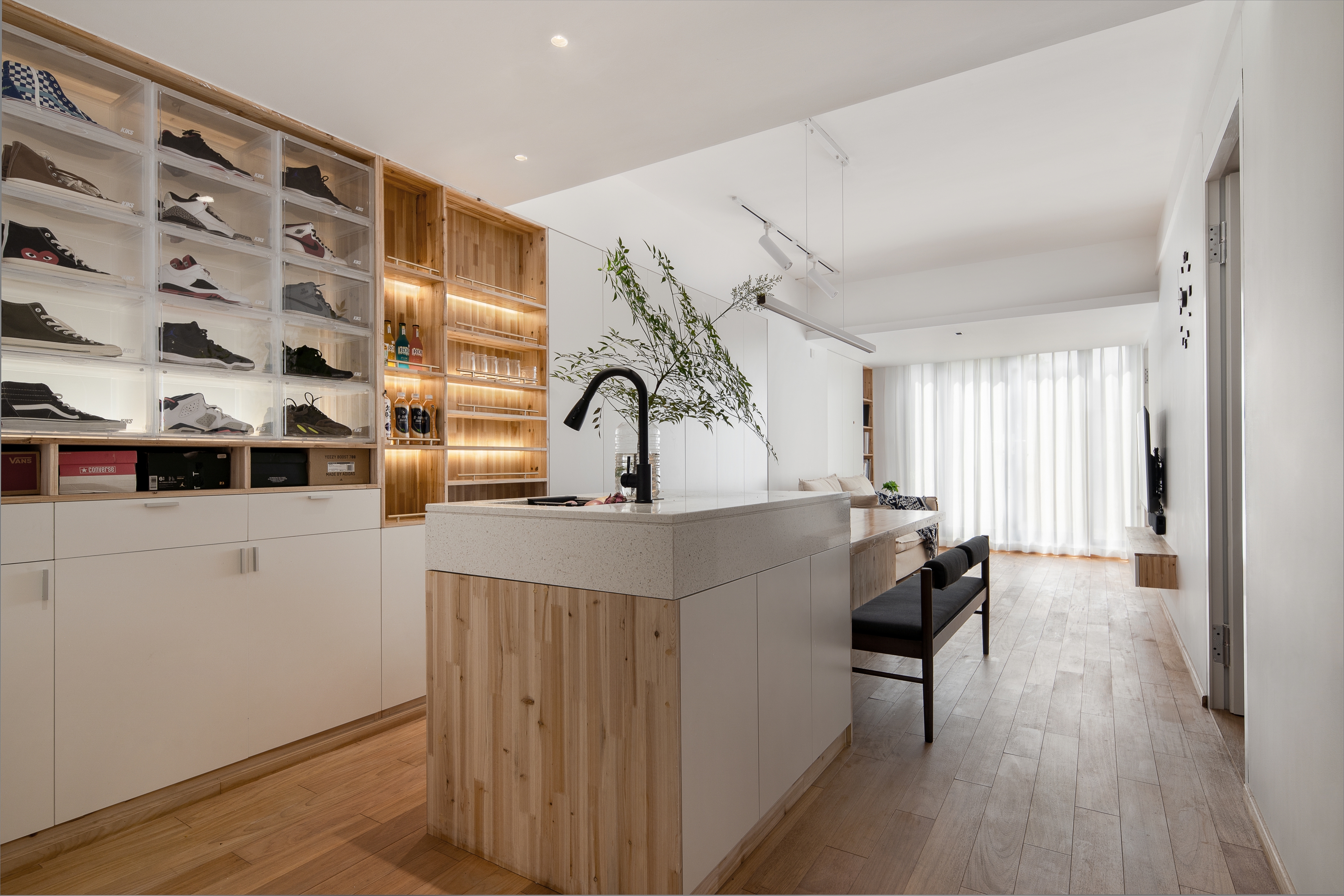 空间意境:客餐厅形成一个整体宽厅,整体动线简单明了,小户型设计时尽量避免过道的占比过大对于空间是不必要的浪费。沿着宽厅四周想办法解决收纳空间的问题,餐厅延续到客厅区域墙面均为暗藏式收纳柜。因房主有球鞋收藏、杯子收藏以及深夜加班的兴趣和习惯,餐厅有专属球鞋、杯架展示位,还是家庭移动办公、聊天、水吧的交互空间。客餐厅中除了必要沙发座椅外,多余的家具都舍弃,目的是为了让空间更宽敞,而且传统客厅中大茶几的使用率随着生活方式的不同,部分家具反而会成为空间中的障碍。在客厅沙发背后还暗藏了一个抽拉式床位,为客人居住应急预留。
