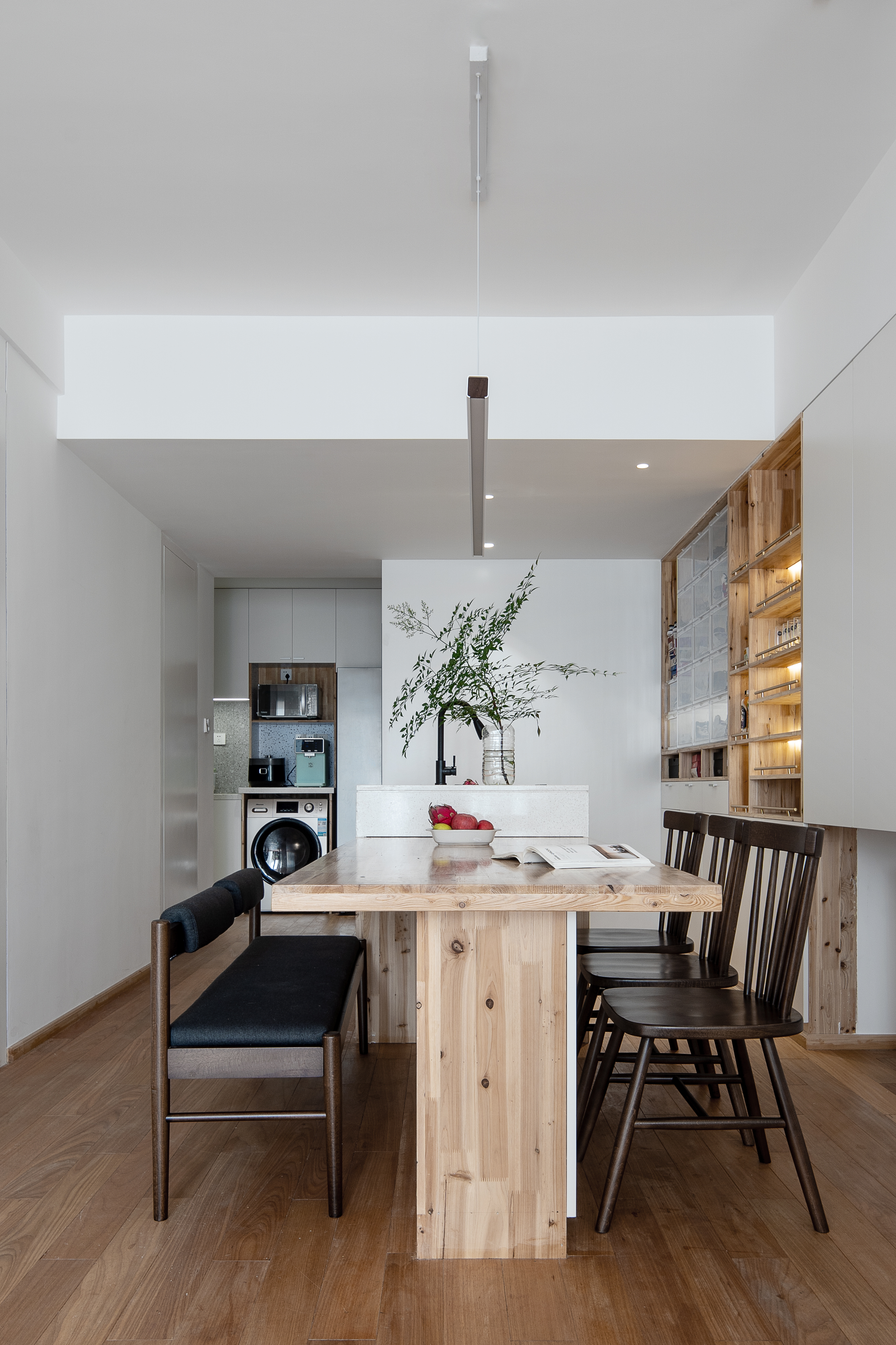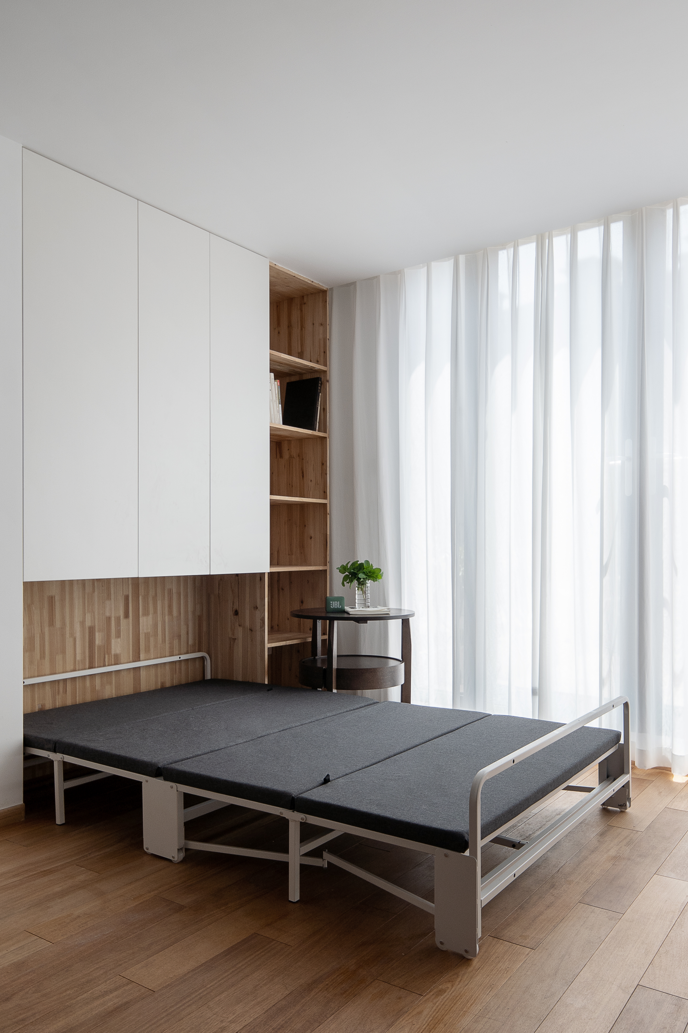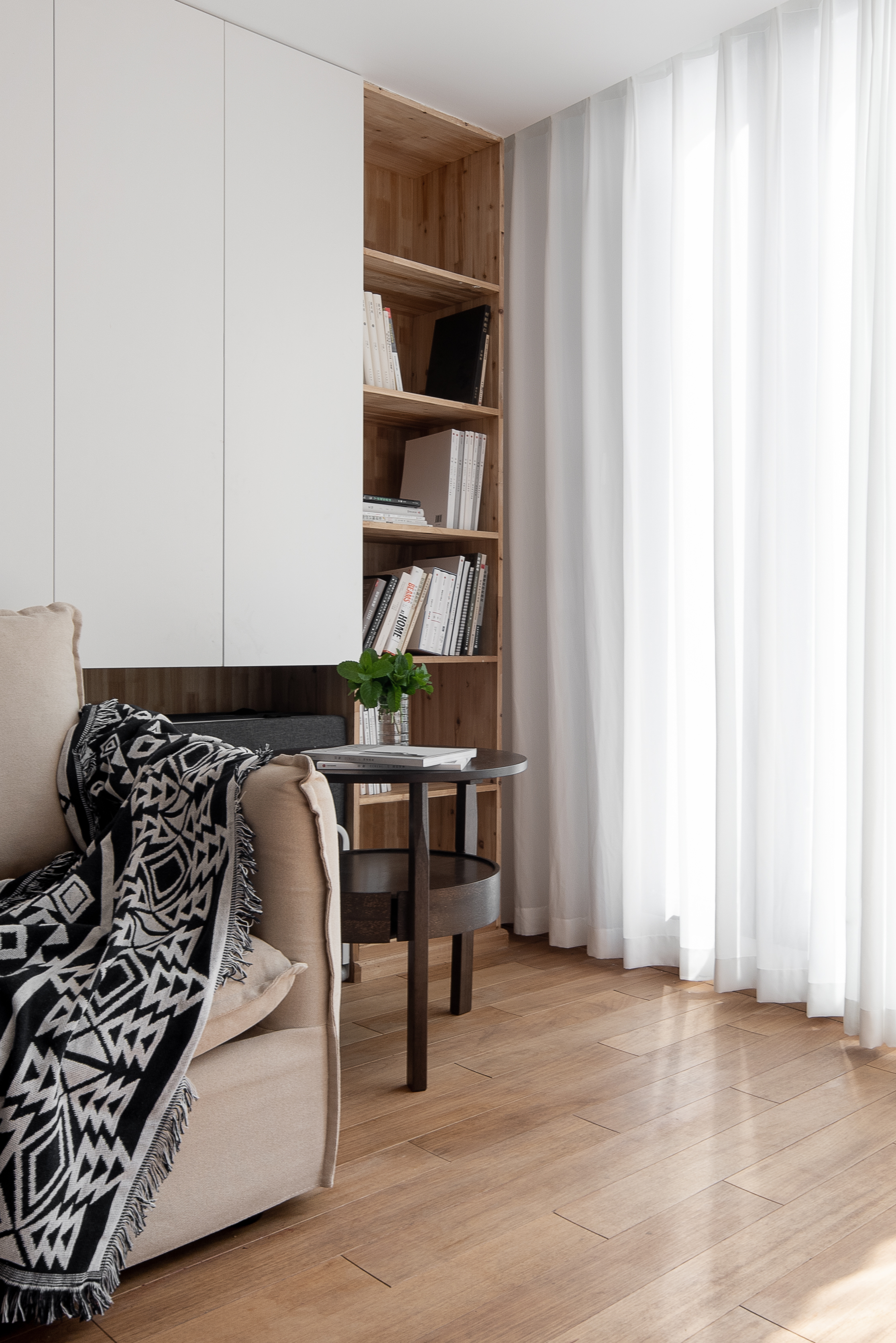 空间意境:客餐厅形成一个整体宽厅,整体动线简单明了,小户型设计时尽量避免过道的占比过大对于空间是不必要的浪费。沿着宽厅四周想办法解决收纳空间的问题,餐厅延续到客厅区域墙面均为暗藏式收纳柜。因房主有球鞋收藏、杯子收藏以及深夜加班的兴趣和习惯,餐厅有专属球鞋、杯架展示位,还是家庭移动办公、聊天、水吧的交互空间。客餐厅中除了必要沙发座椅外,多余的家具都舍弃,目的是为了让空间更宽敞,而且传统客厅中大茶几的使用率随着生活方式的不同,部分家具反而会成为空间中的障碍。在客厅沙发背后还暗藏了一个抽拉式床位,为客人居住应急预留。