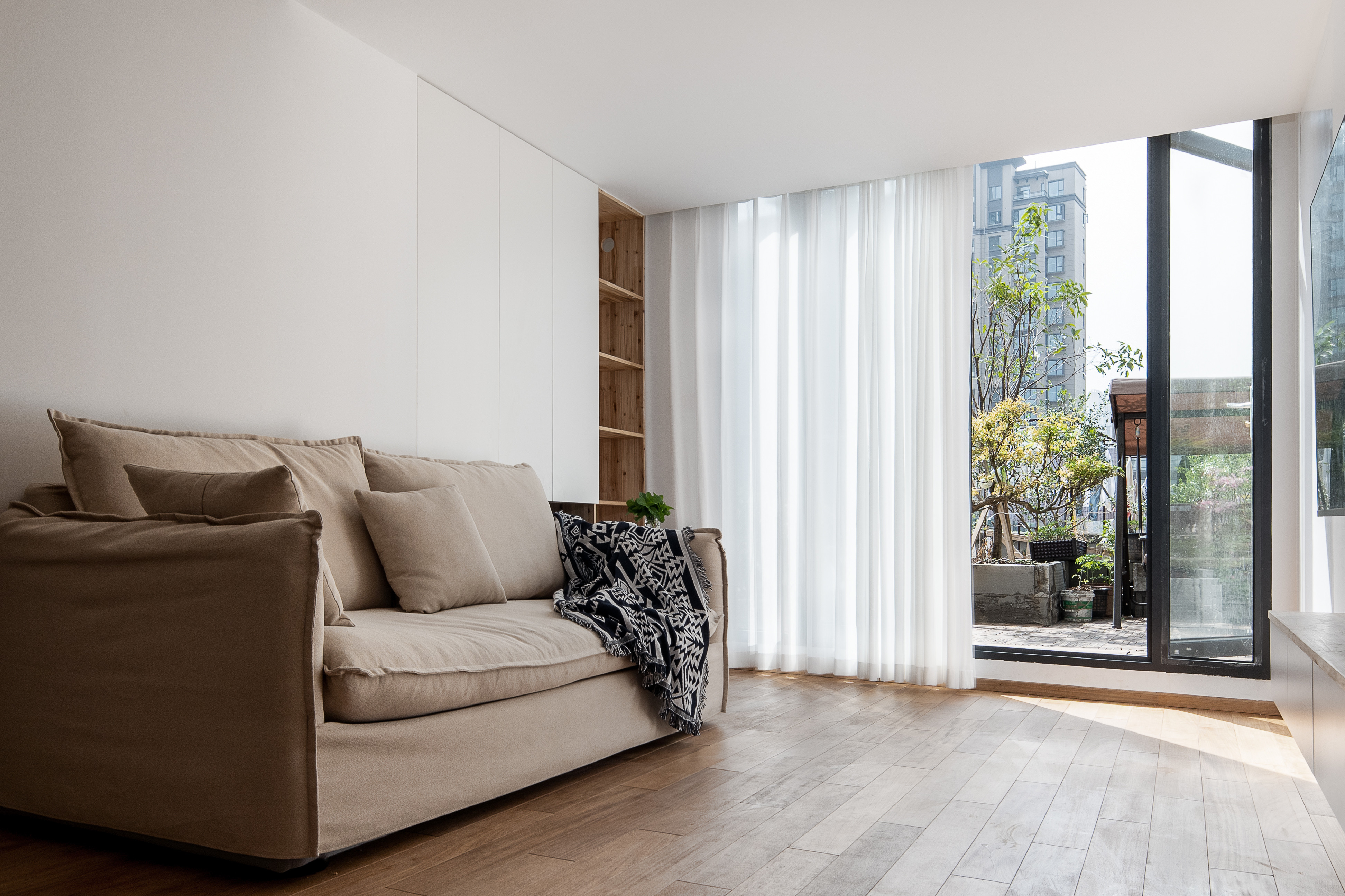 最后就是从客厅位置出去到露台上,户外露台延伸至可利用的最大范围,主卧窗前为灌木种植花池,边缘花池则种植稍微高一些的小型乔木。利用乔木起到隐私遮挡的功能需求。花园中间部分购买了成品秋千座椅,让小朋友可以有充足的娱乐活动空间。也给房主在工作闲暇之余有放松、锻炼的区域。出客厅到花园有一个小平台,设计寻求日本户外可坐的小平台,让人到露台户外后可随意放松落座和朋友、家人聊天娱乐。 -