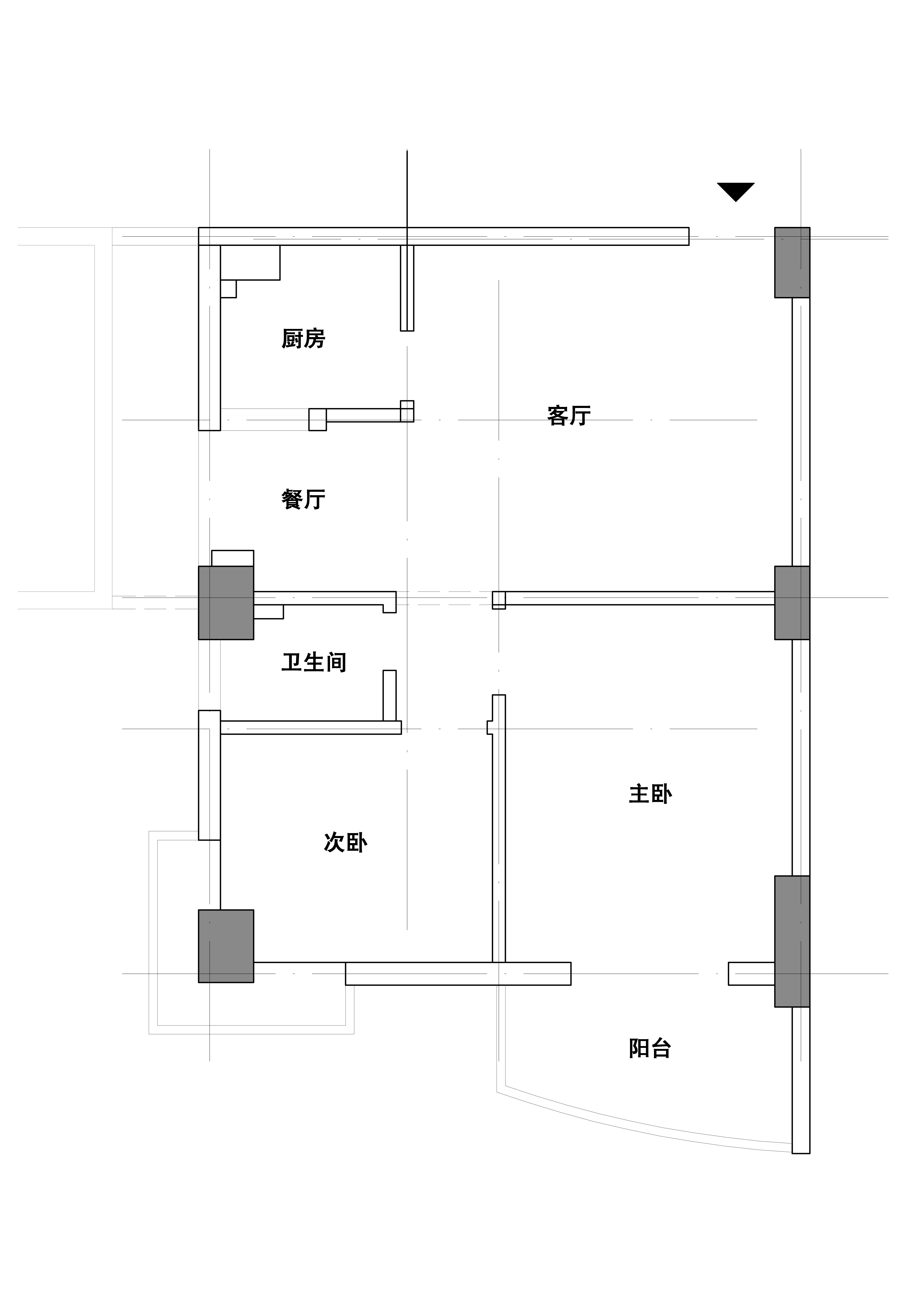空间布局:餐厅功能设计完成后,根据客餐厅区域将厨房、两个独立卫生间位置设计好。双独立卫生间更好的解决干湿分离以及居住时淋浴、上厕所时的不便。剩余空间按照建筑柱网分为主卧以及儿童房。