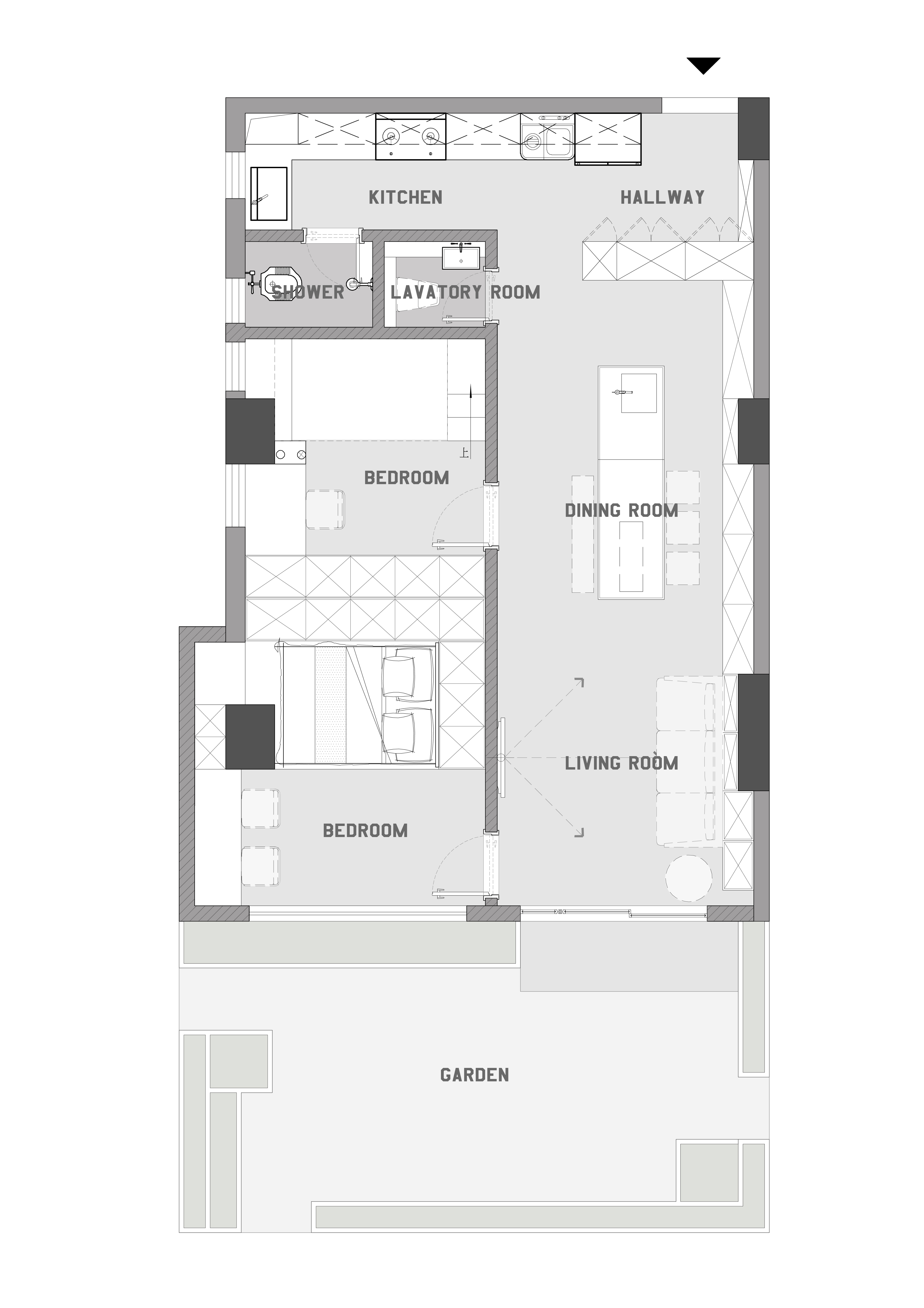 项目定位:在设计过程中考虑此户型为小户型,原有客餐厅采光极差,这是首先需要解决的痛点。还需要利用好户外露台使其室内室外能更好的连接,让原本小的空间无形中有一个拓展。也希望摒去传统客厅的概念,让空间融入交互的概念。