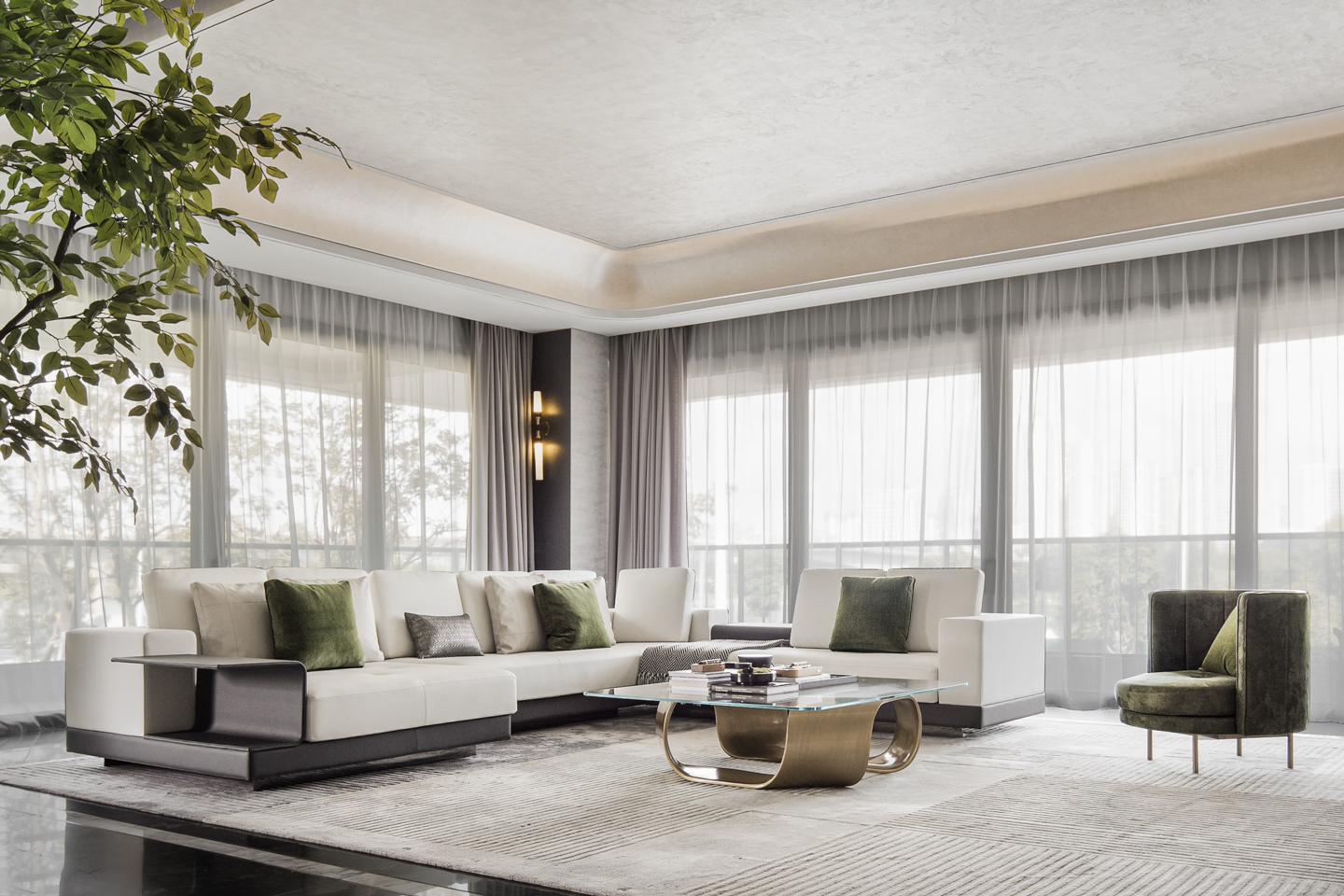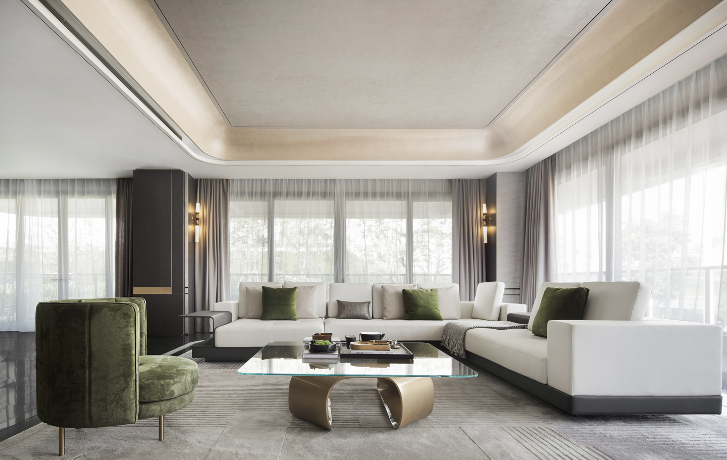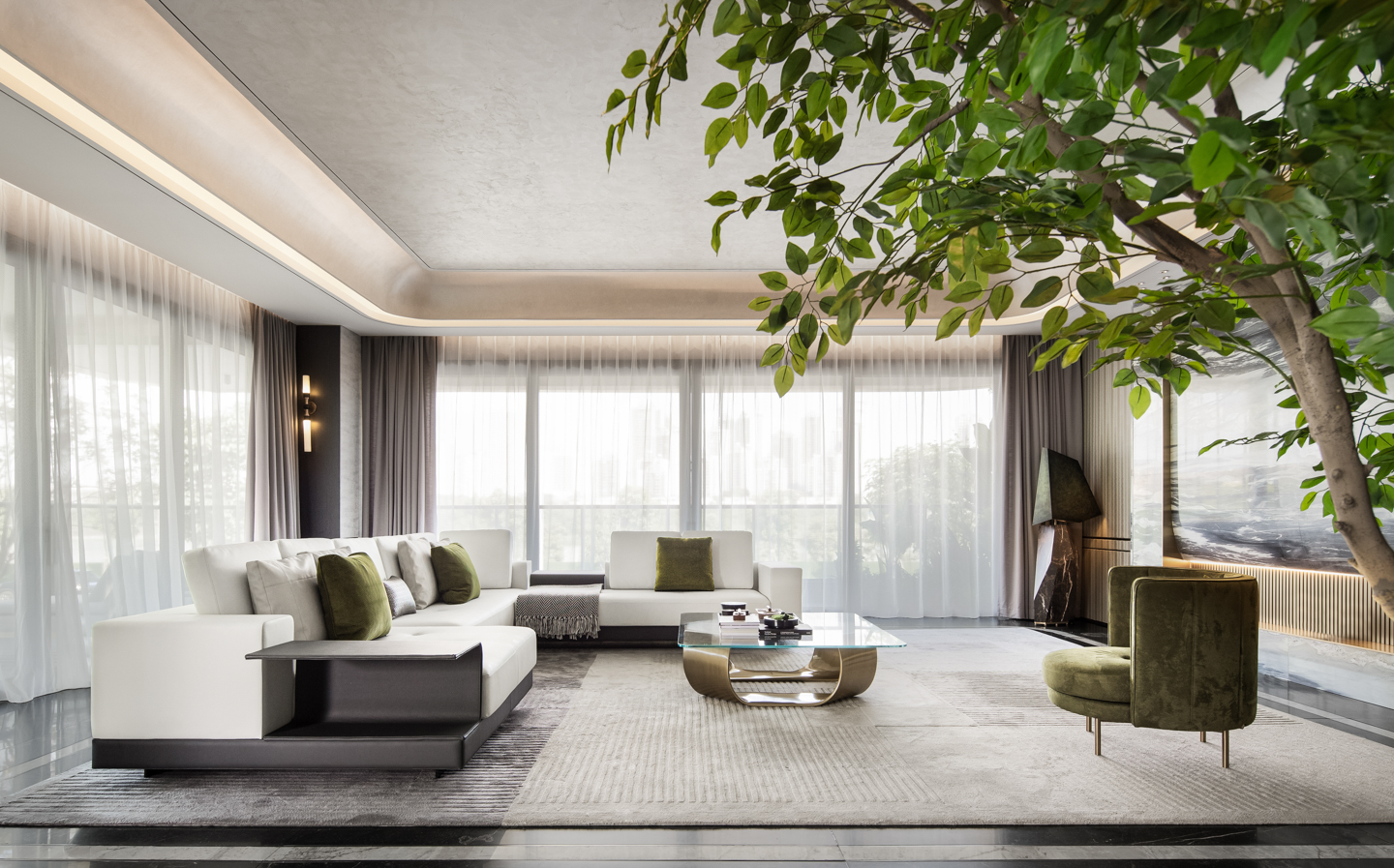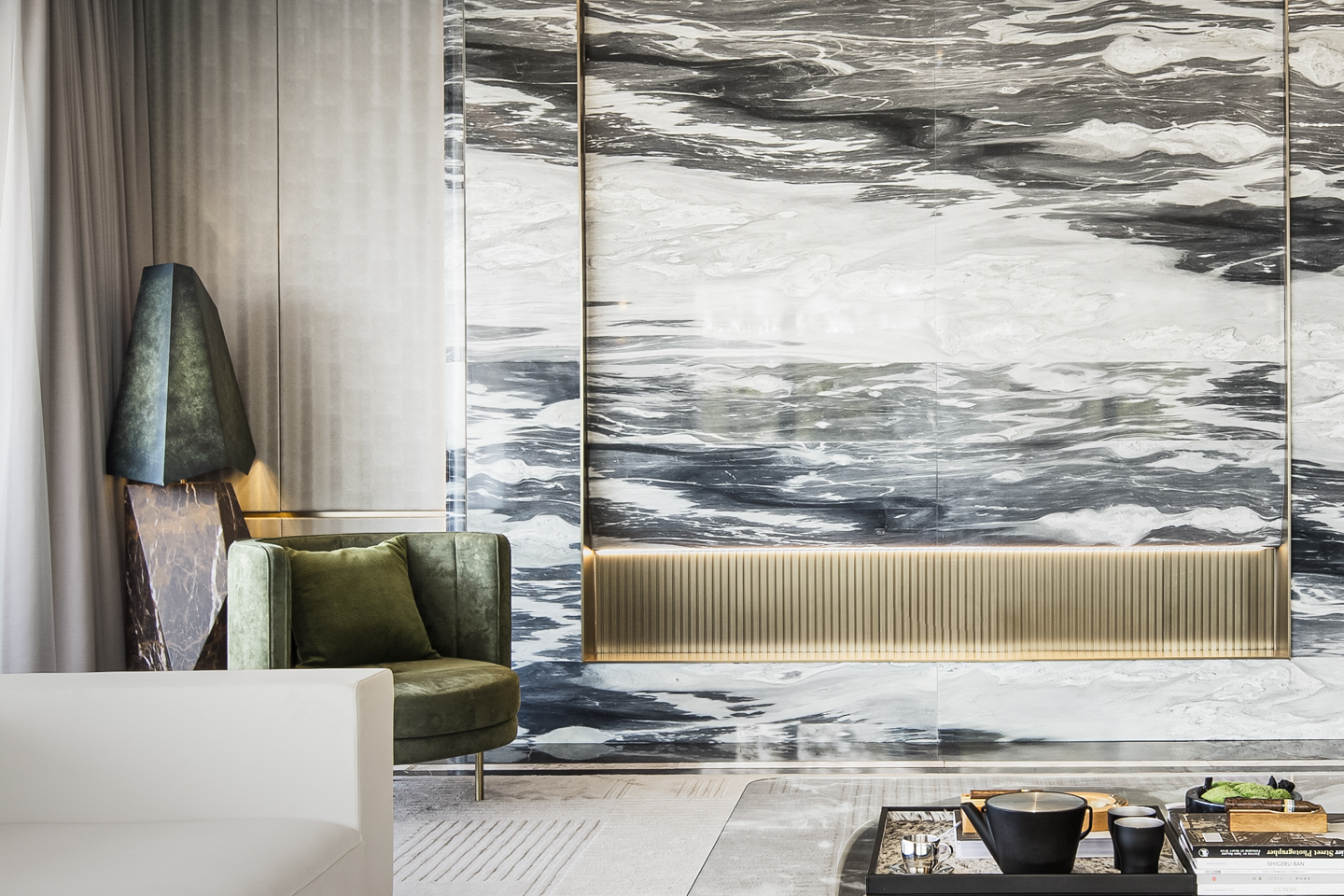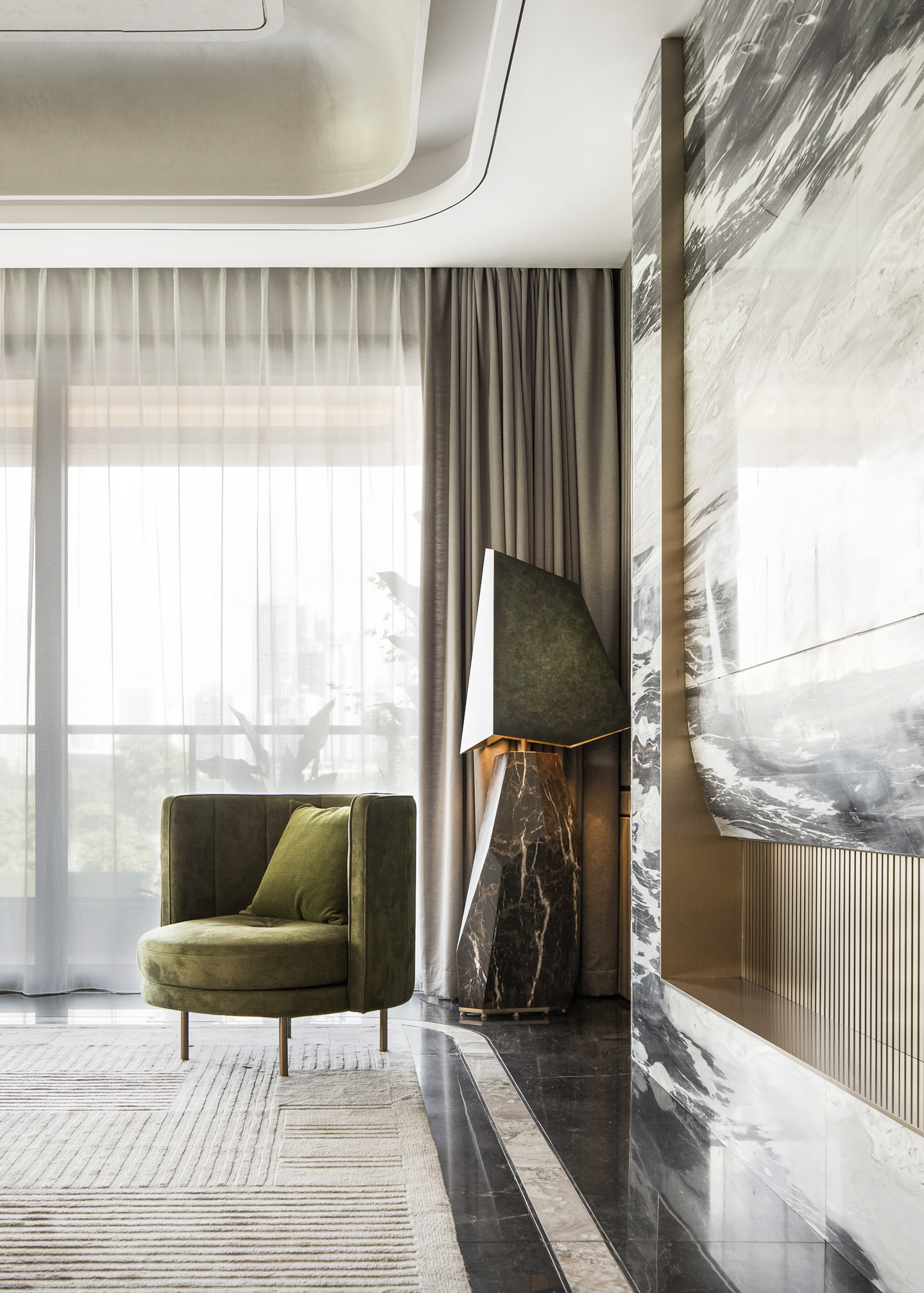 空间以白为主色,点缀些许橄榄绿。轻盈的窗帘、温润的木质、雀跃的金属、沉稳的石材,在白色铺陈的冷静氛围中,挥发出各自的物性。