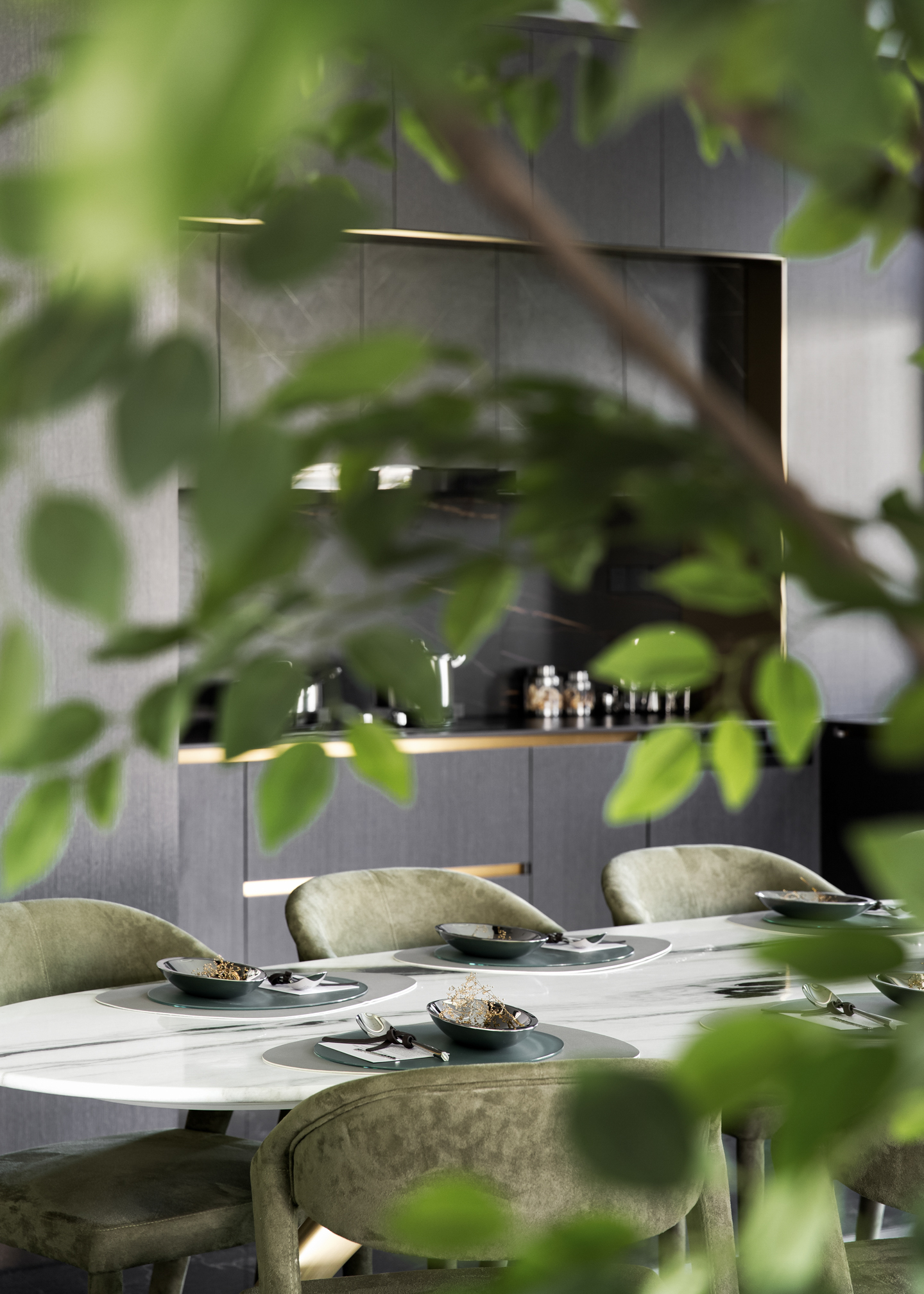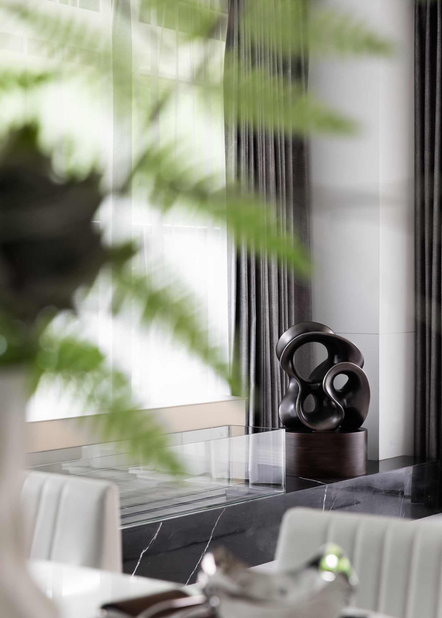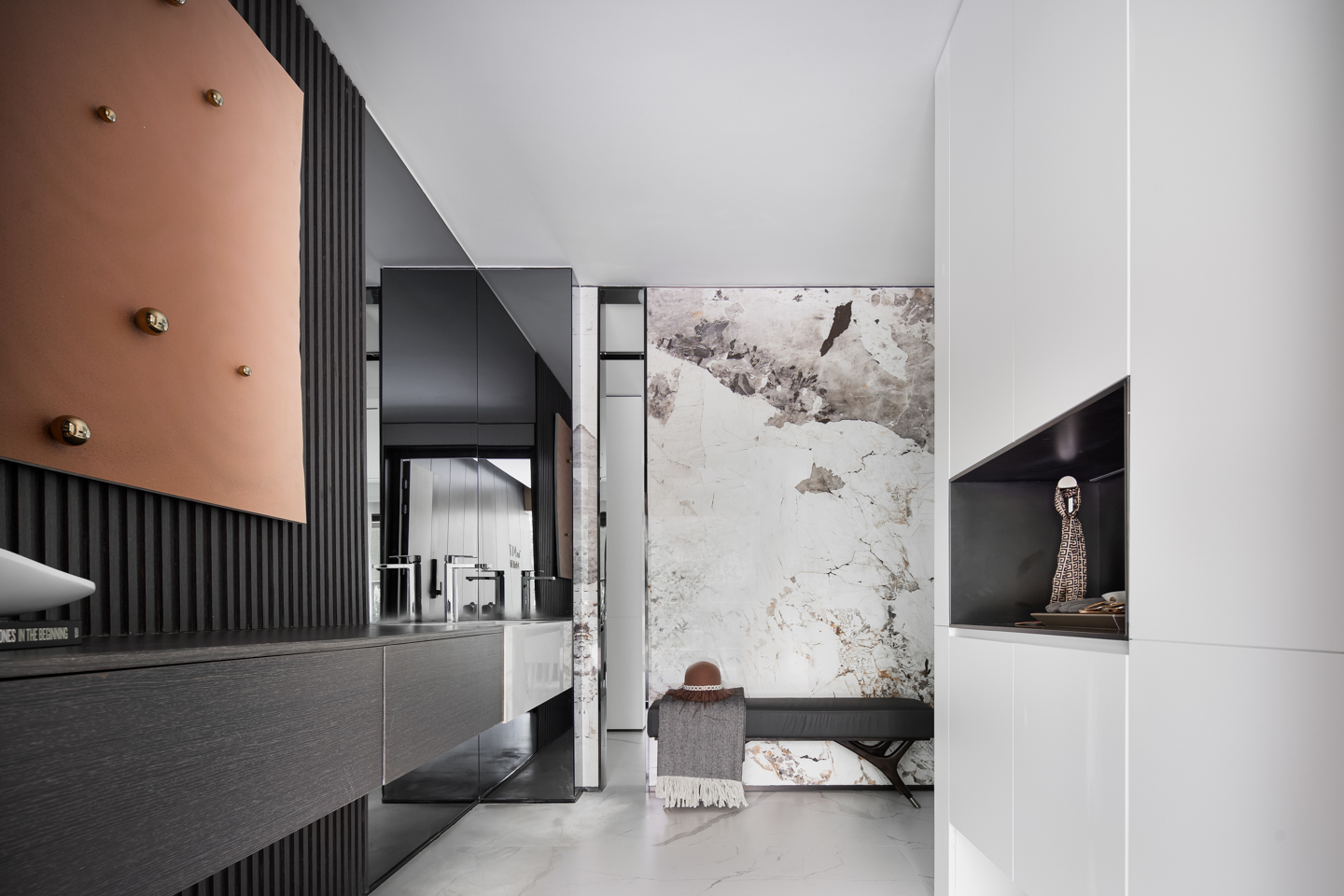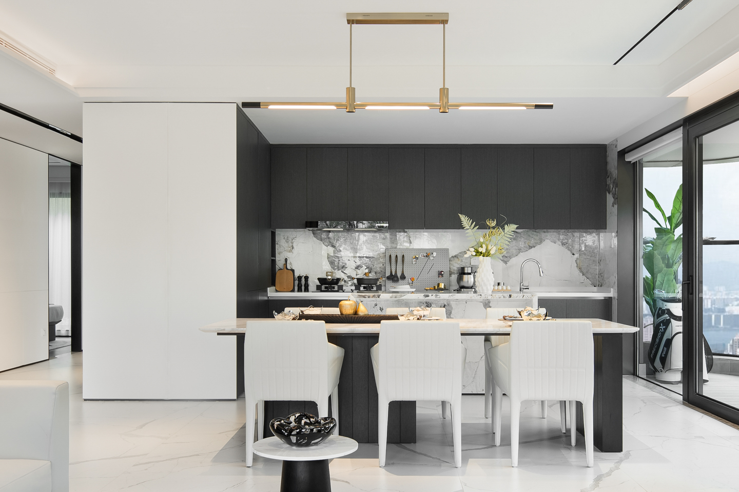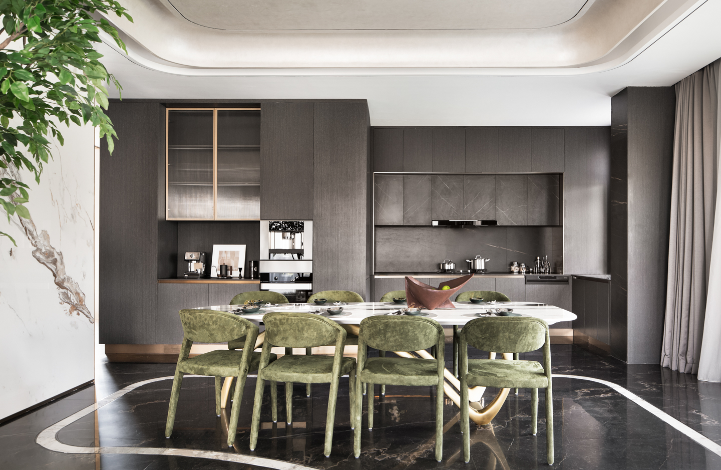 水墨溶于空间,客厅墙面的自由纹路向餐厅延伸,与大理石灰色桌面上的花纹呼应,在无序与有序之间,为素色清雅的空间带来气场,赋予了餐厅更沉稳理性的基调。