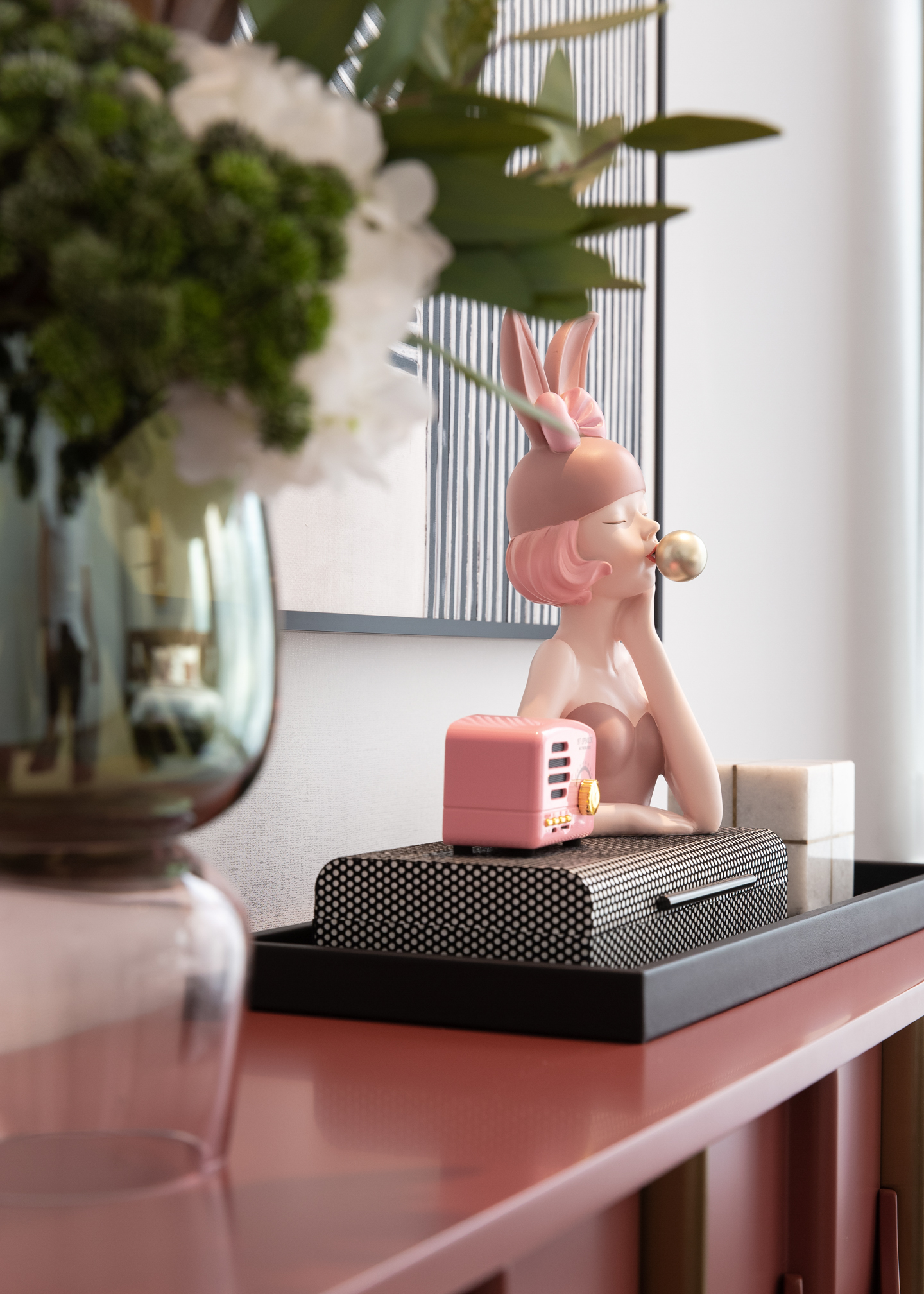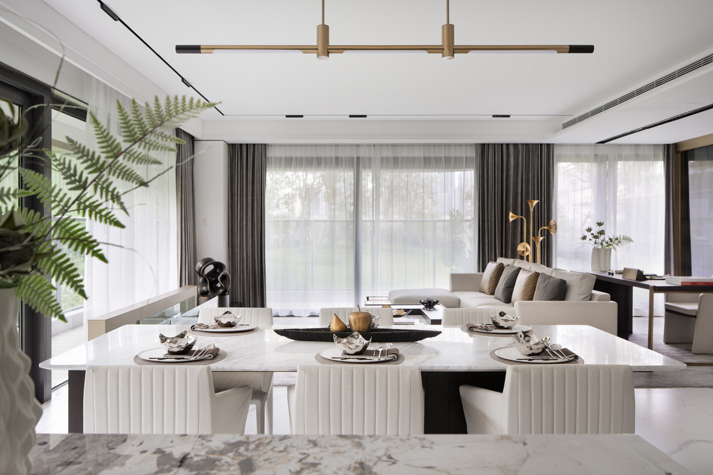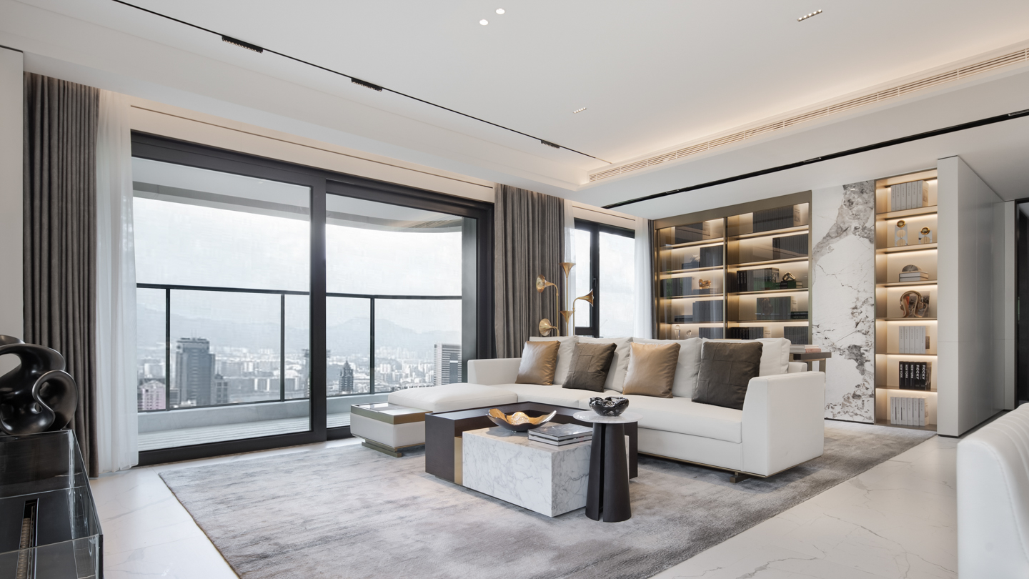 优雅的格调、轻奢的品质、当代的艺术,在空间之中交汇,在线型构建与元素重构下,经由音乐喇叭符号的落地灯、艺术雕塑及浅色布艺沙发的温润气质,让空间焕发出中世纪下别具一格的魅力。