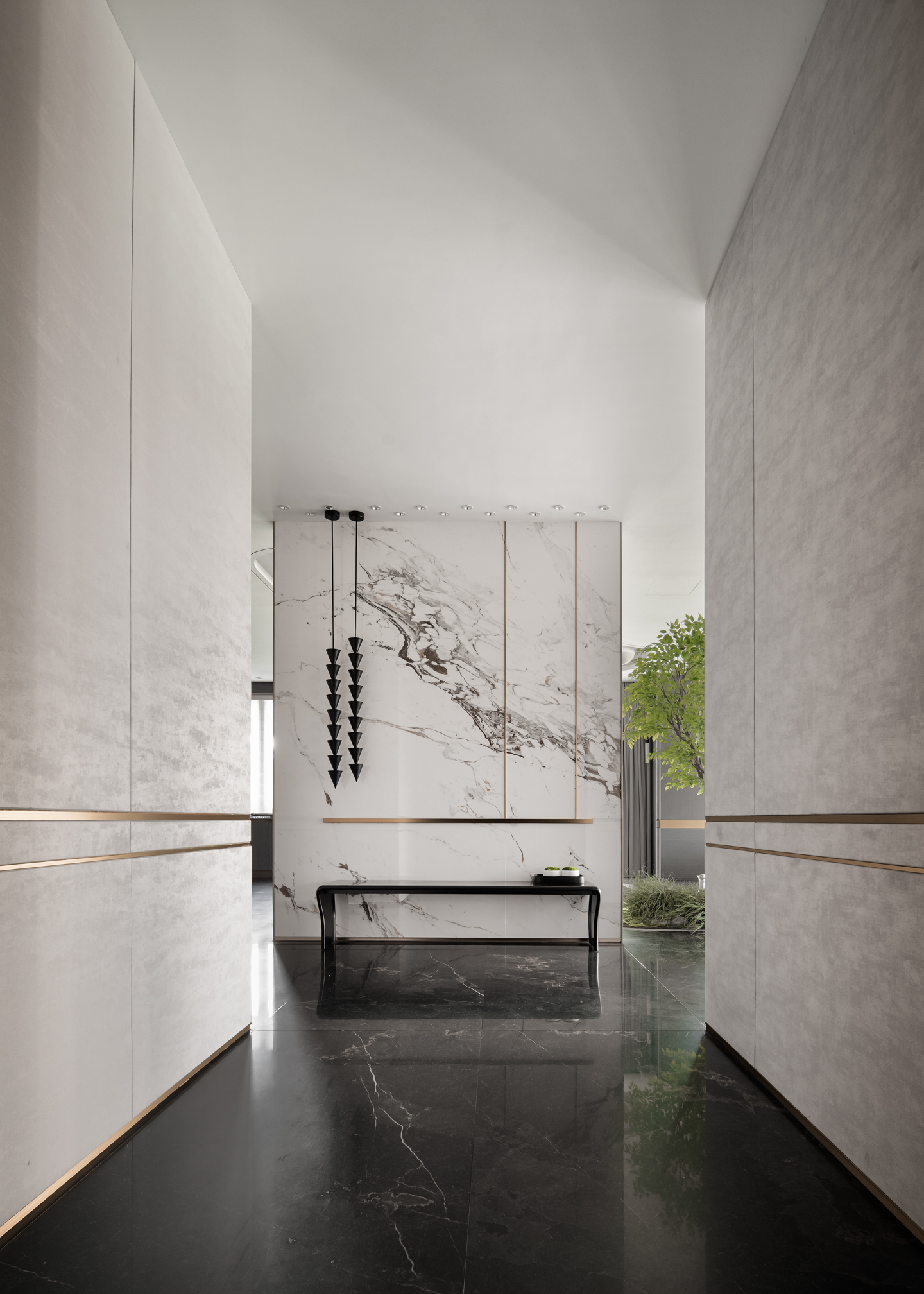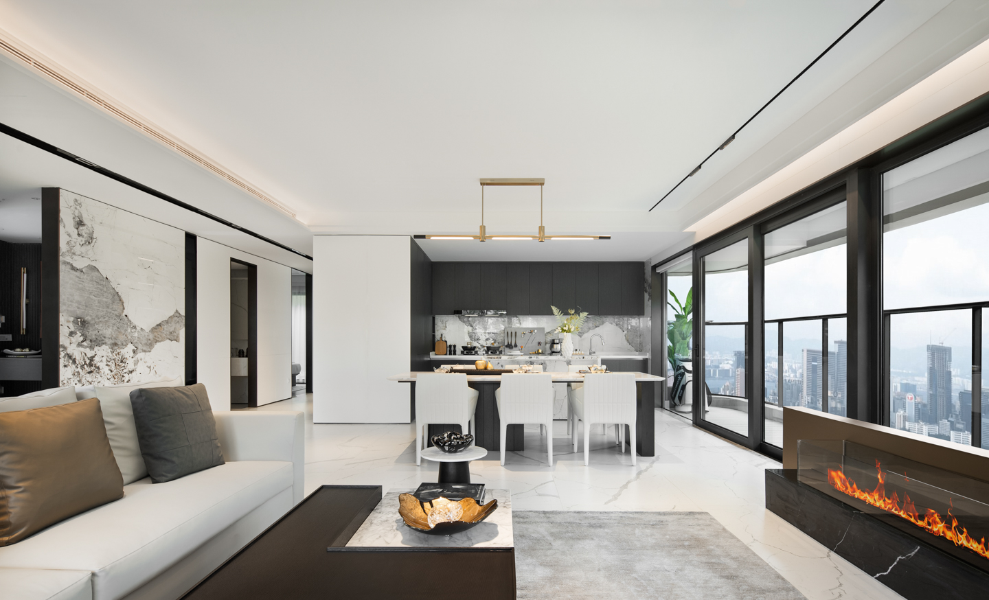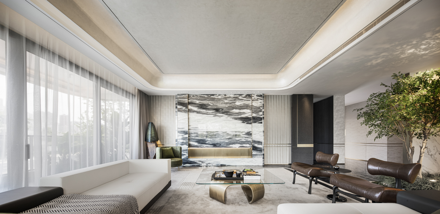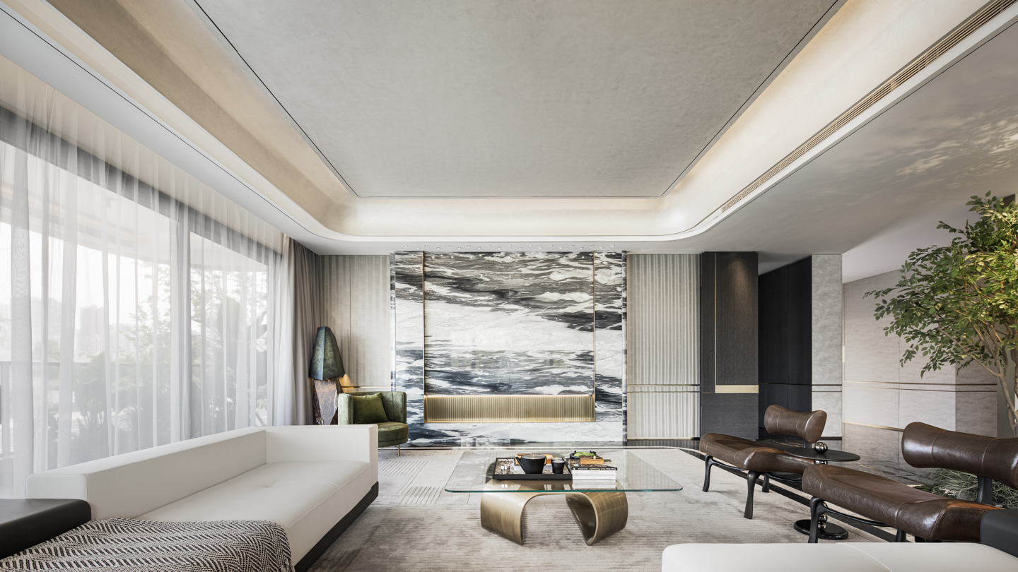从泼墨大尺度砖体铺设而入,玄关以开门即见的大空间气度,开启轻奢美学的现代浪漫生活。
