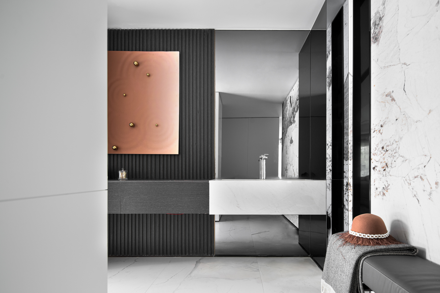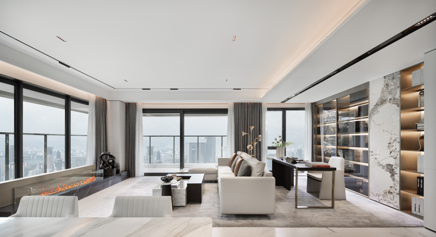 欢乐与静谧的融合是本案的生活形态,内敛沉静的高级灰,点缀轻奢潮范的暖橙色,色彩与材质的抑扬结合下所营造的氛围被全然调动并释出,仿佛拉开了一出大戏的巨幕,为每一寸空间肌肤带来神秘的叙事性。