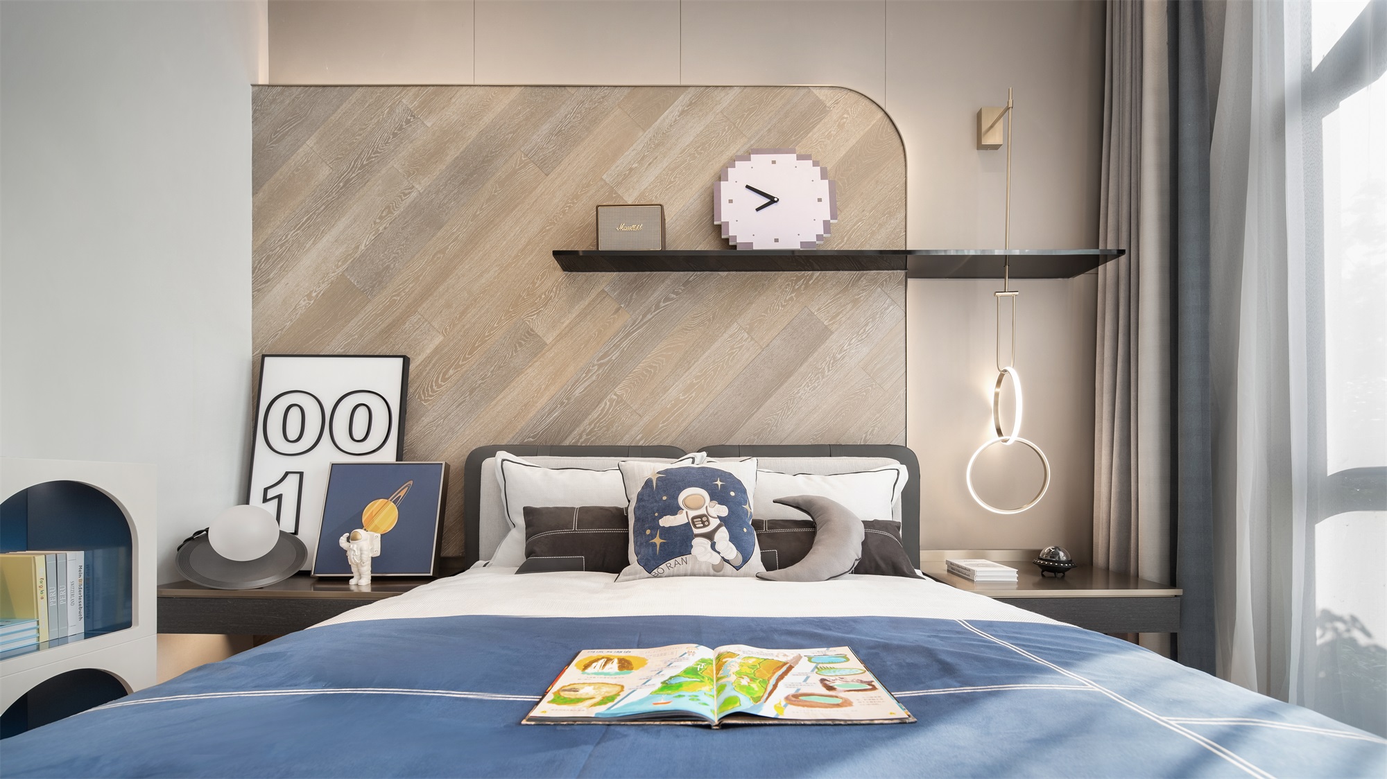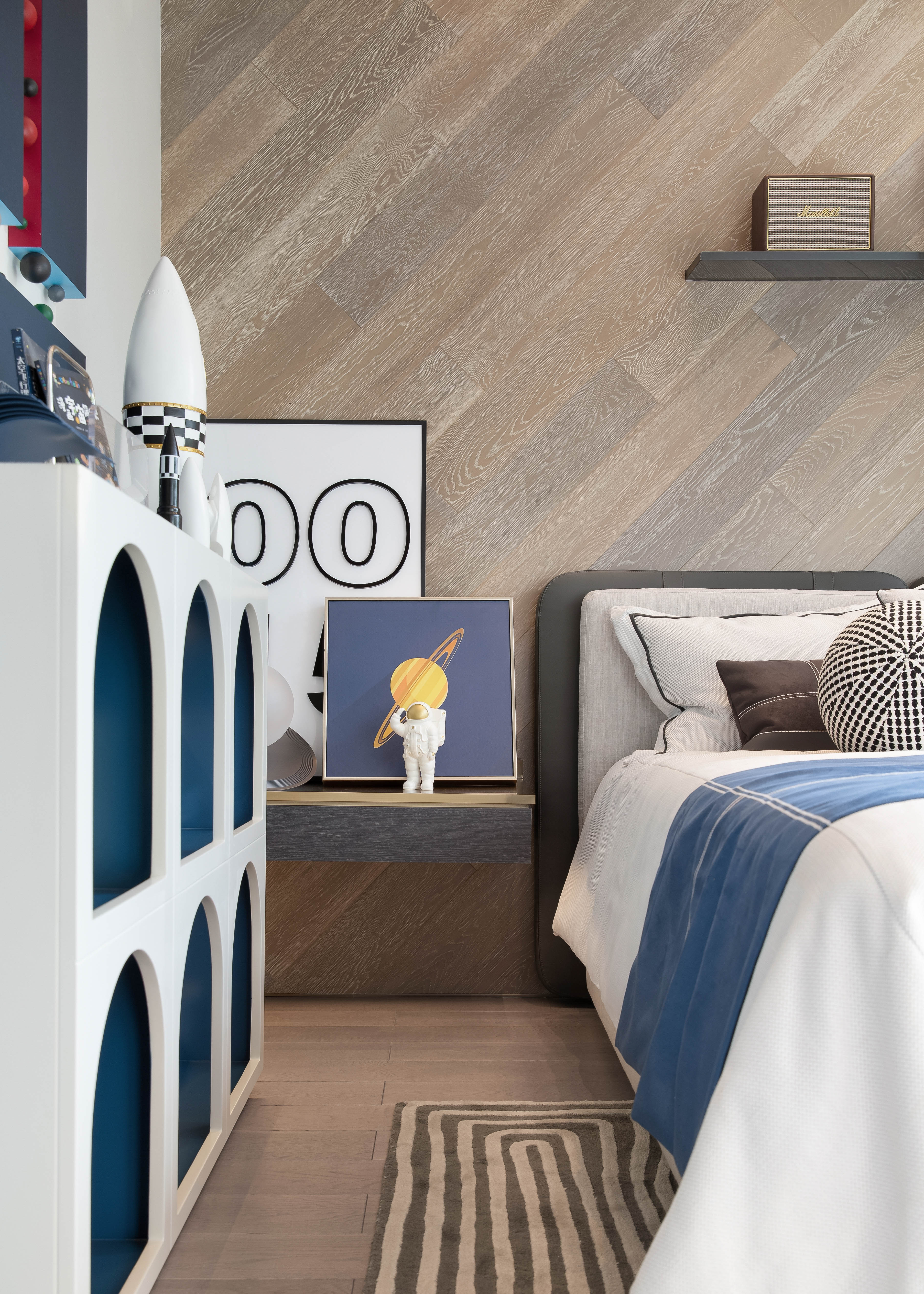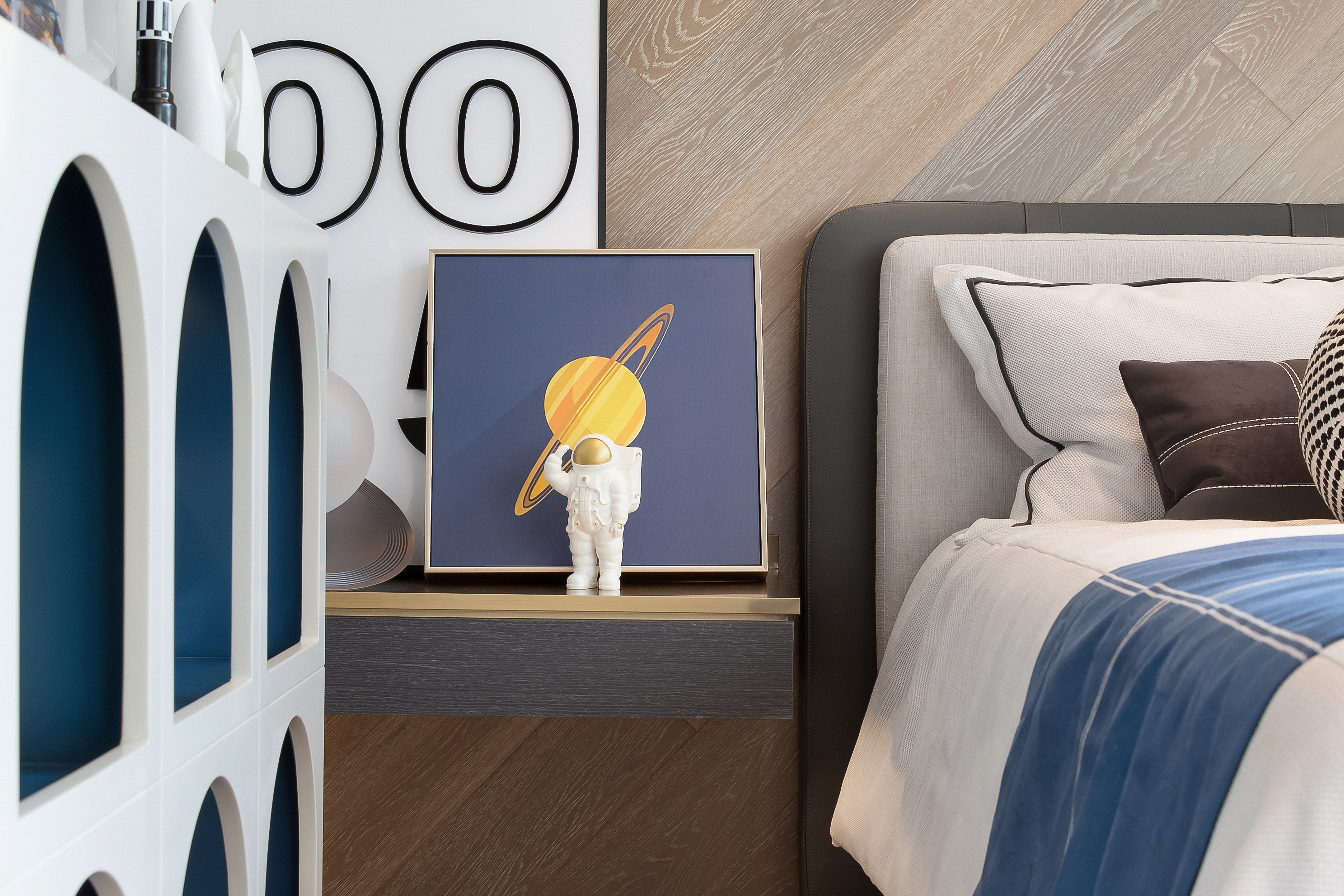男孩房充分考虑人物设定特点,整体色调以米色、咖色为主,空间笼罩在一派童真的格调之中,加之宇航员、火箭等物件的自然意象强化,科技感十足,弥漫着别具一格的活跃气息。