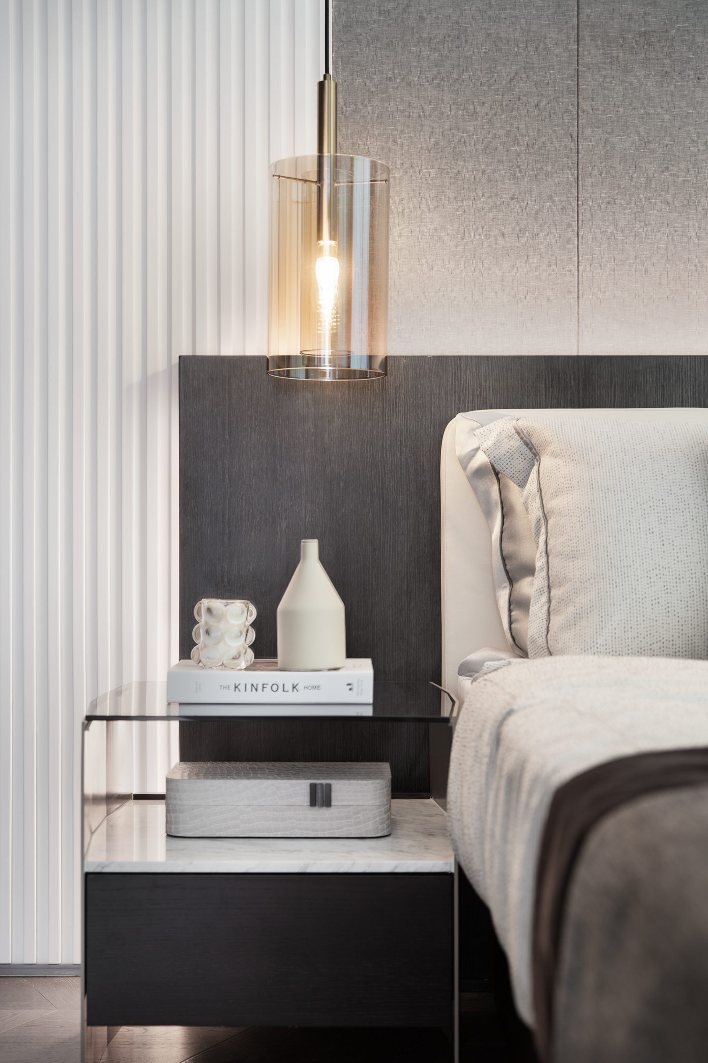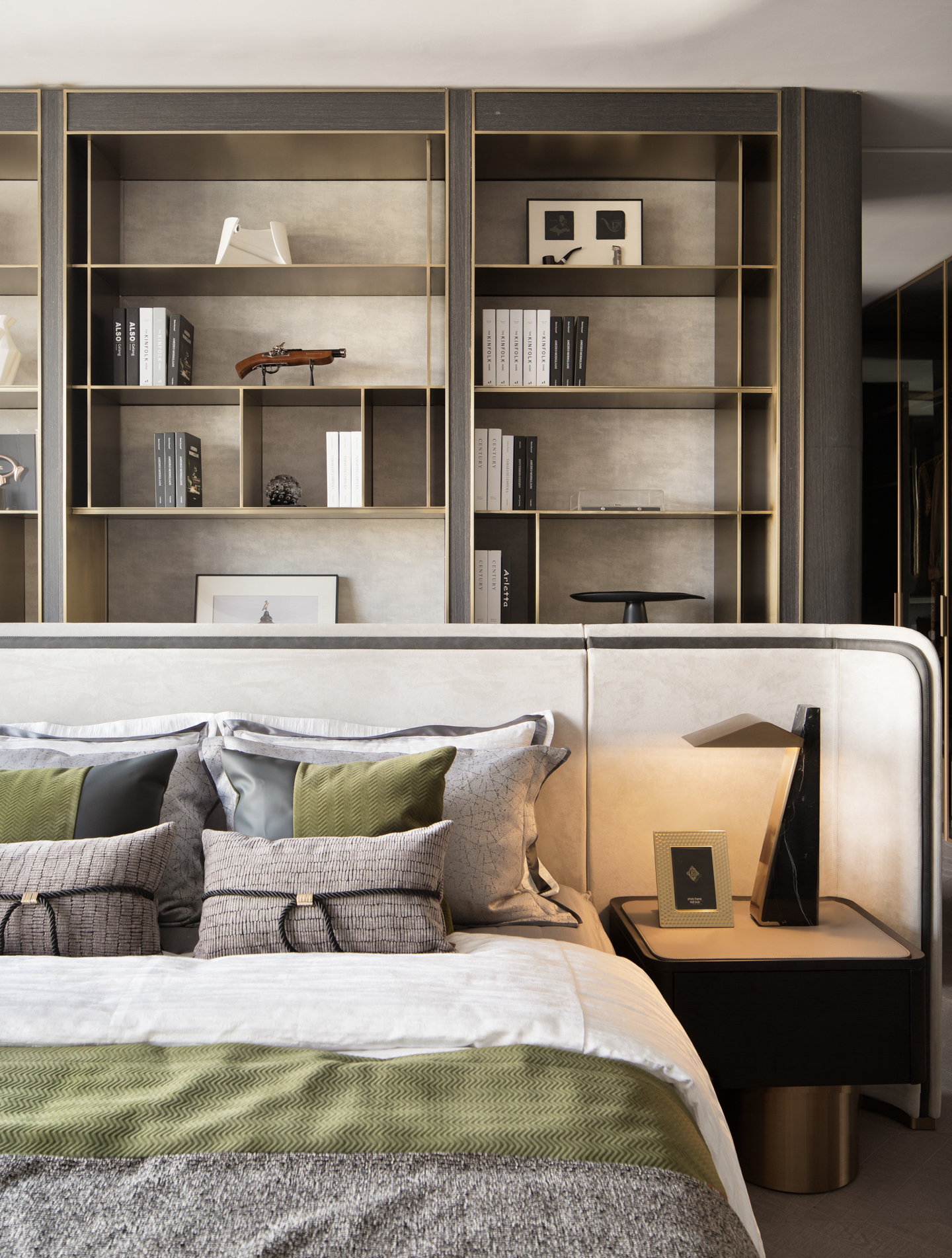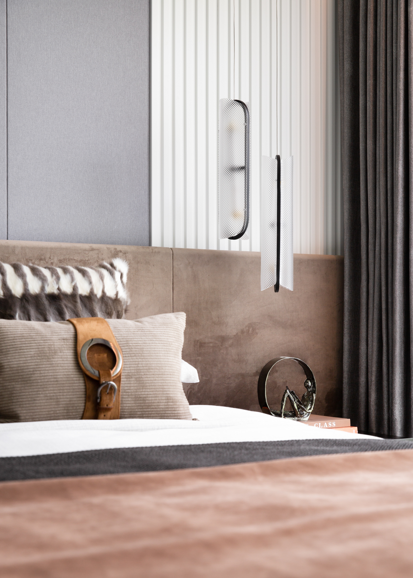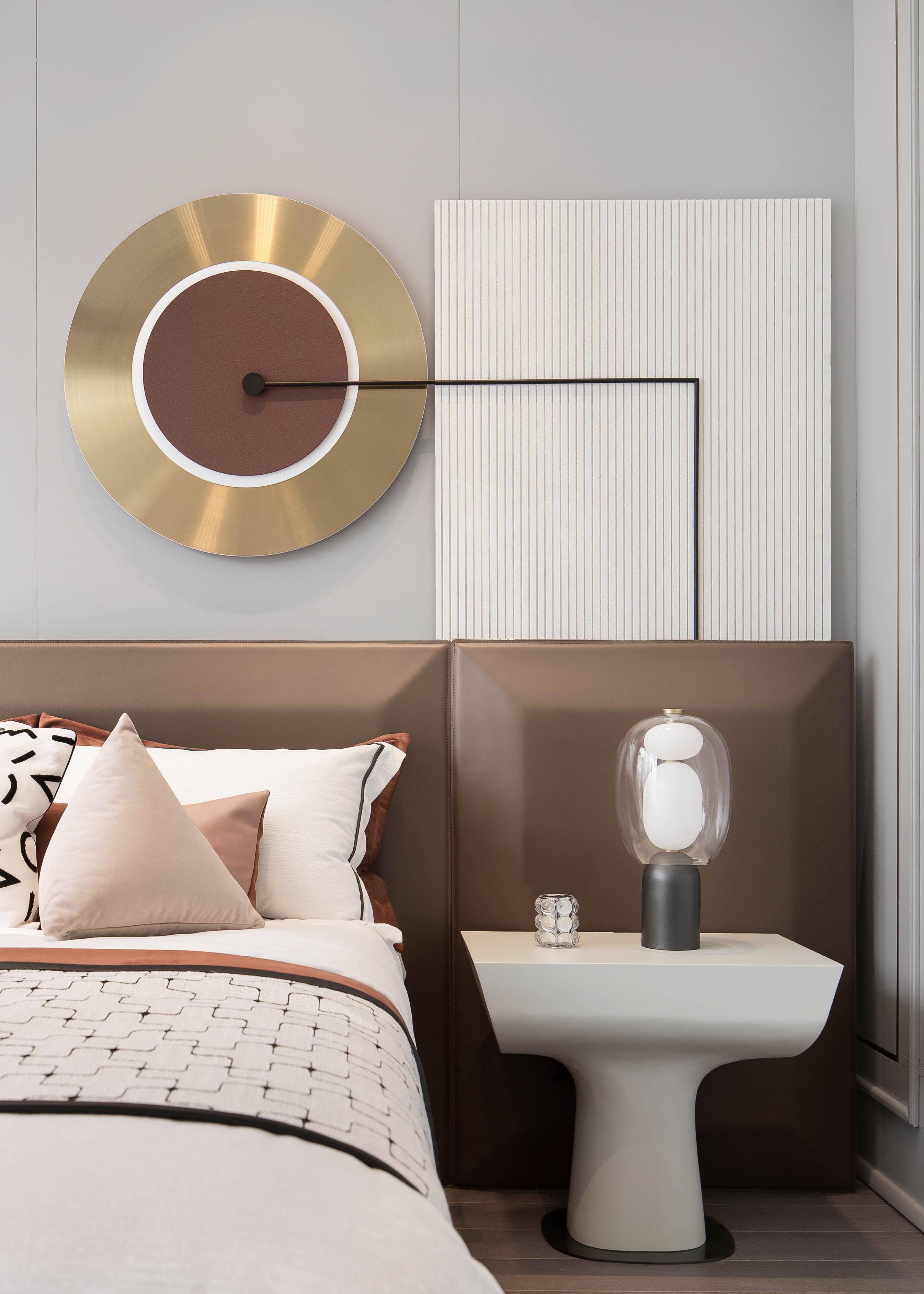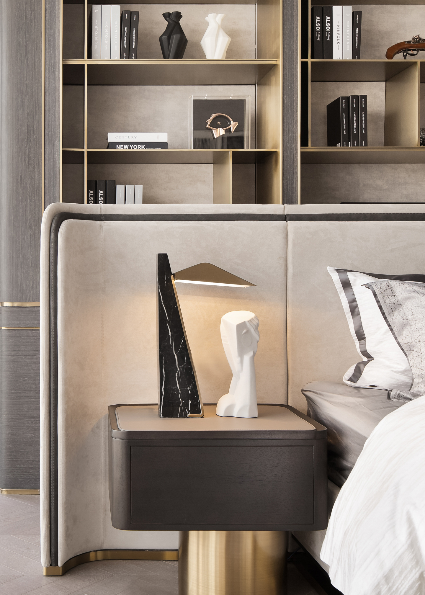 金属及木质材料与床头线型灯的设计即保持优雅的调性,也让生活的情趣有了恰到好处的展现。