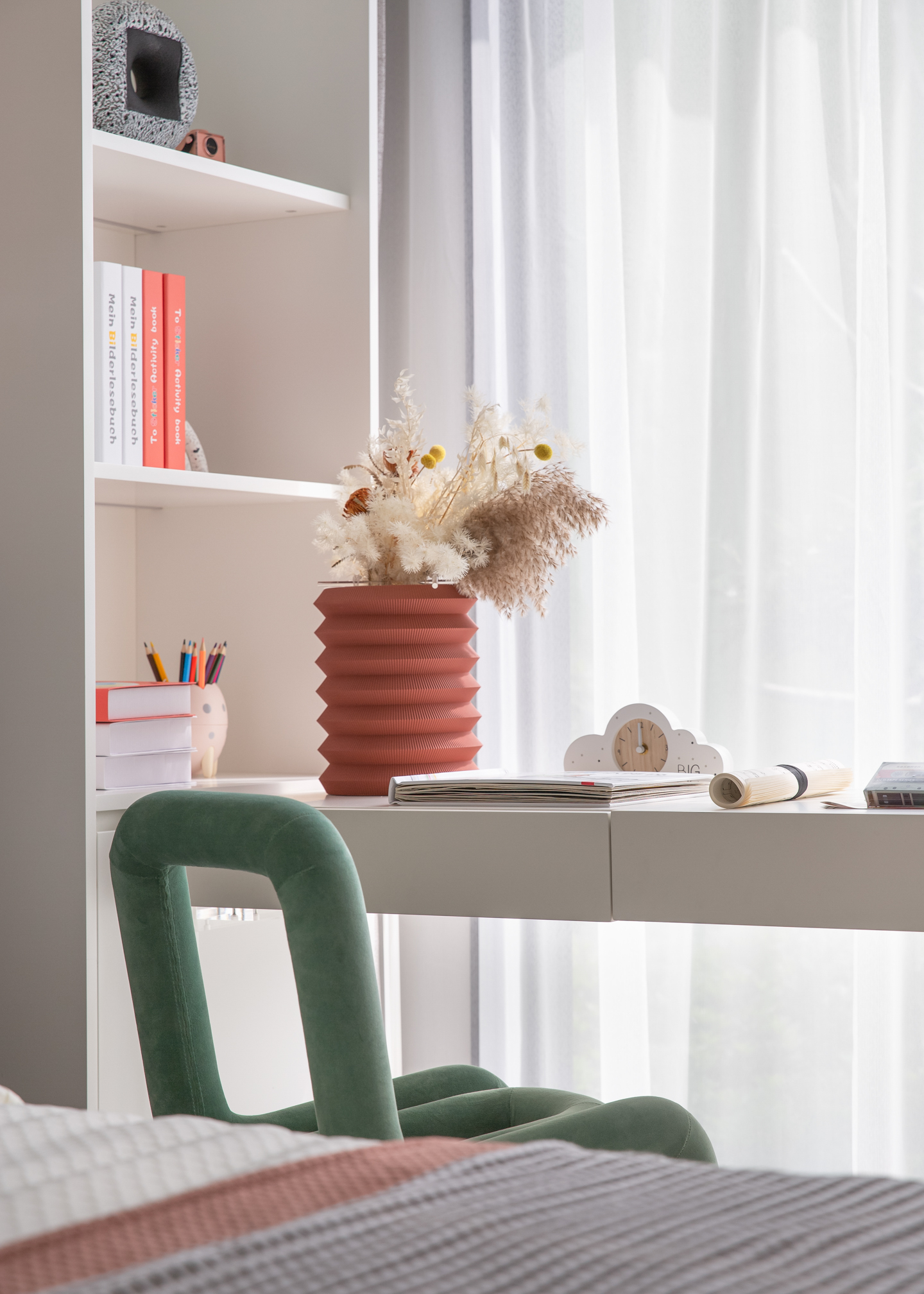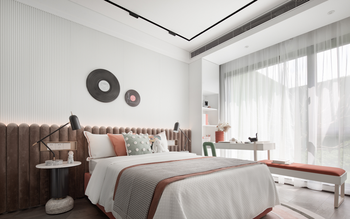 女孩房在粉、橘色调的变化中凸显甜美、温柔、纯真的氛围。胶片墙饰与音符挂饰呼应项目主题,设计在细微之处构建童趣,在材质与自然气韵的碰撞中寻觅活力与生机。